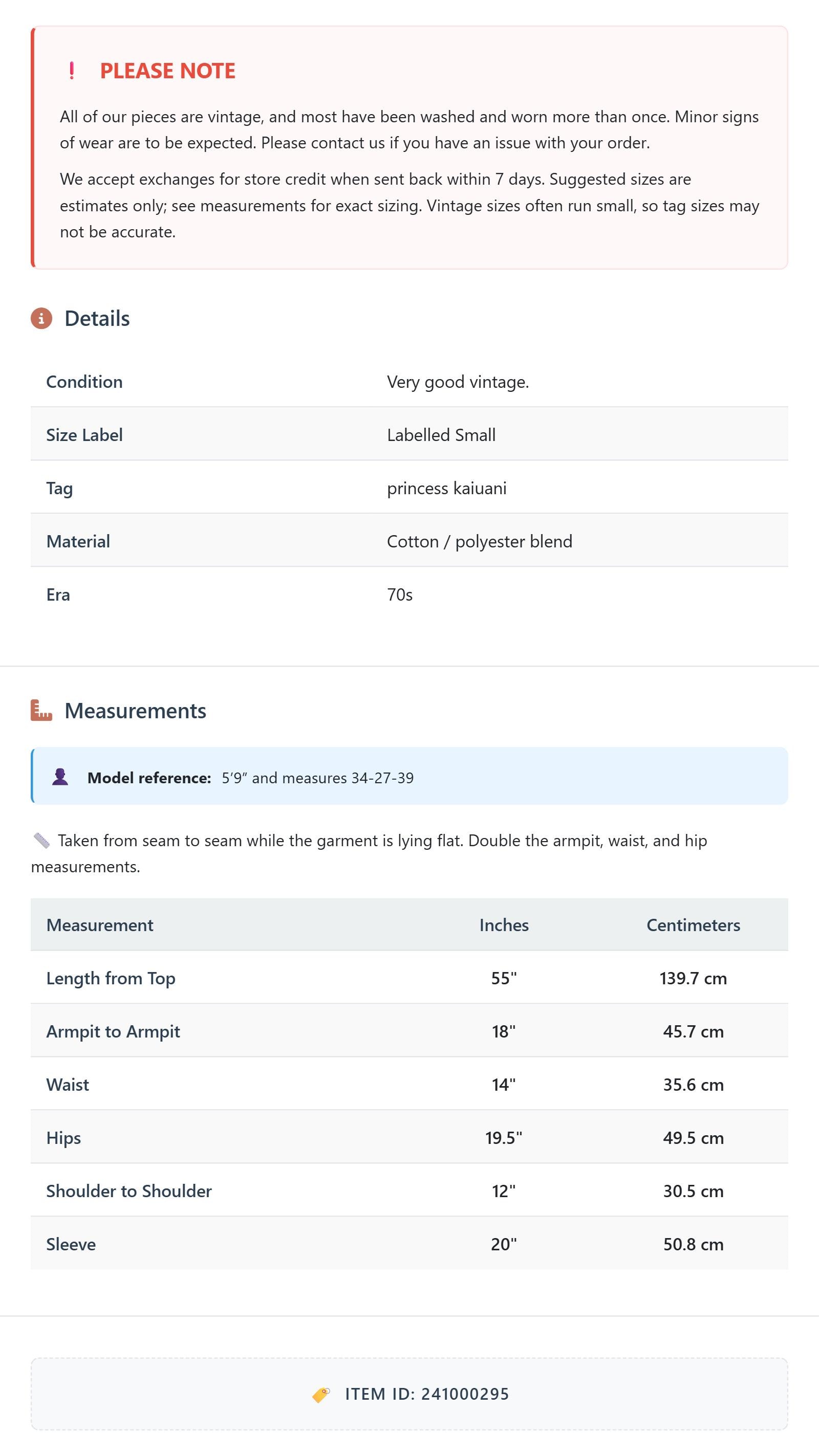 All of our pieces are vintage, and most have been washed and worn more than once. Minor signs of wear are to be expected. Please contact us if you have an issue with your order. We accept exchanges for store credit when sent back within 7 days.
