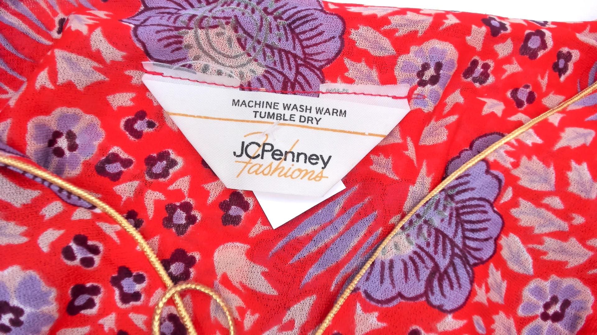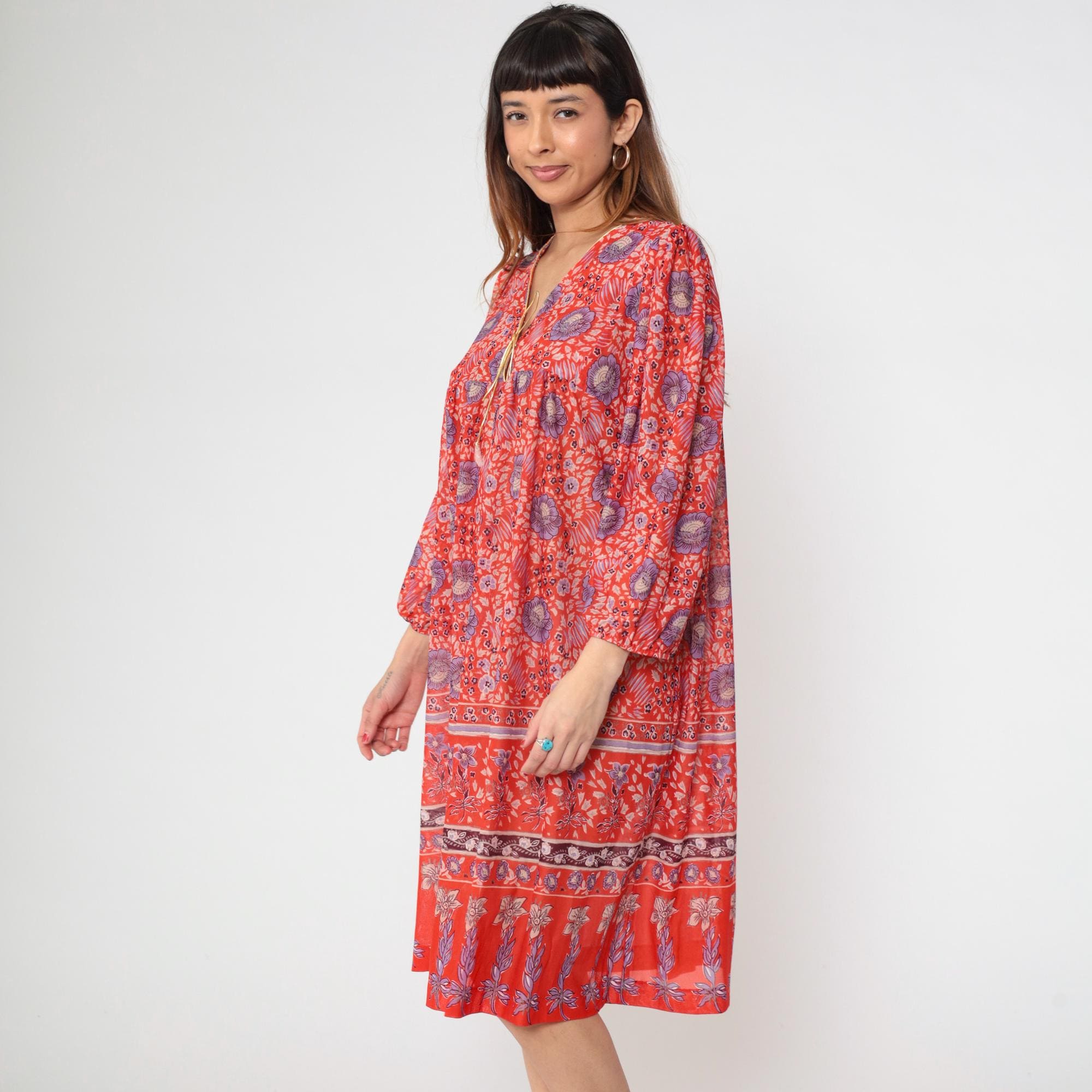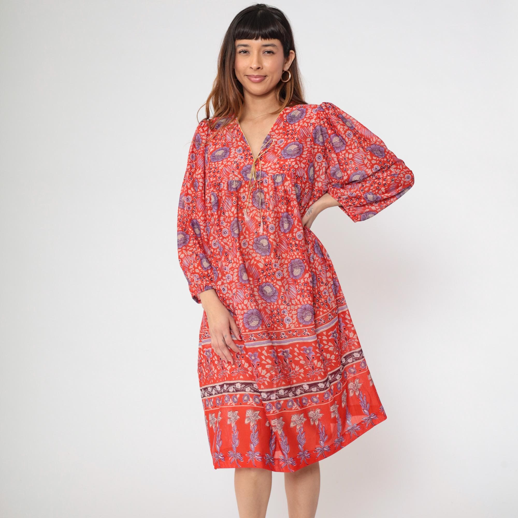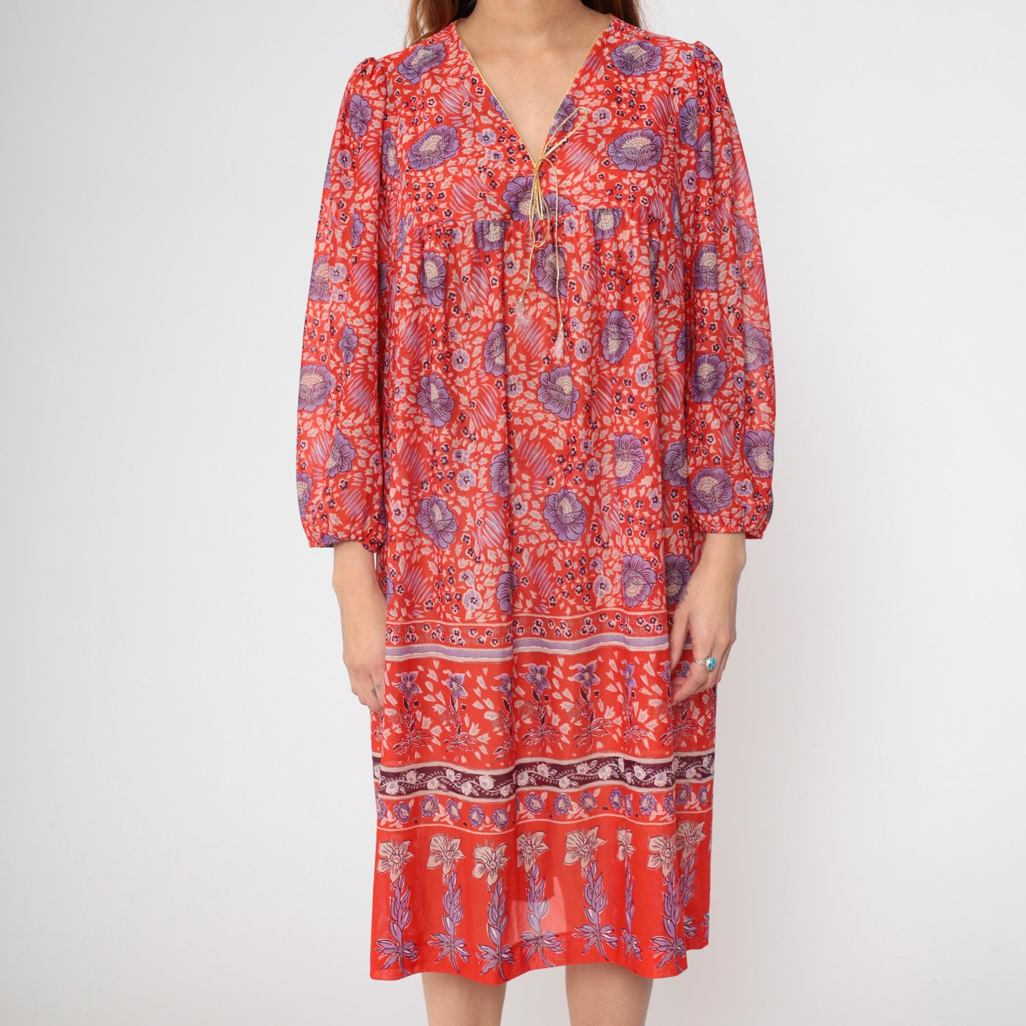 Vintage 70s JC Penney bohemian summer day dress in sheer red fabric with a bold purple and cream floral print. Features a V-neckline with a gold tie detail, bishop sleeves with elastic cuffs, and a relaxed peasant-style silhouette.
