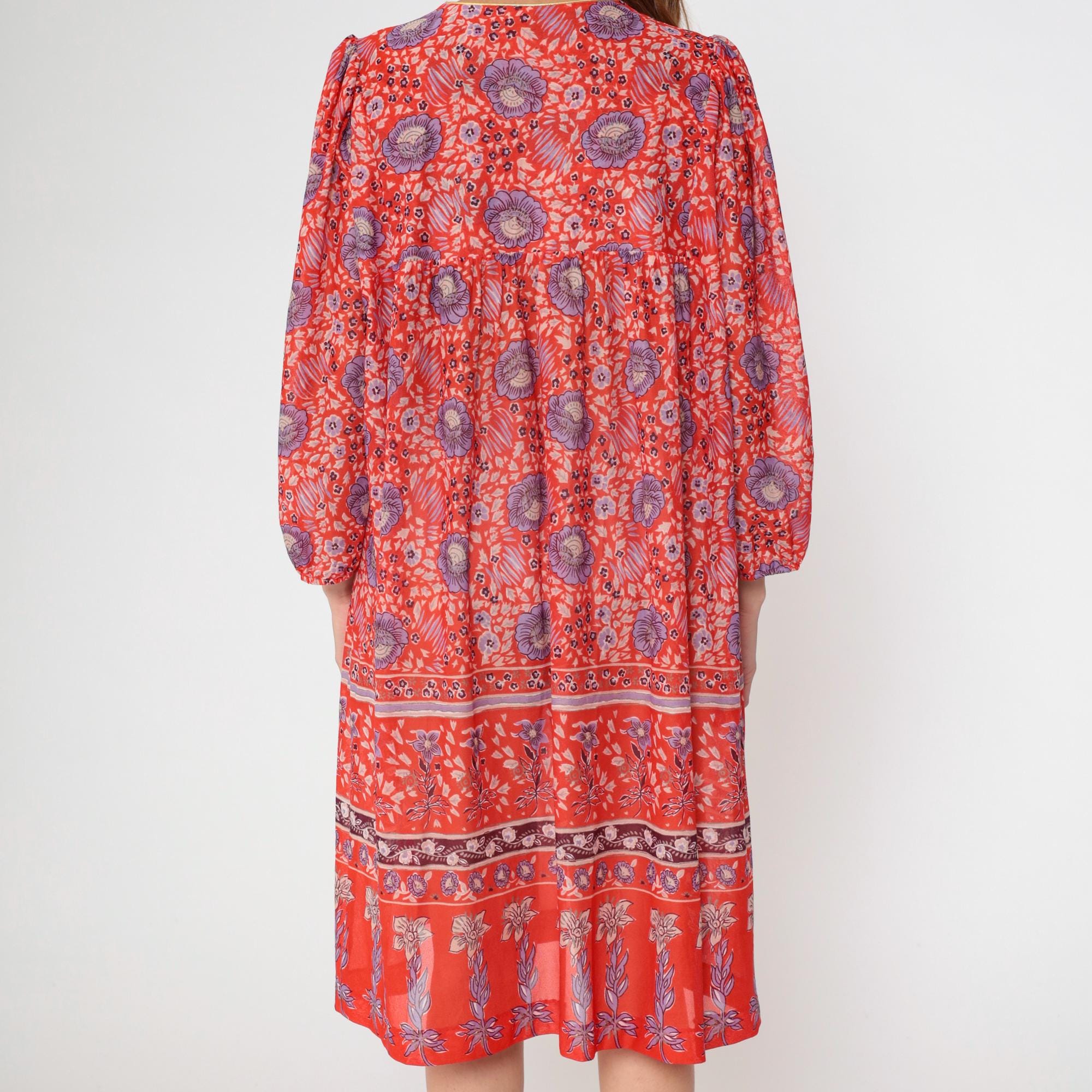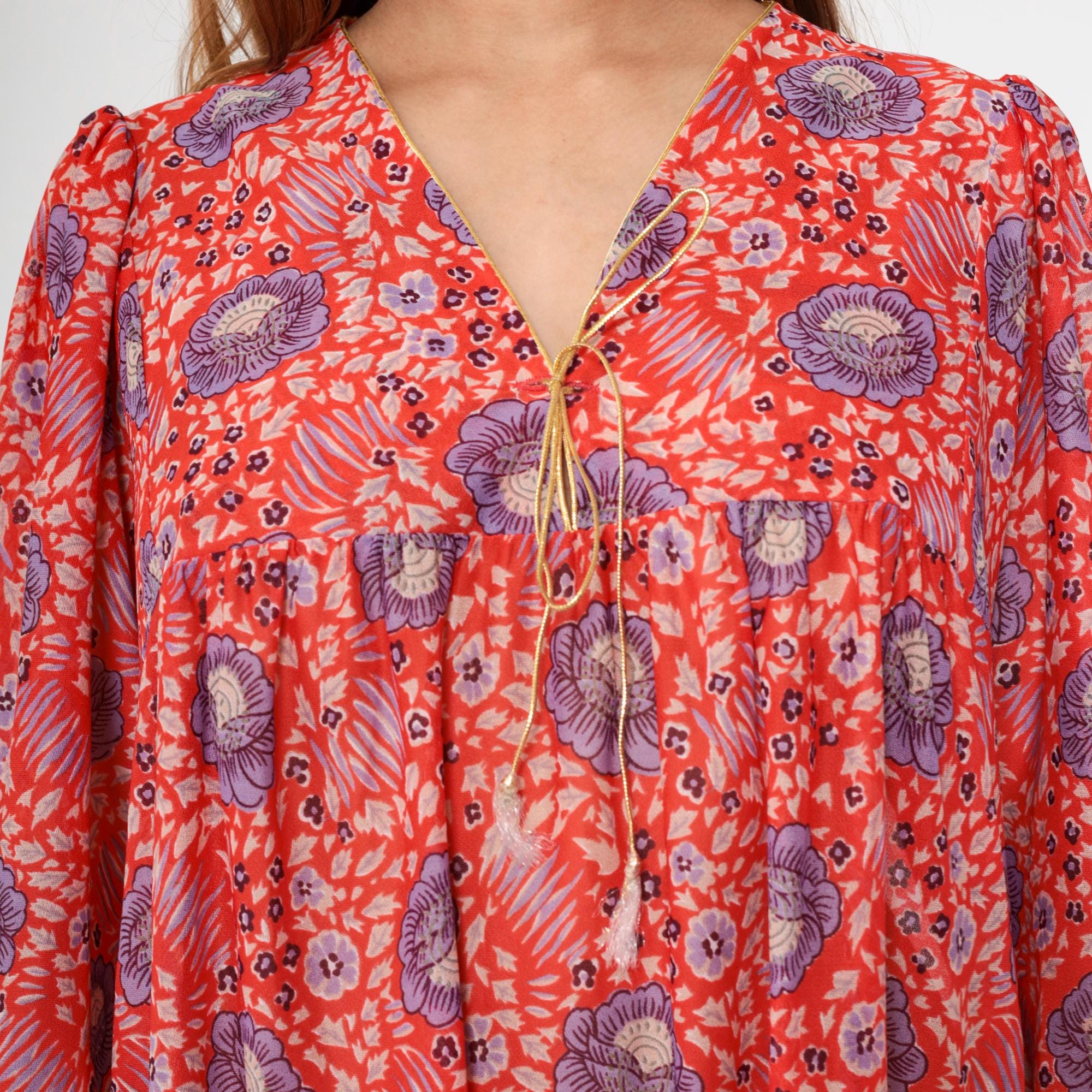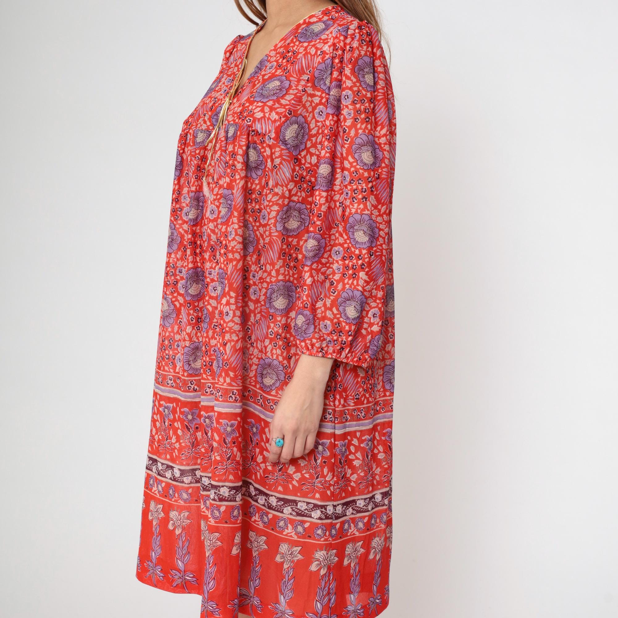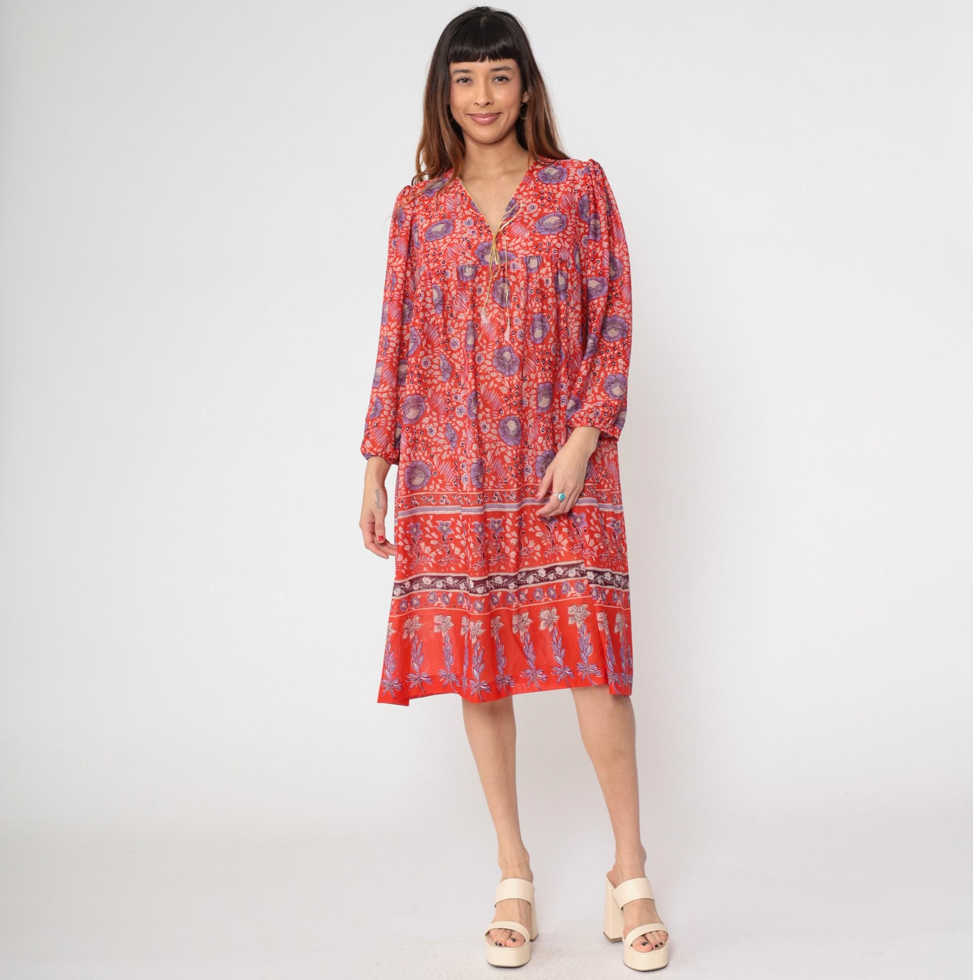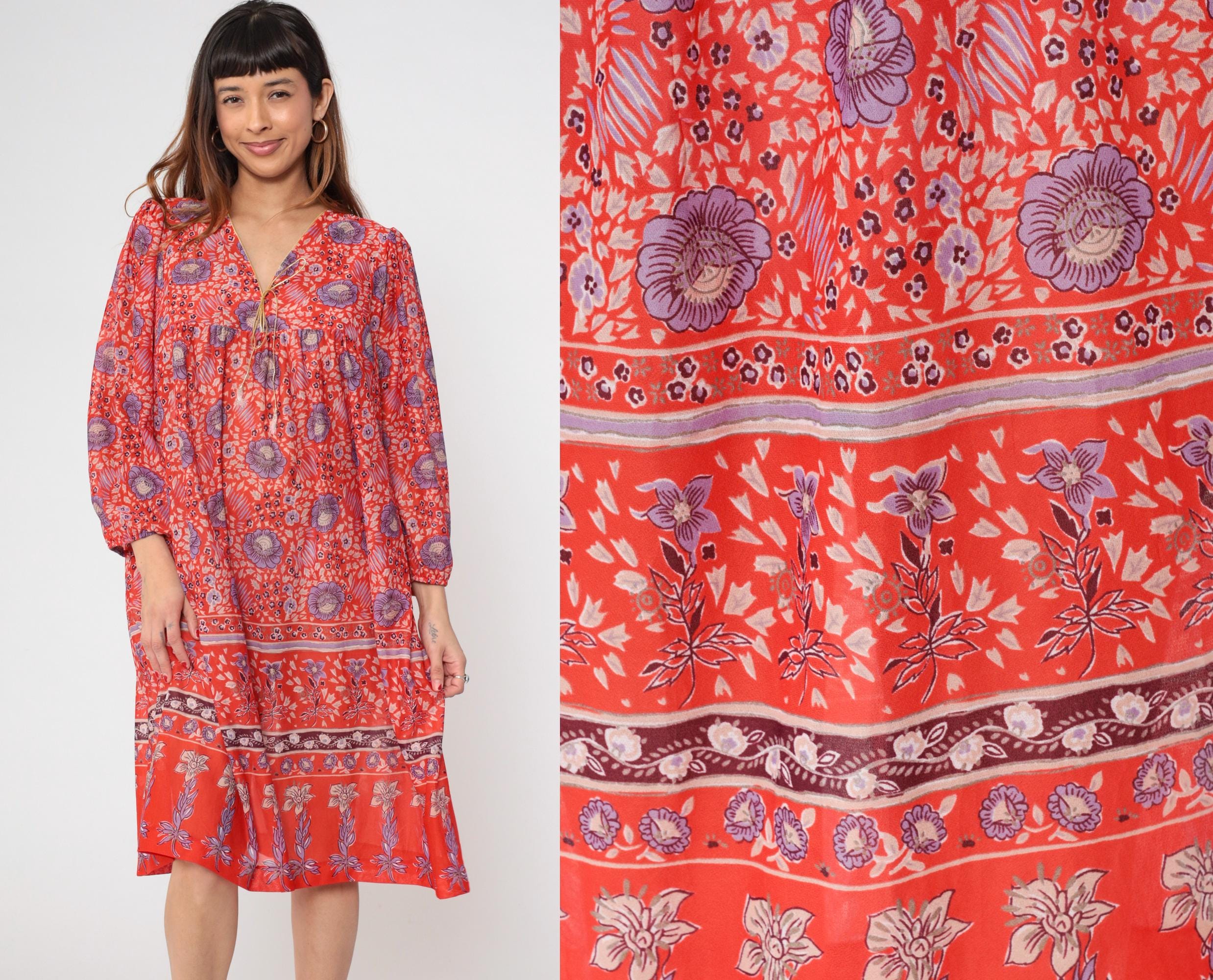 Vintage 70s JC Penney bohemian summer day dress in sheer red fabric with a bold purple and cream floral print. Features a V-neckline with a gold tie detail, bishop sleeves with elastic cuffs, and a relaxed peasant-style silhouette.