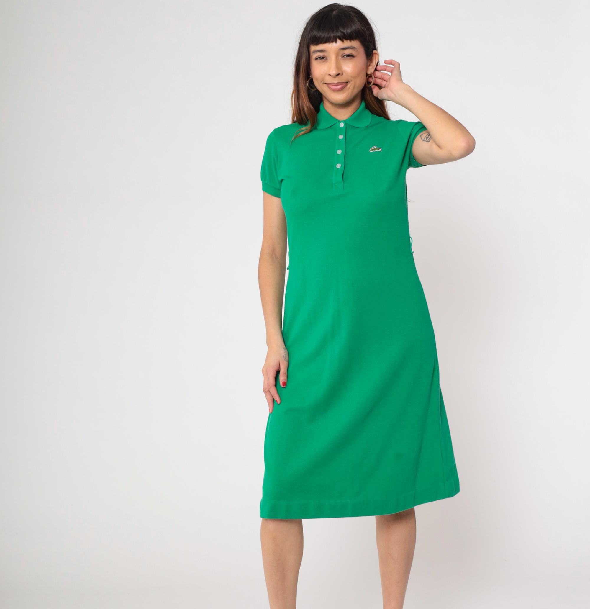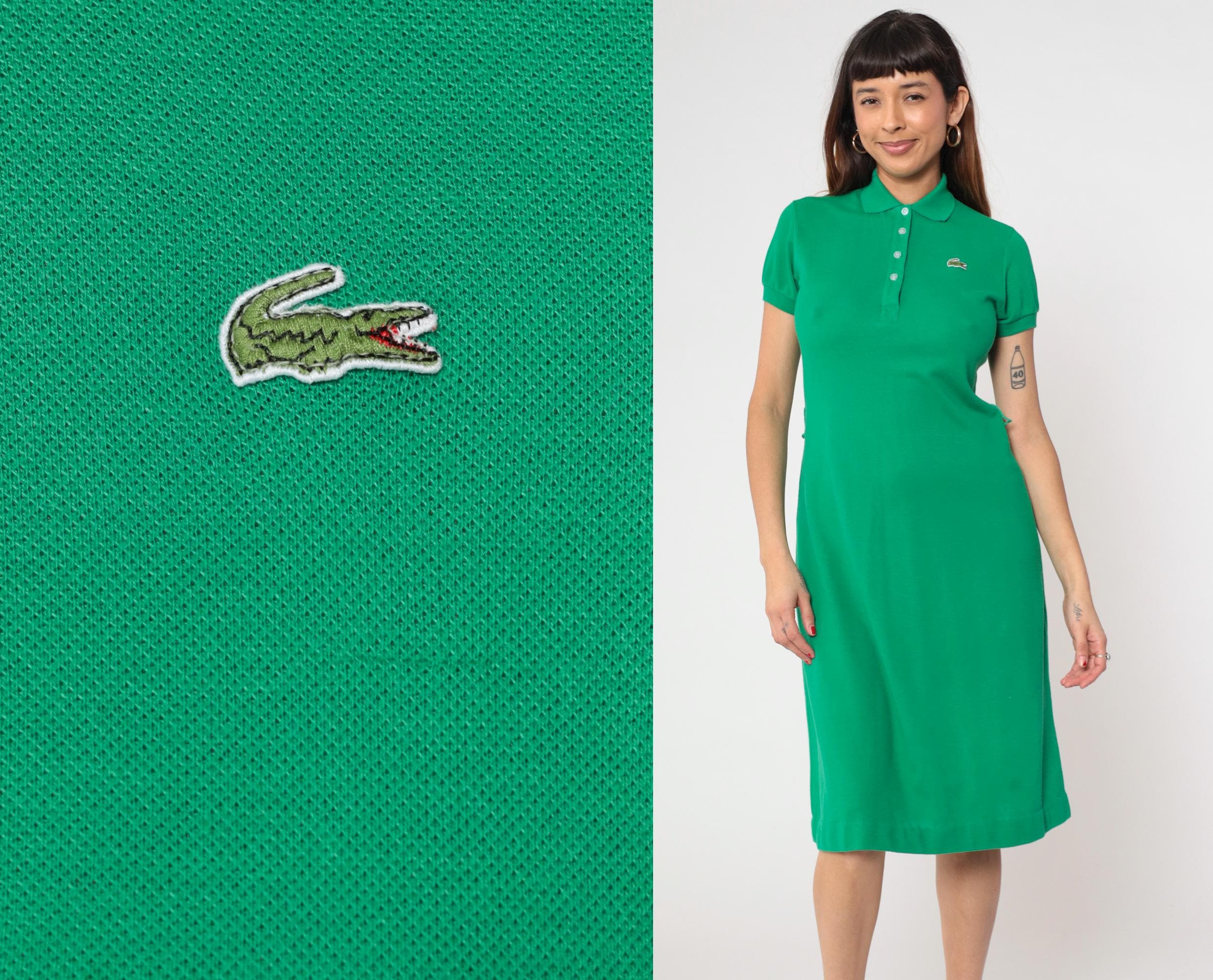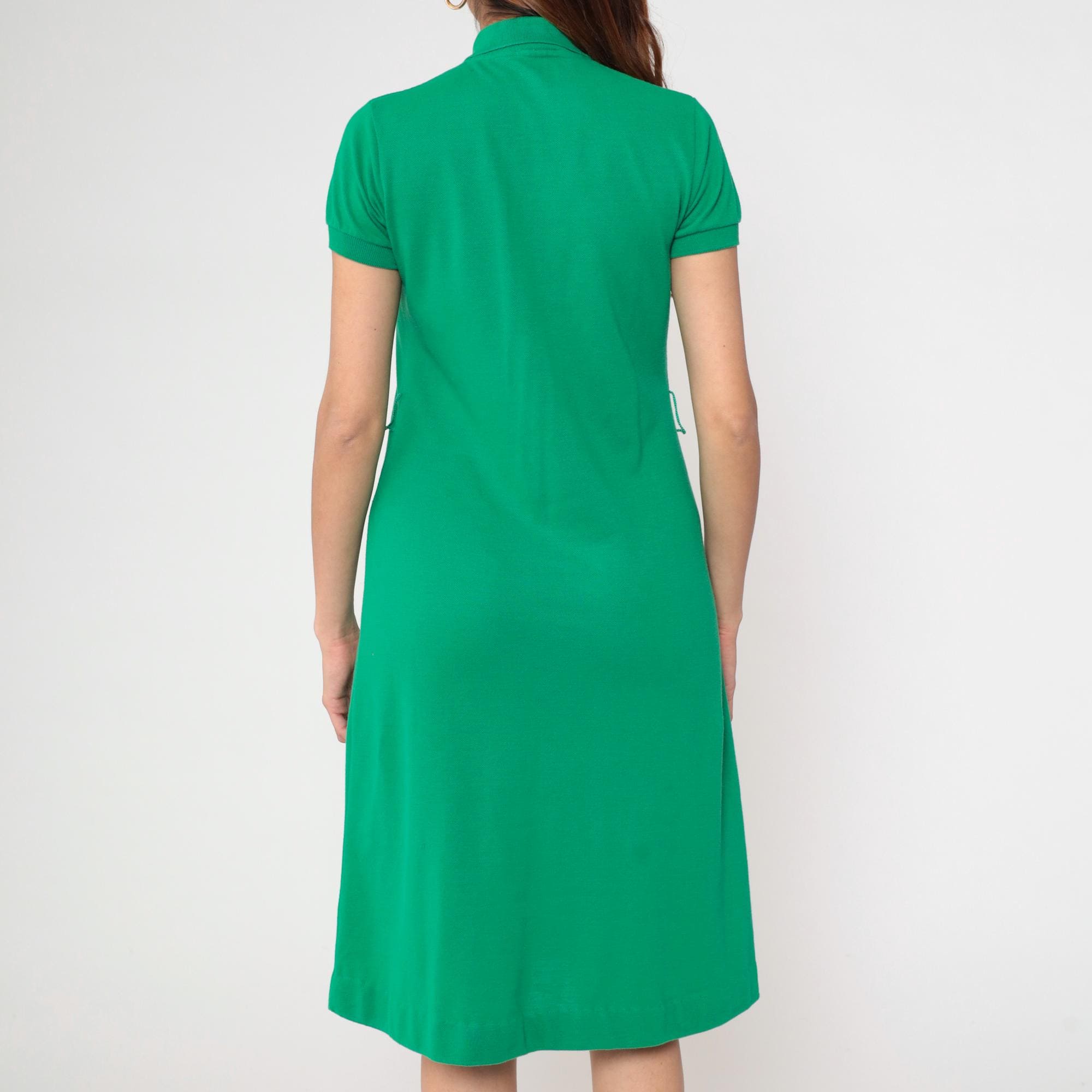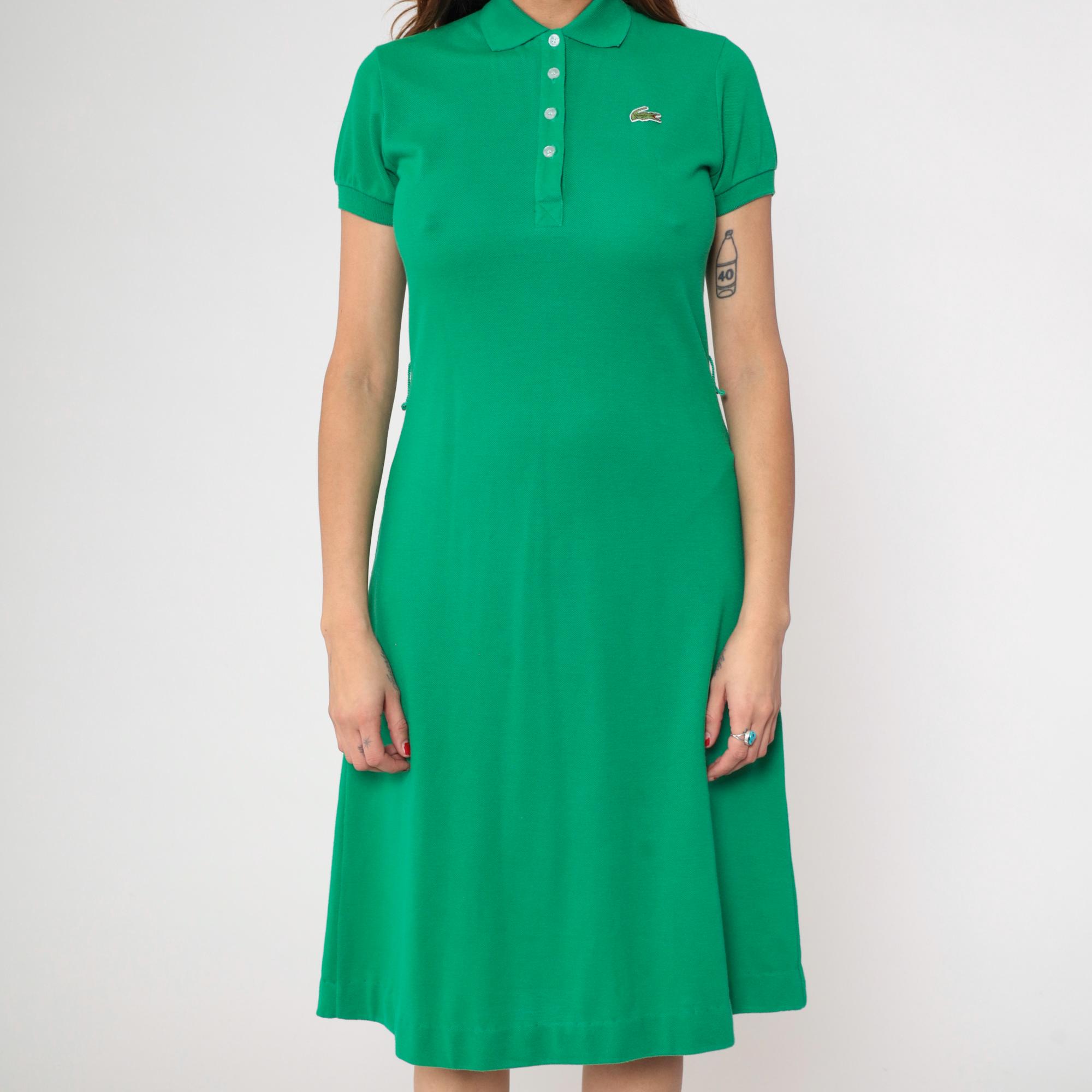 Vintage 70s Lacoste green polo dress by David Crystal features a collared neckline with a four-button placket, short sleeves, and a fitted yet relaxed silhouette.