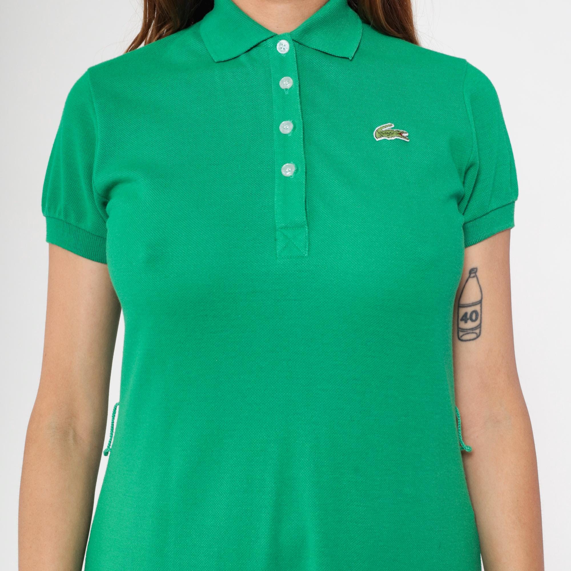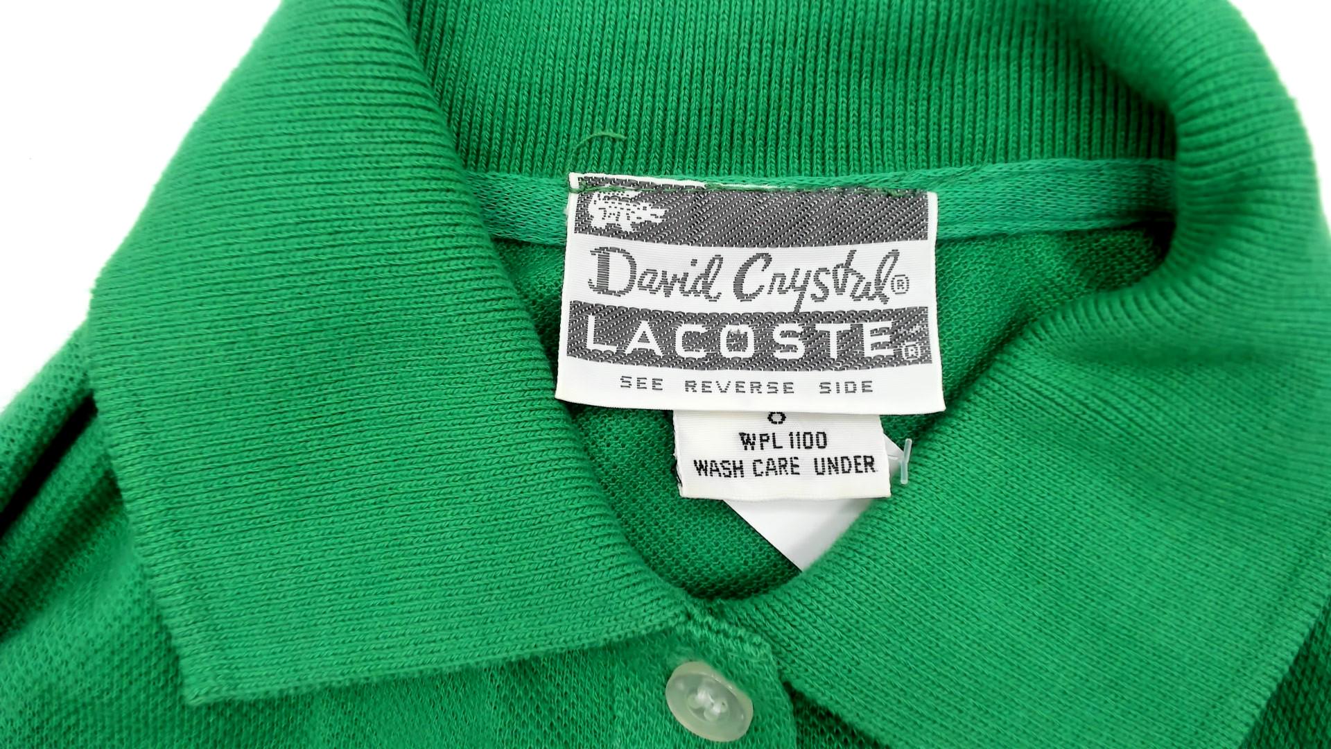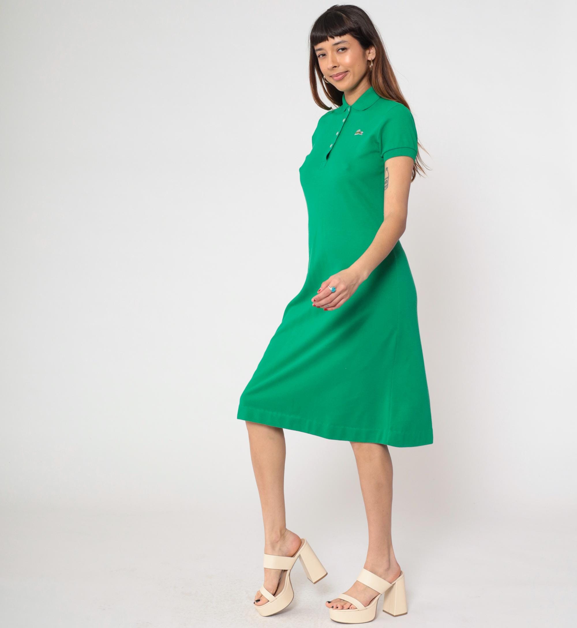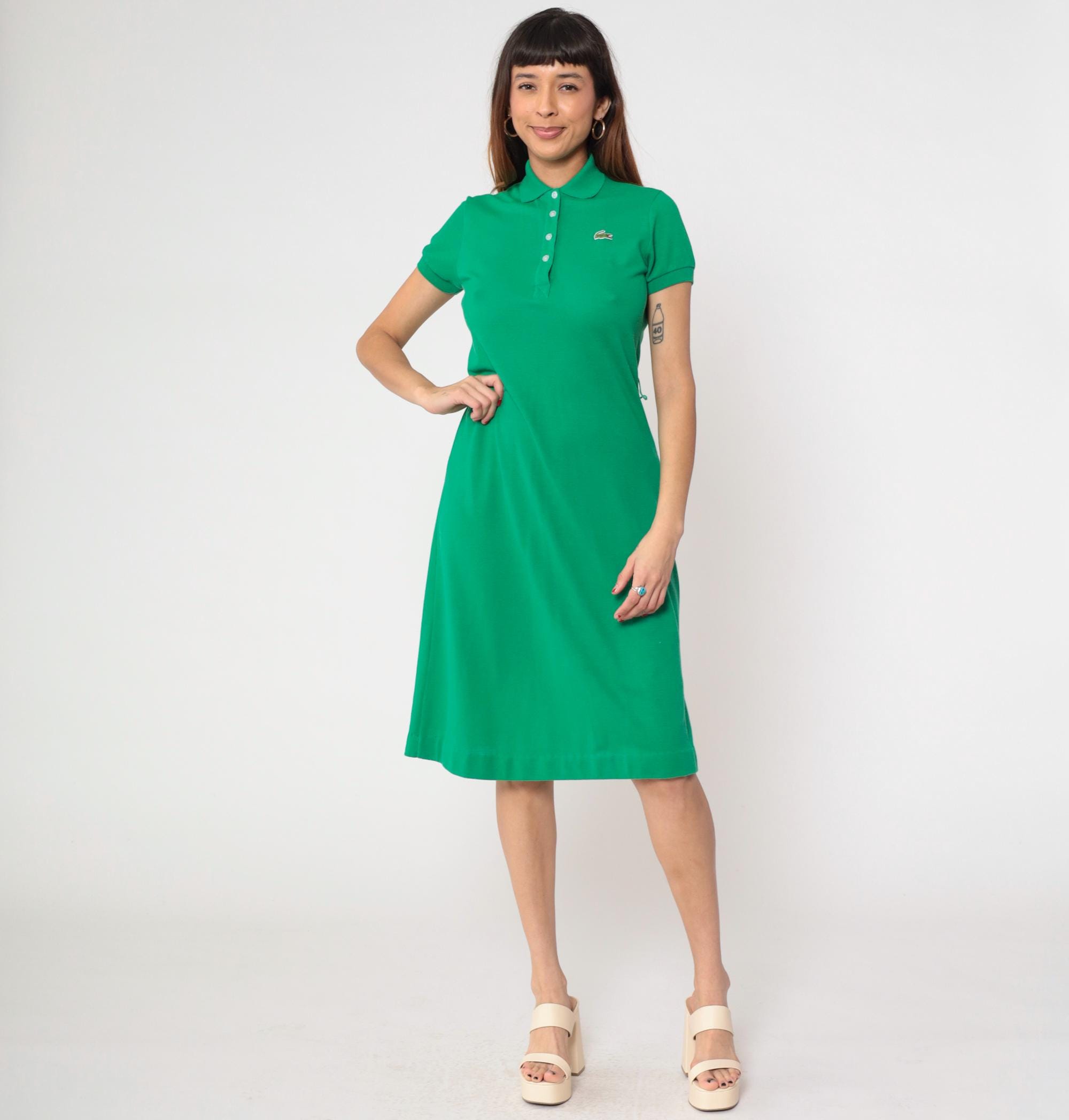 Vintage 70s Lacoste green polo dress by David Crystal features a collared neckline with a four-button placket, short sleeves, and a fitted yet relaxed silhouette.