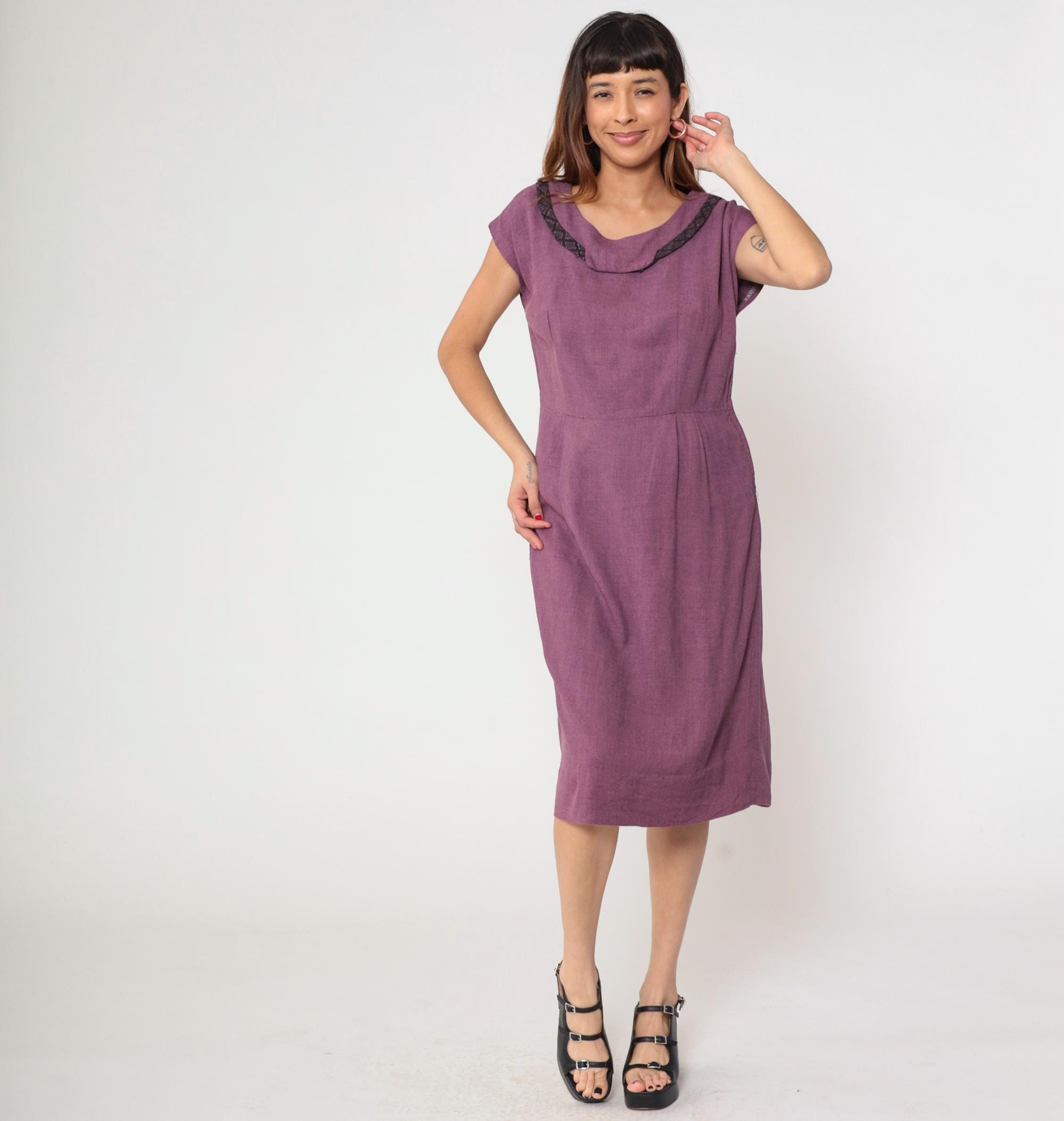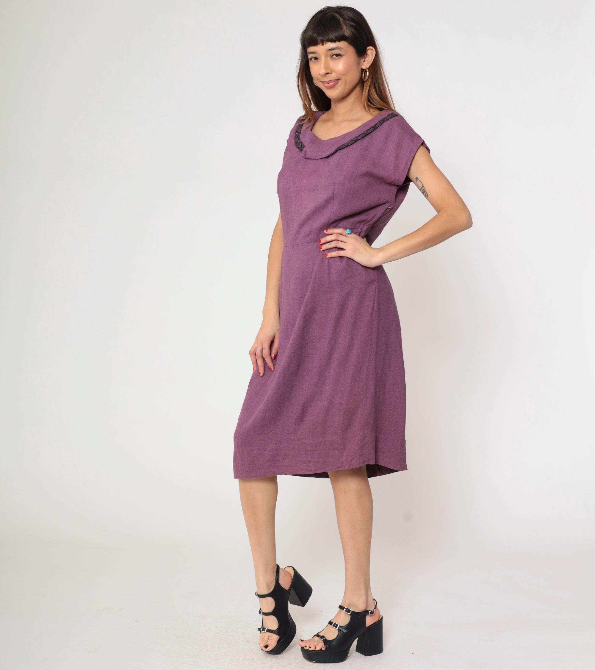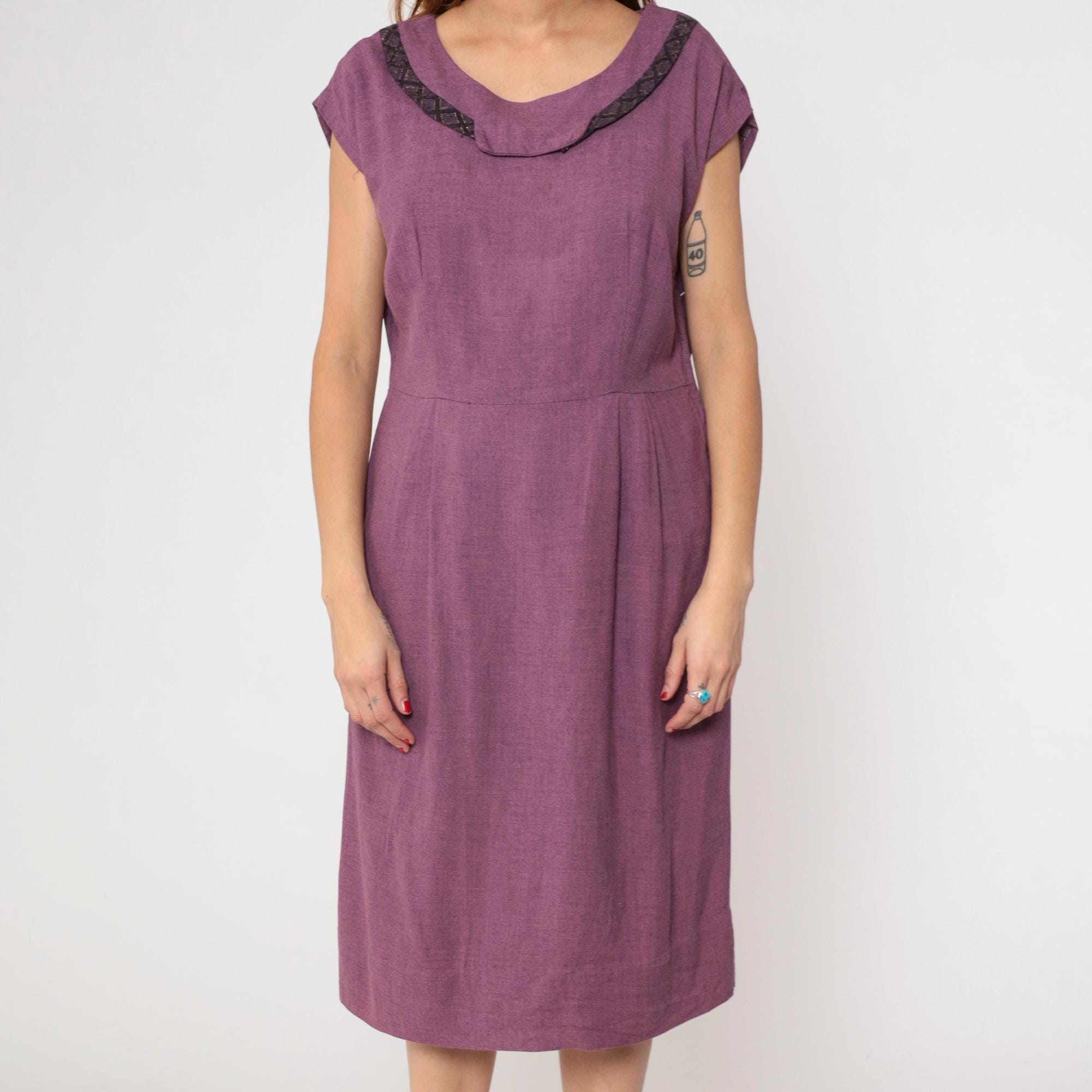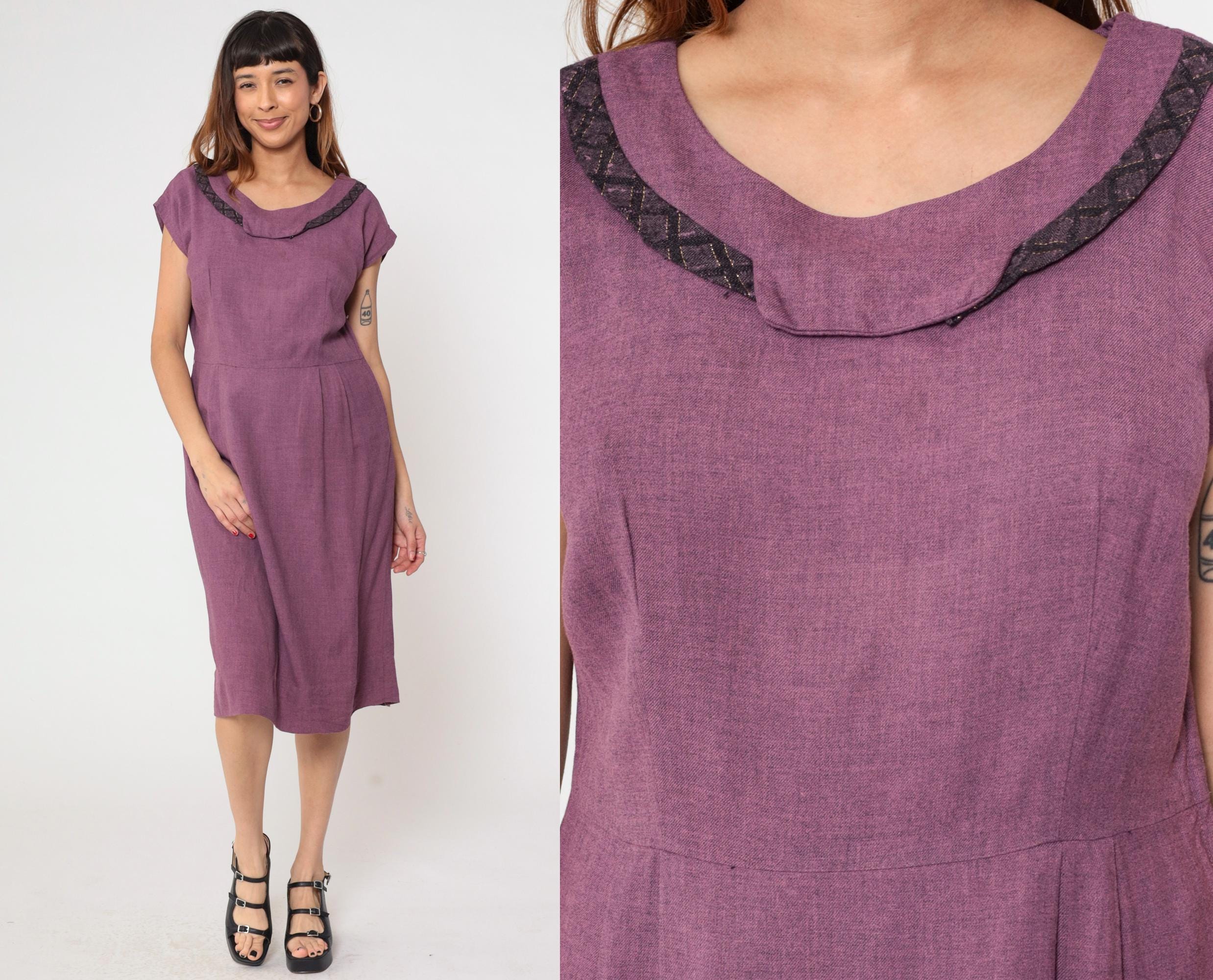 Vintage 60s purple midi dress by Gloria Swanson features a sleeveless shift silhouette with a draped cowl neckline. Black diamond lattice trim accents the collar for subtle contrast. The dress has a fitted waist and tailored darts with a below-the-knee length.