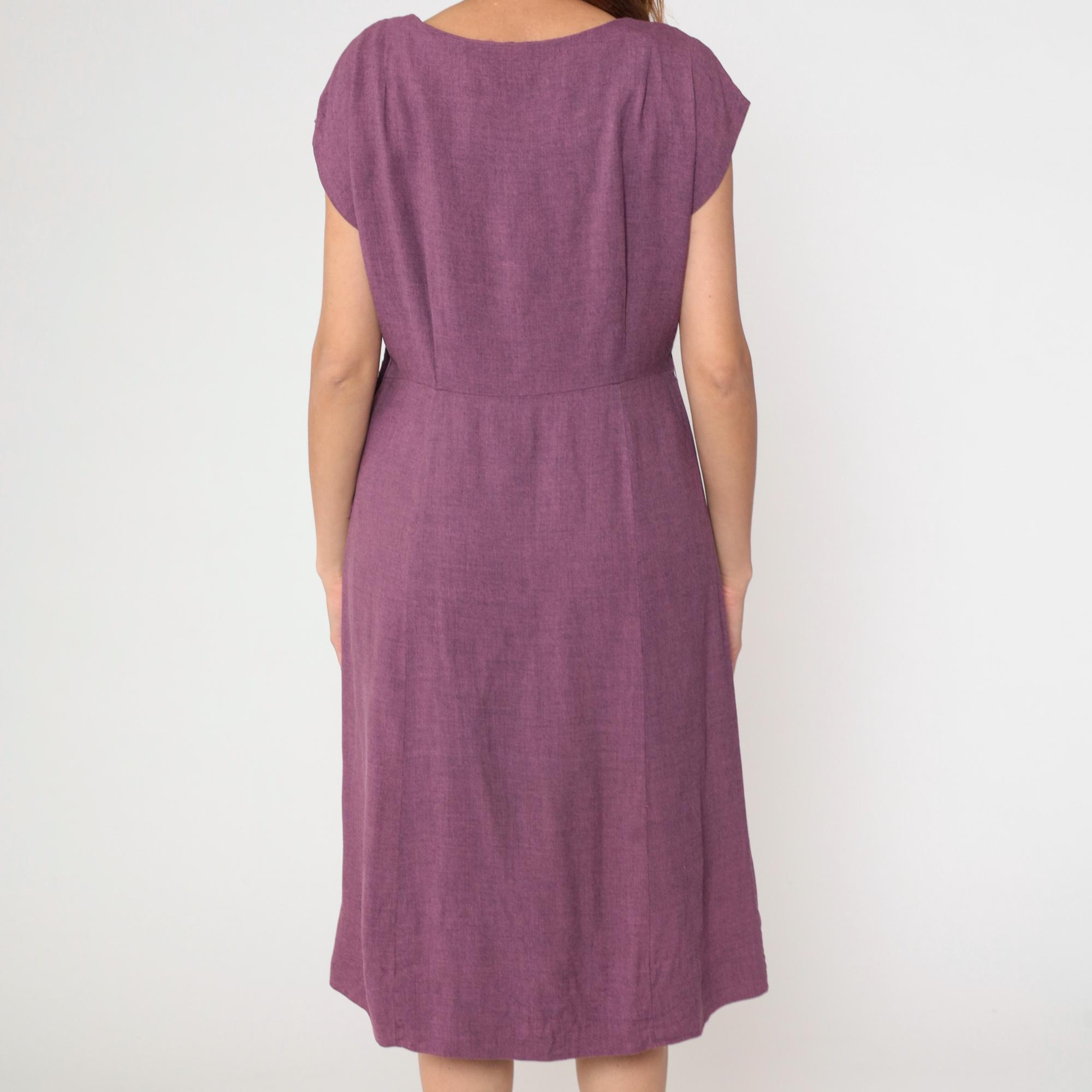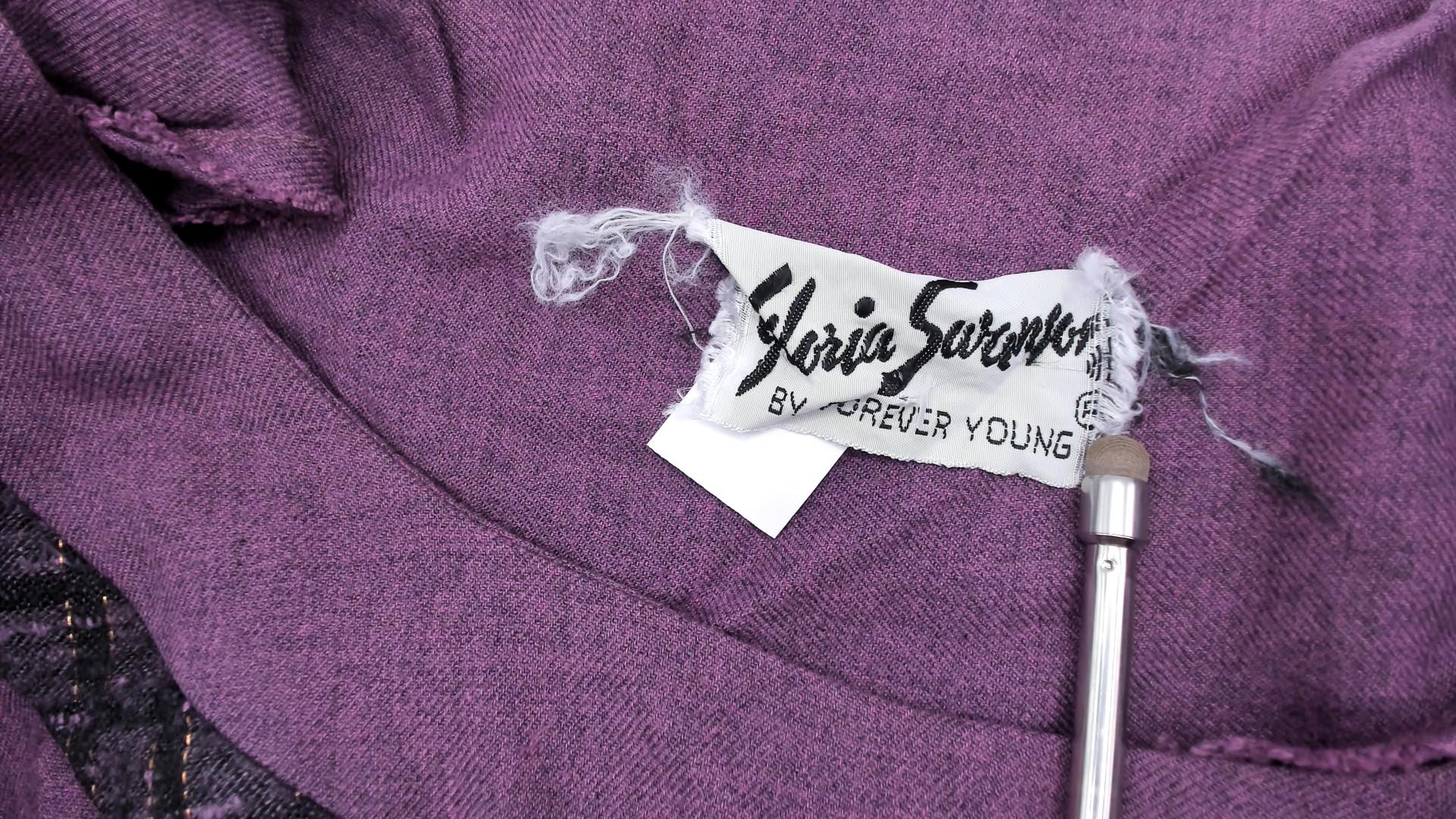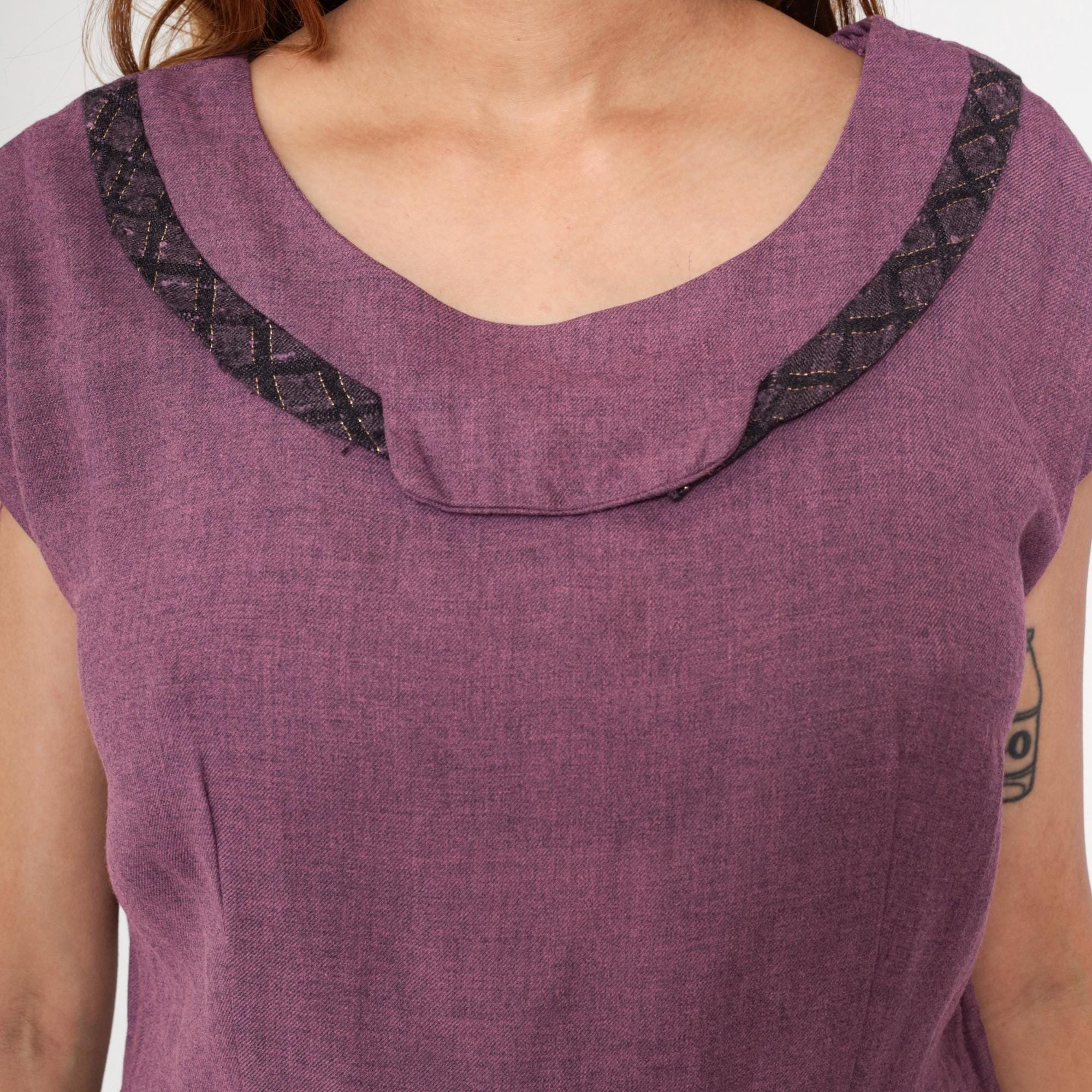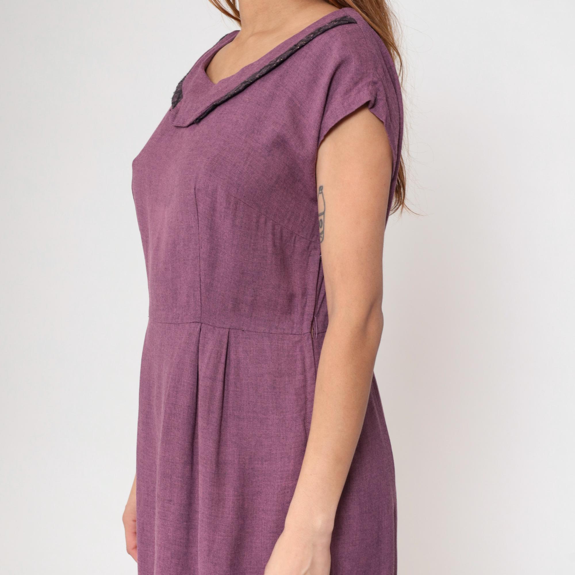 Vintage 60s purple midi dress by Gloria Swanson features a sleeveless shift silhouette with a draped cowl neckline. Black diamond lattice trim accents the collar for subtle contrast. The dress has a fitted waist and tailored darts with a below-the-knee length.