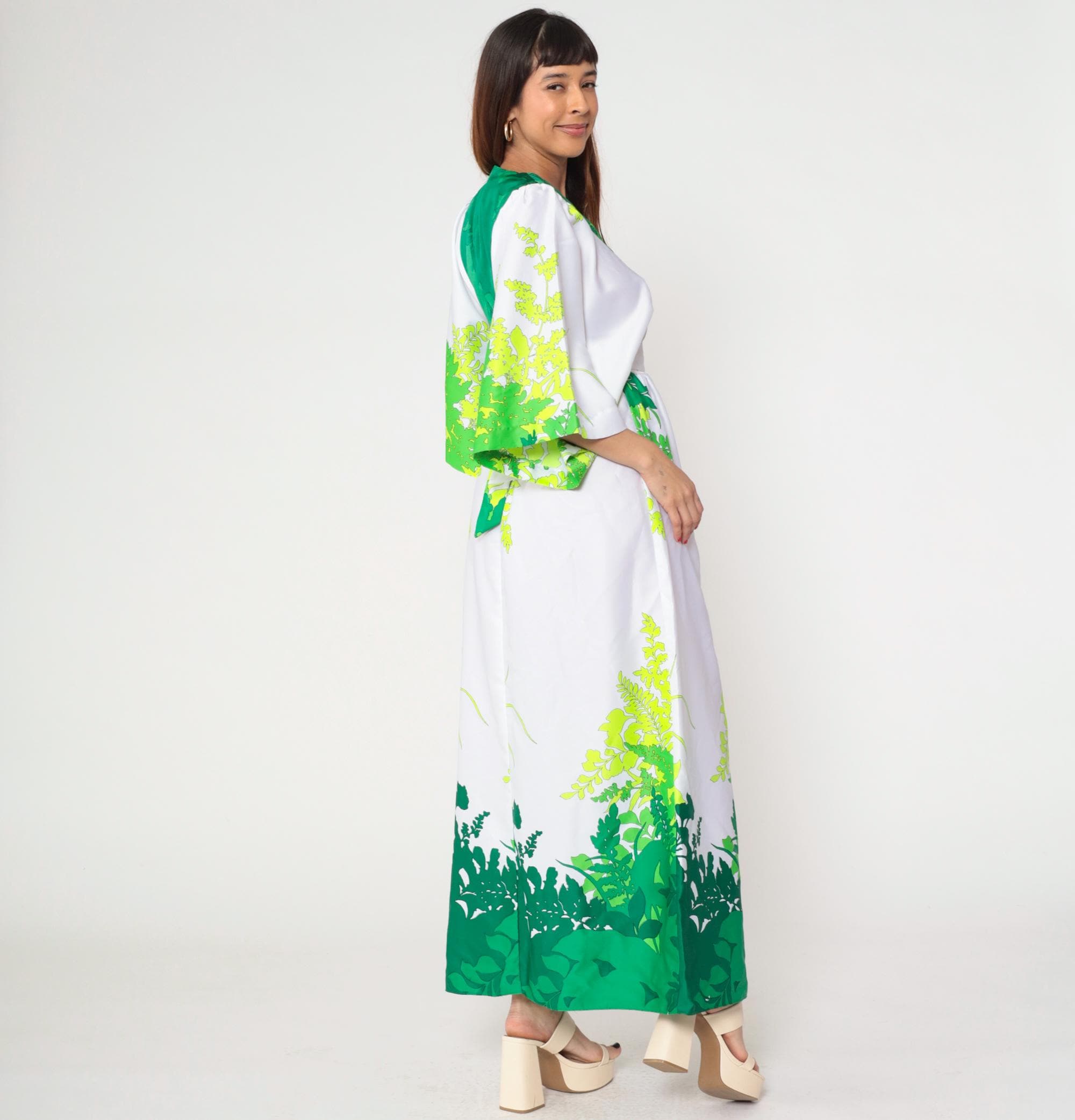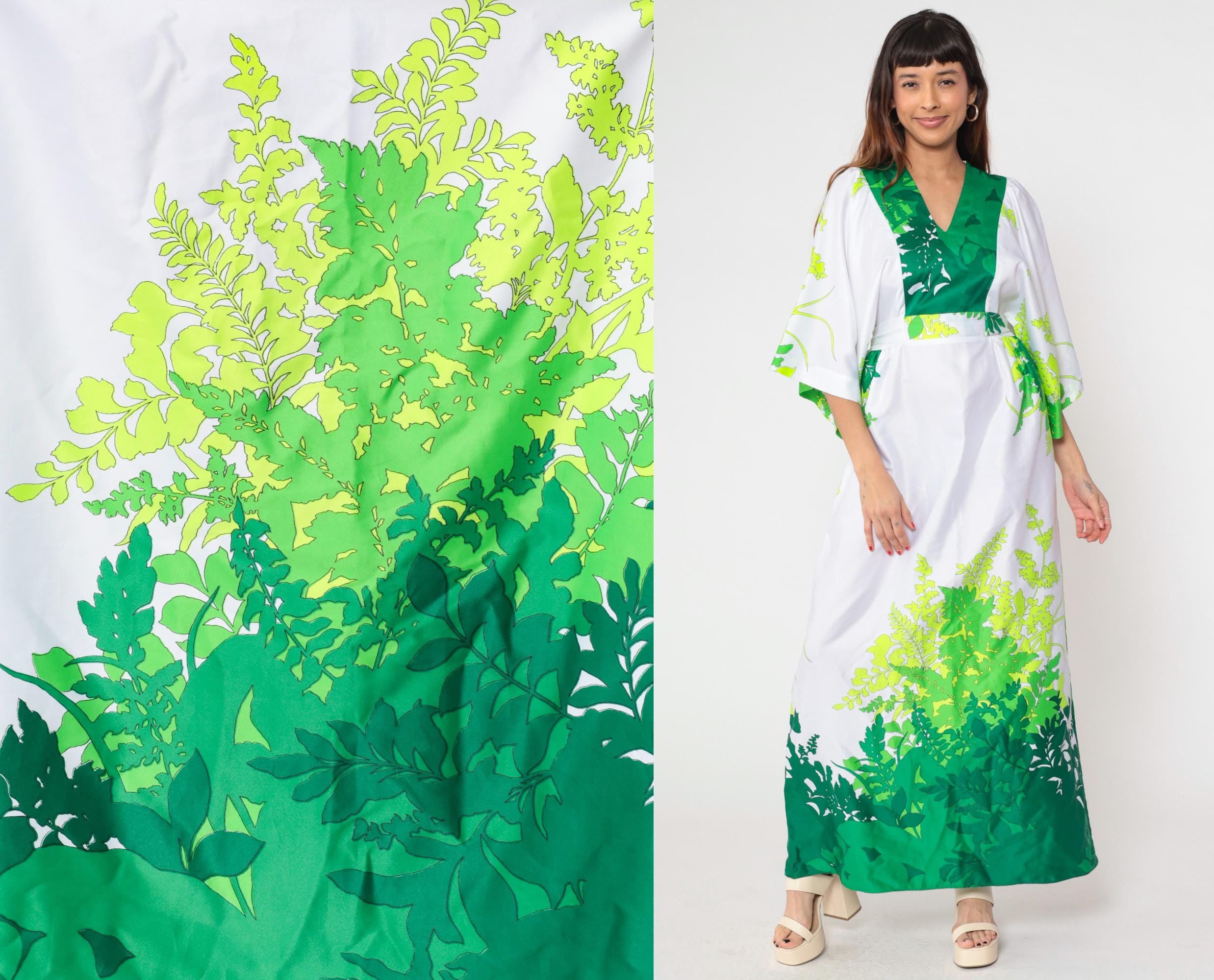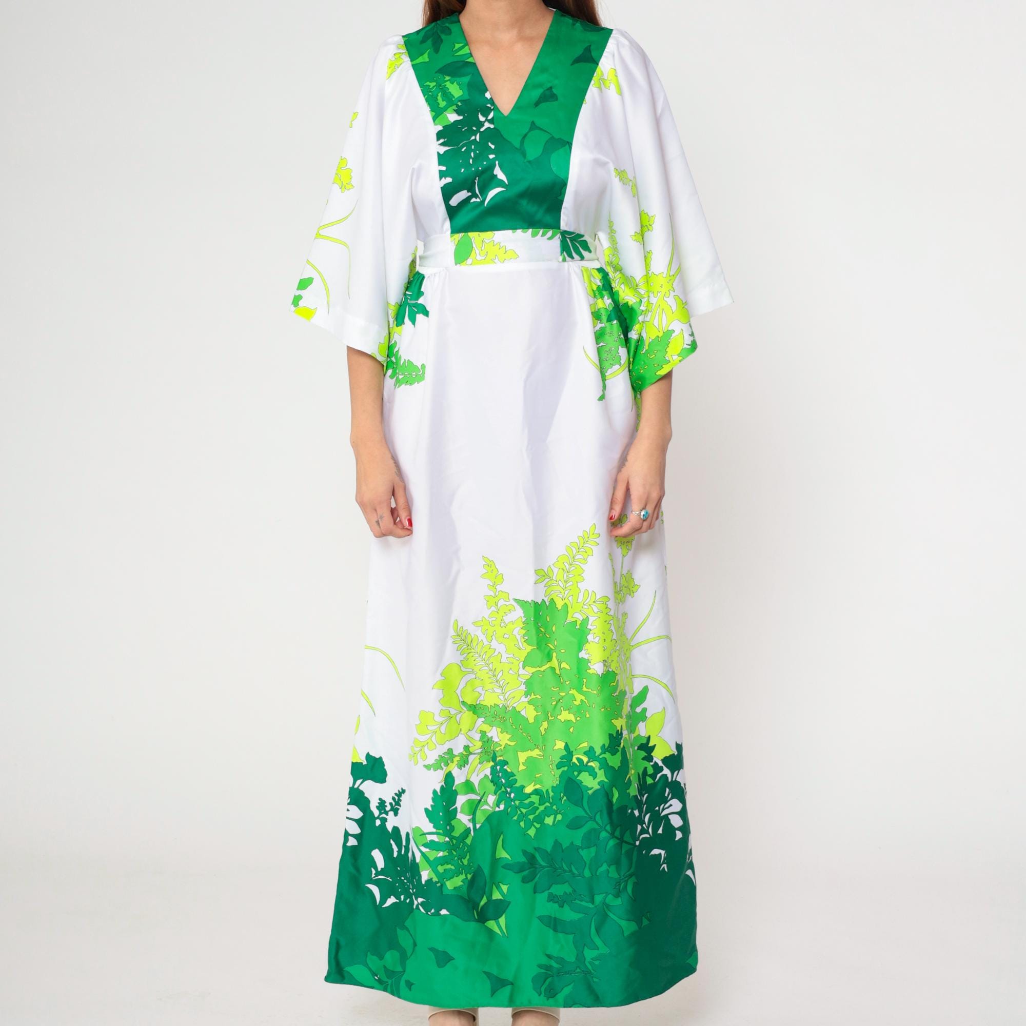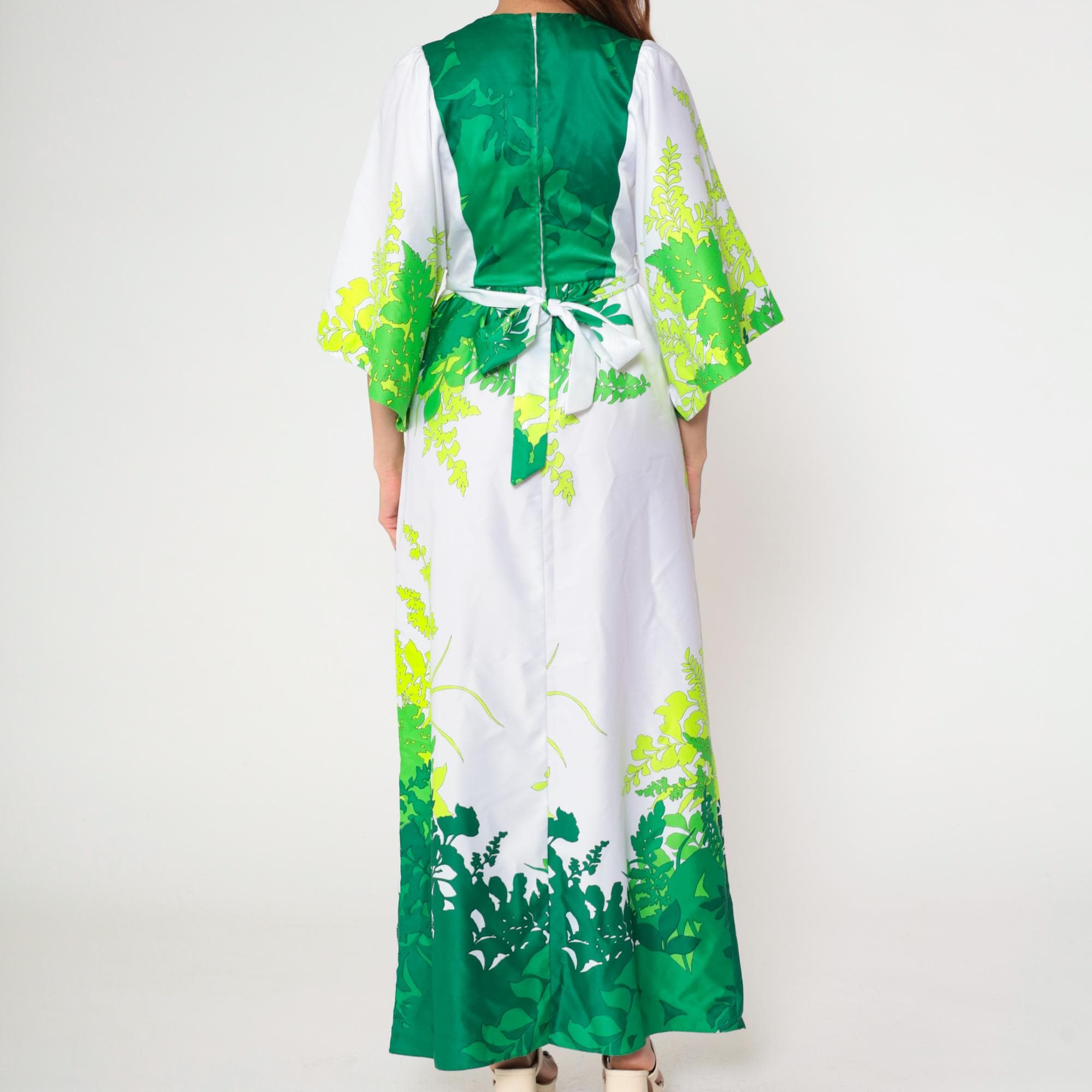 Vintage 70s Hilo Hattie by Evelyn Margolis Hawaiian maxi dress in white with a bold green tropical leaf print. Features wide kimono sleeves, a V-neckline with a contrasting green bodice, and a tie-back waist for shape. The dress has a long flowing silhouette with a rear zipper closure.