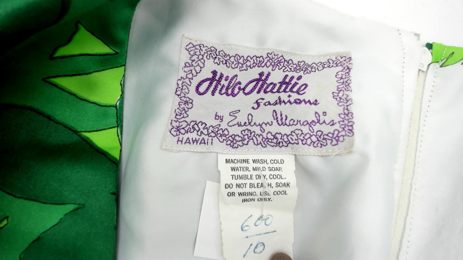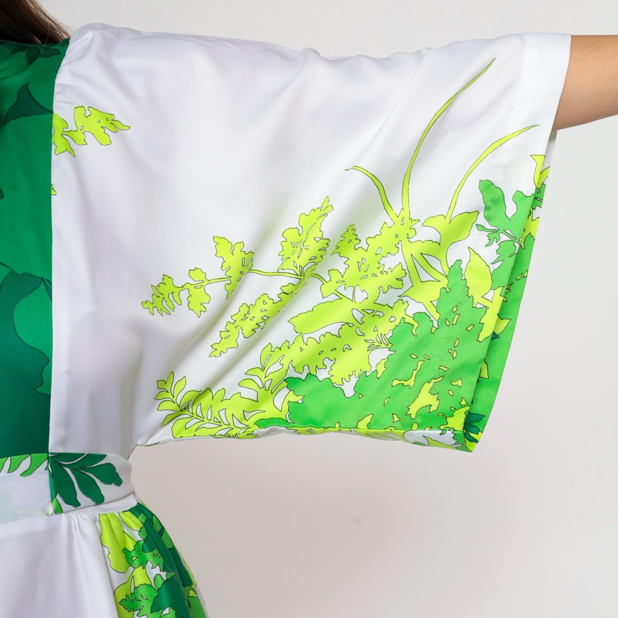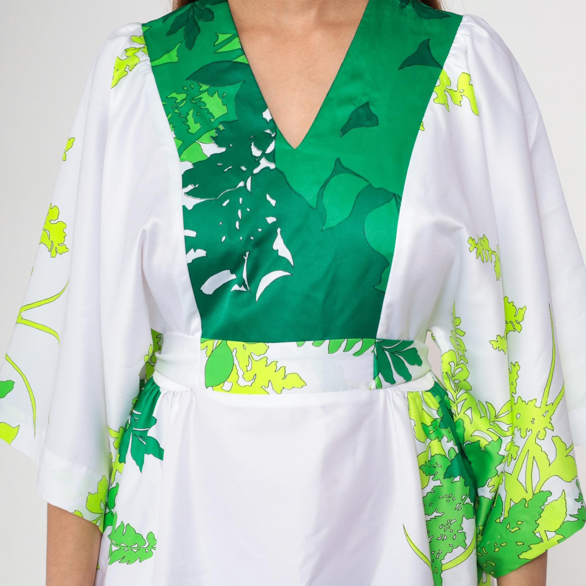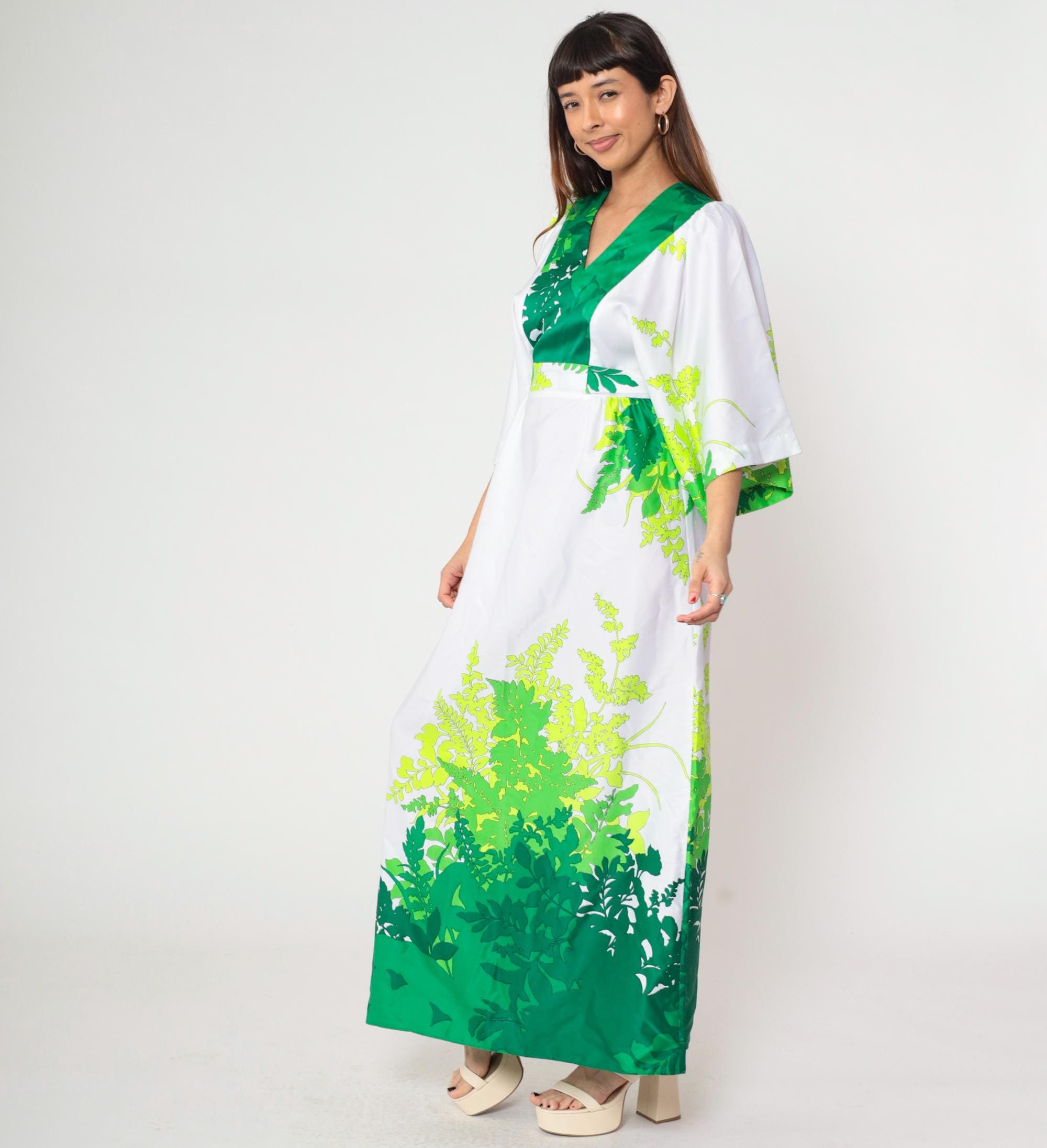 Vintage 70s Hilo Hattie by Evelyn Margolis Hawaiian maxi dress in white with a bold green tropical leaf print. Features wide kimono sleeves, a V-neckline with a contrasting green bodice, and a tie-back waist for shape. The dress has a long flowing silhouette with a rear zipper closure.