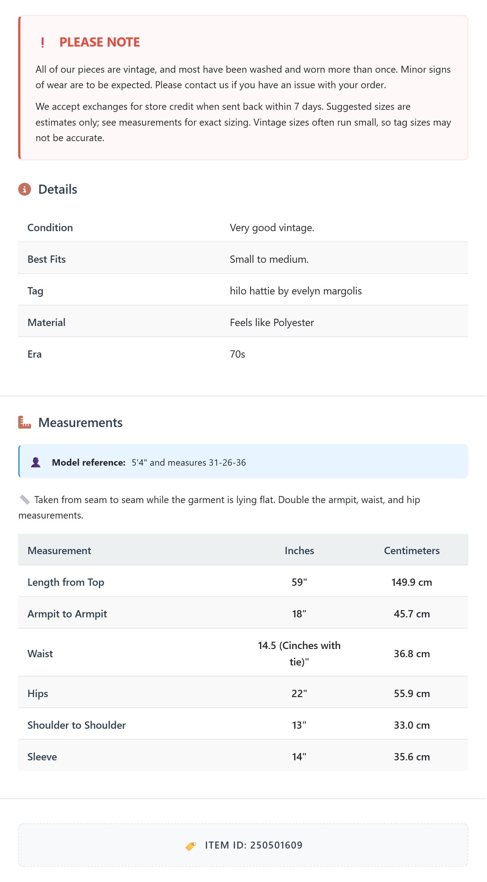 All of our pieces are vintage, and most have been washed and worn more than once. Minor signs of wear are to be expected. Please contact us if you have an issue with your order. We accept exchanges for store credit when sent back within 7 days.