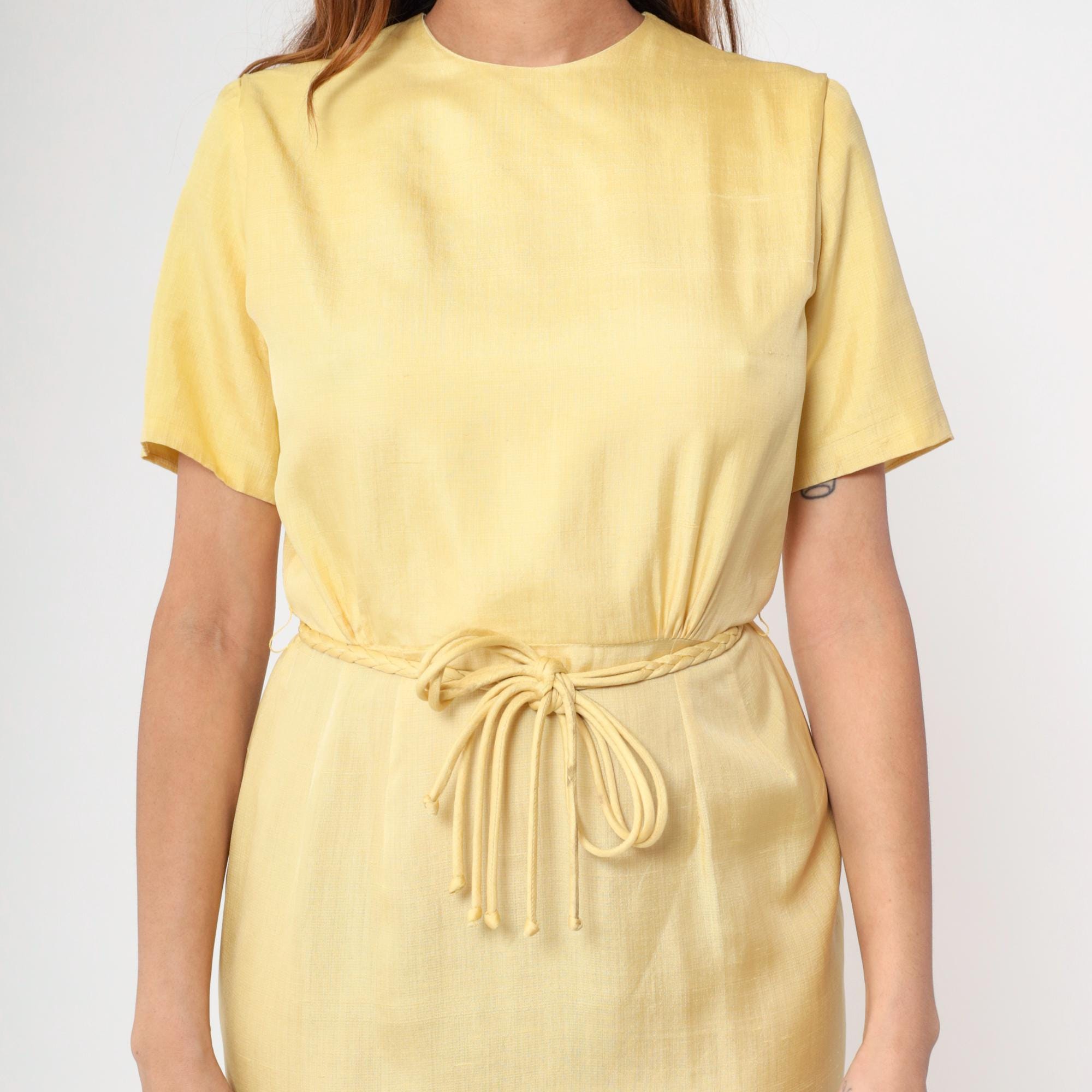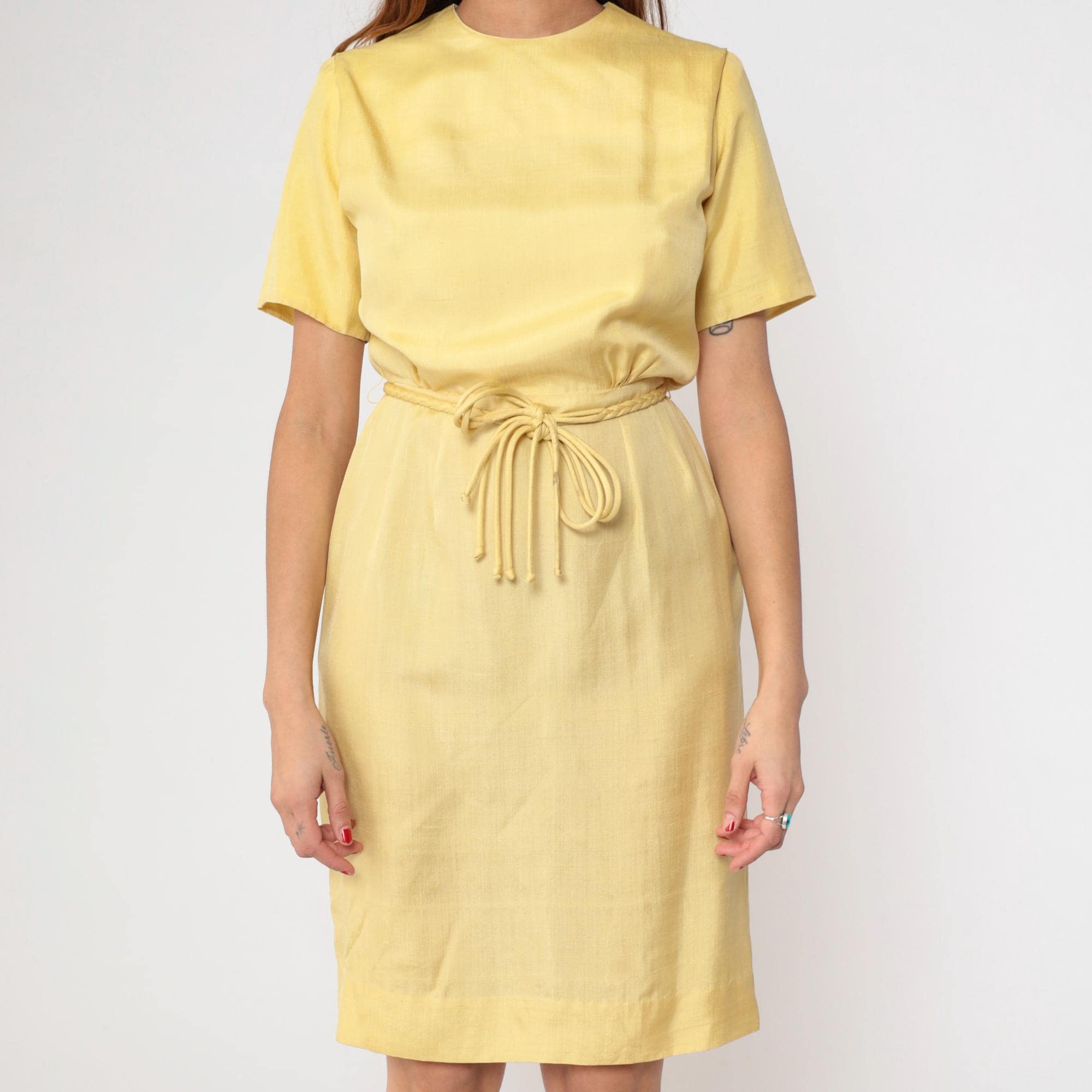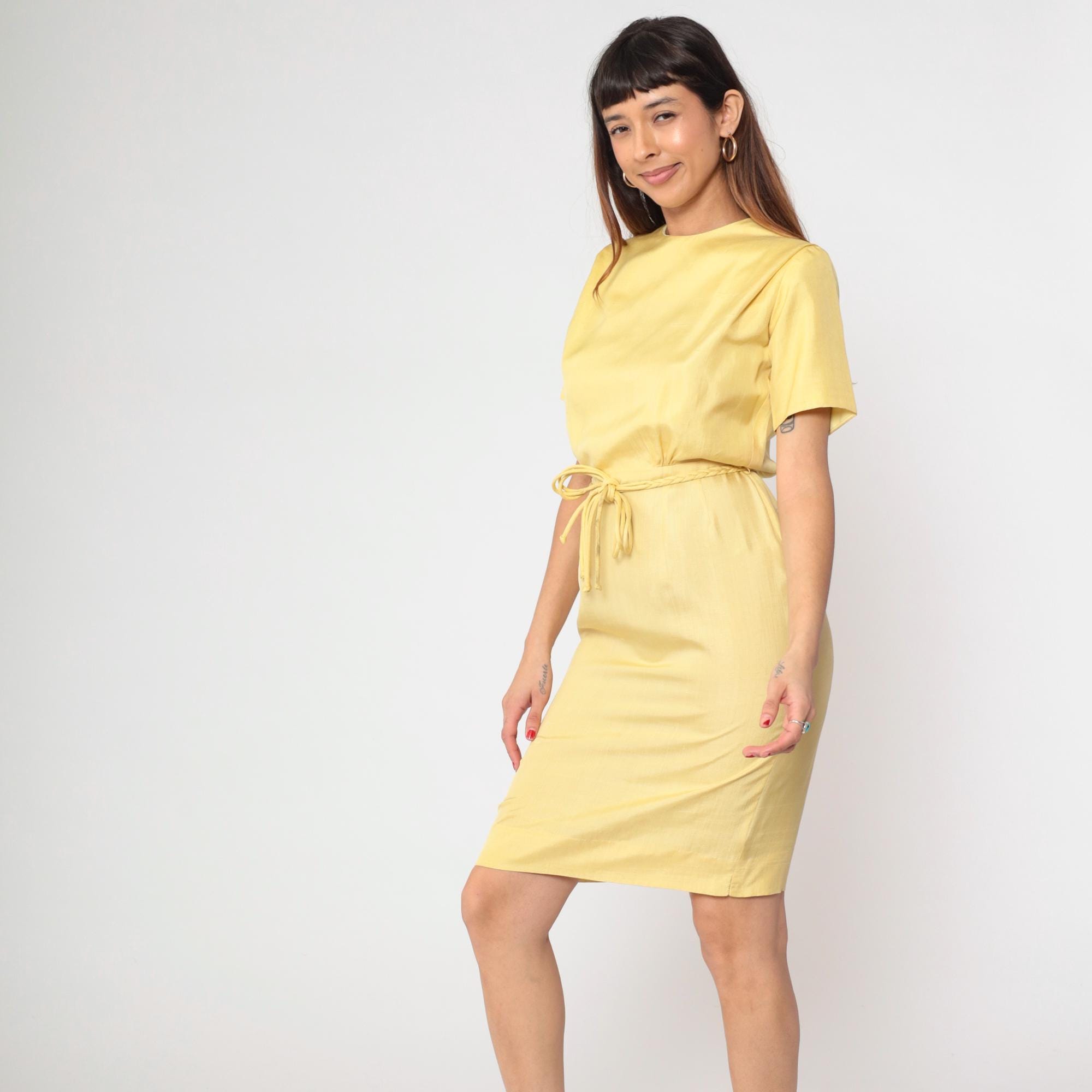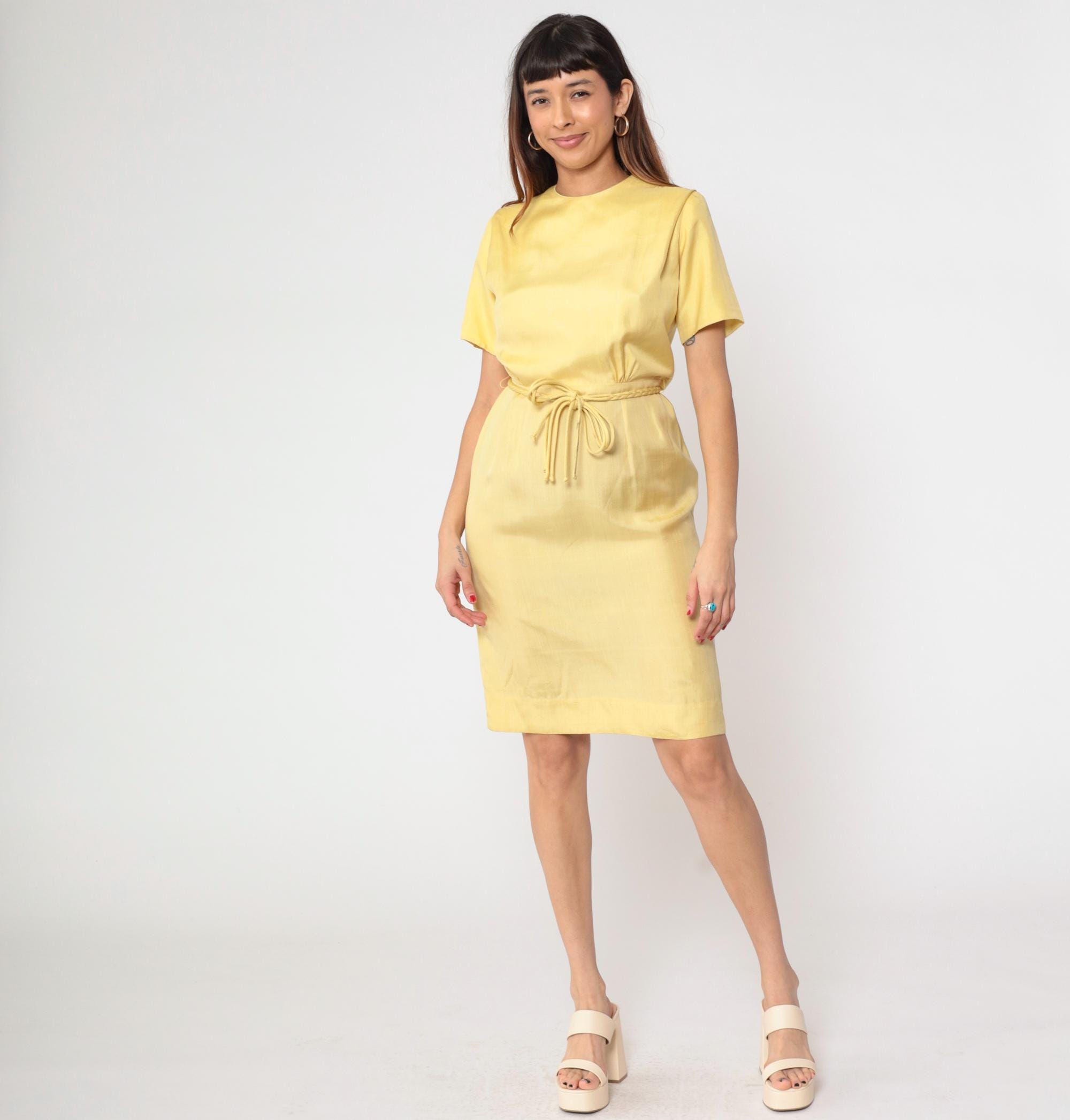 50s yellow shift dress with self-tie belt. Features a classic crew neckline, short sleeves, and back zip closure. The dress is made from a silk-like fabric with a slight sheen.