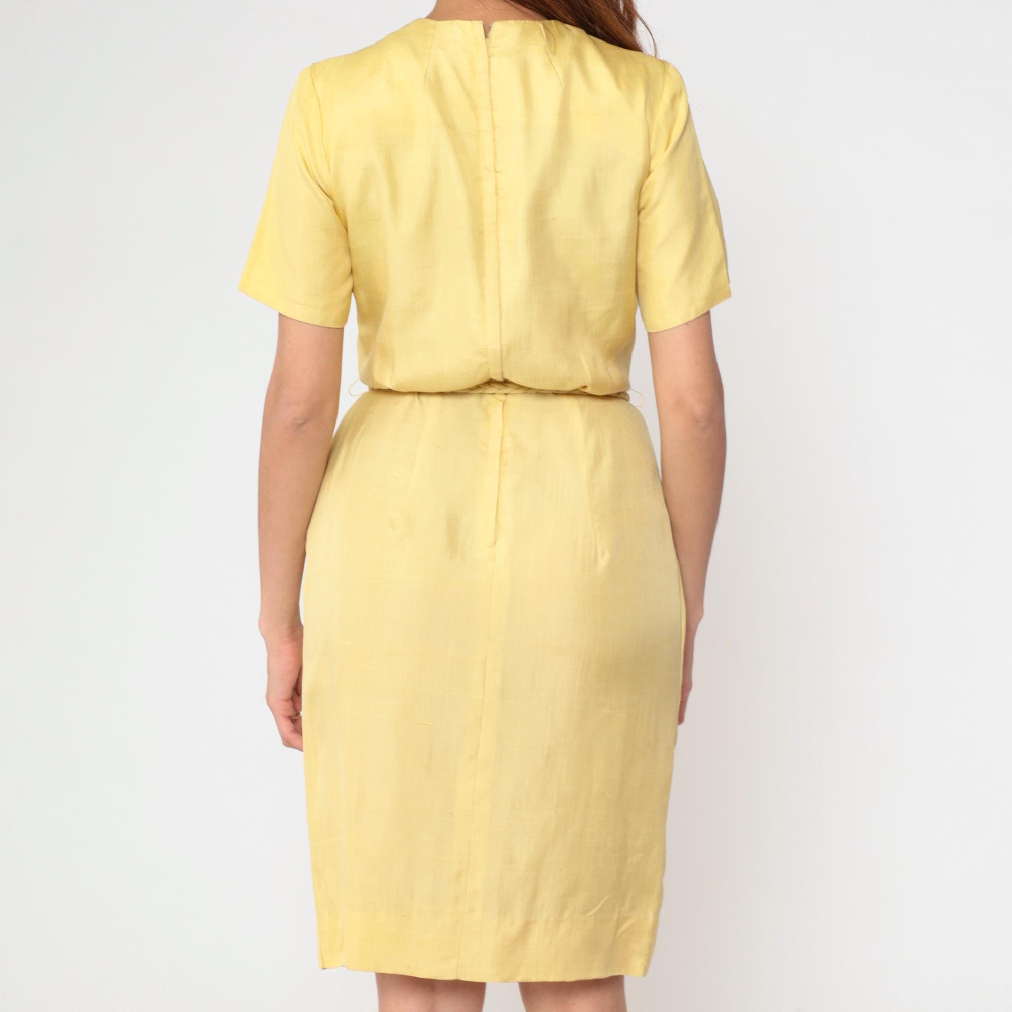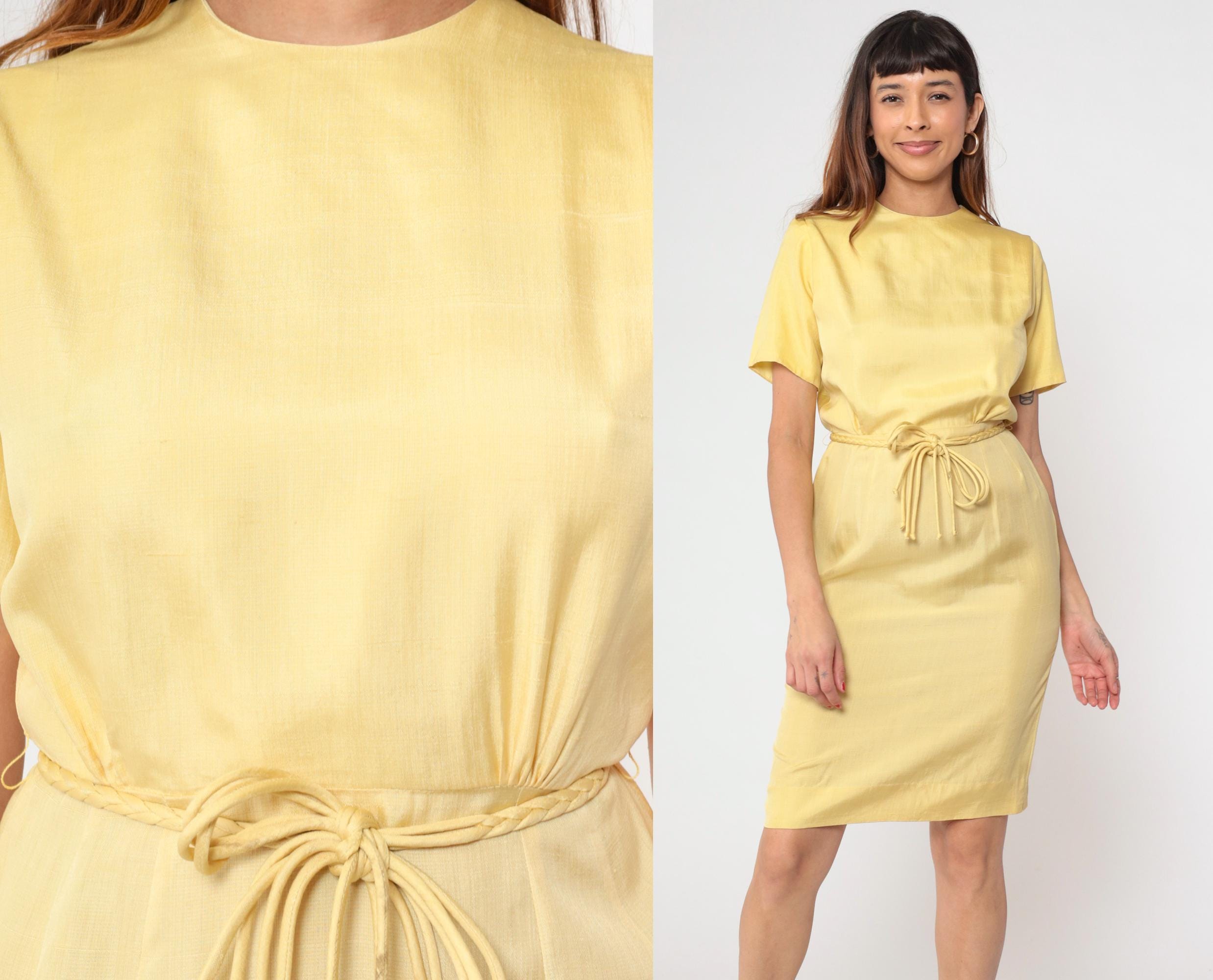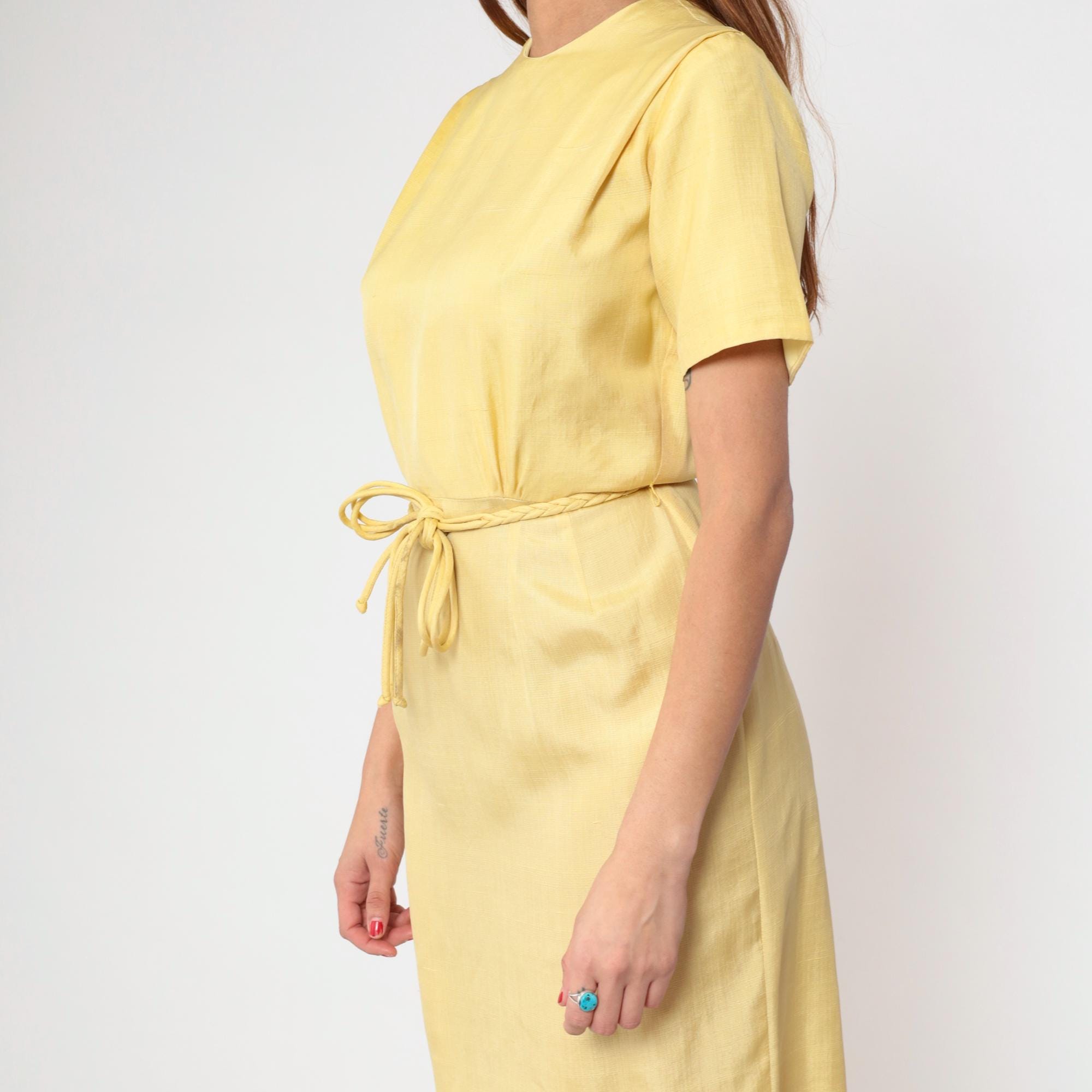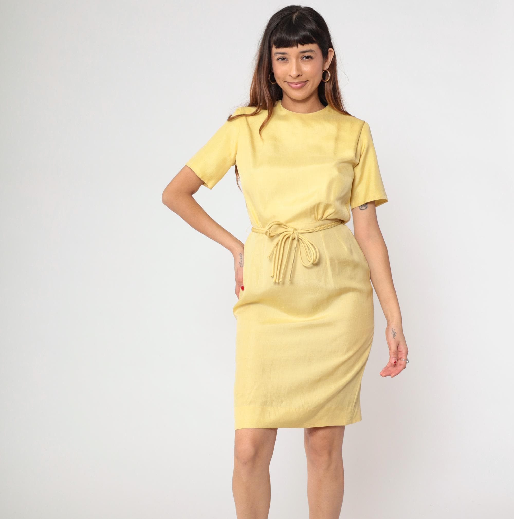 50s yellow shift dress with self-tie belt. Features a classic crew neckline, short sleeves, and back zip closure. The dress is made from a silk-like fabric with a slight sheen.