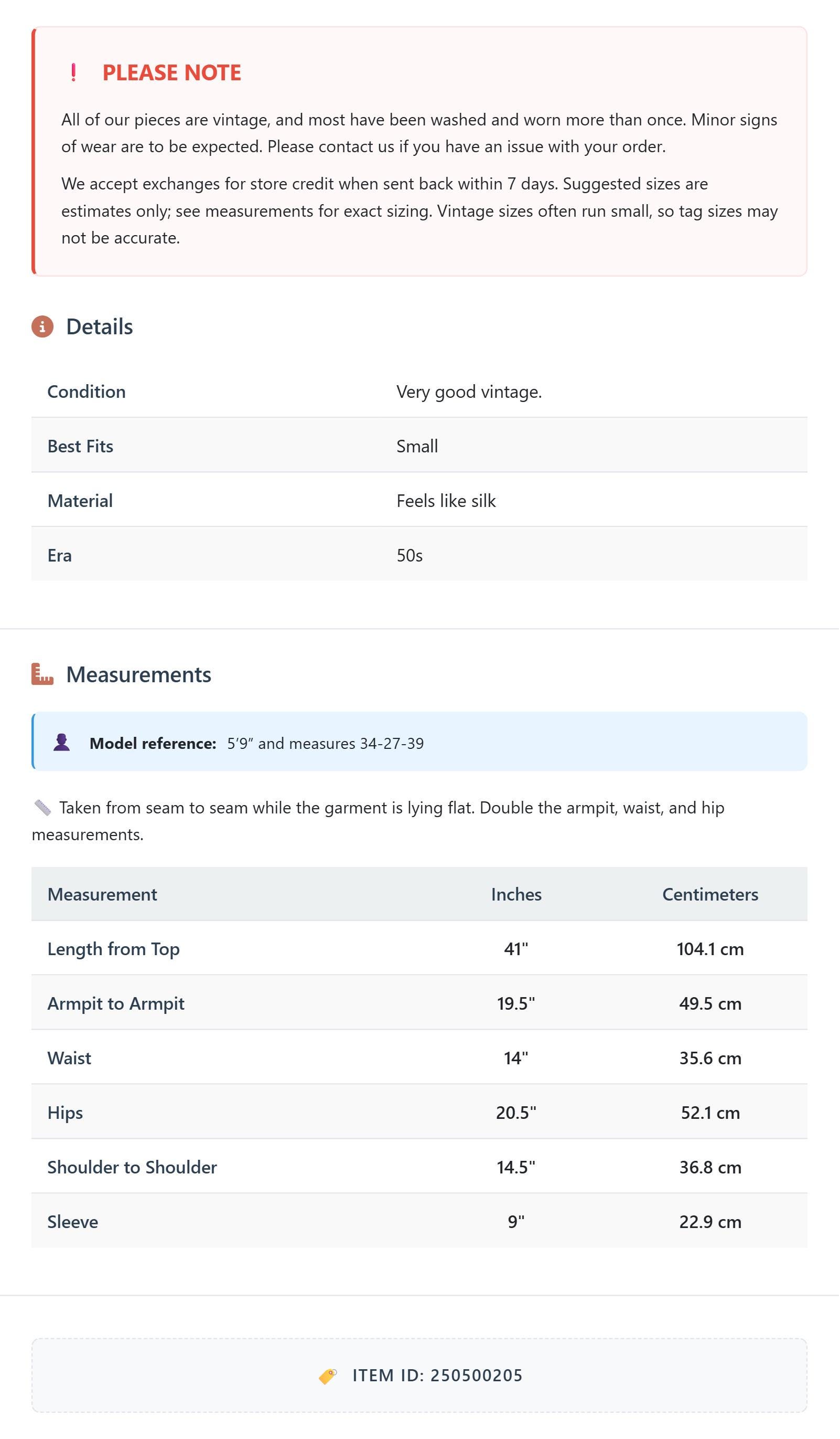 All of our pieces are vintage, and most have been washed and worn more than once. Minor signs of wear are to be expected. Please contact us if you have an issue with your order. We accept exchanges for store credit when sent back within 7 days.