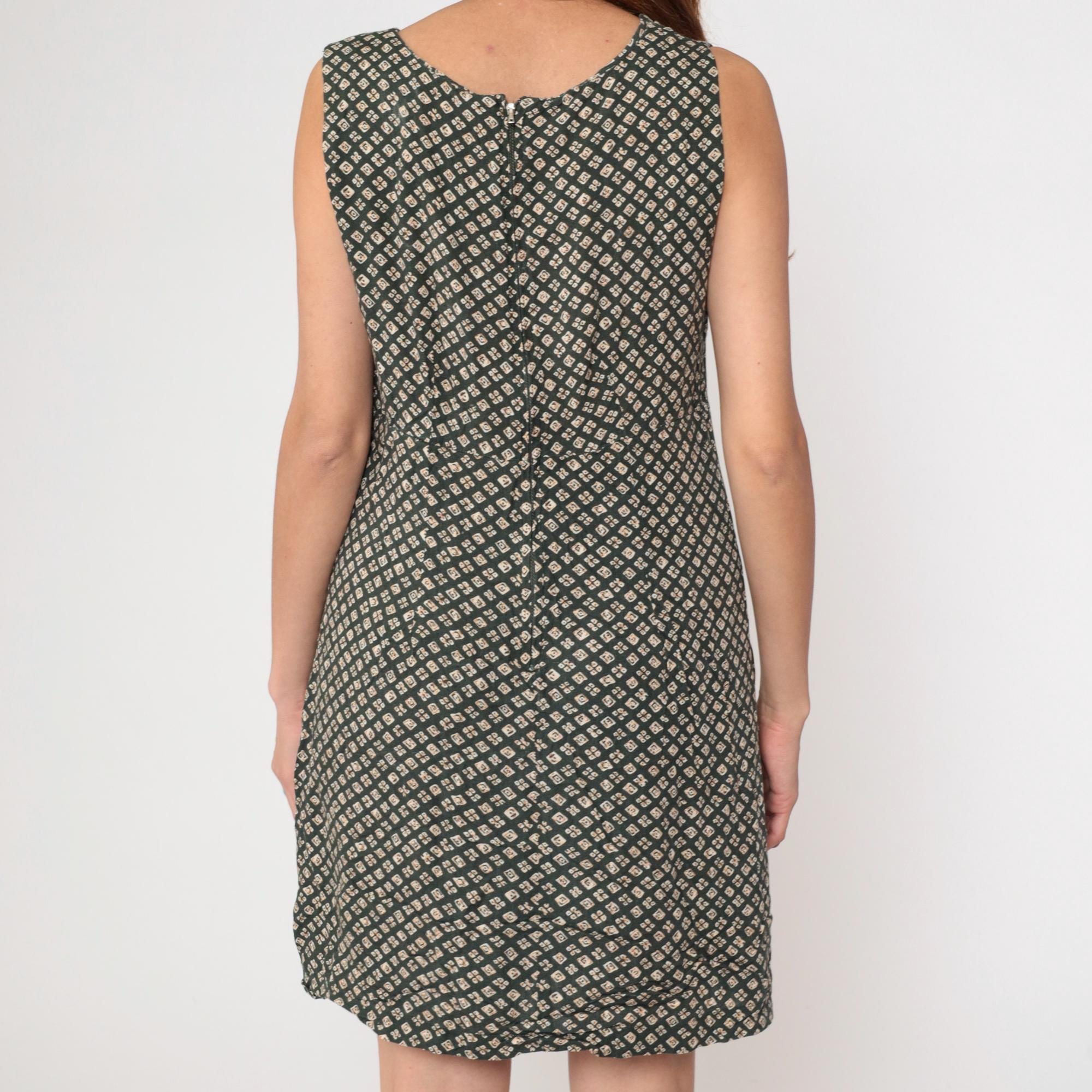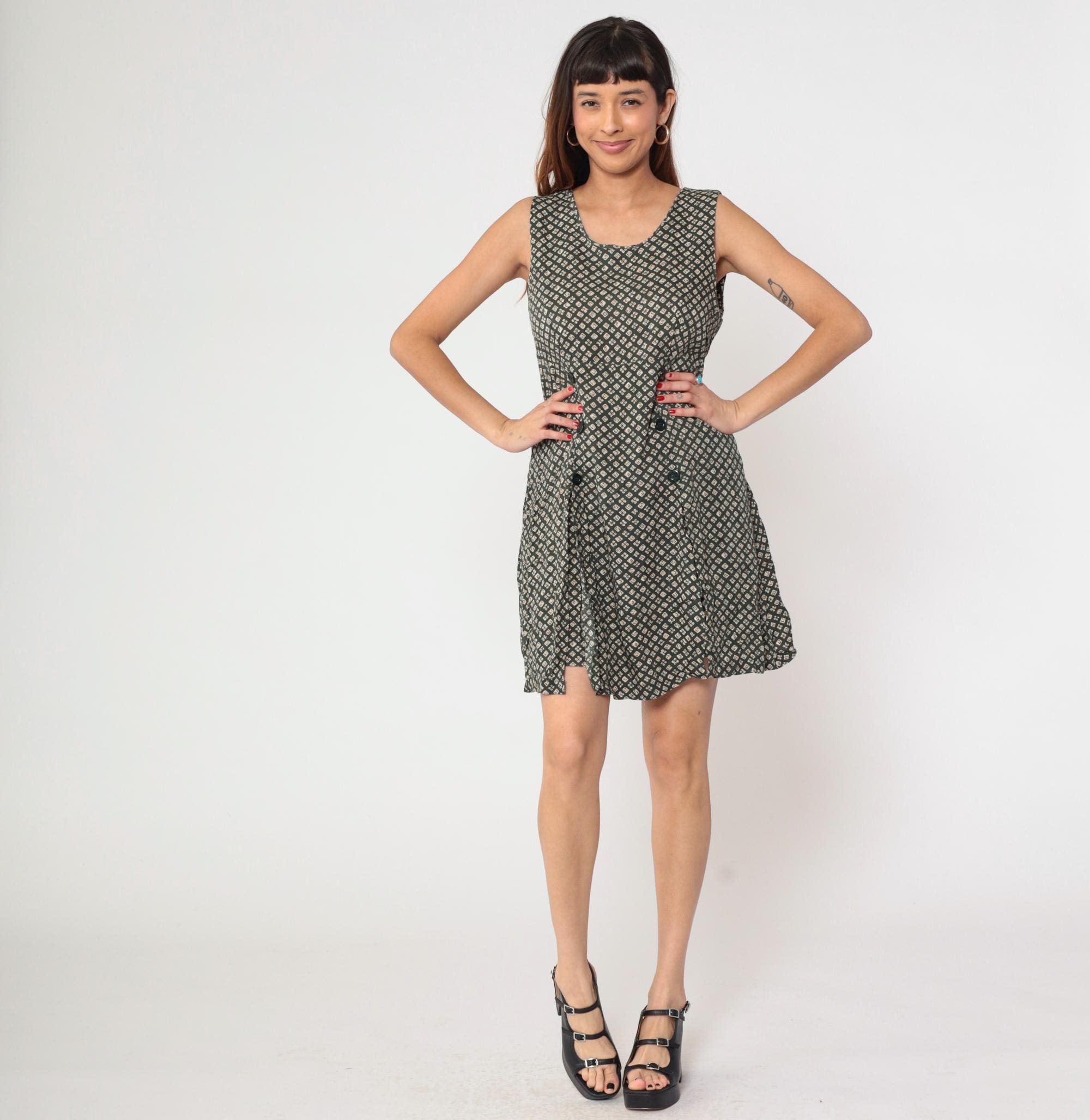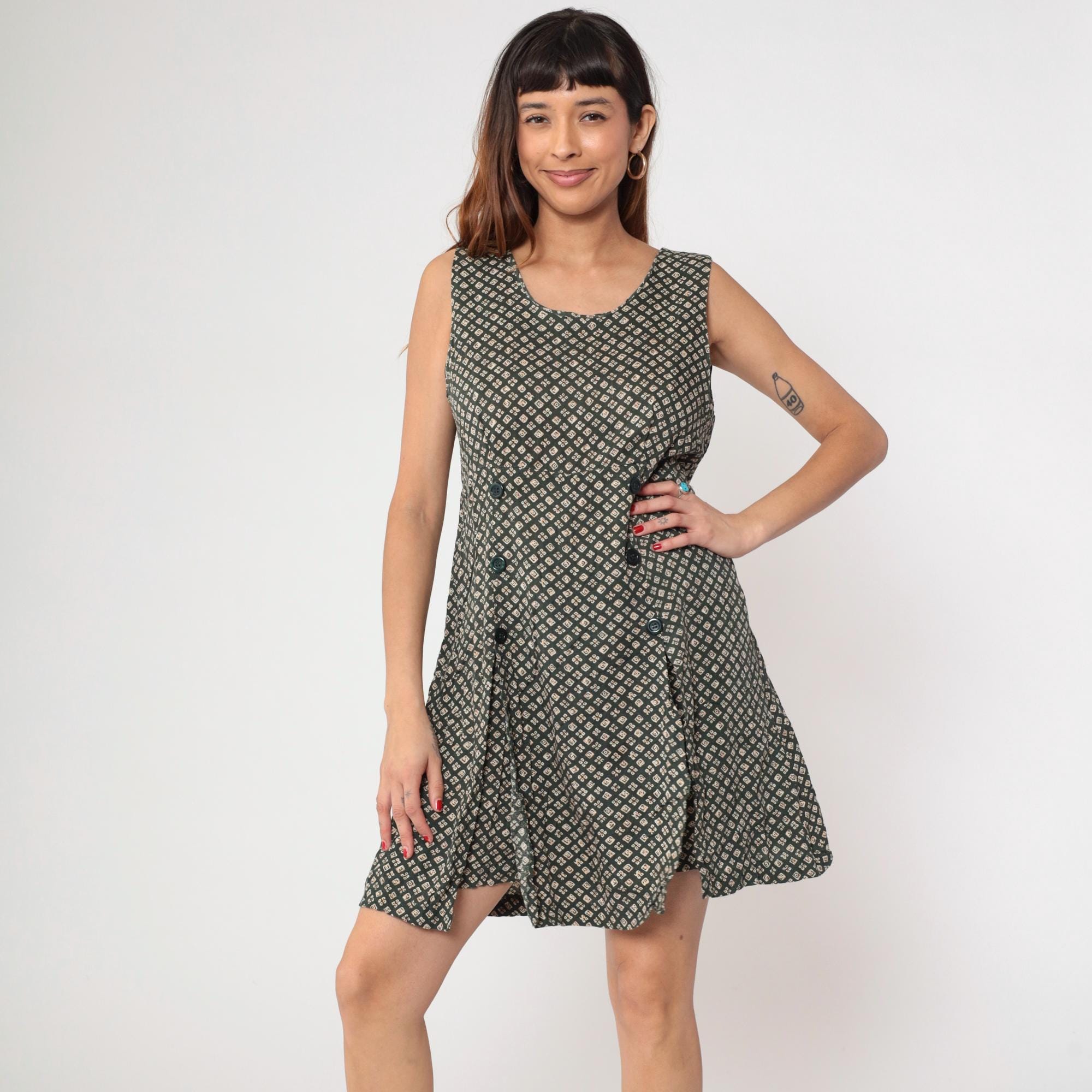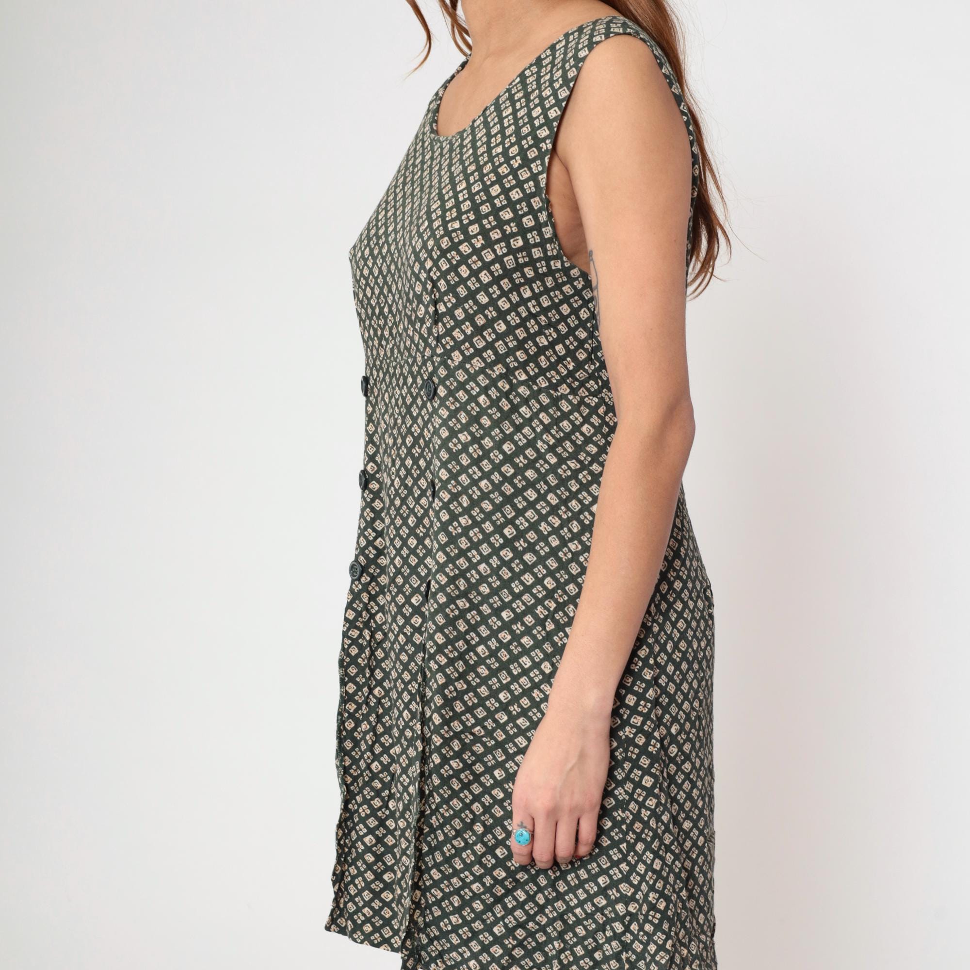 90s geometric mini romper from Liberty. Features a classic scoop neckline, sleeveless design, and decorative button details on the front. This A-line romper has a flared silhouette with front pleats for movement. Made from rayon with a forest green background and cream geometric print.