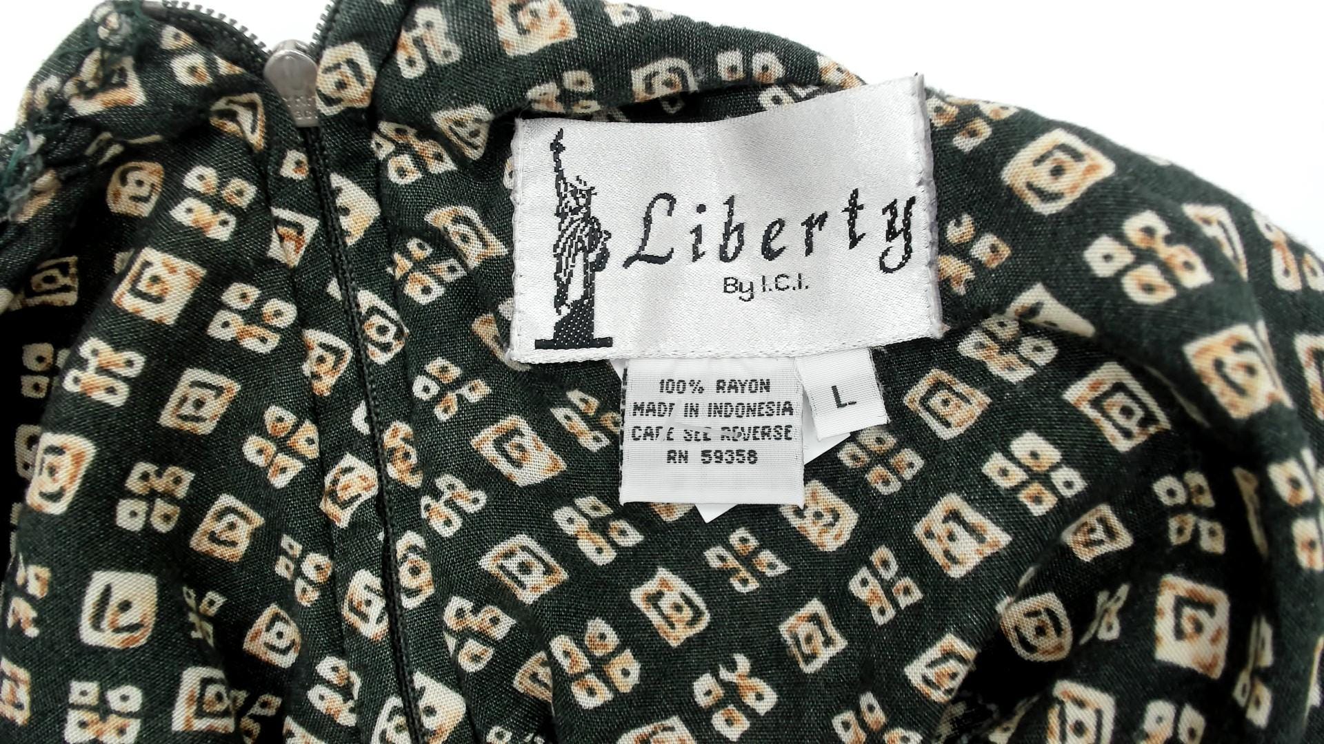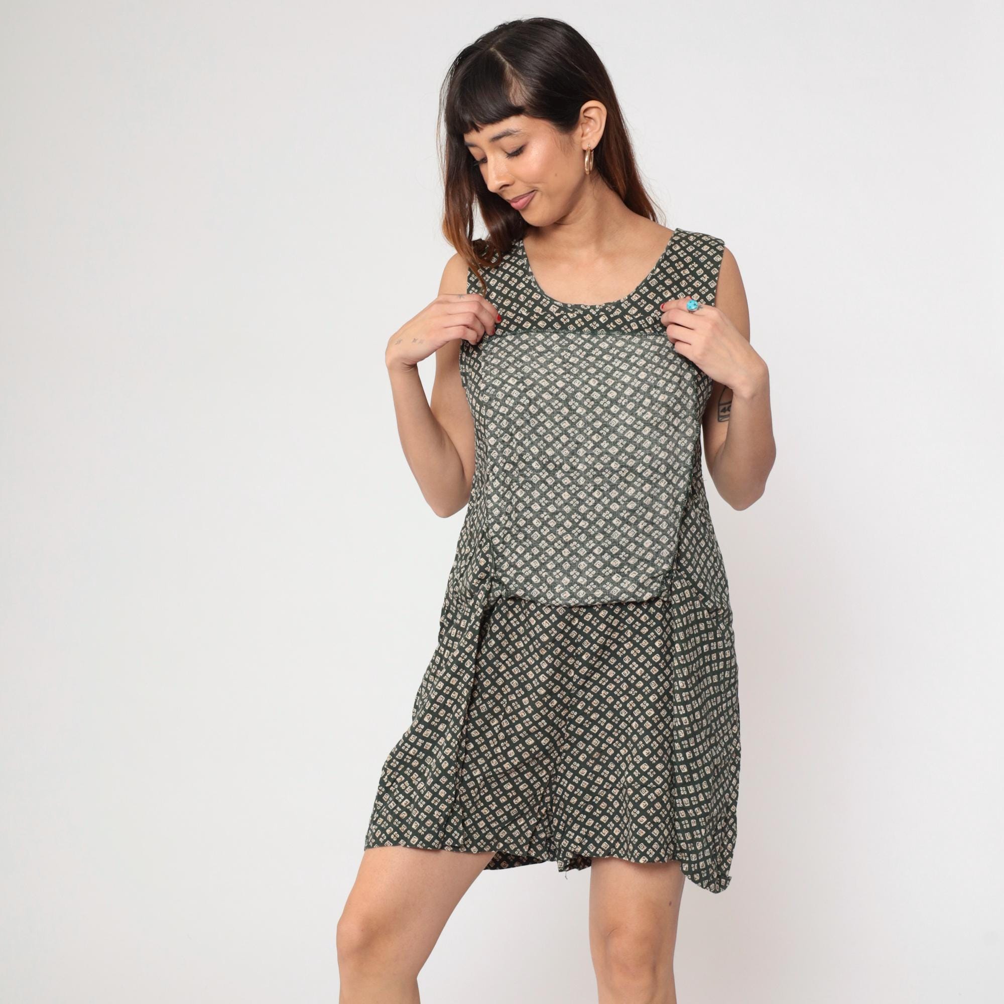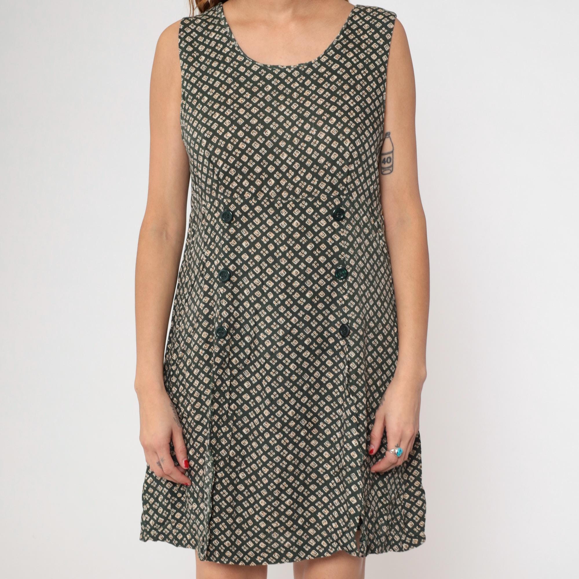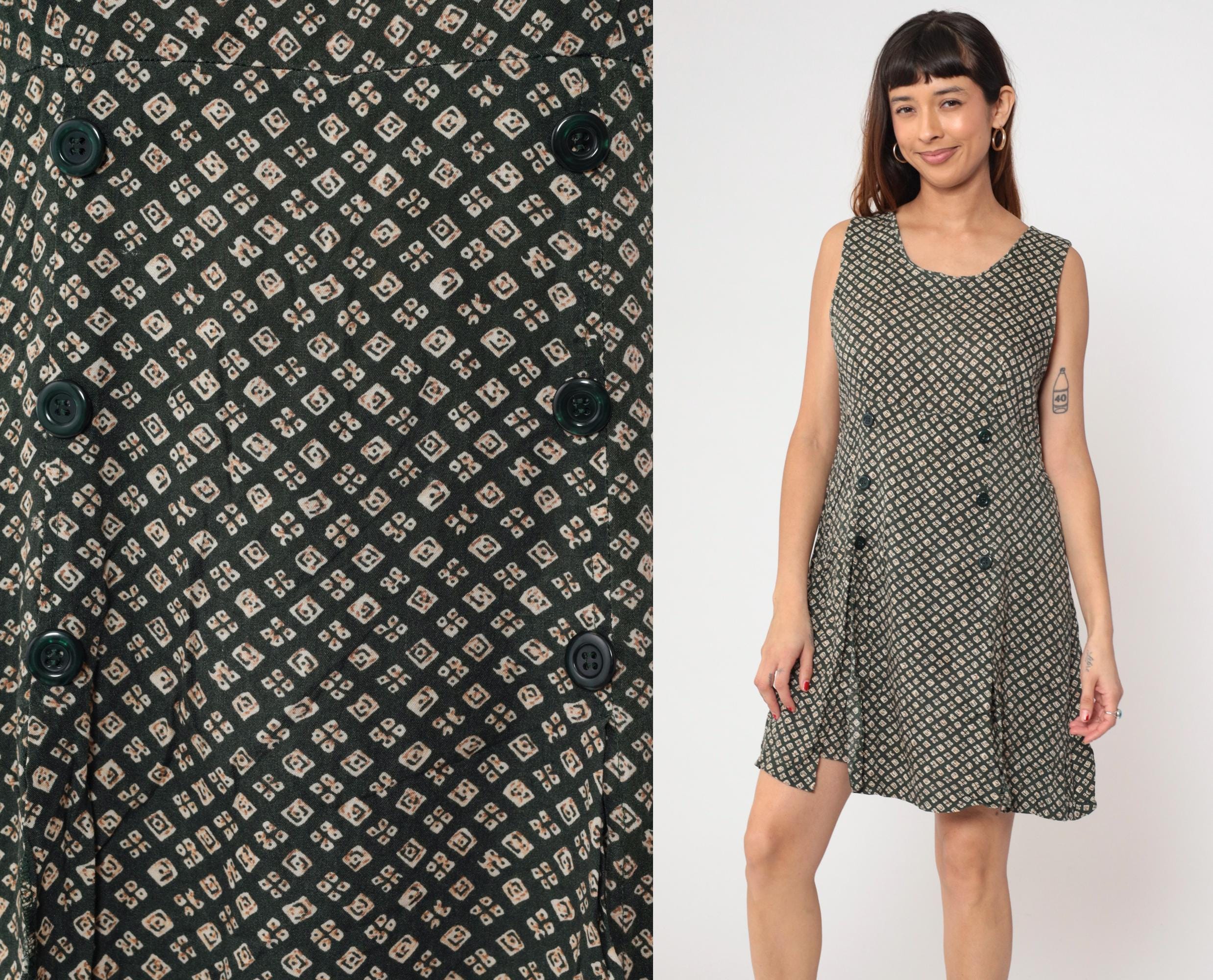 90s geometric mini romper from Liberty. Features a classic scoop neckline, sleeveless design, and decorative button details on the front. This A-line romper has a flared silhouette with front pleats for movement. Made from rayon with a forest green background and cream geometric print.