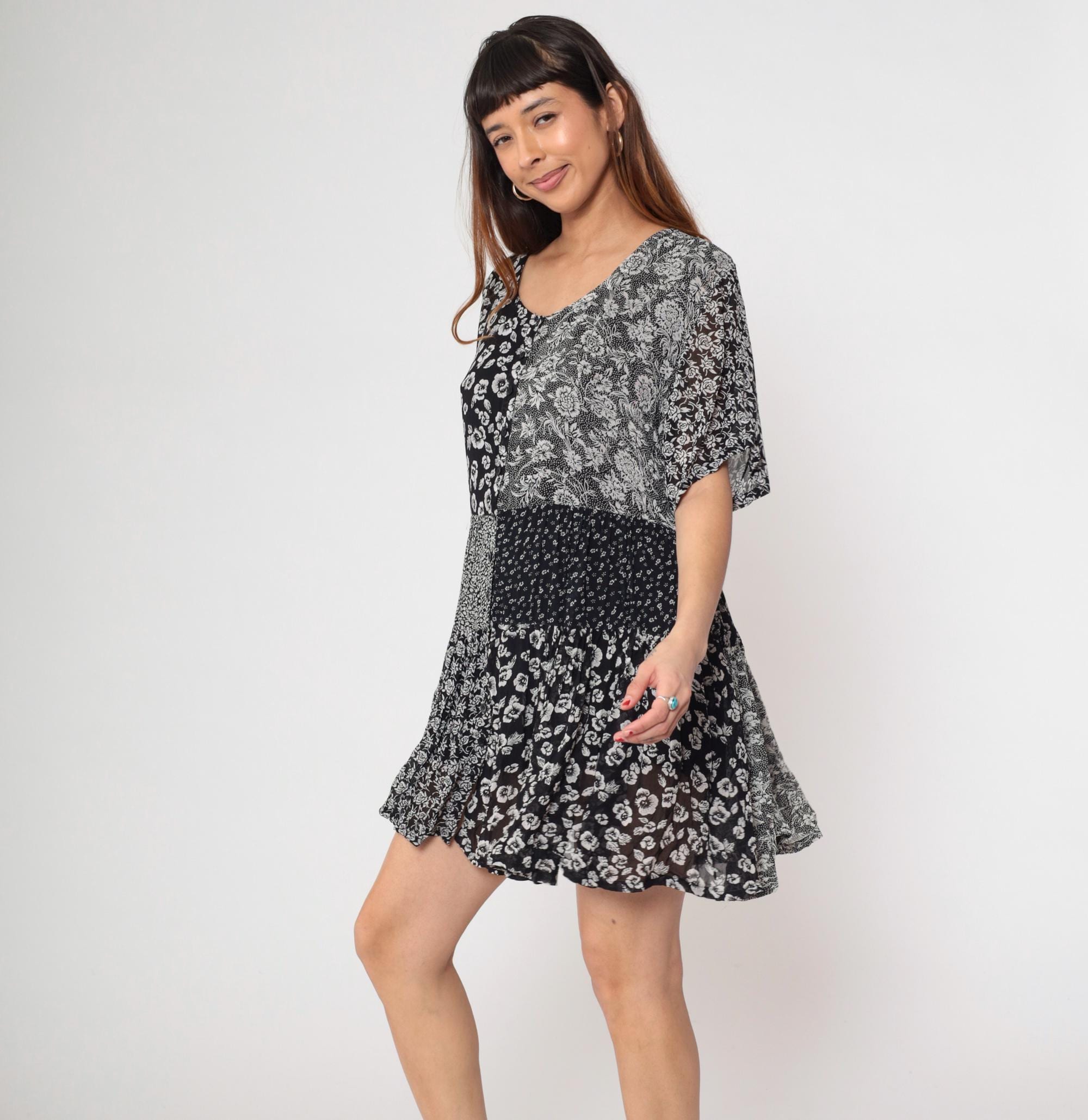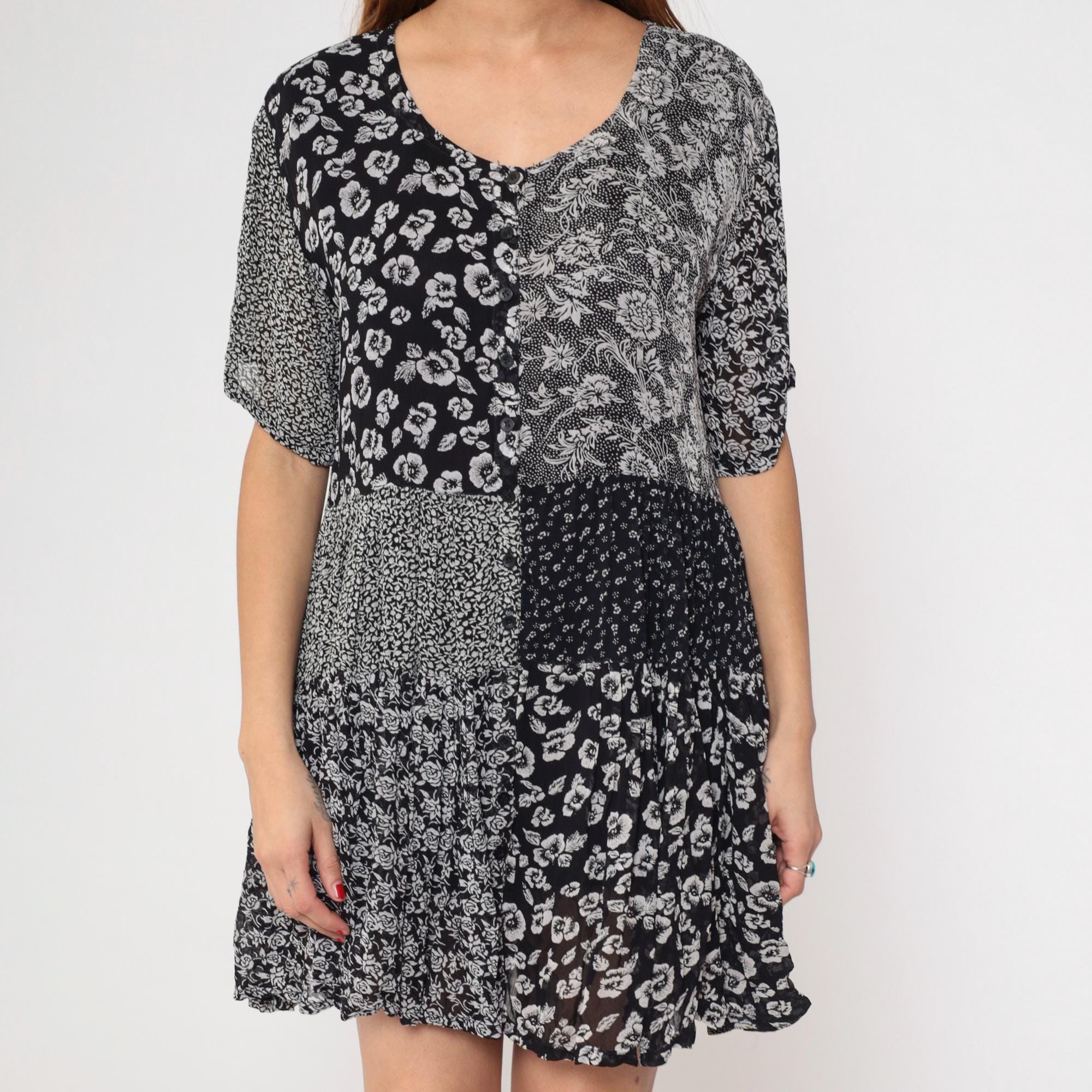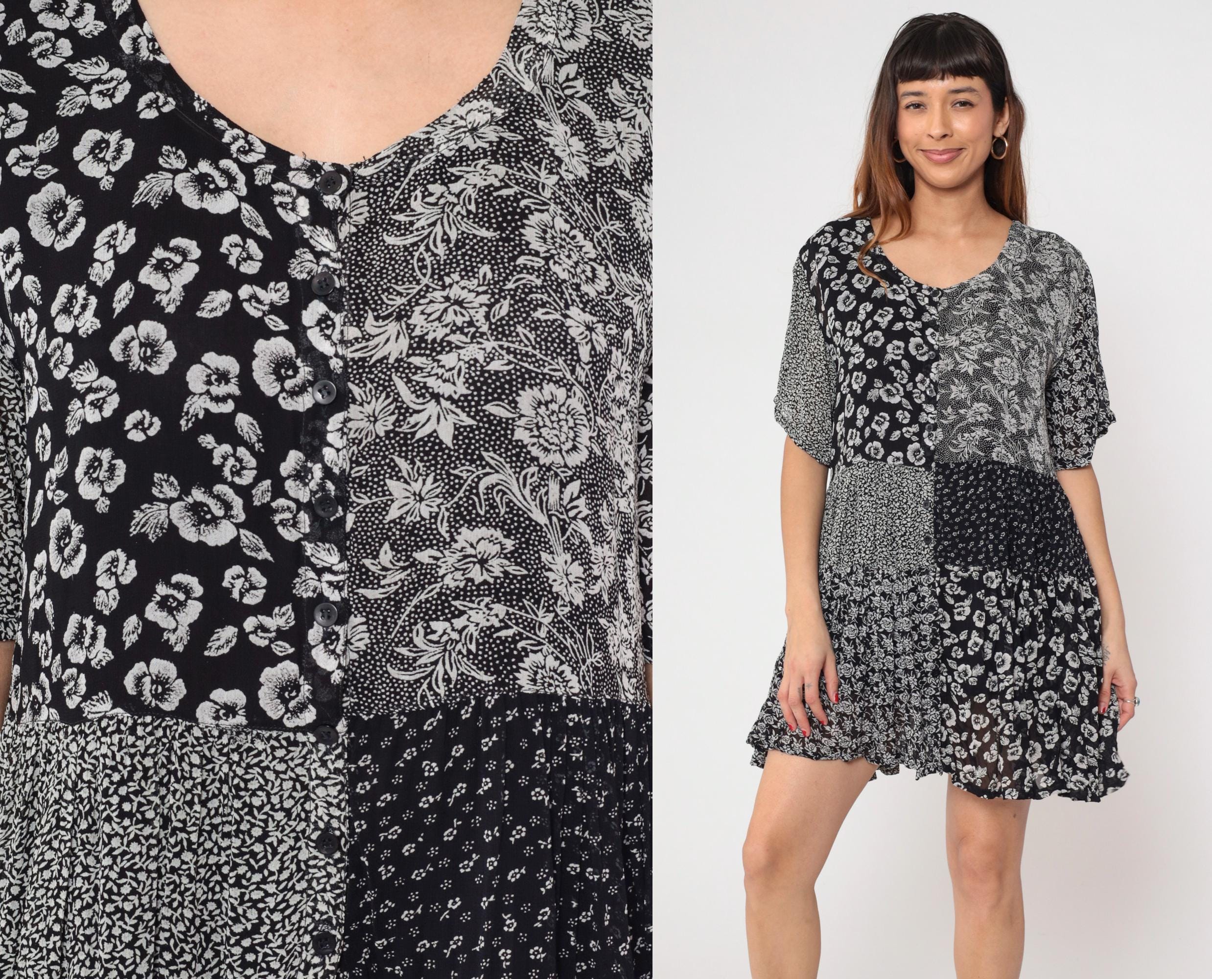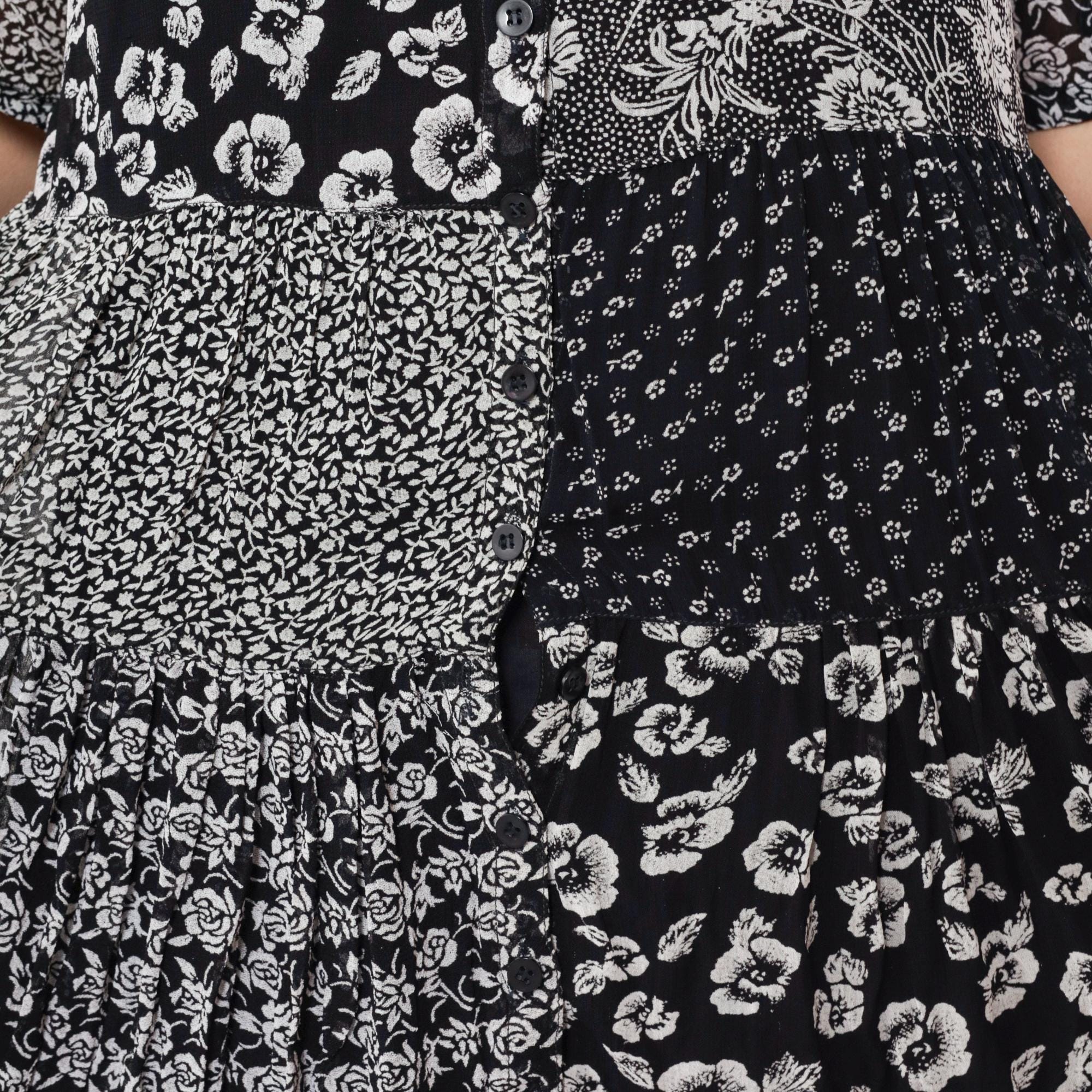 90s patchwork mini dress featuring multiple mixed floral prints in black and white. This distinctive design includes four different floral patterns arranged in a patchwork layout. Features include a flattering V-neckline, short sleeves, button-front closure, and a tiered skirt with slight flare.