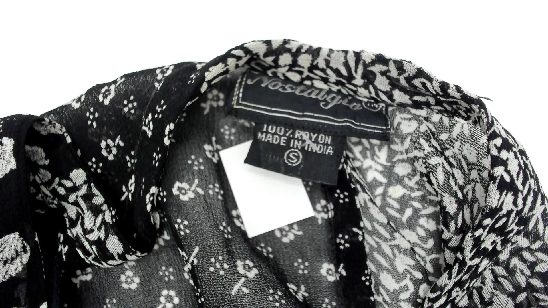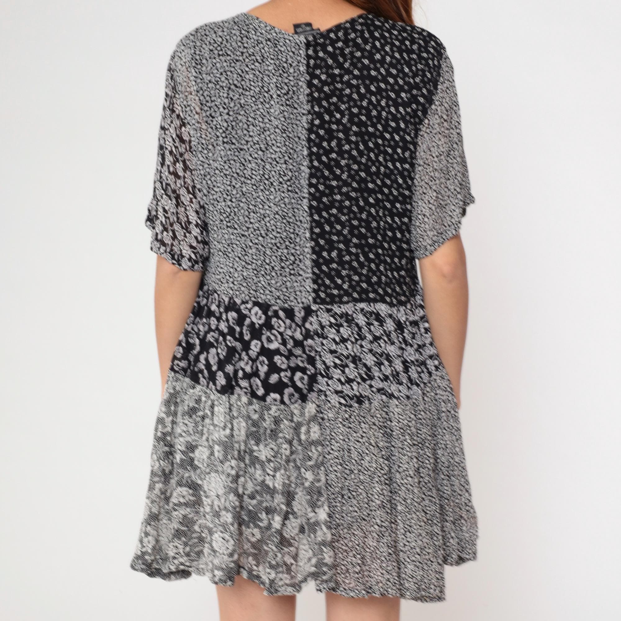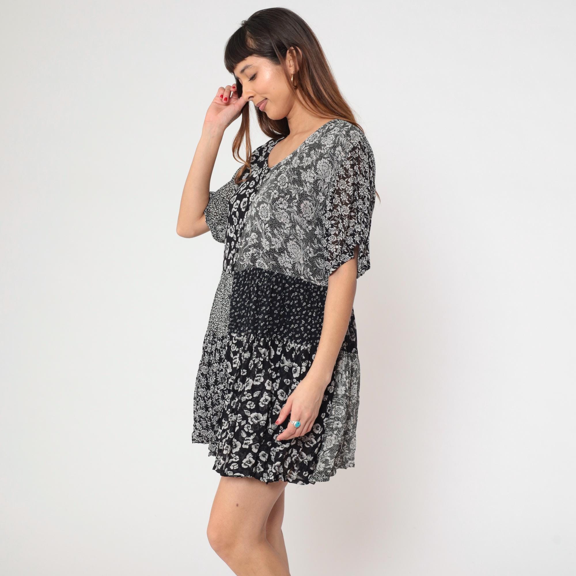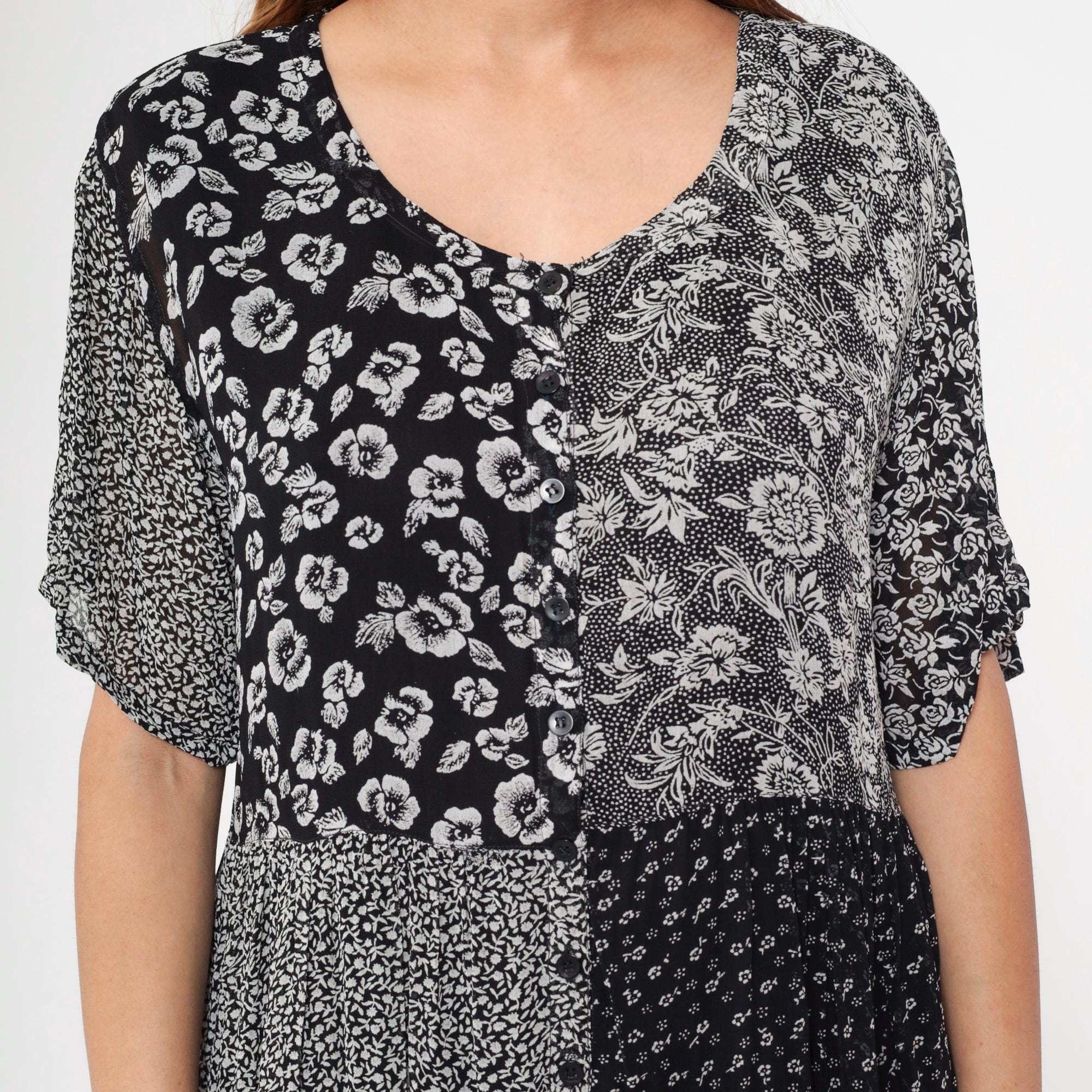 90s patchwork mini dress featuring multiple mixed floral prints in black and white. This distinctive design includes four different floral patterns arranged in a patchwork layout. Features include a flattering V-neckline, short sleeves, button-front closure, and a tiered skirt with slight flare.
