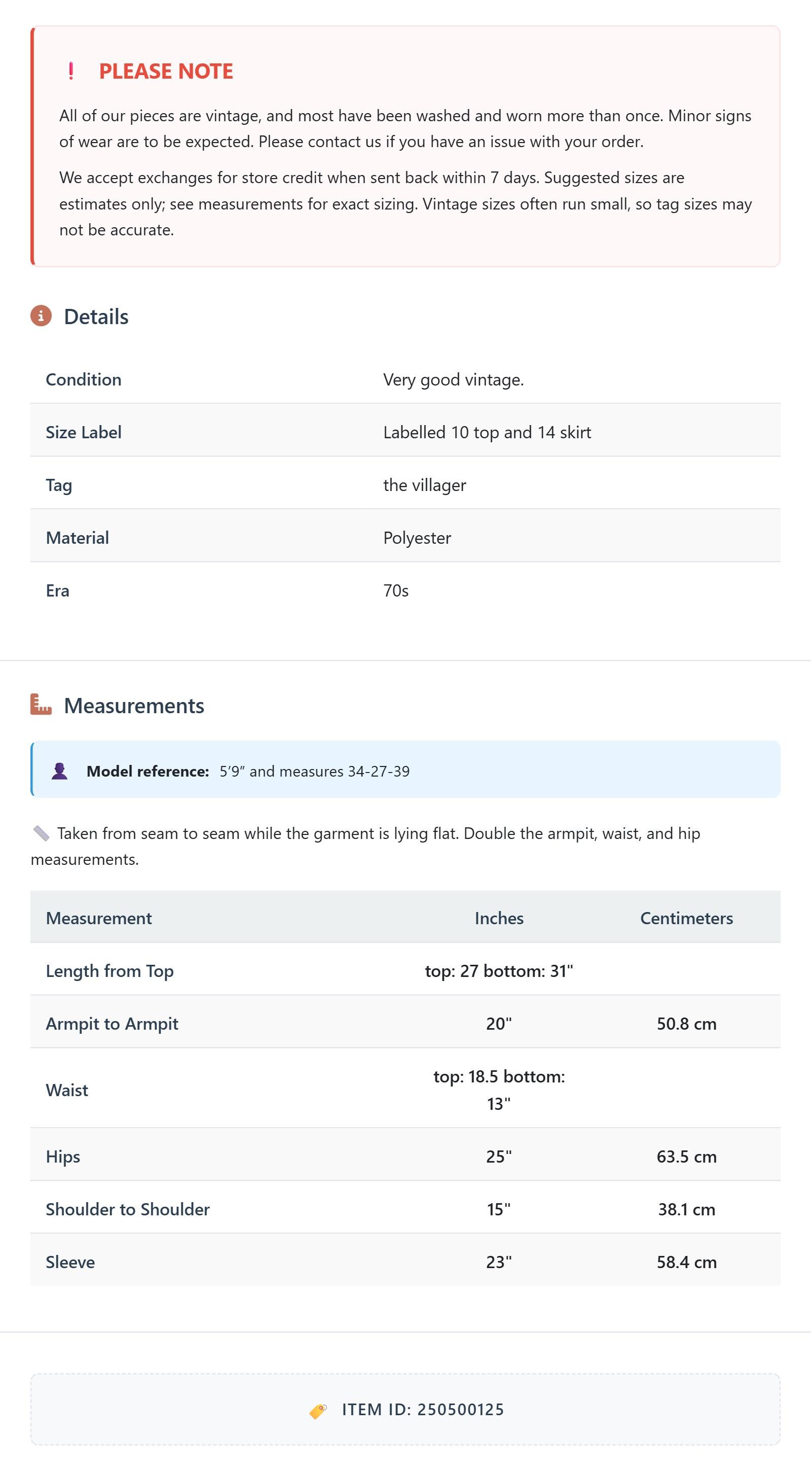 All of our pieces are vintage, and most have been washed and worn more than once. Minor signs of wear are to be expected. Please contact us if you have an issue with your order. We accept exchanges for store credit when sent back within 7 days.