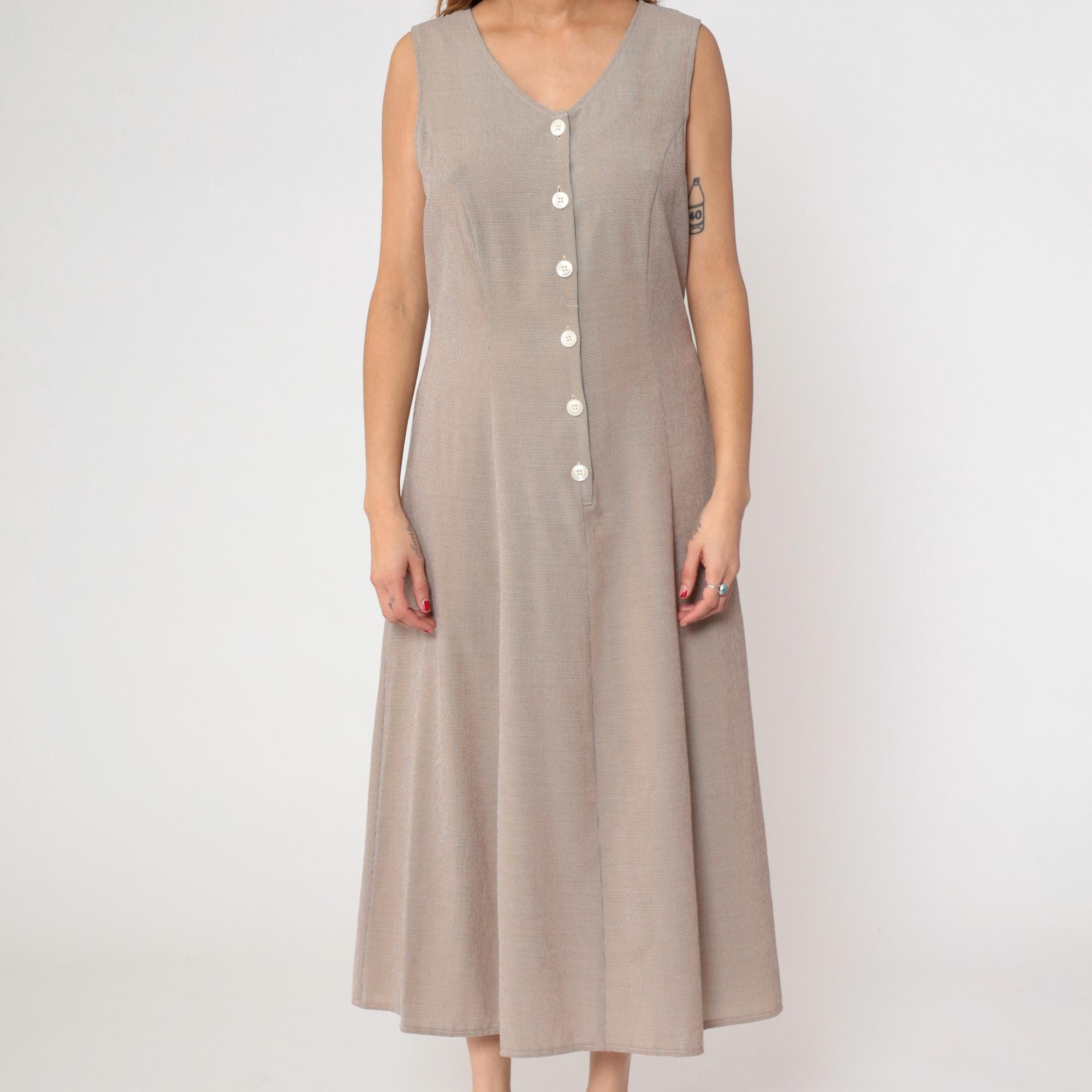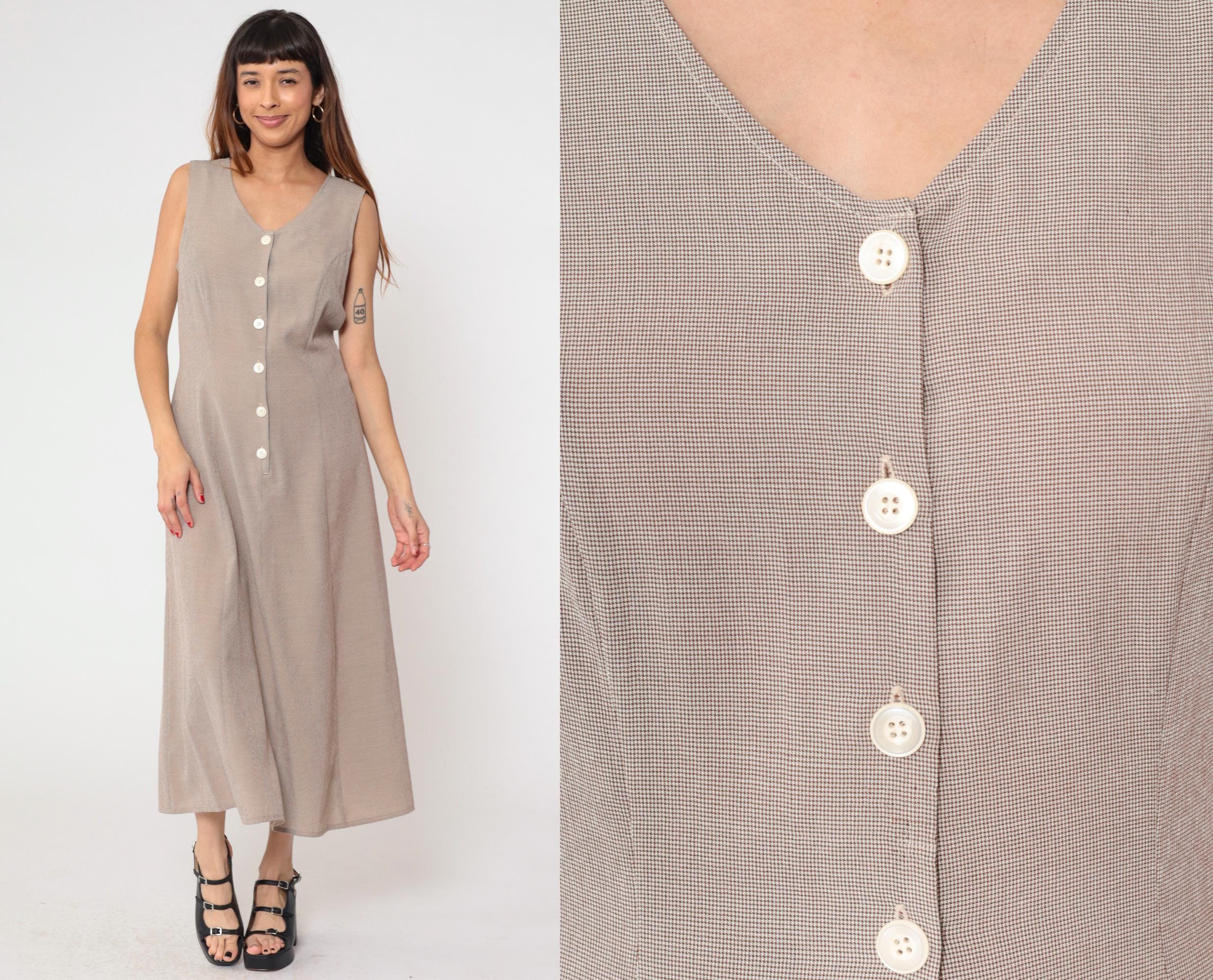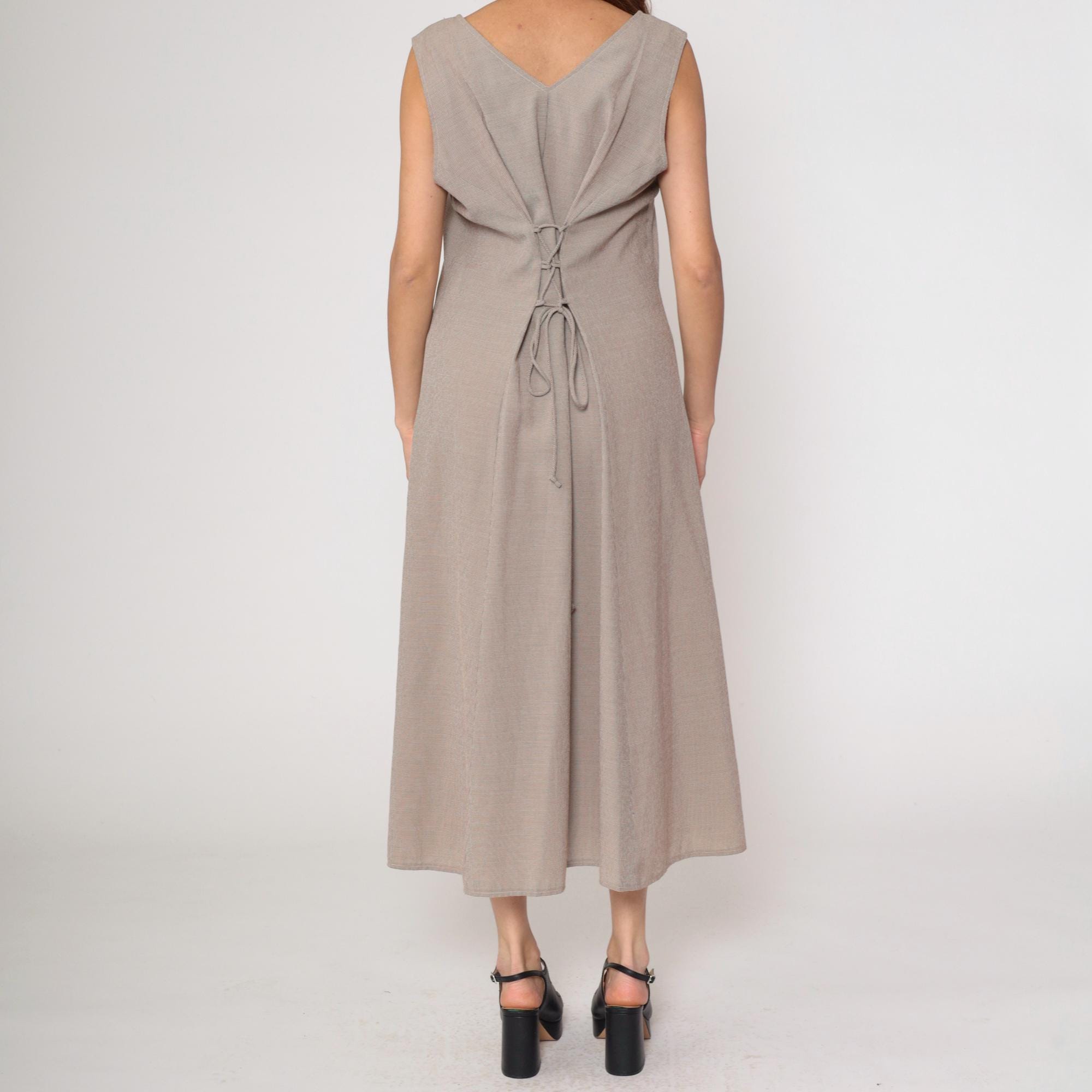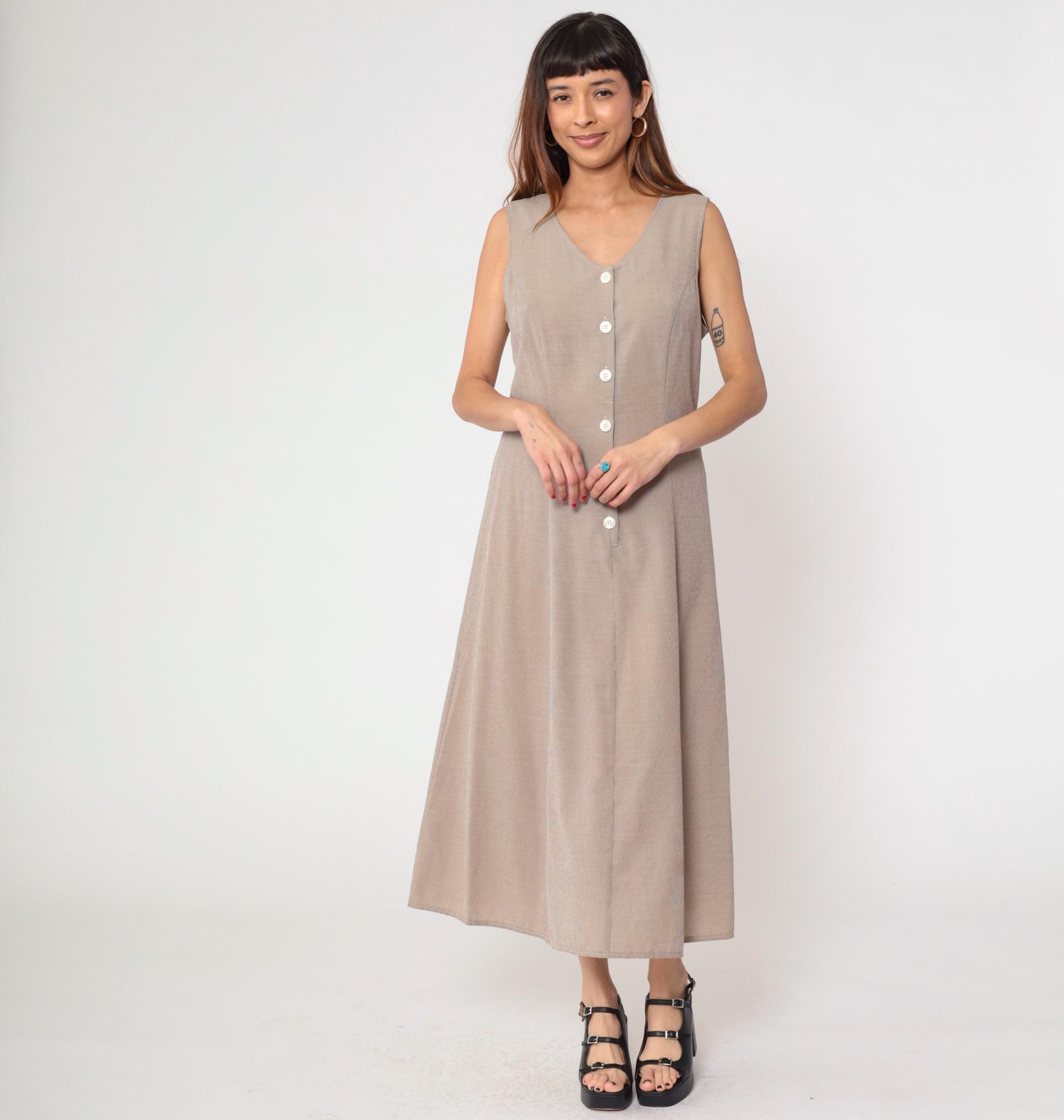 990s taupe maxi dress by Kathie Lee. Features a micro check textured fabric, button front closure, V-neckline, and sleeveless design. The back has an adjustable lace-up detail for a custom fit.