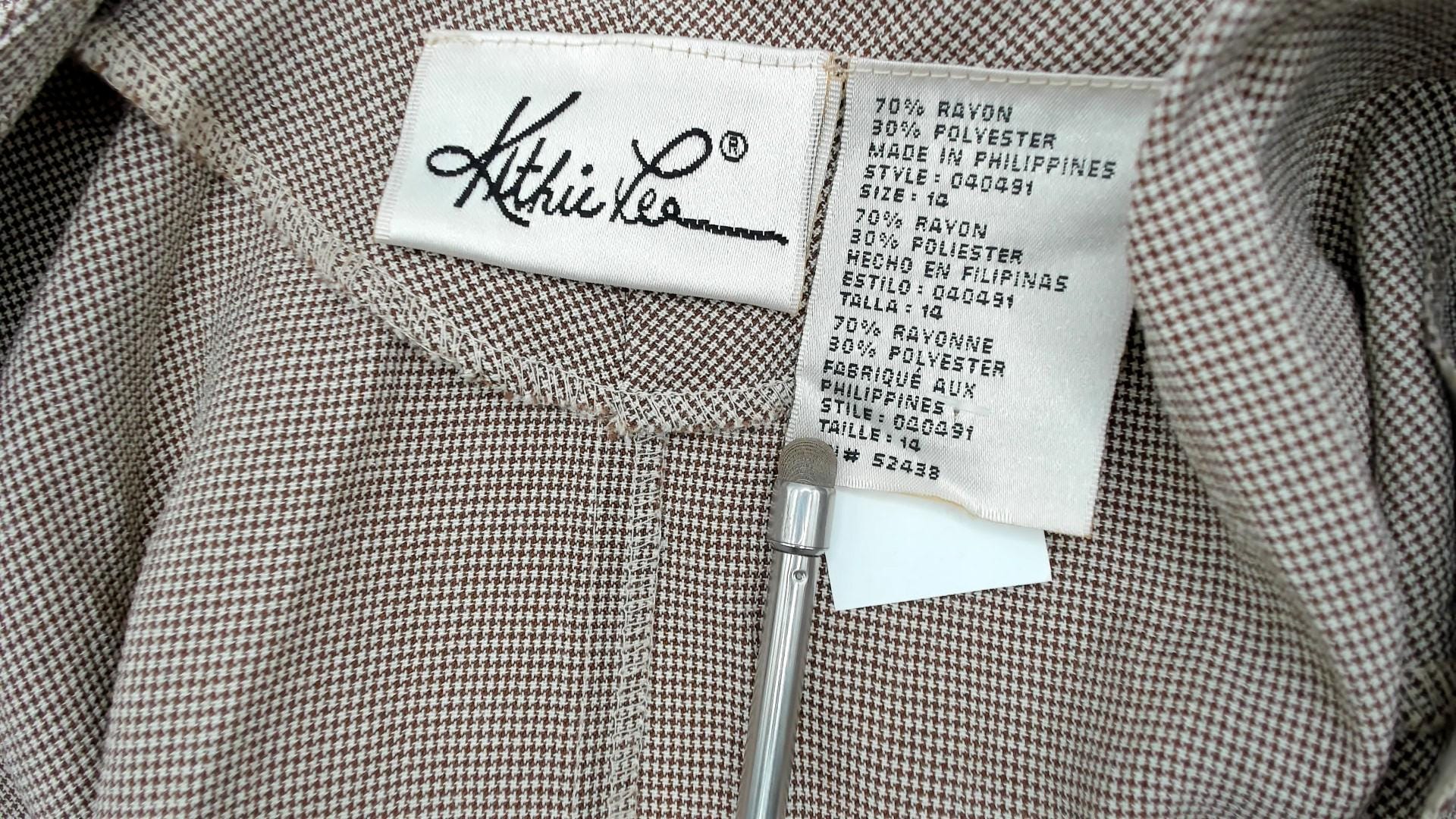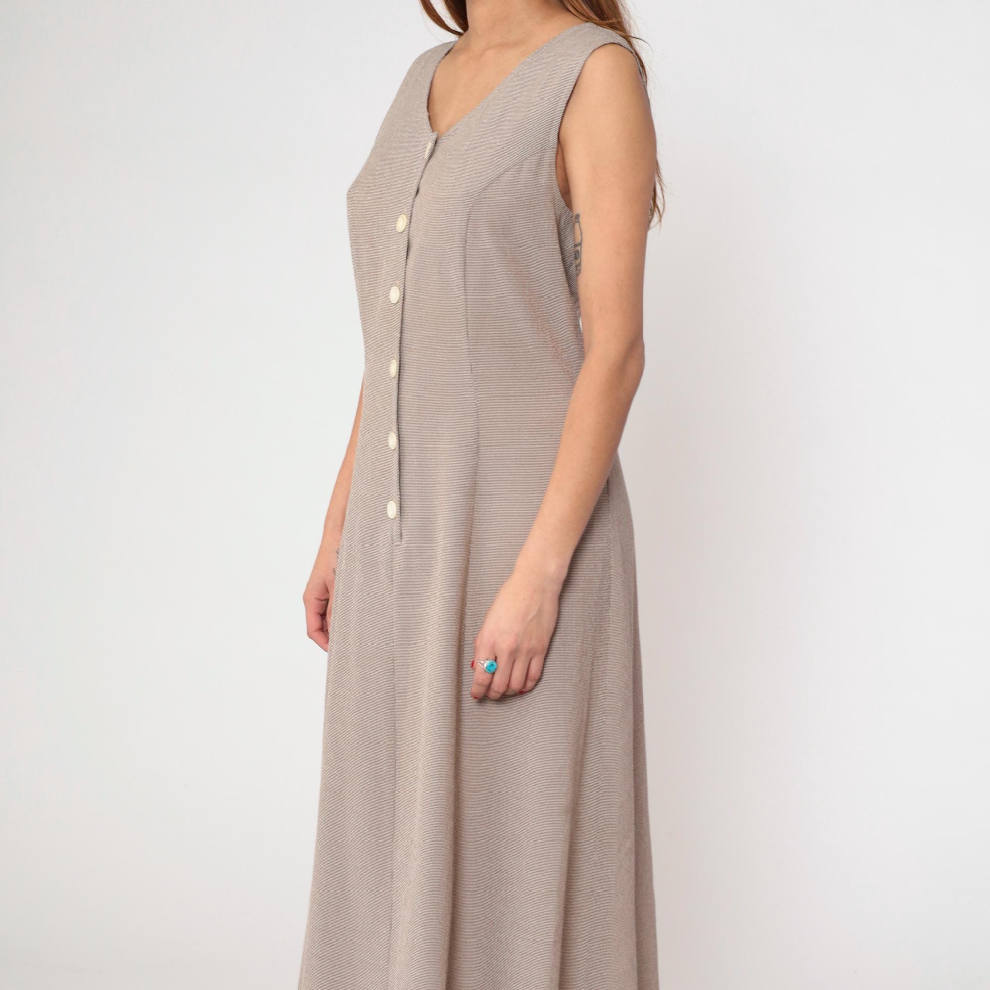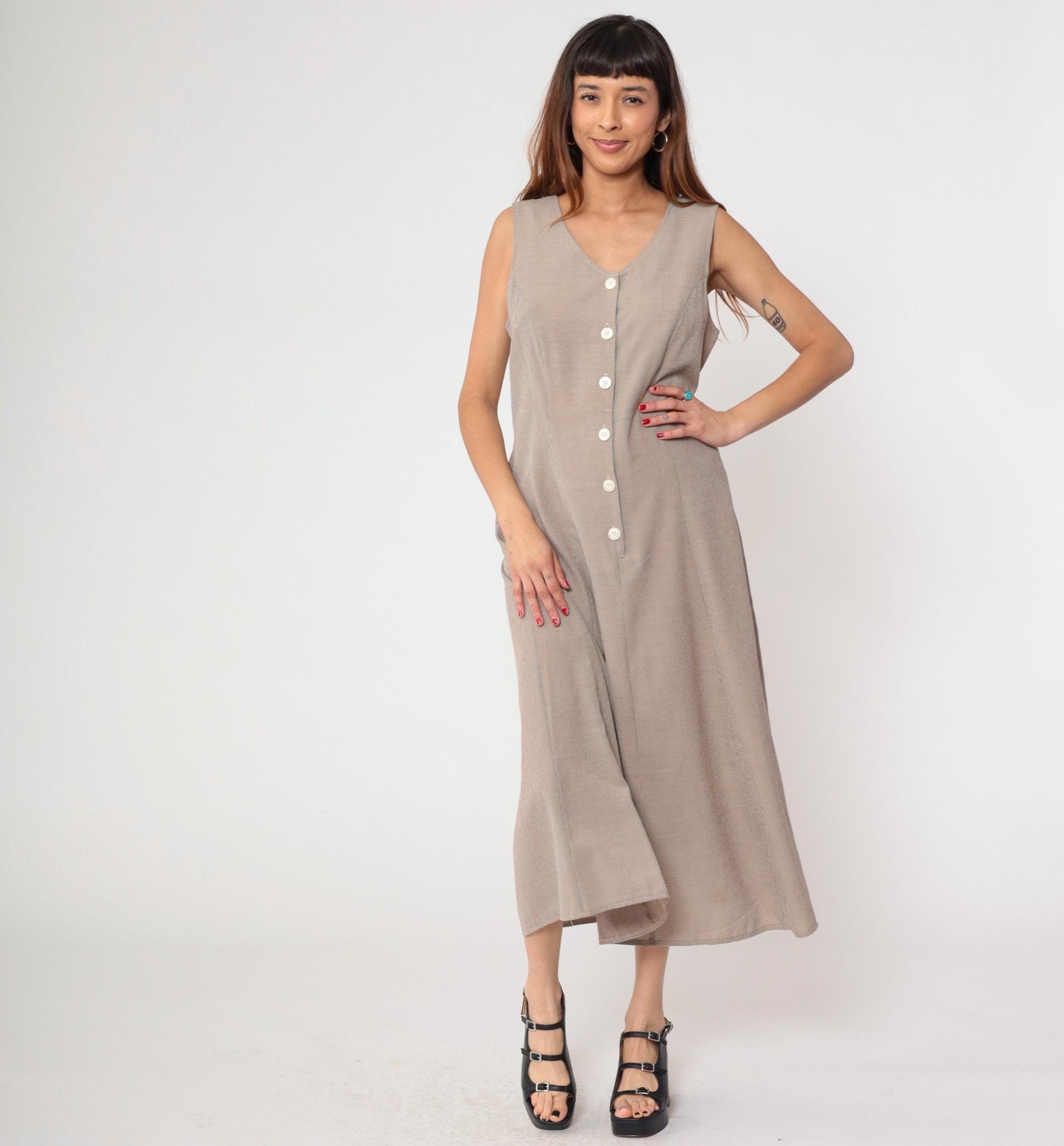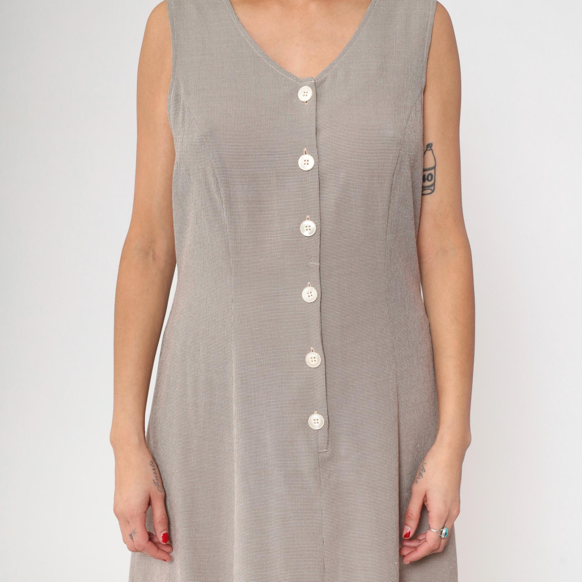 990s taupe maxi dress by Kathie Lee. Features a micro check textured fabric, button front closure, V-neckline, and sleeveless design. The back has an adjustable lace-up detail for a custom fit.
