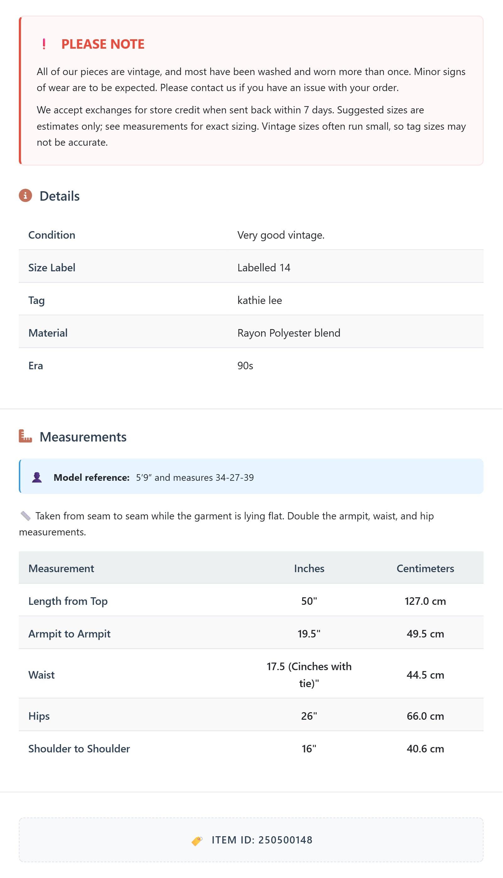 All of our pieces are vintage, and most have been washed and worn more than once. Minor signs of wear are to be expected. Please contact us if you have an issue with your order. We accept exchanges for store credit when sent back within 7 days.