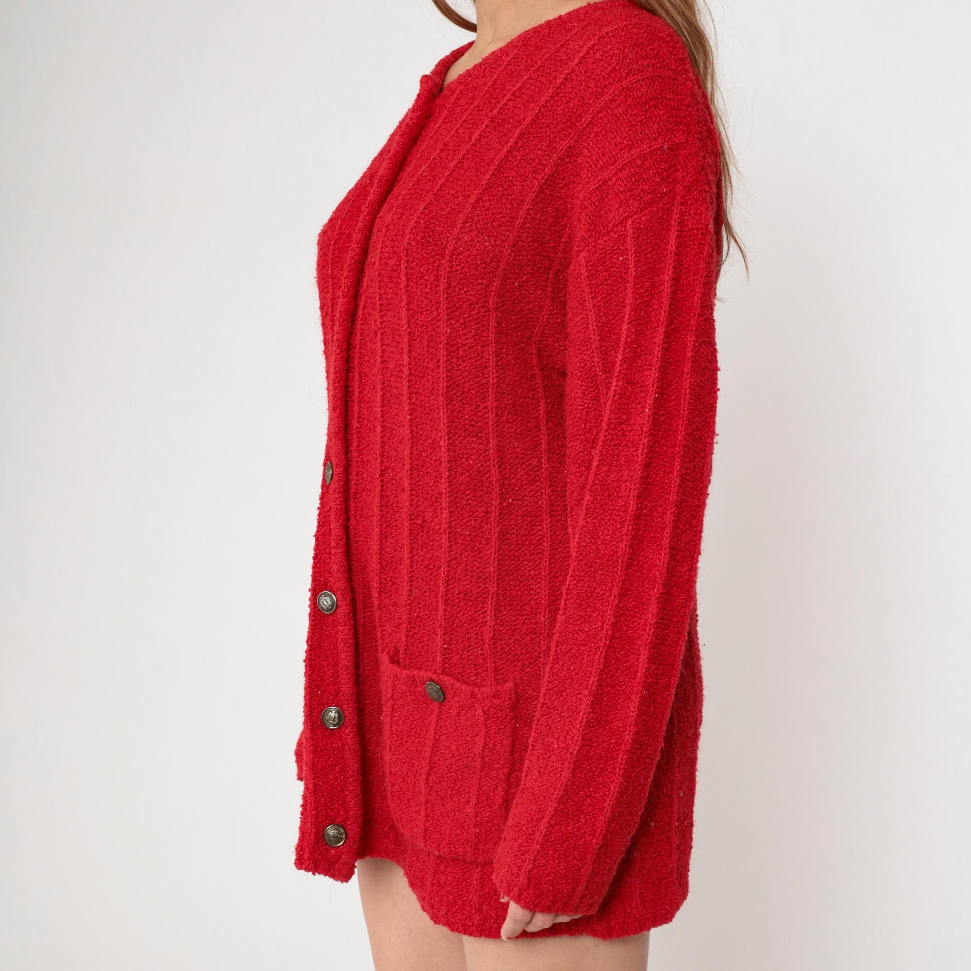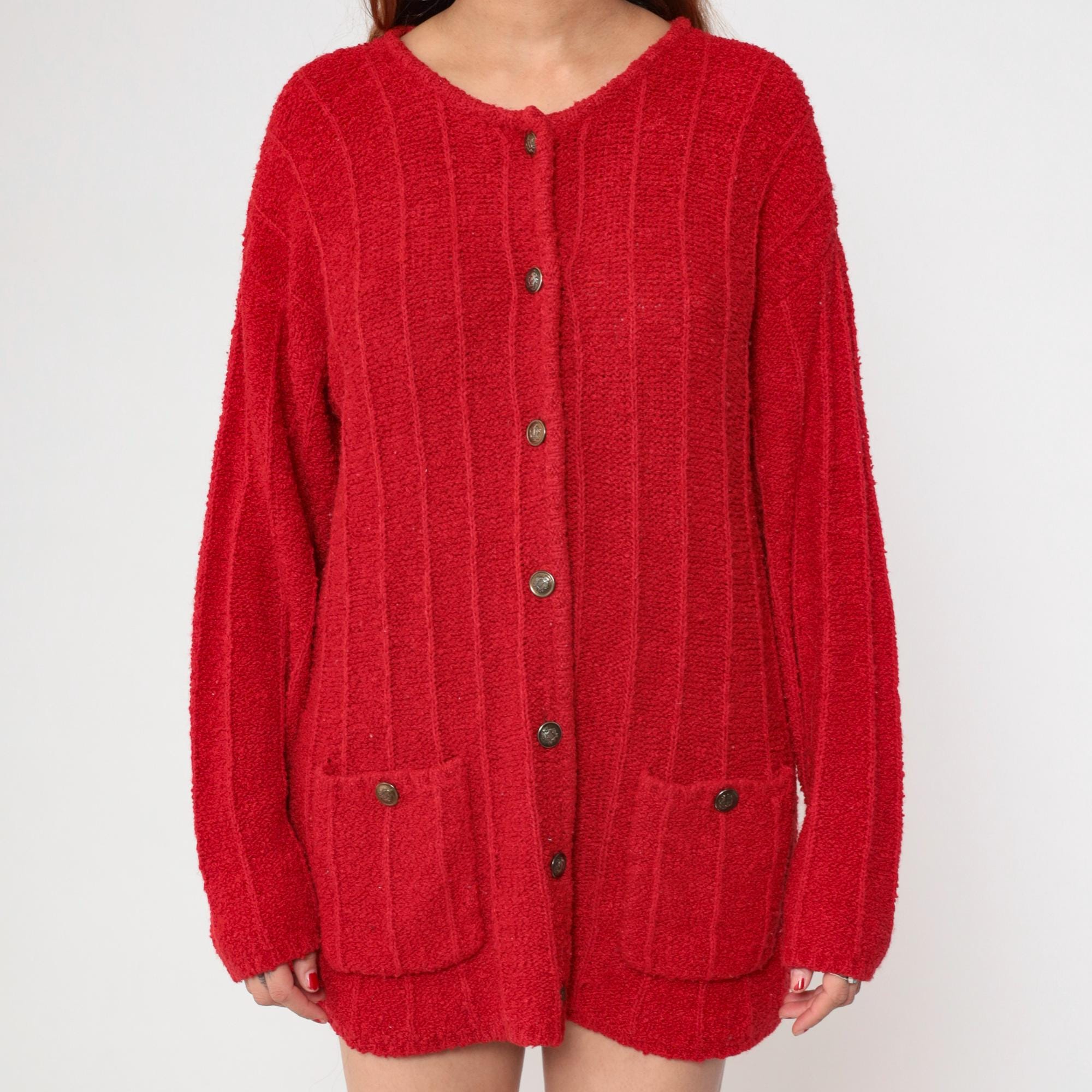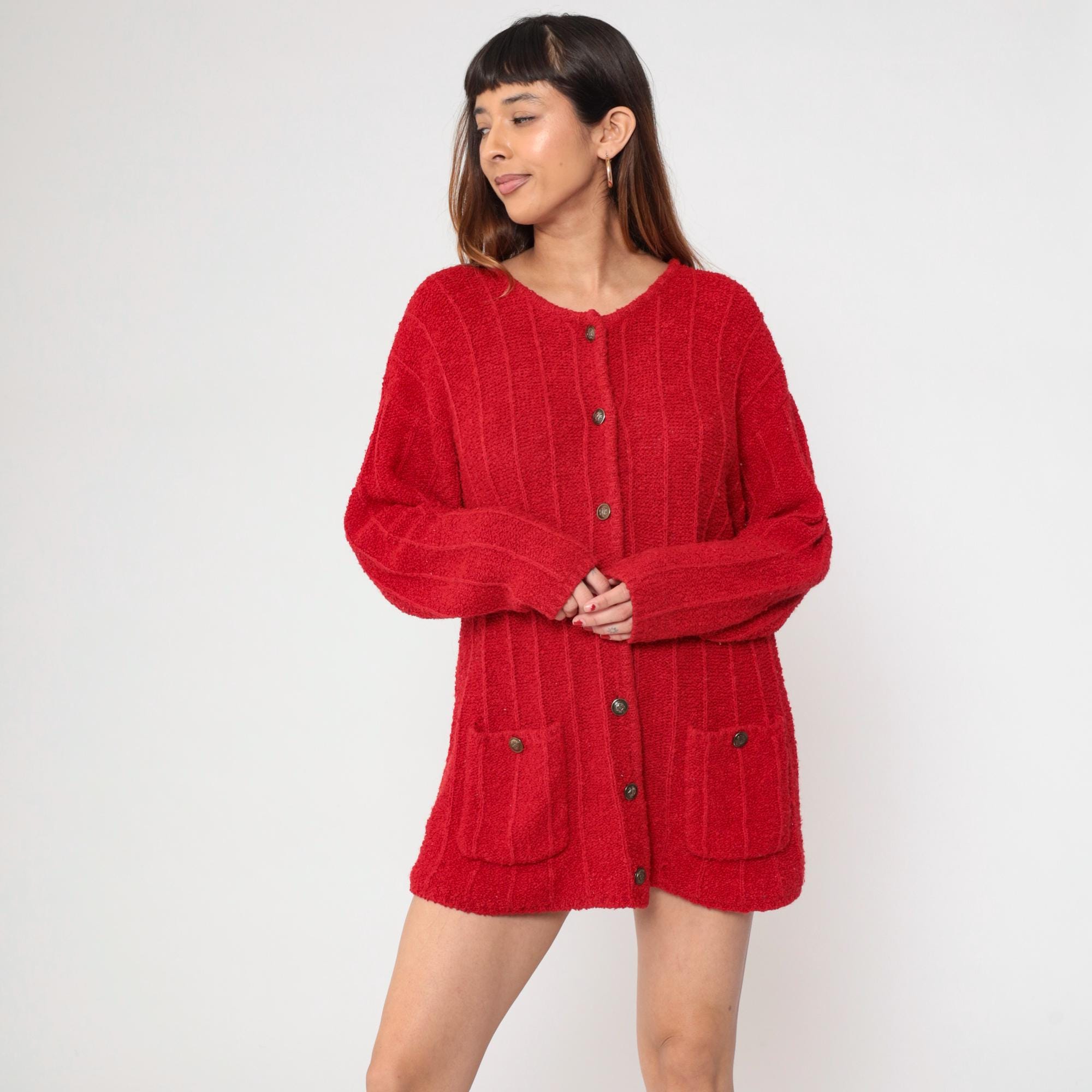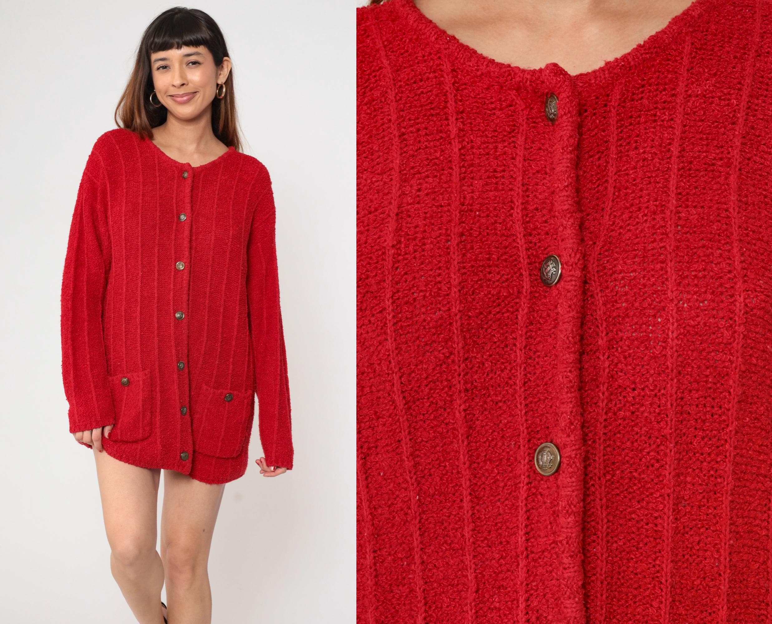 1980s cherry red cardigan sweater by Fabriano. Features textured chunky knit with vertical ribbing, front button closure with decorative metal buttons, scoop neckline, and two front patch pockets.