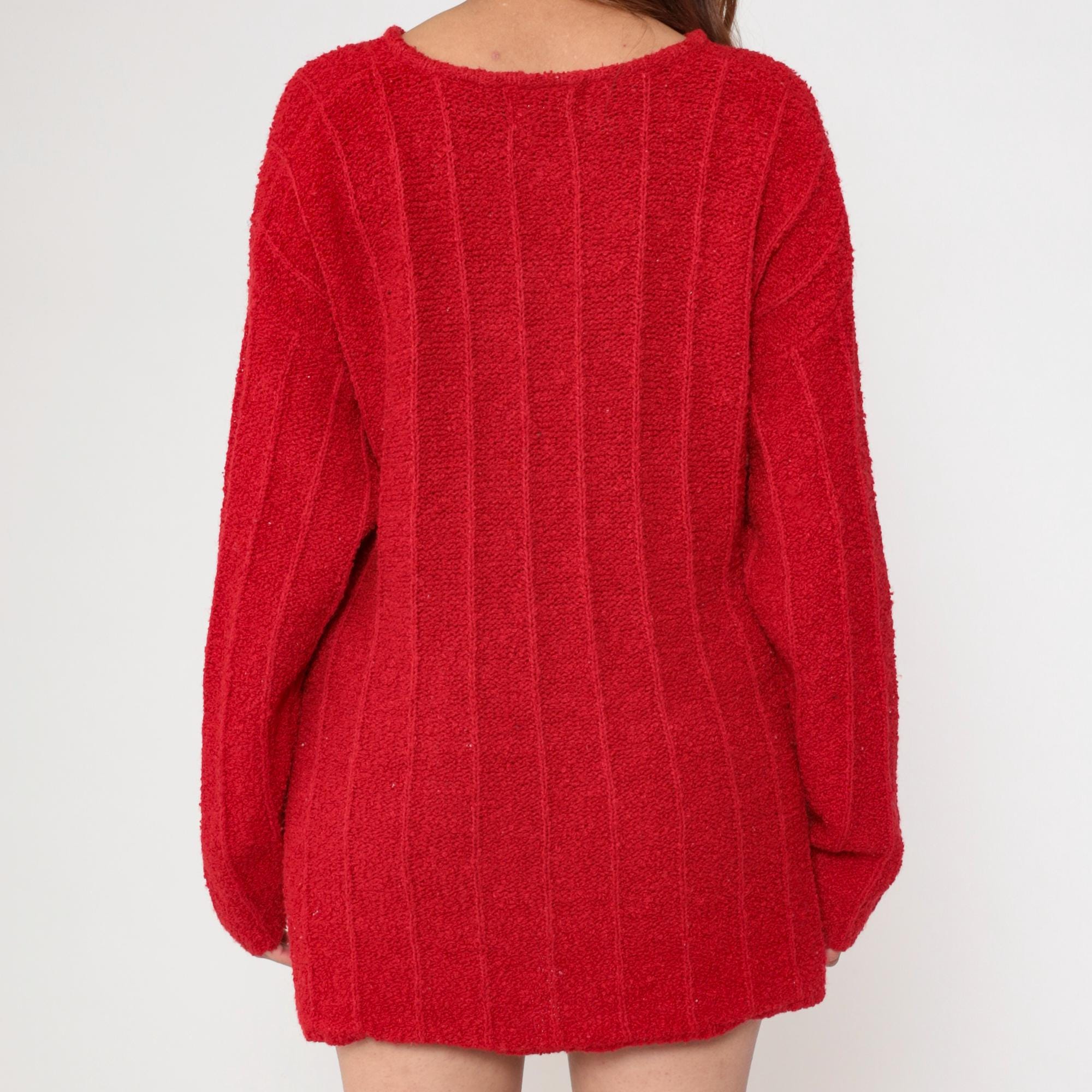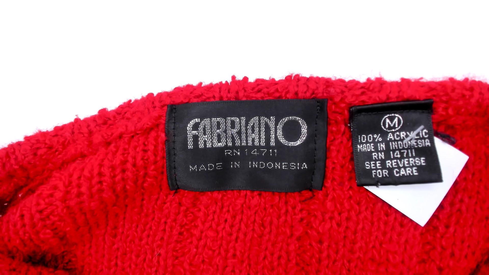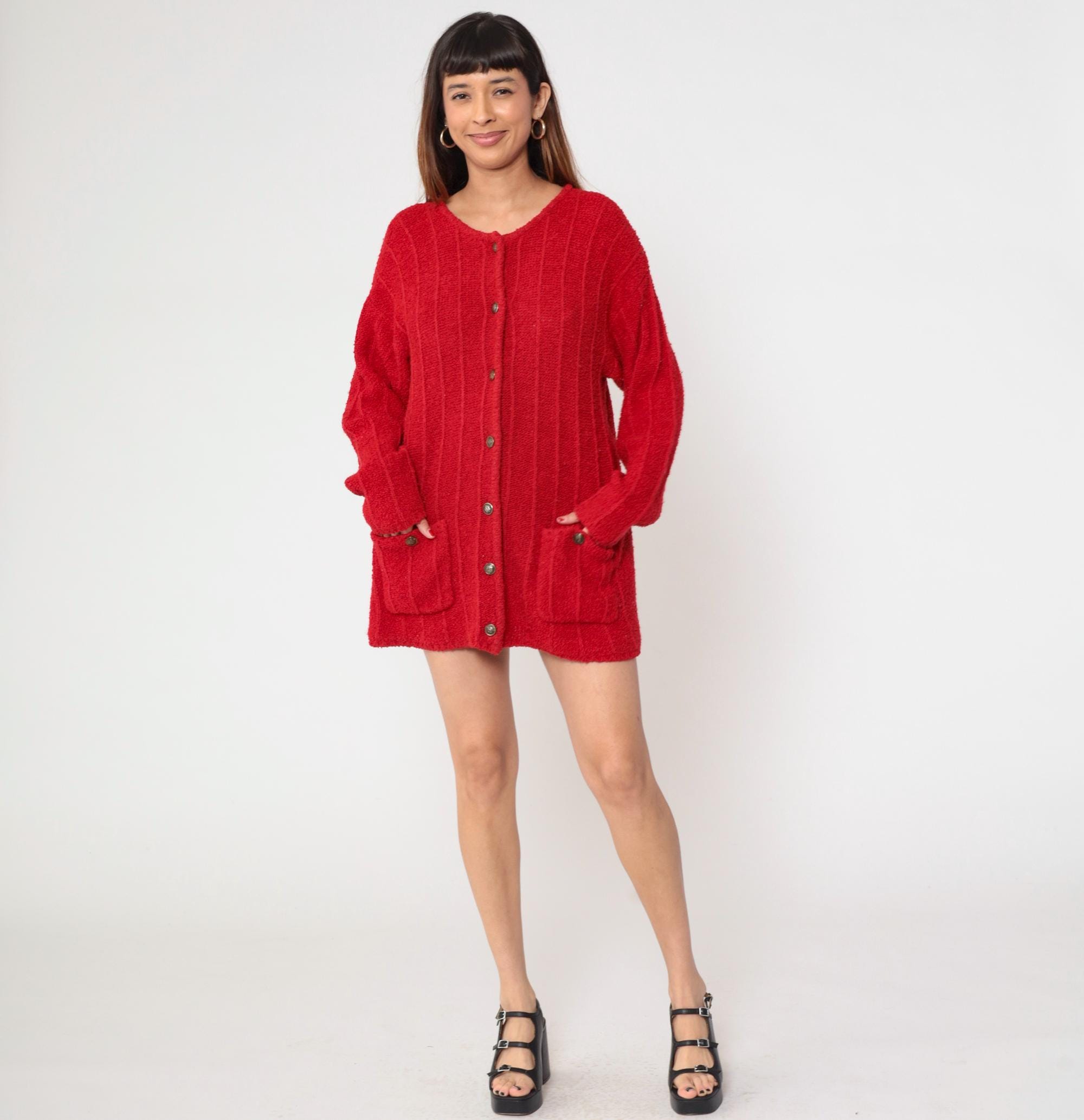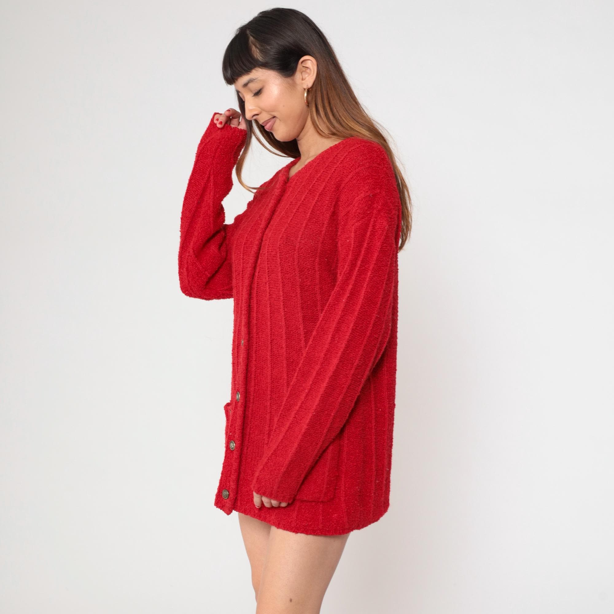 1980s cherry red cardigan sweater by Fabriano. Features textured chunky knit with vertical ribbing, front button closure with decorative metal buttons, scoop neckline, and two front patch pockets.