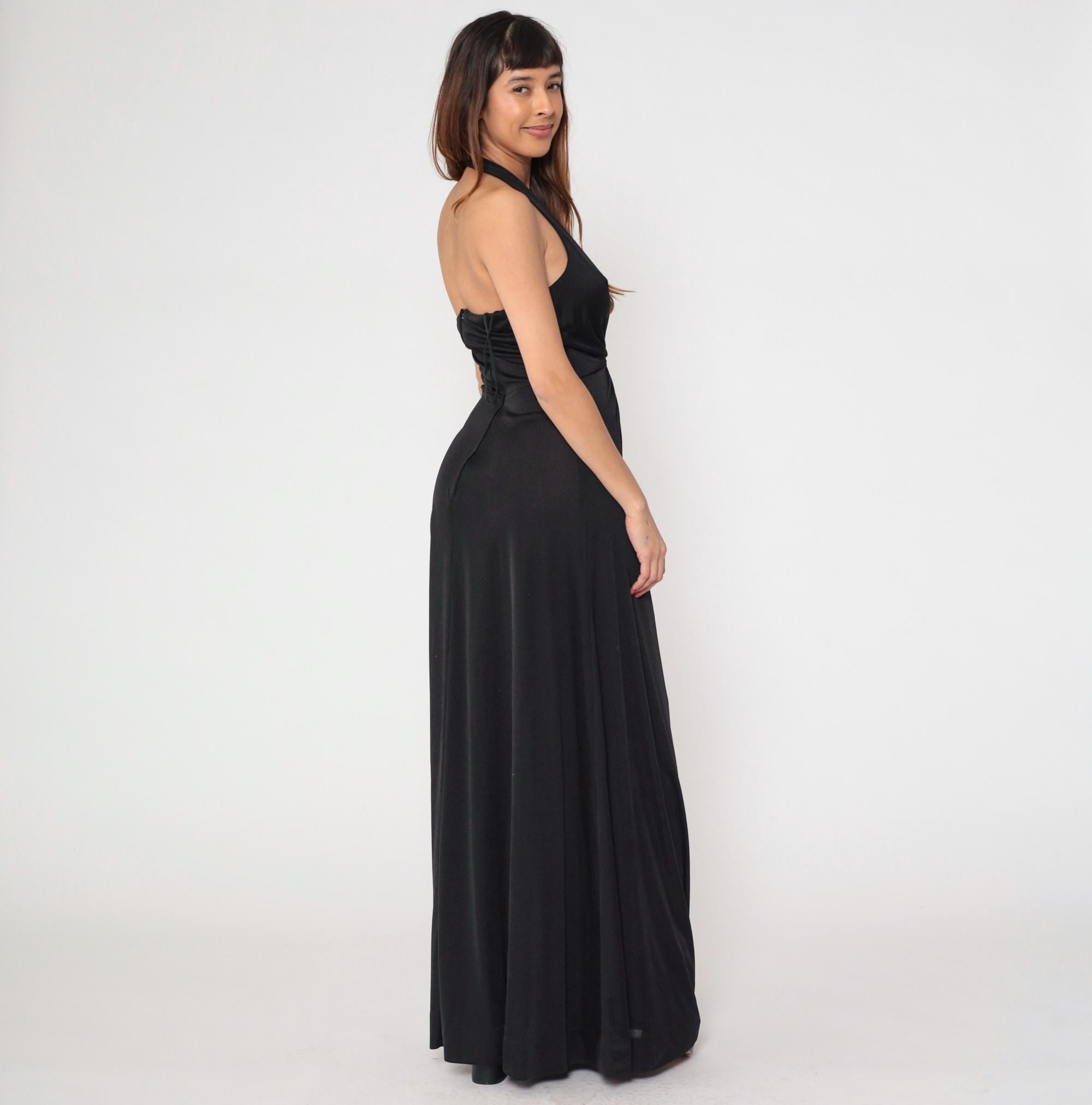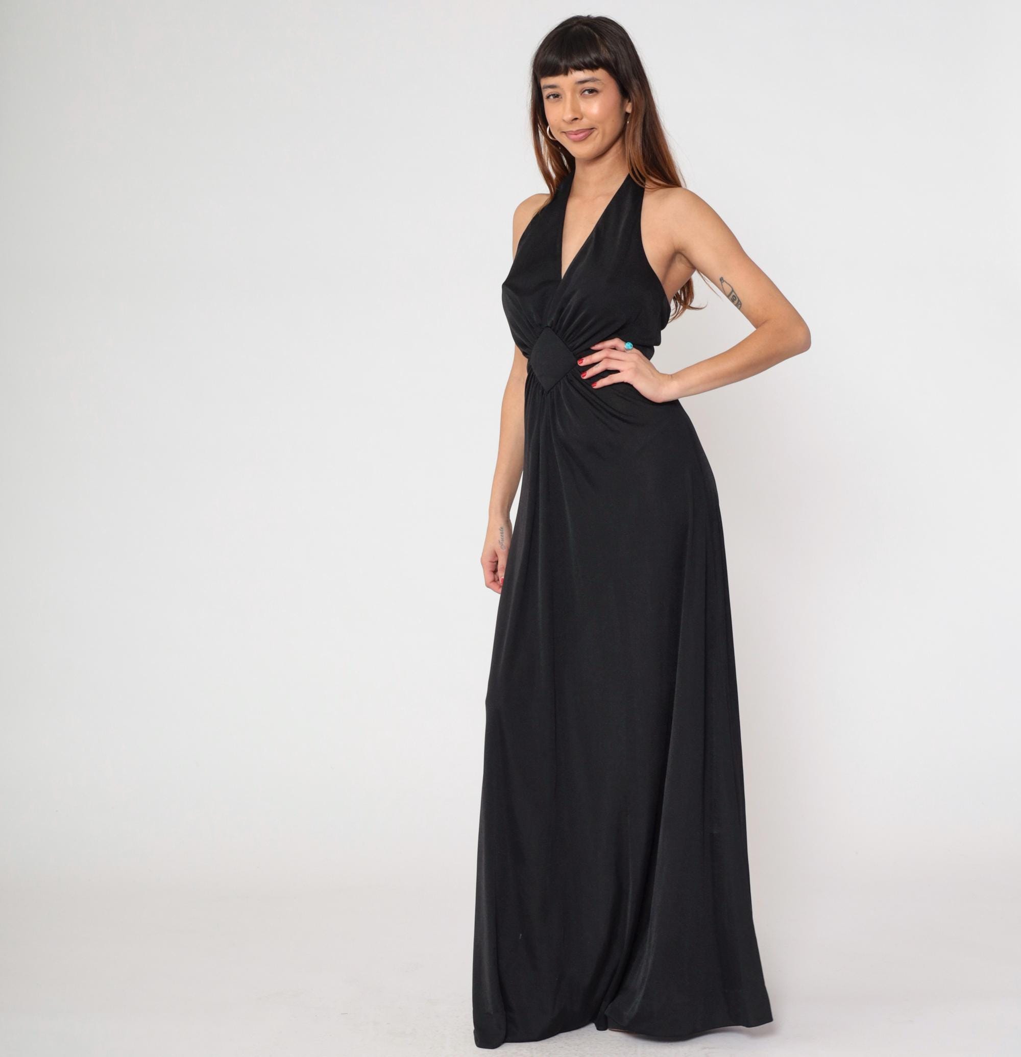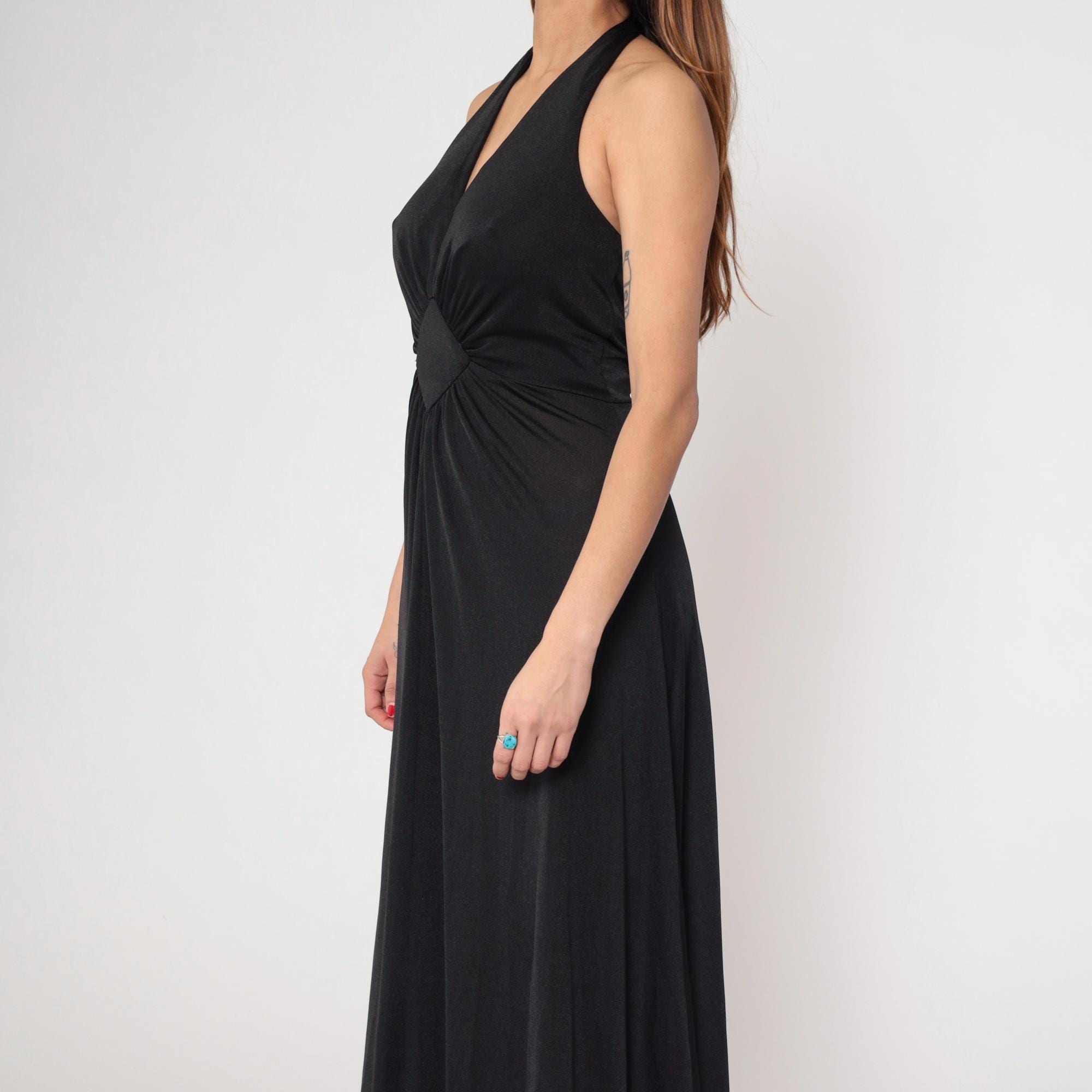 1970s black halter maxi dress with dramatic plunging V-neckline. Features distinctive sunburst gathering at empire waist, creating elegant draping throughout the floor-length skirt.