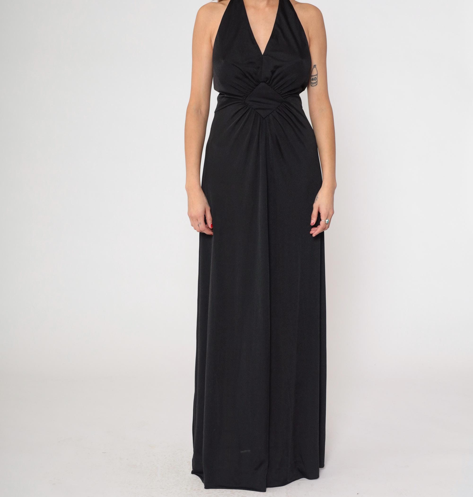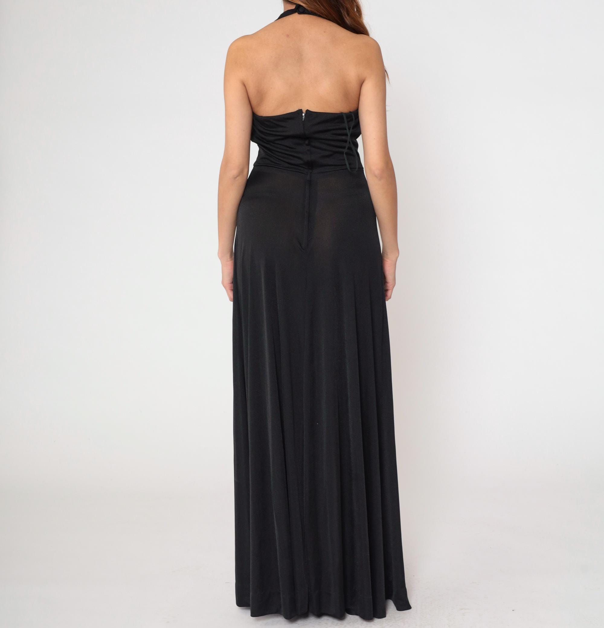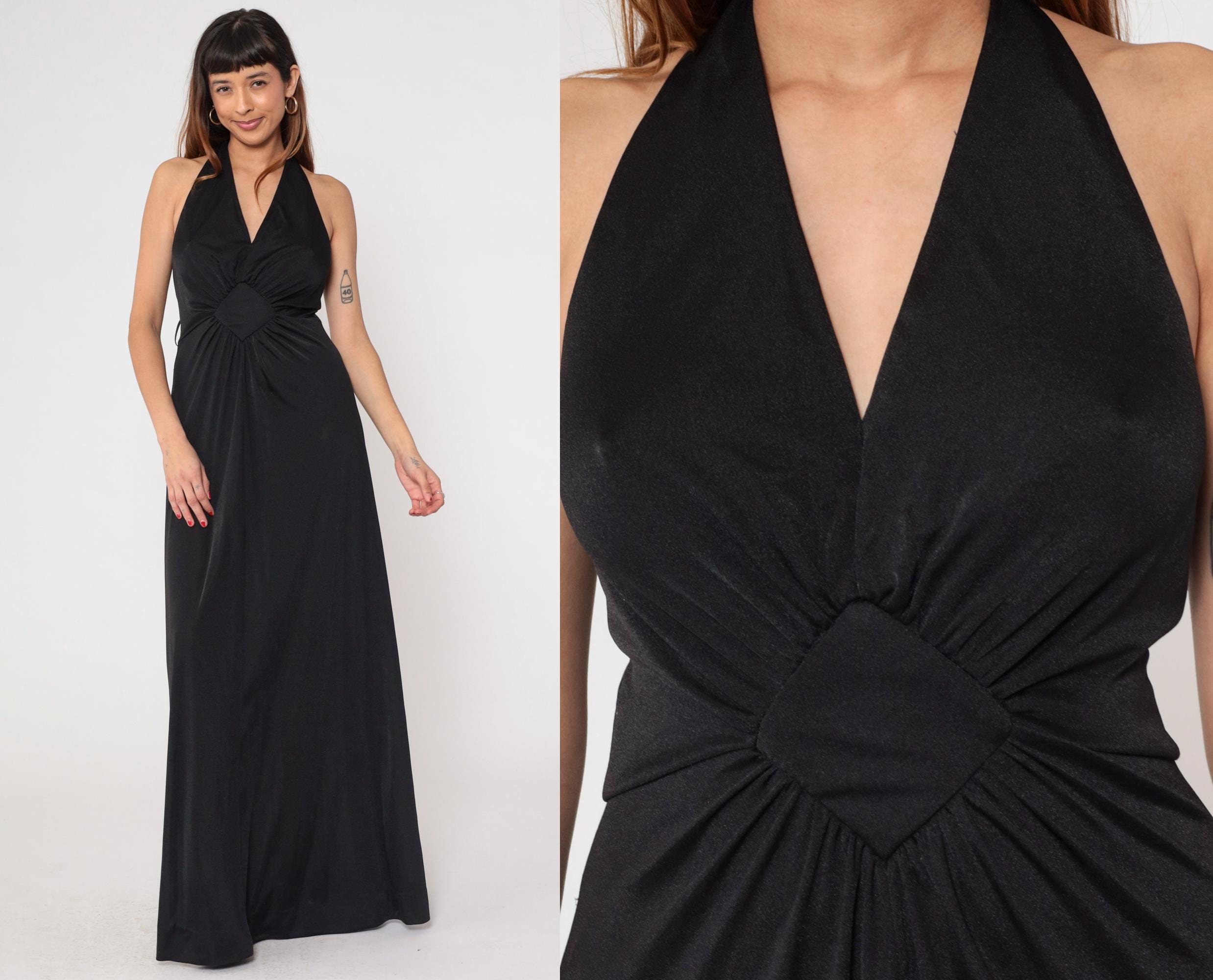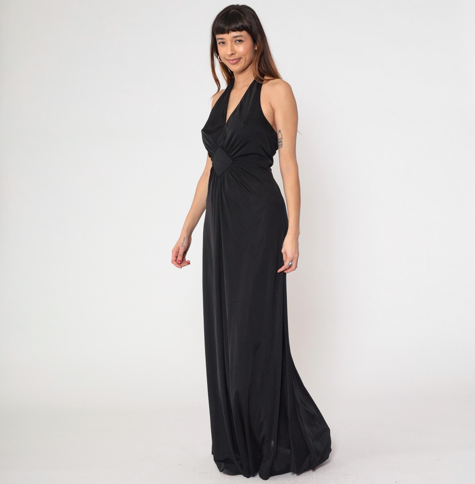 1970s black halter maxi dress with dramatic plunging V-neckline. Features distinctive sunburst gathering at empire waist, creating elegant draping throughout the floor-length skirt.