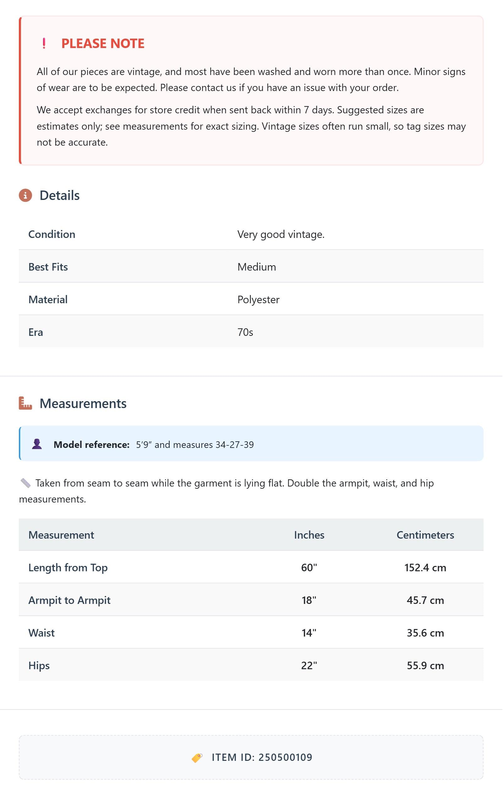 All of our pieces are vintage, and most have been washed and worn more than once. Minor signs of wear are to be expected. Please contact us if you have an issue with your order. We accept exchanges for store credit when sent back within 7 days.