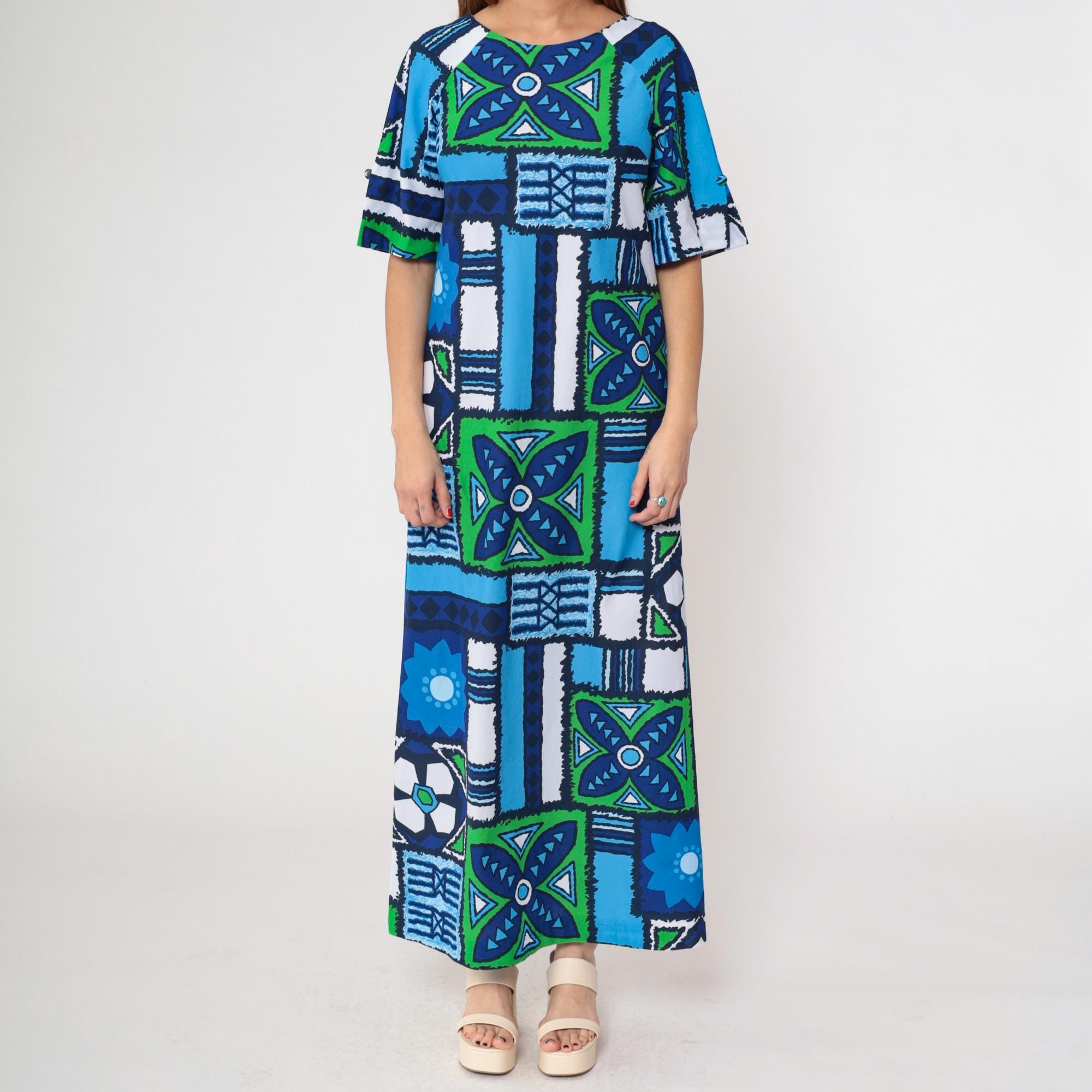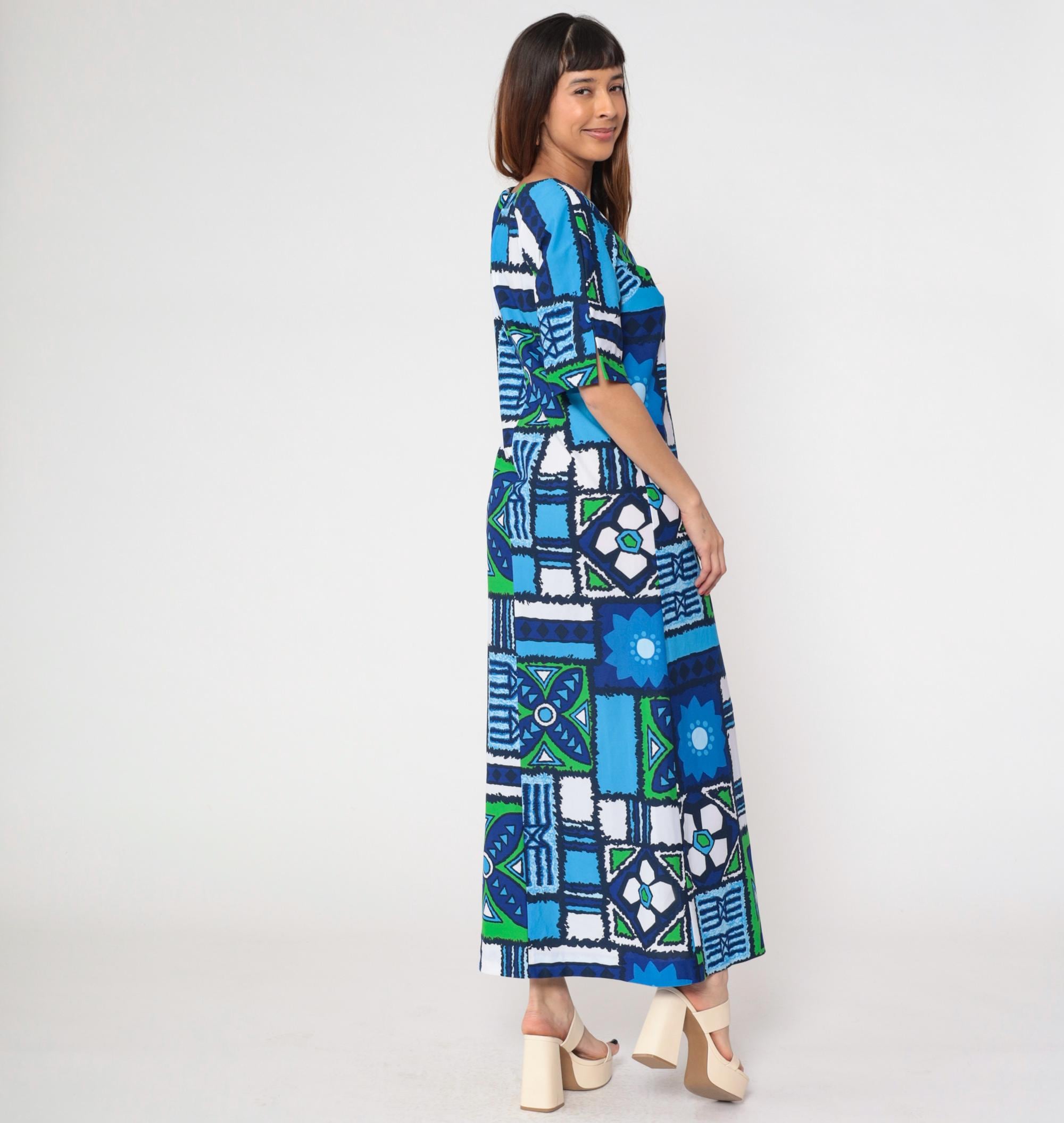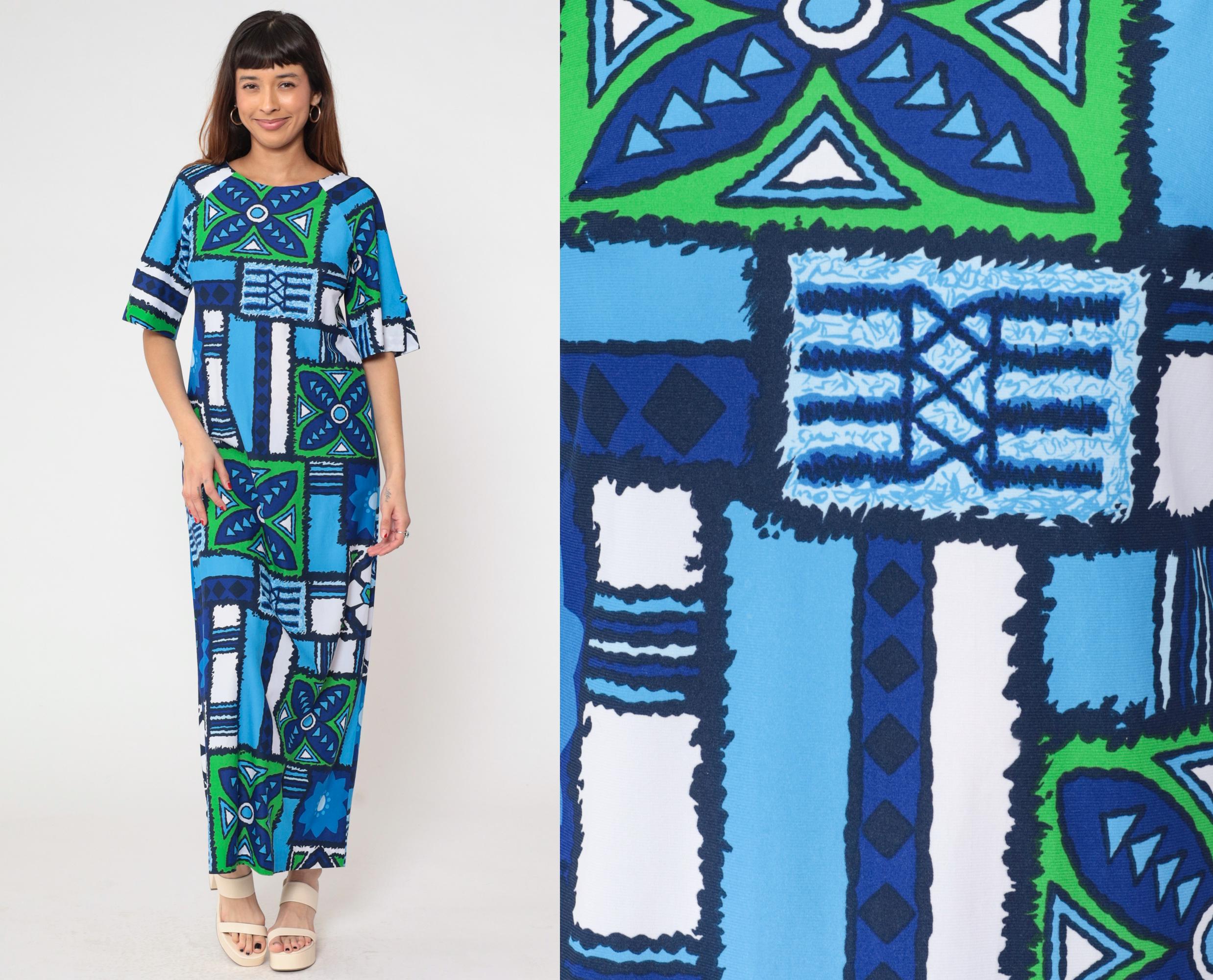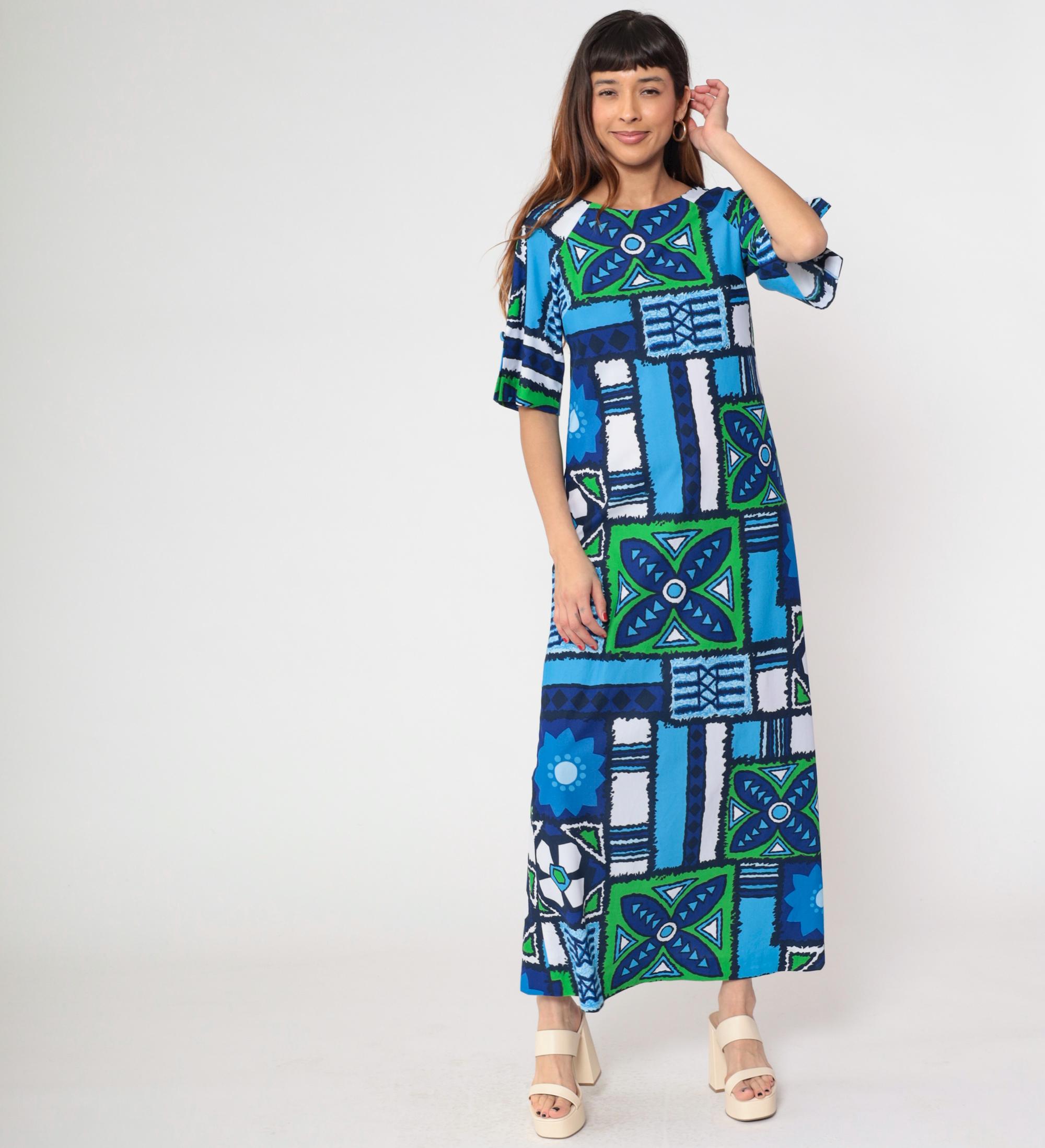 1970s Hawaiian-inspired maxi dress by Surfside Sportswear. Features vibrant blue, navy and green geometric abstract pattern with tropical motifs throughout. Simple silhouette with round neckline, short sleeves, and ankle-length cut.
