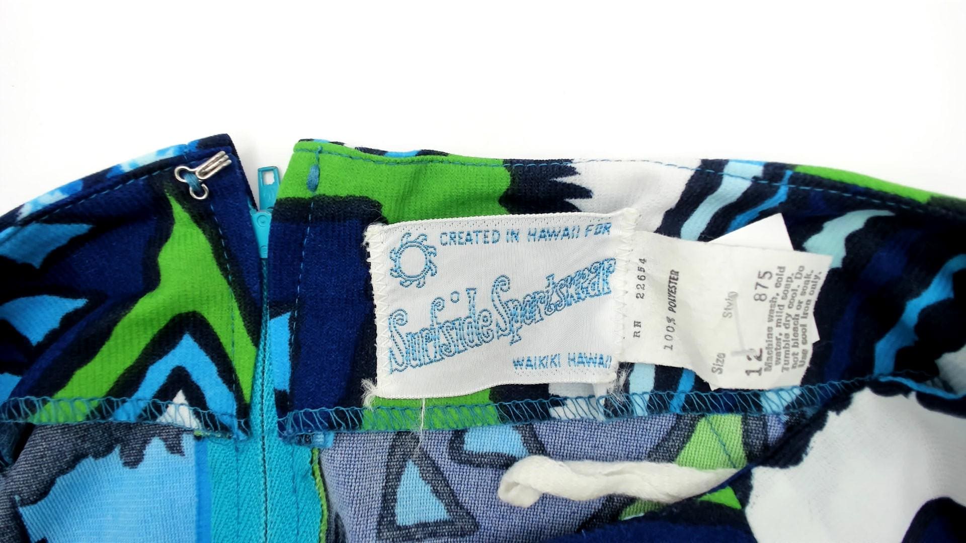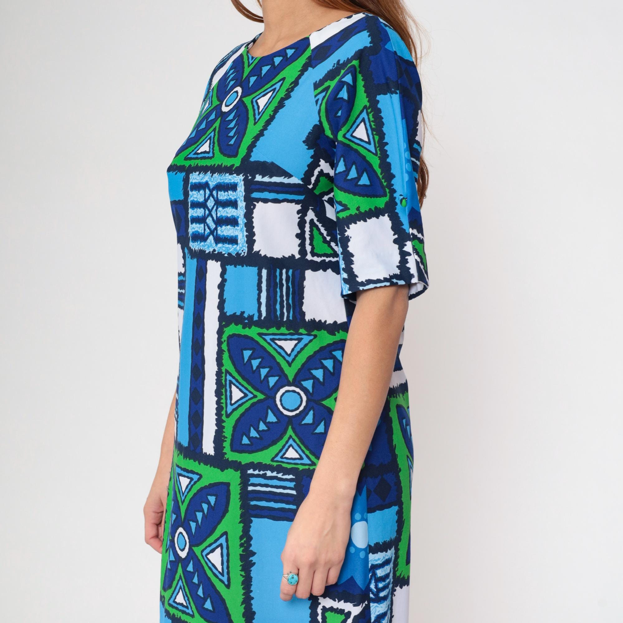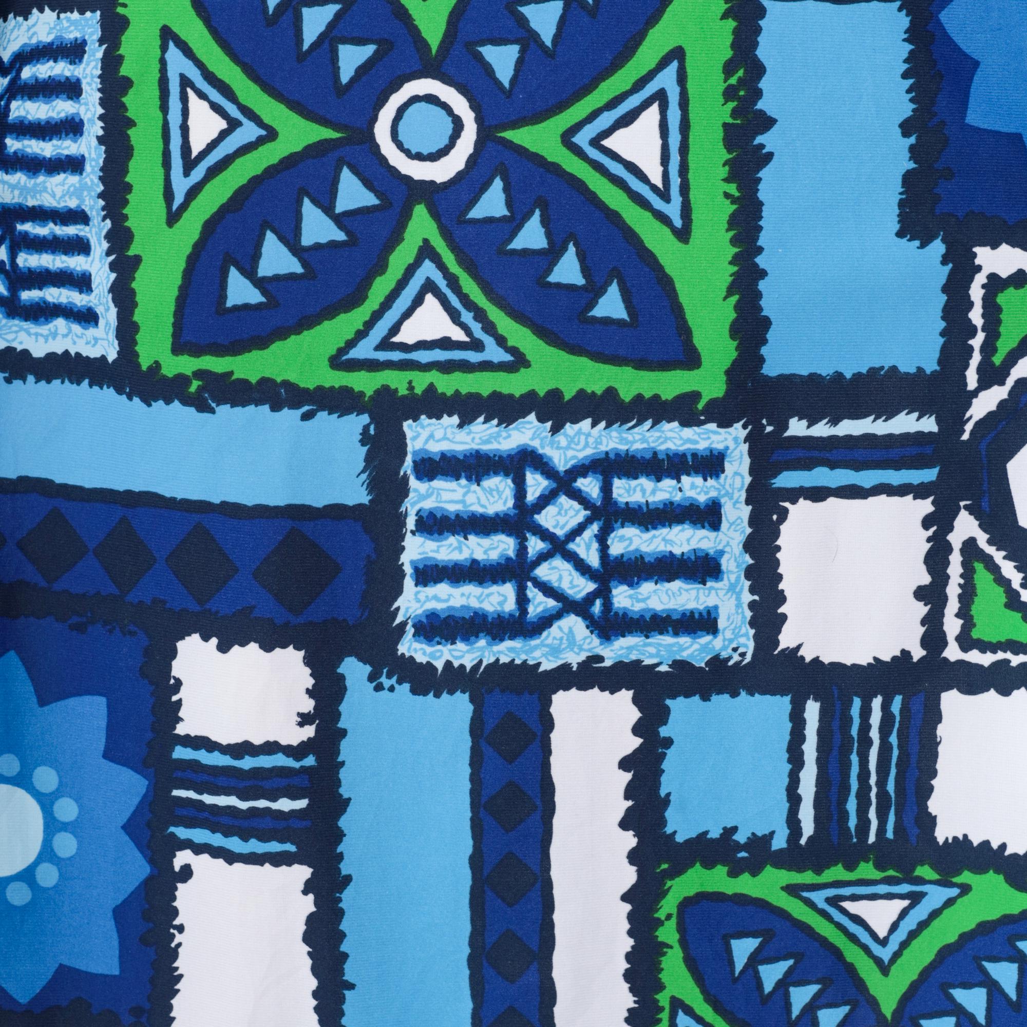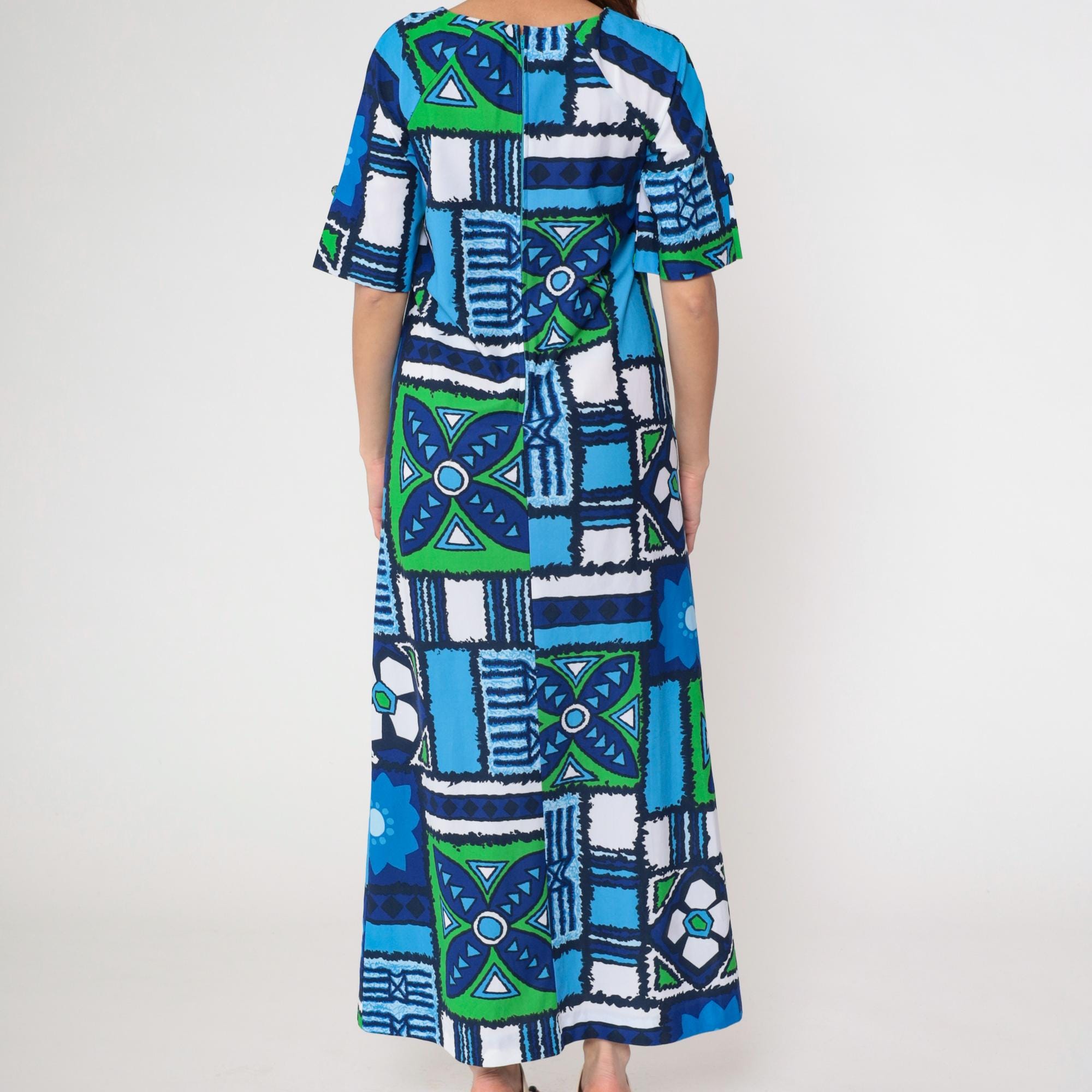 1970s Hawaiian-inspired maxi dress by Surfside Sportswear. Features vibrant blue, navy and green geometric abstract pattern with tropical motifs throughout. Simple silhouette with round neckline, short sleeves, and ankle-length cut.