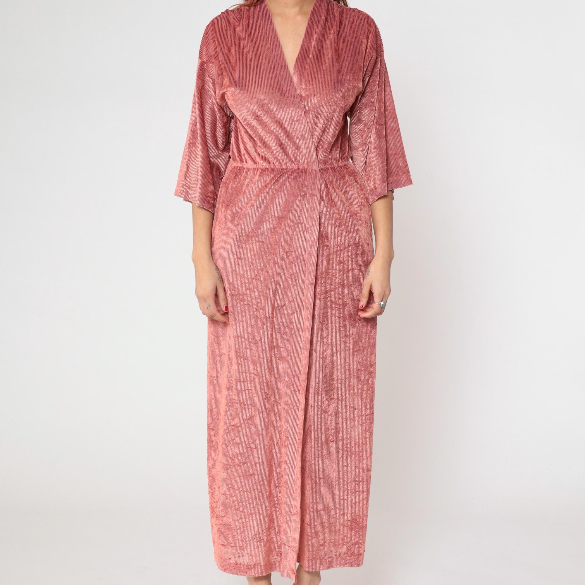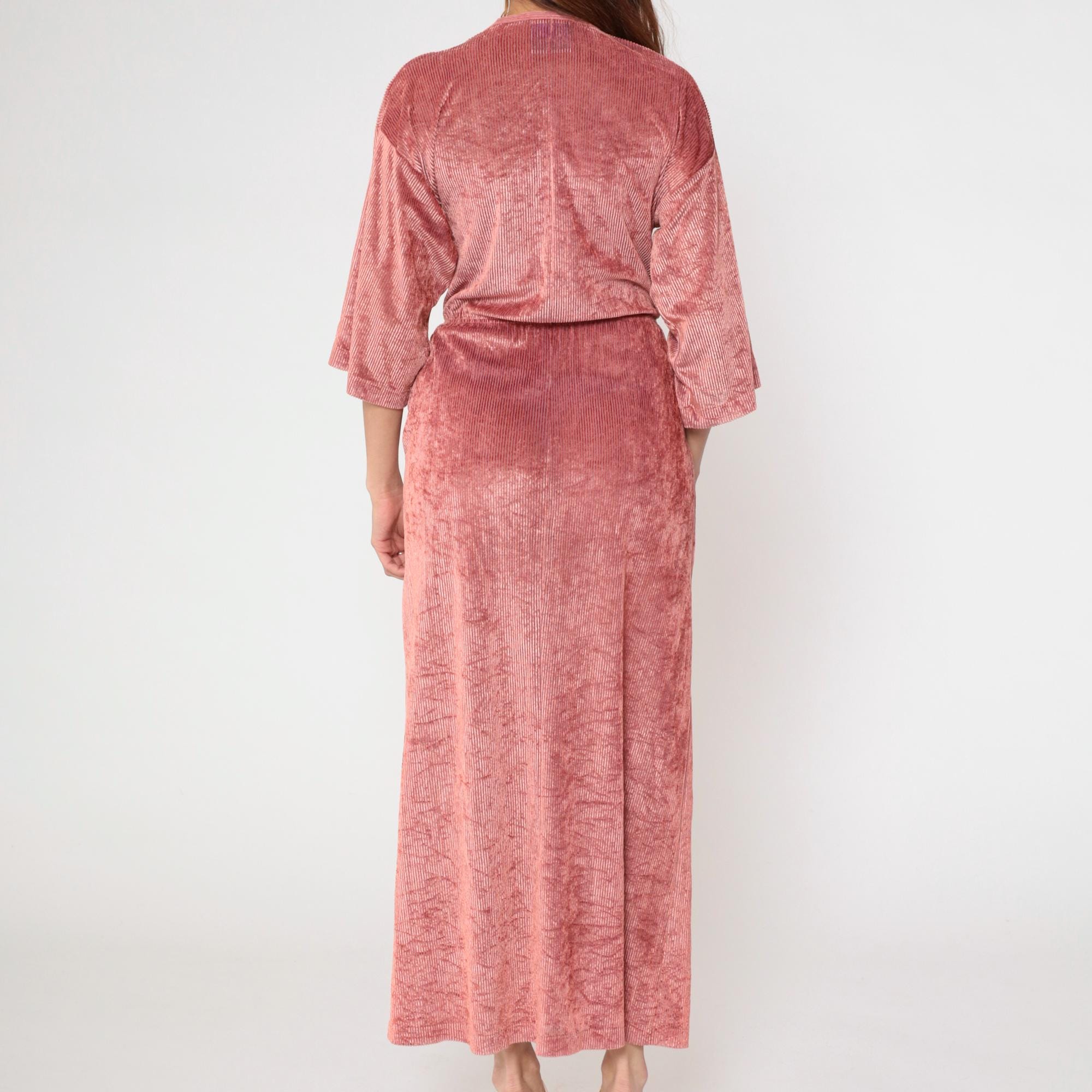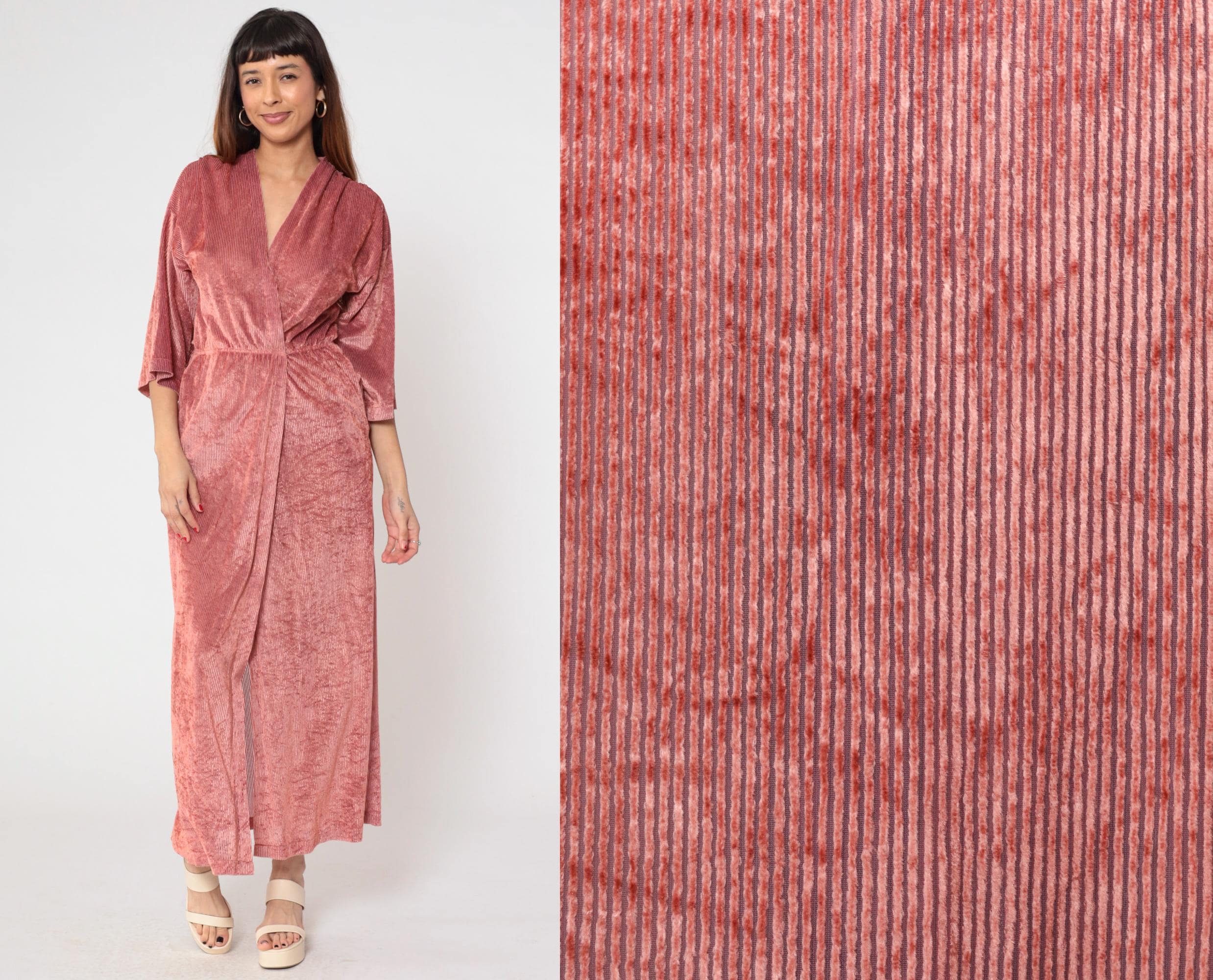 1970s dusty rose ribbed velour robe by Karessah. Features luxurious textured velvet fabric, elegant wrap style with deep V neckline, three-quarter kimono sleeves, and floor-length silhouette.