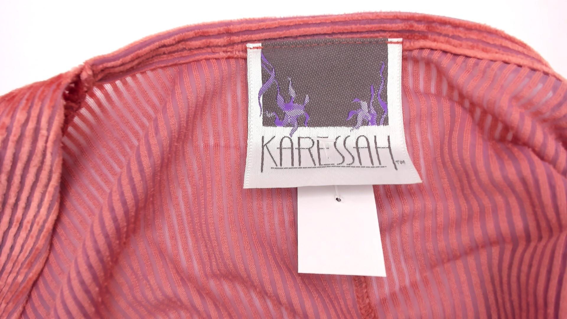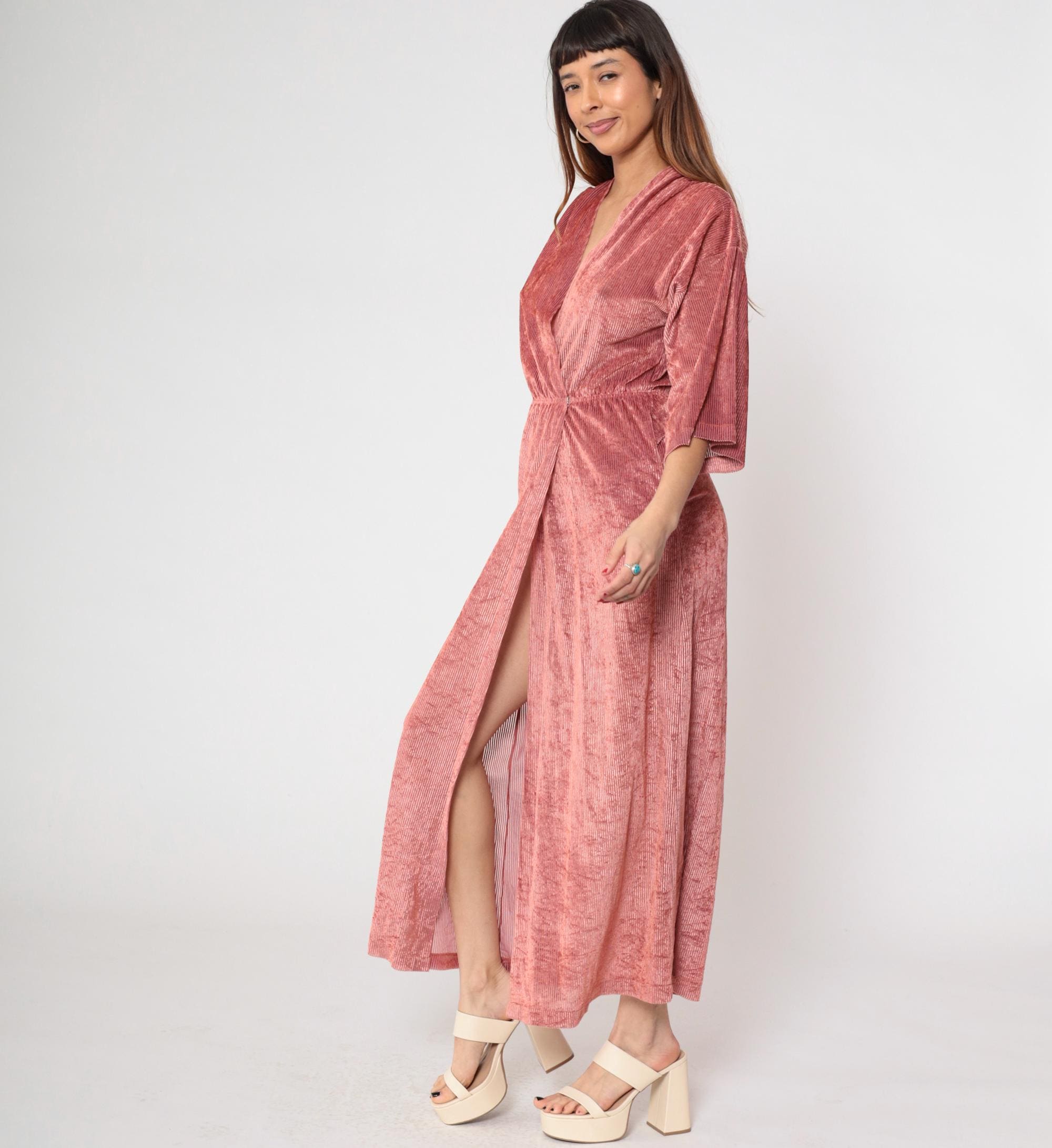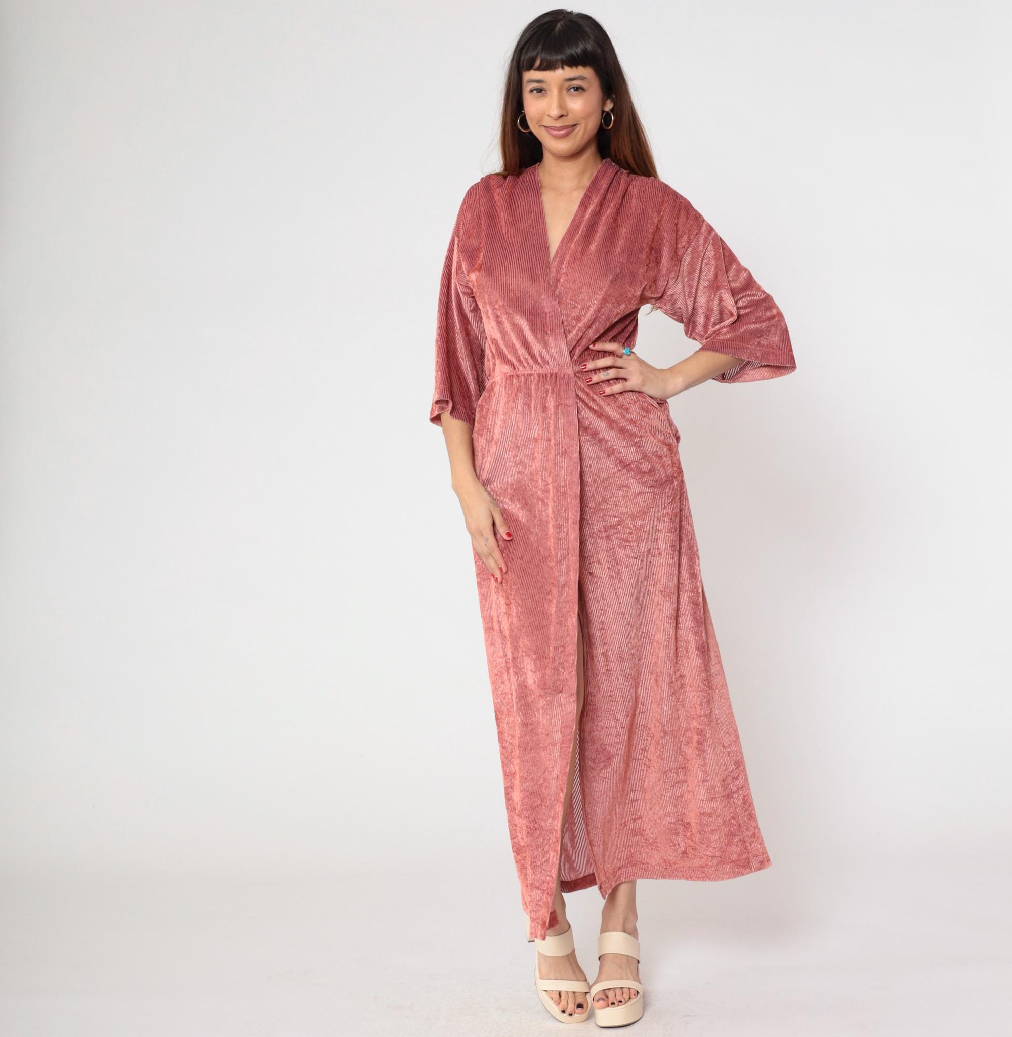 1970s dusty rose ribbed velour robe by Karessah. Features luxurious textured velvet fabric, elegant wrap style with deep V neckline, three-quarter kimono sleeves, and floor-length silhouette.