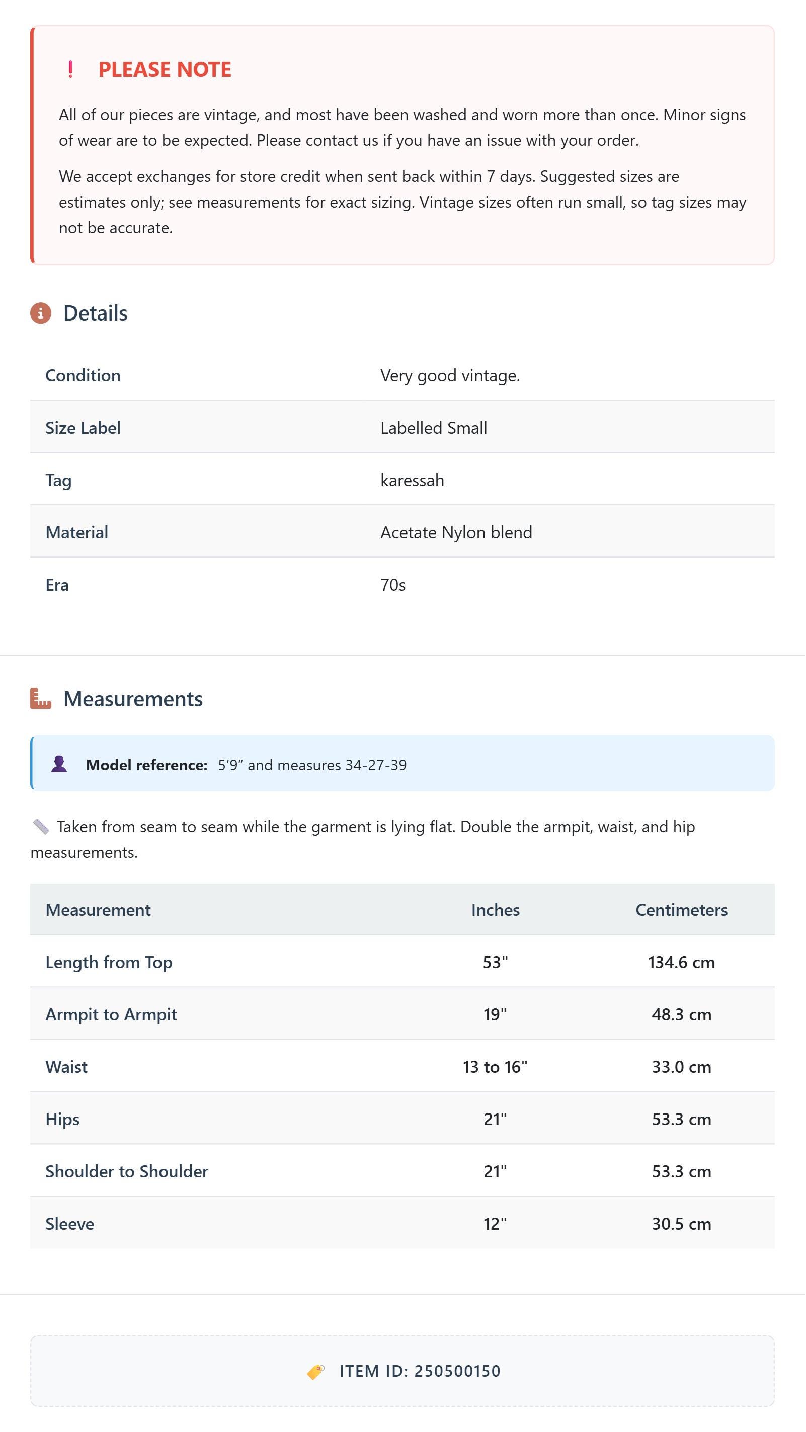 All of our pieces are vintage, and most have been washed and worn more than once. Minor signs of wear are to be expected. Please contact us if you have an issue with your order. We accept exchanges for store credit when sent back within 7 days.