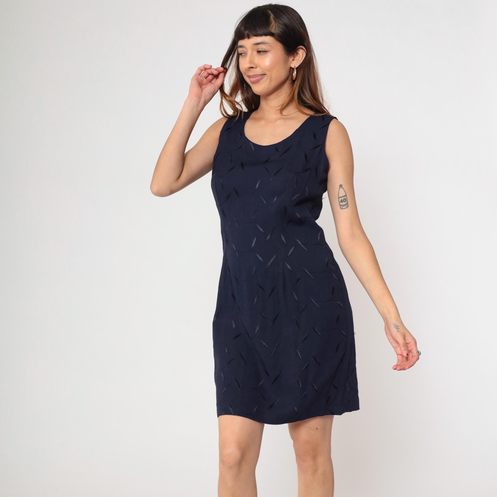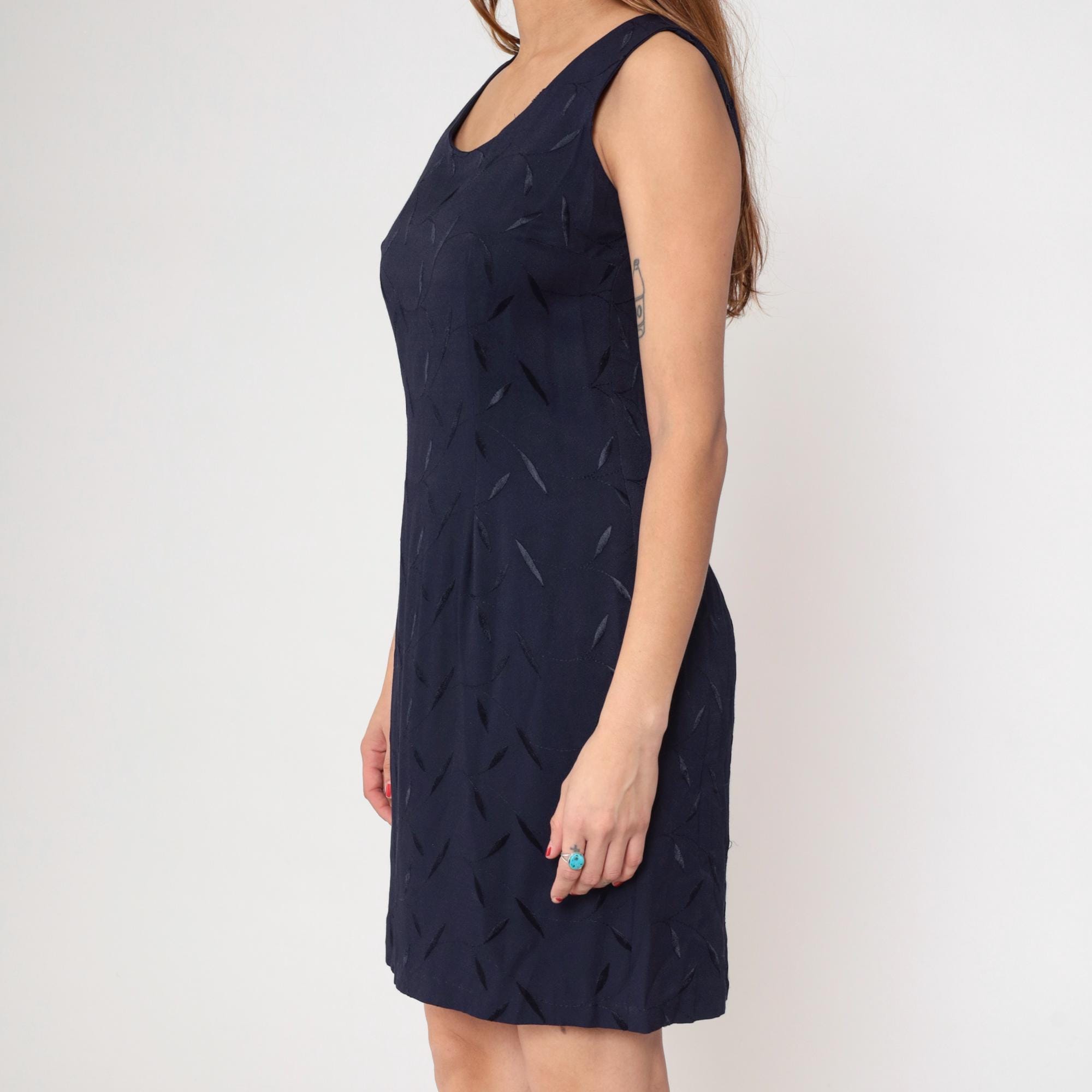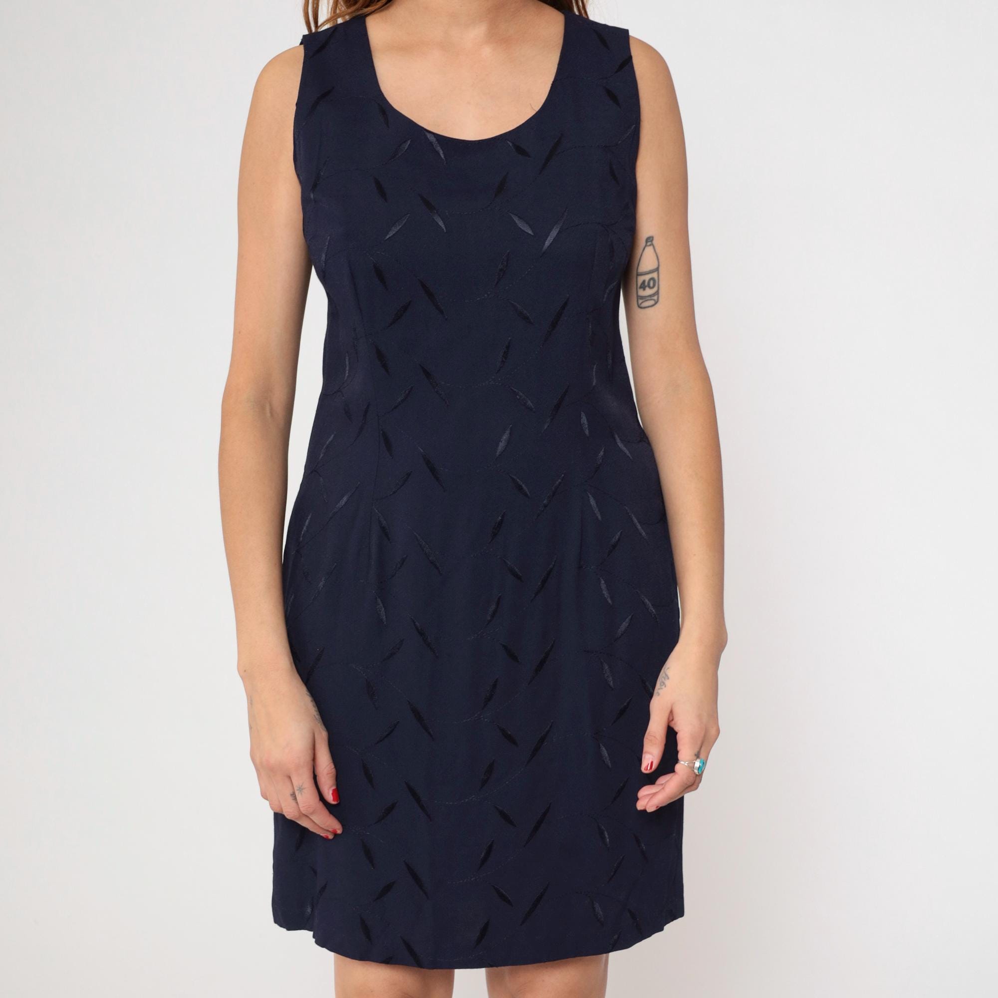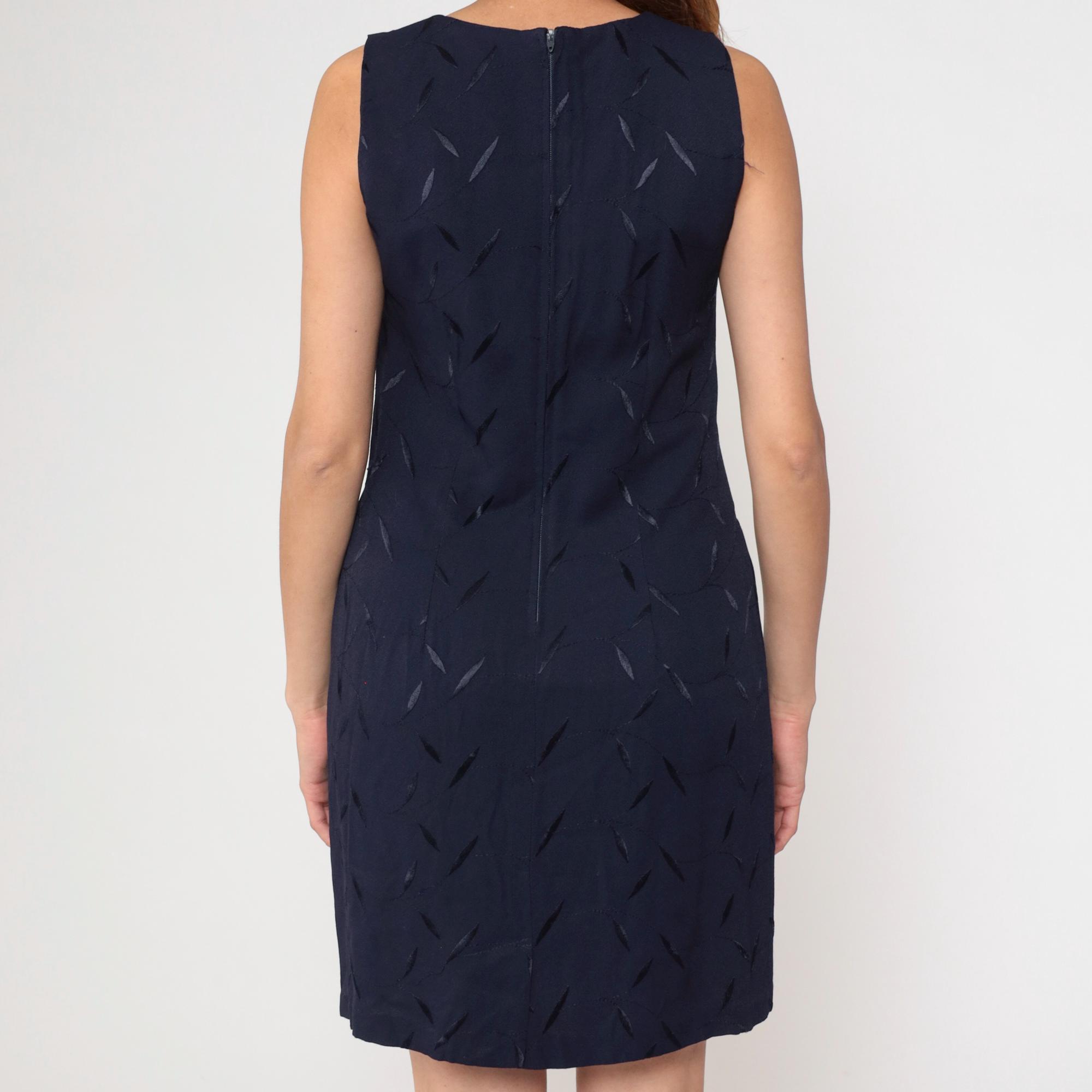 1990s navy grunge shift dress with distinctive leaf embroidery throughout. Minimalist silhouette with sleeveless cut, scoop neckline, and straight fit.