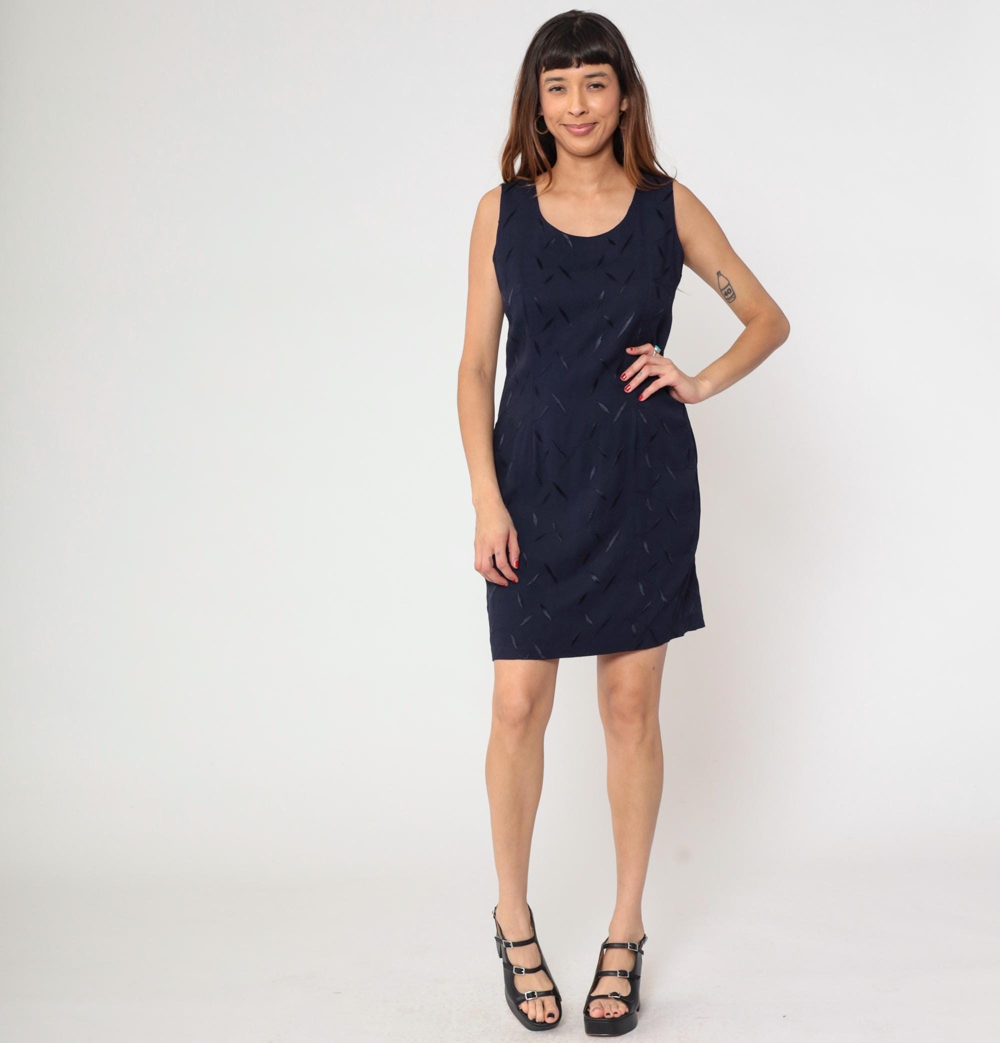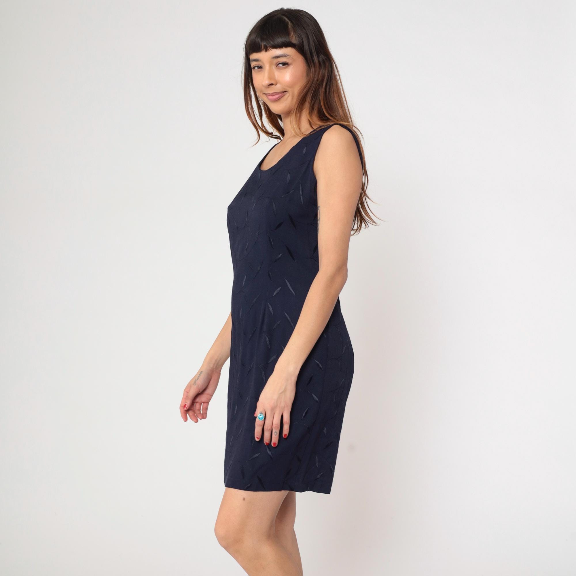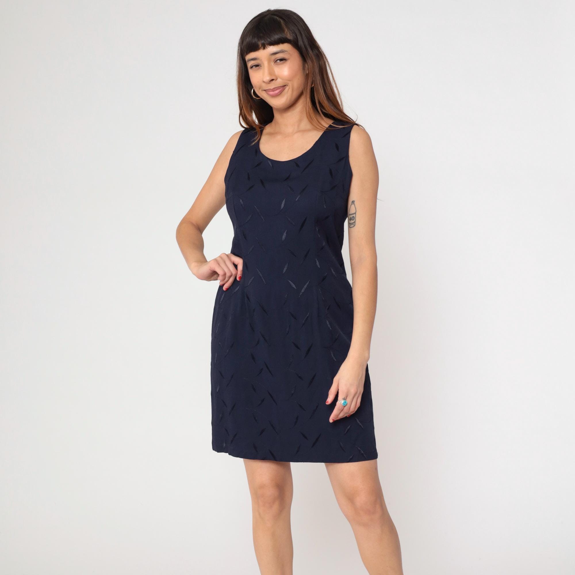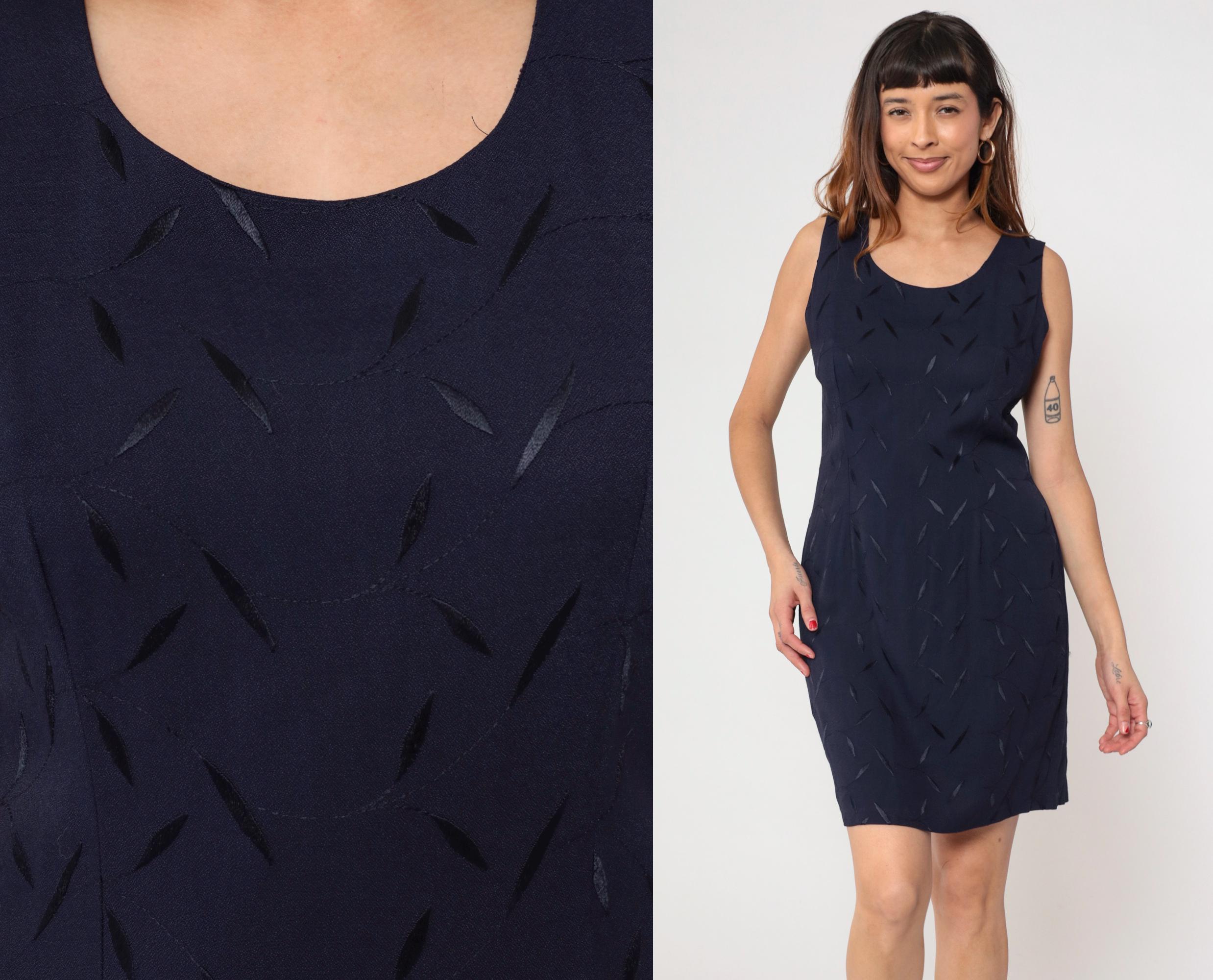 1990s navy grunge shift dress with distinctive leaf embroidery throughout. Minimalist silhouette with sleeveless cut, scoop neckline, and straight fit.