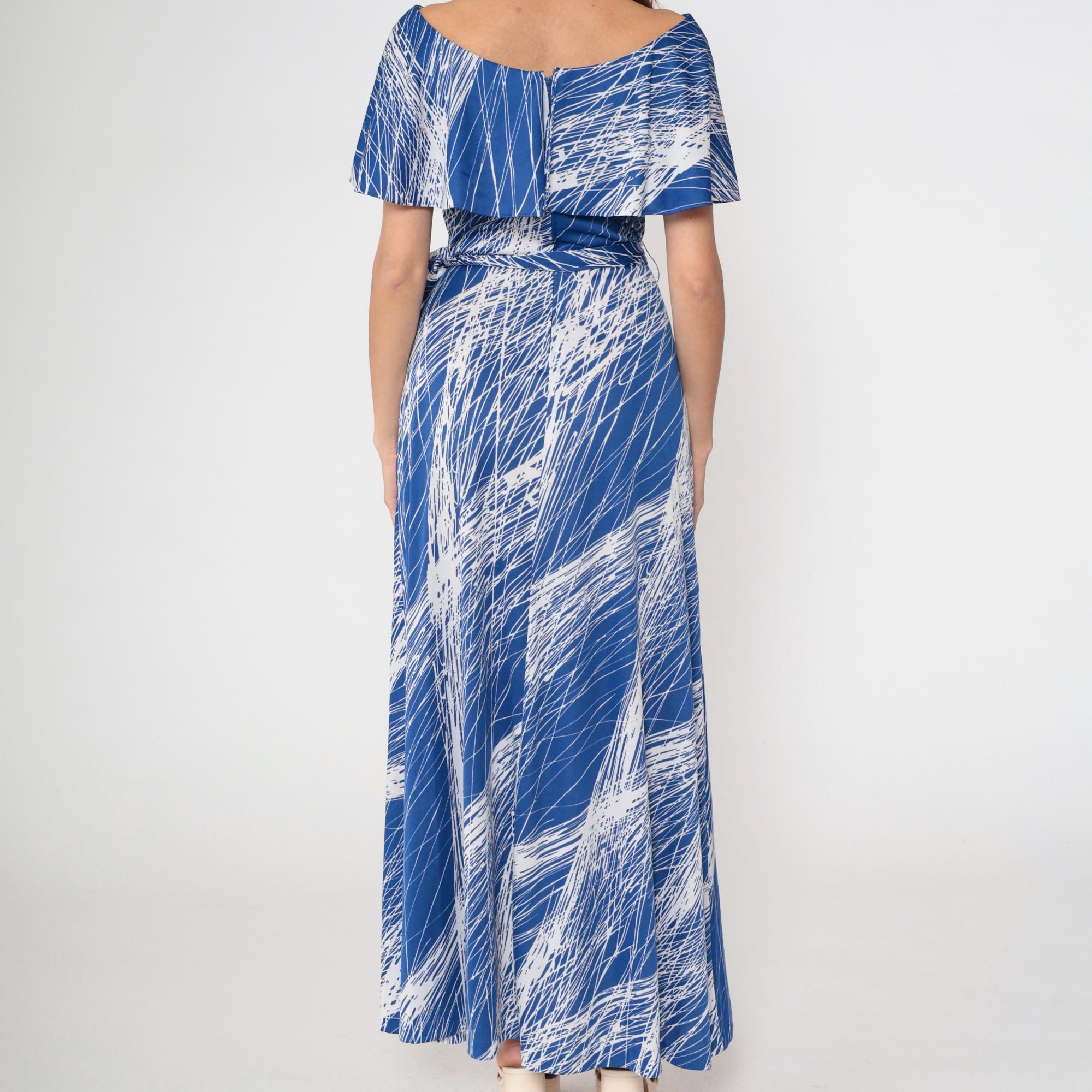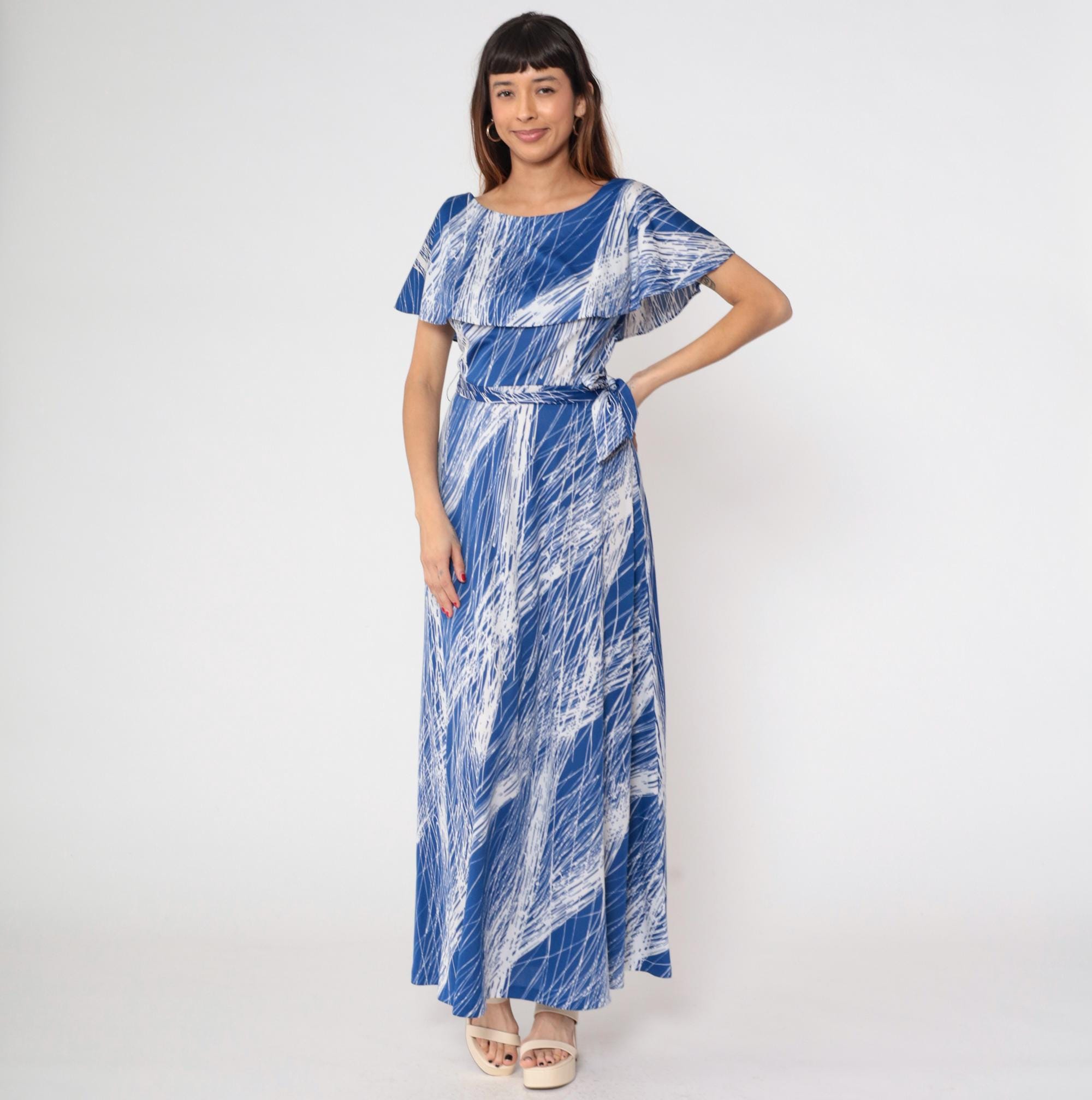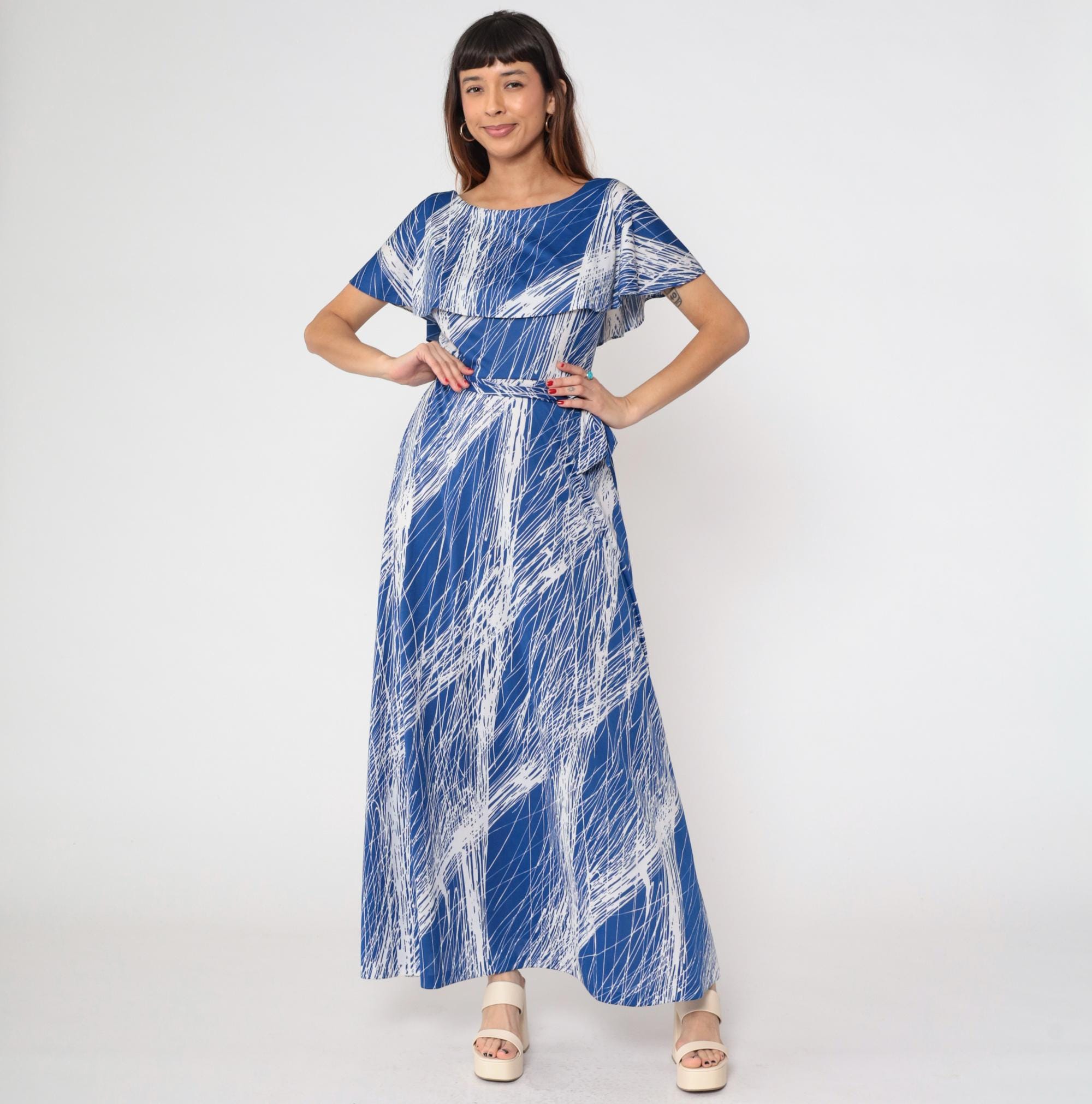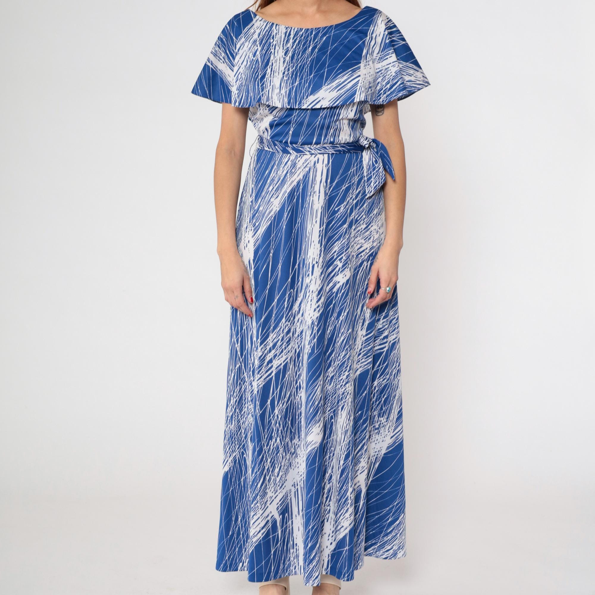 1970s blue and white brushstroke print maxi dress by Mary Martin. Features elegant capelet overlay with boat neckline, self-tie belt at waist, and flowing floor-length skirt.