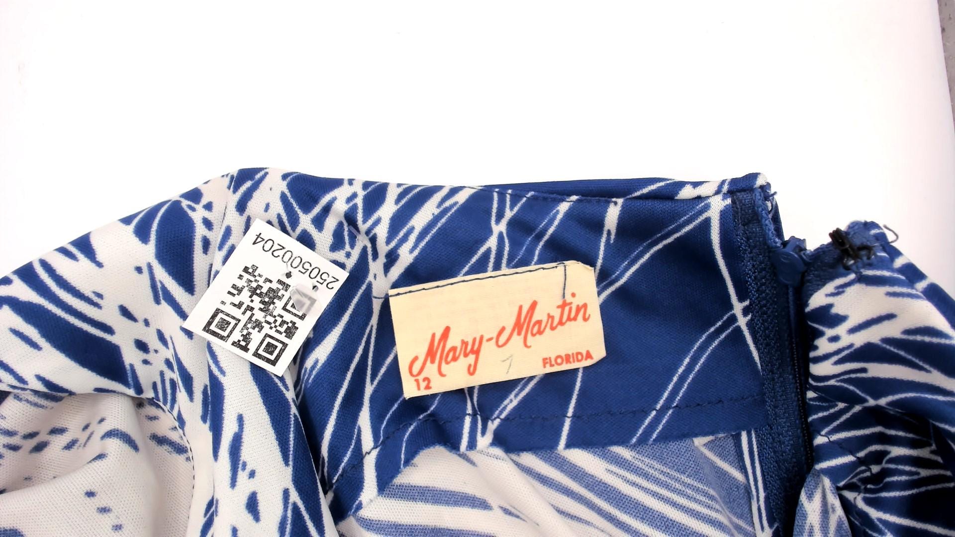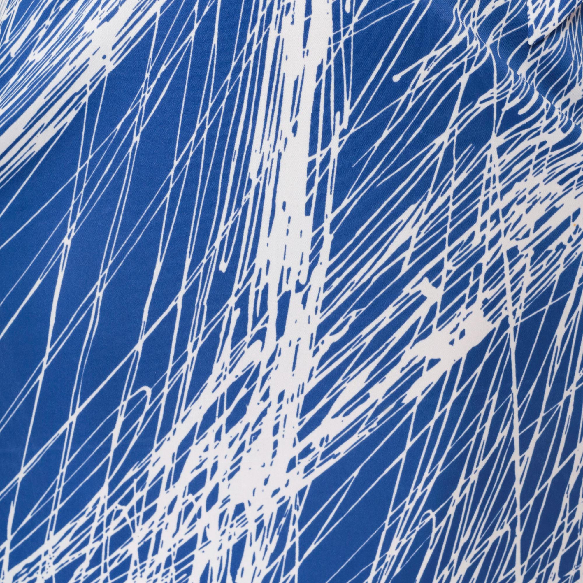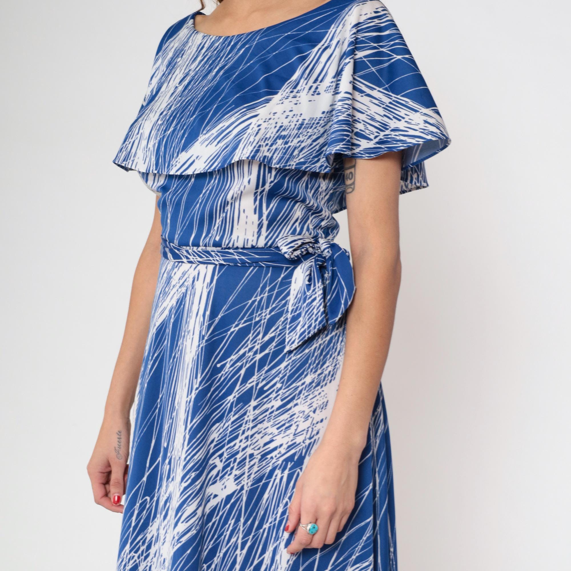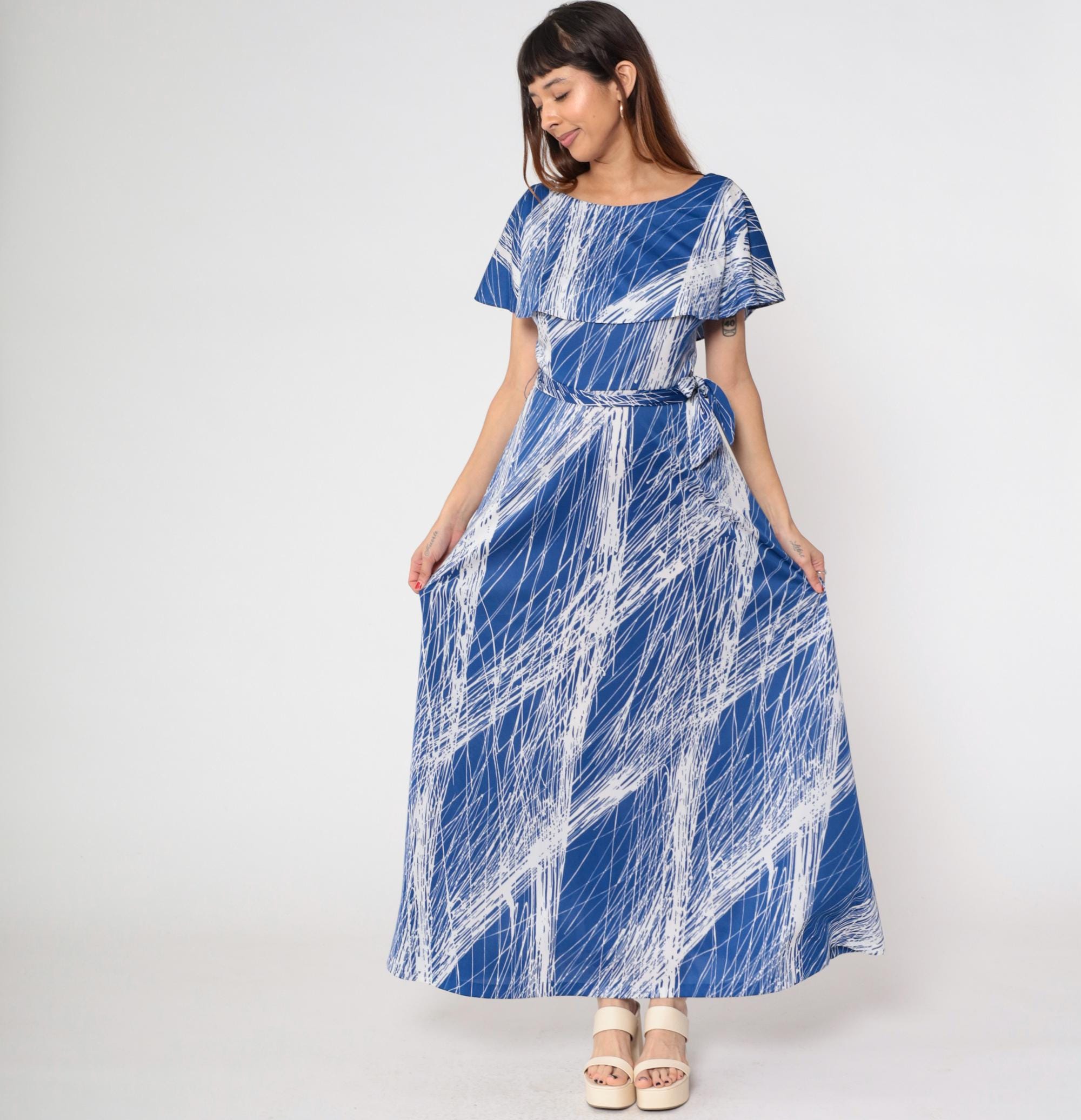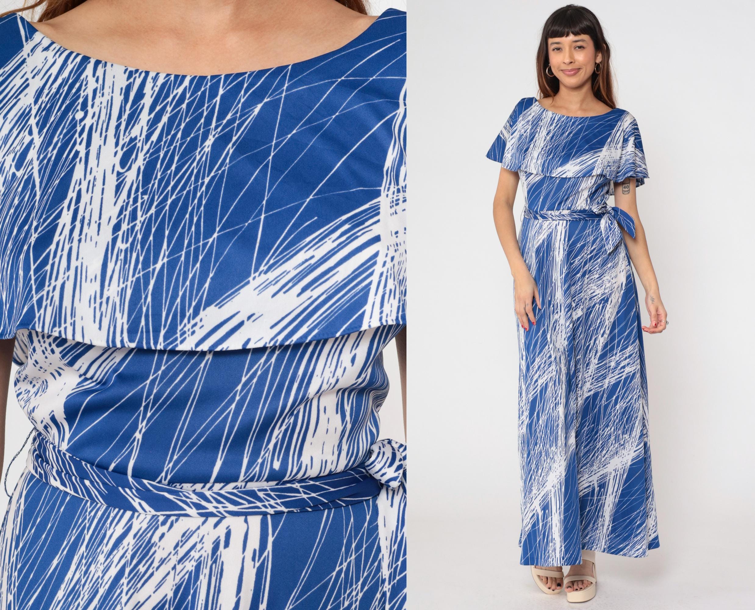 1970s blue and white brushstroke print maxi dress by Mary Martin. Features elegant capelet overlay with boat neckline, self-tie belt at waist, and flowing floor-length skirt.