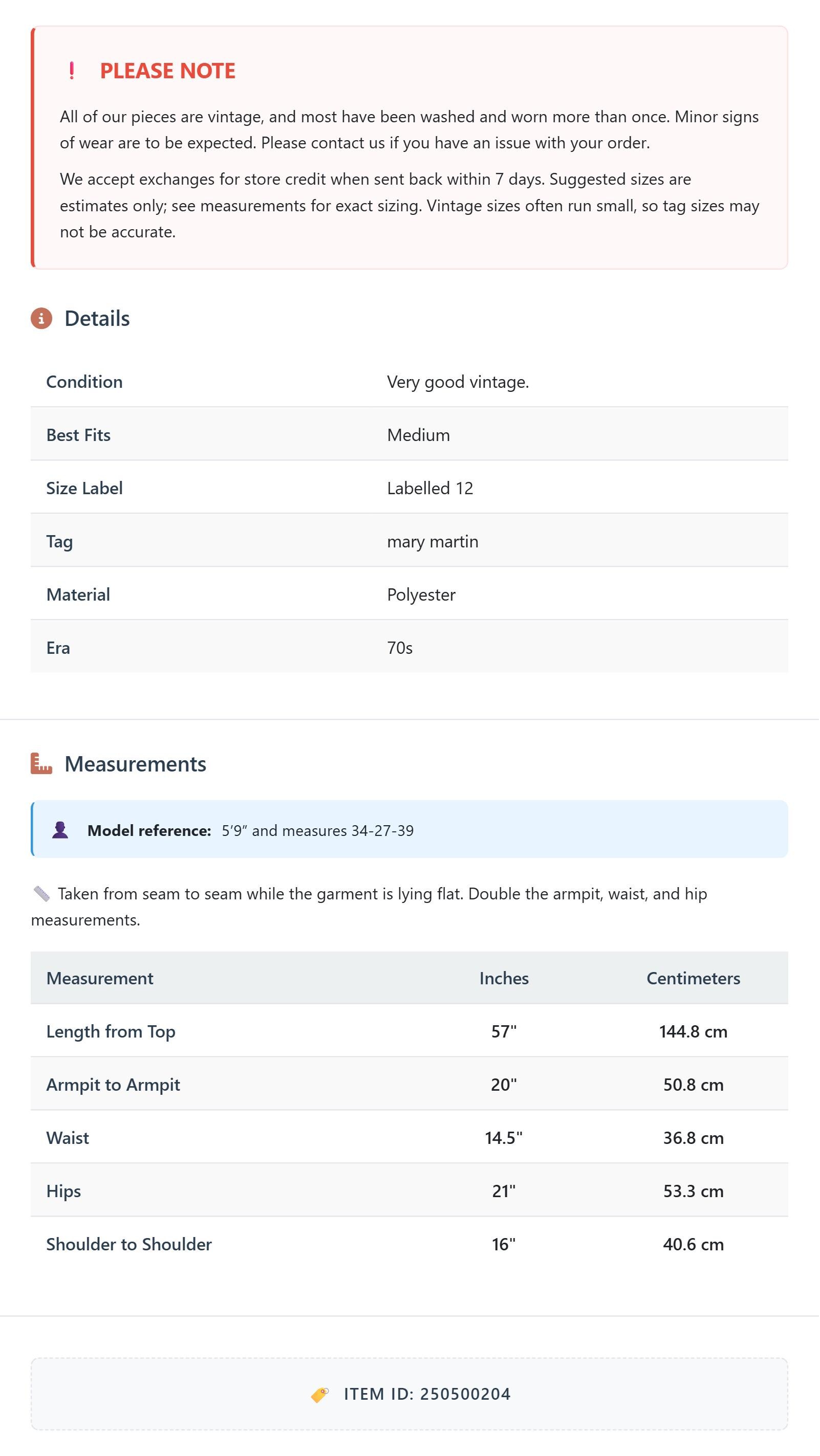 All of our pieces are vintage, and most have been washed and worn more than once. Minor signs of wear are to be expected. Please contact us if you have an issue with your order. We accept exchanges for store credit when sent back within 7 days.
