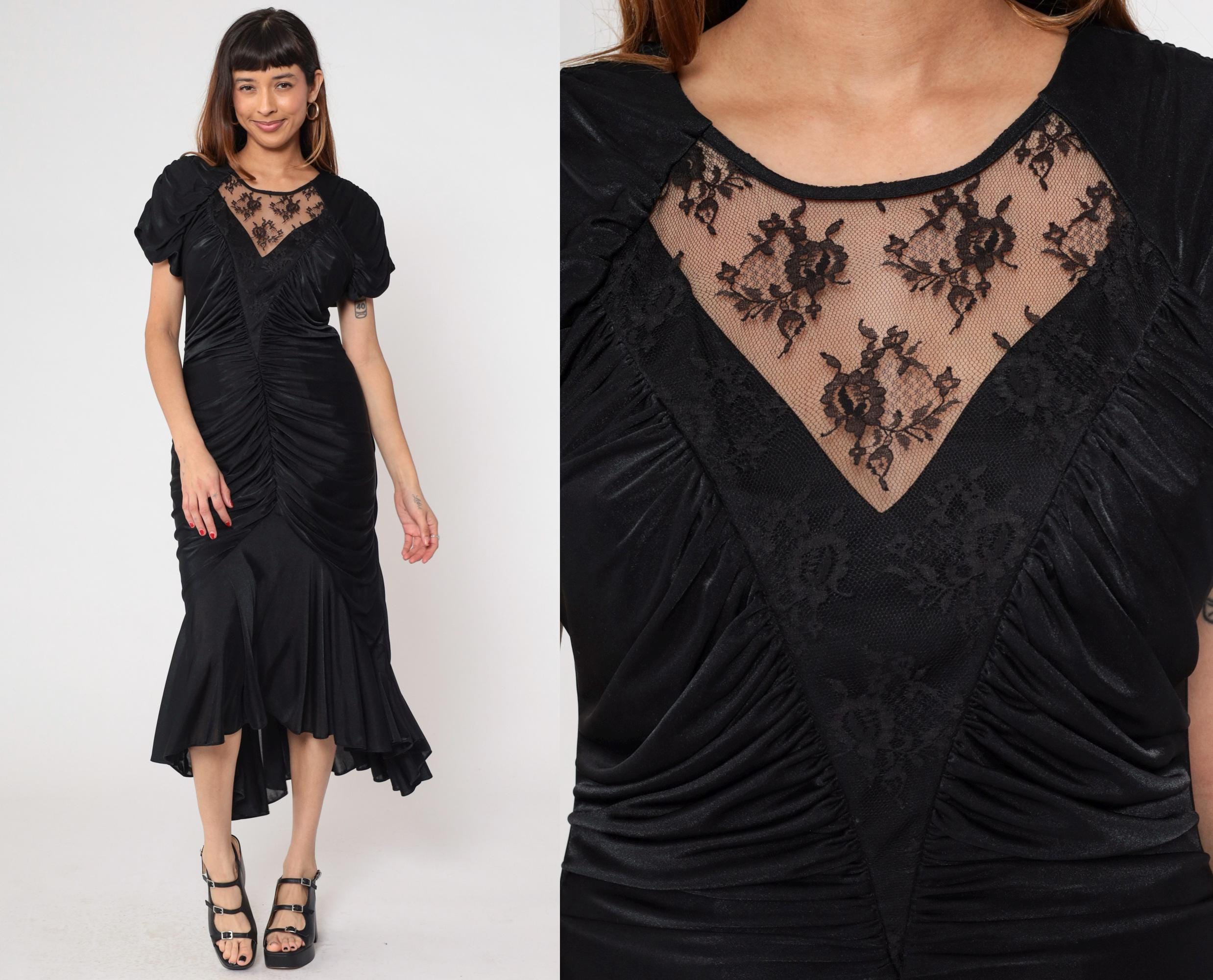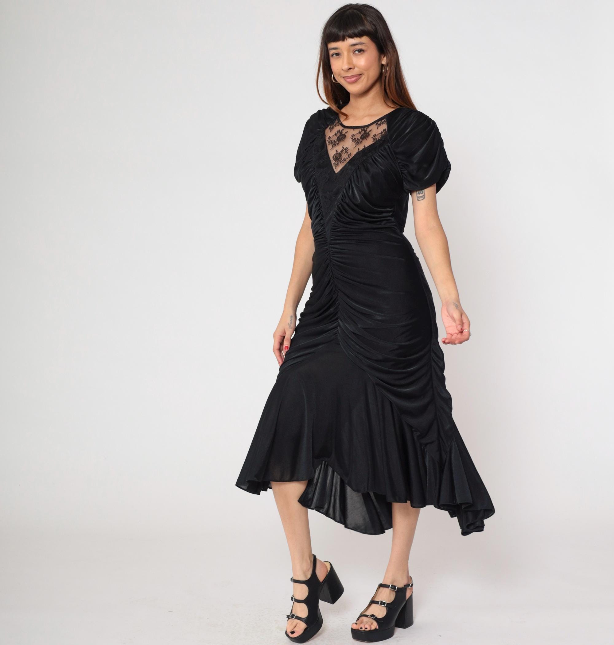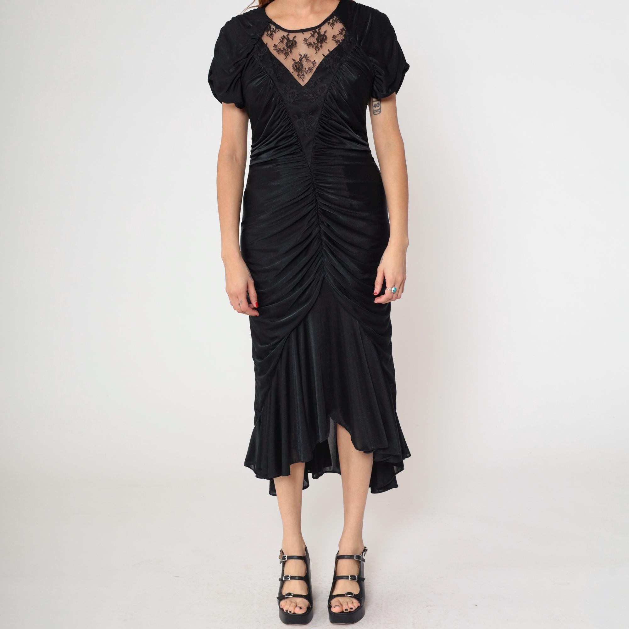 Dramatic black evening dress featuring sheer floral lace insert at neckline, ruched bodycon silhouette, and stunning open back. Distinctive details include puff sleeves, center front ruching, and asymmetrical flounced hem with high-low silhouette.