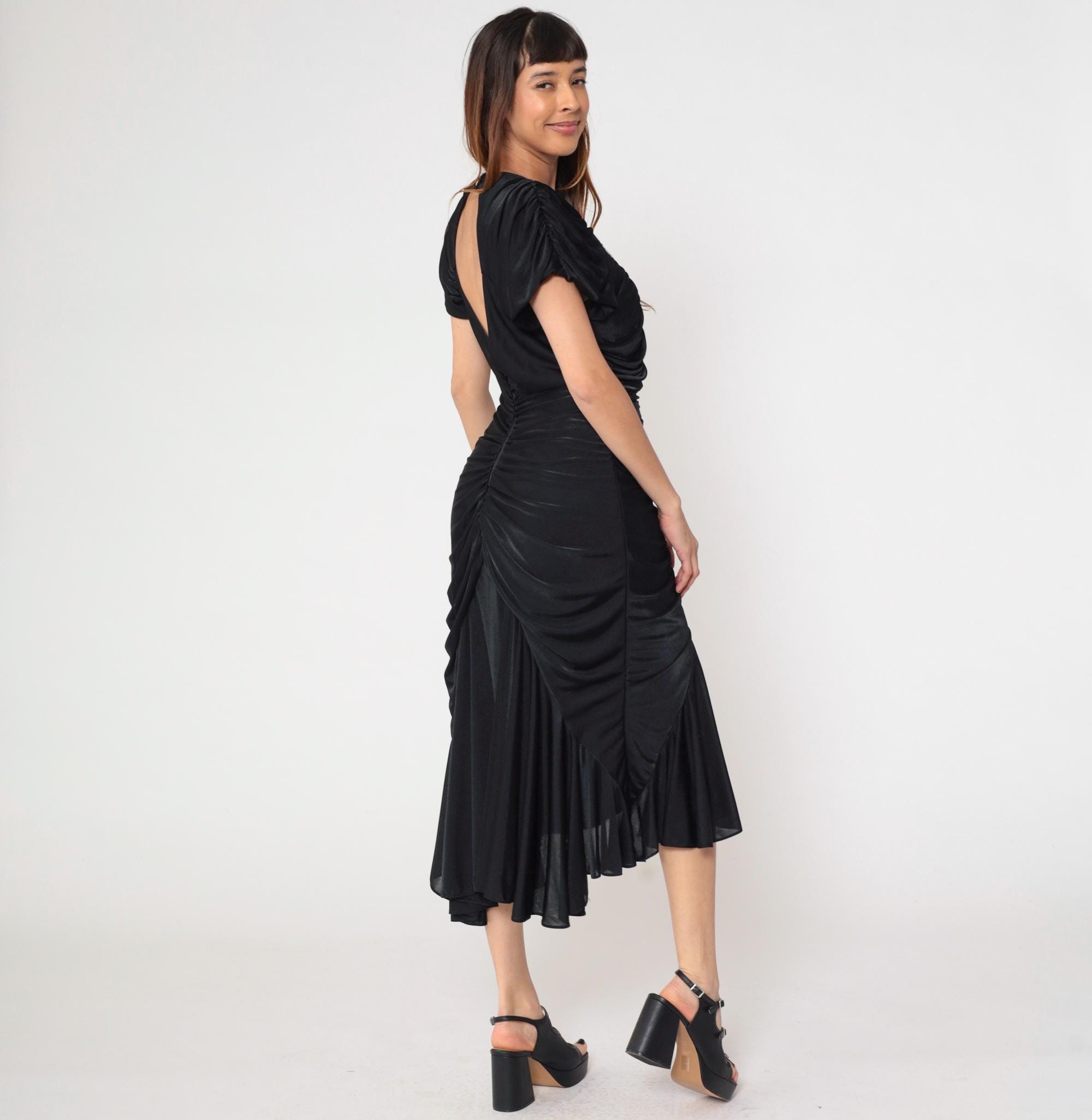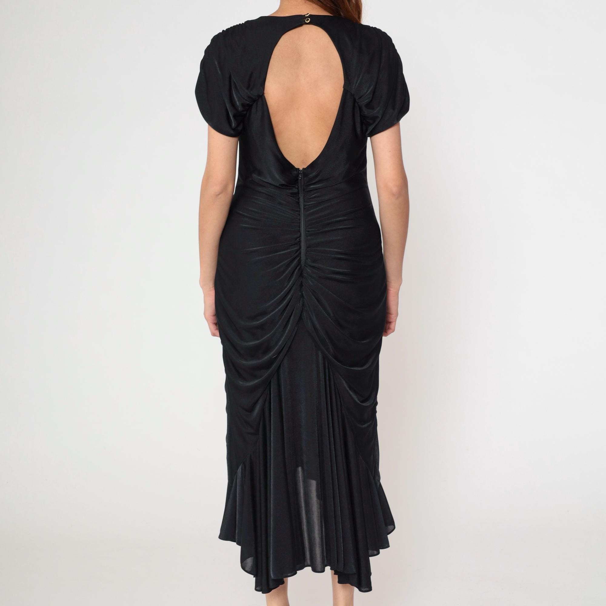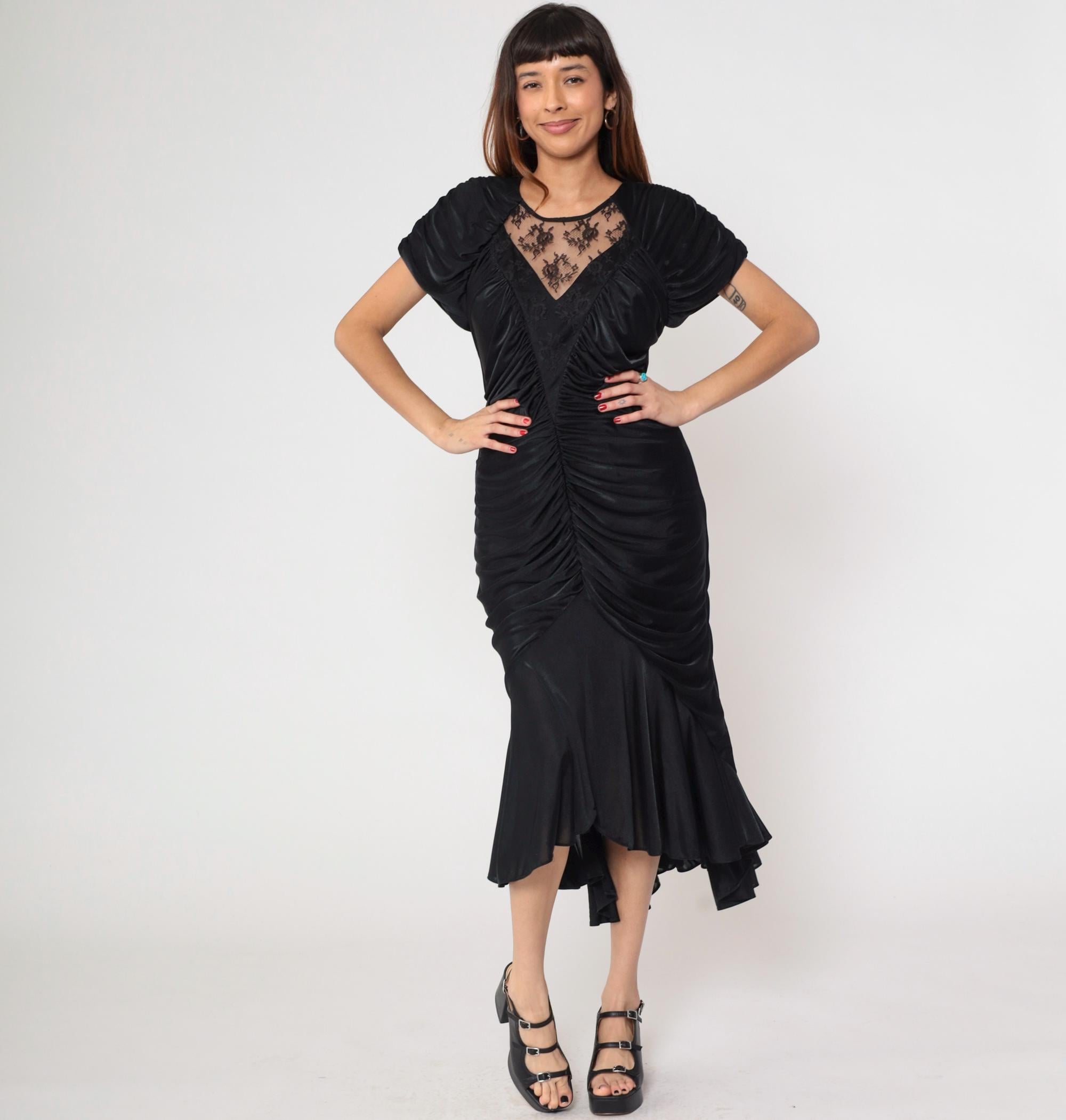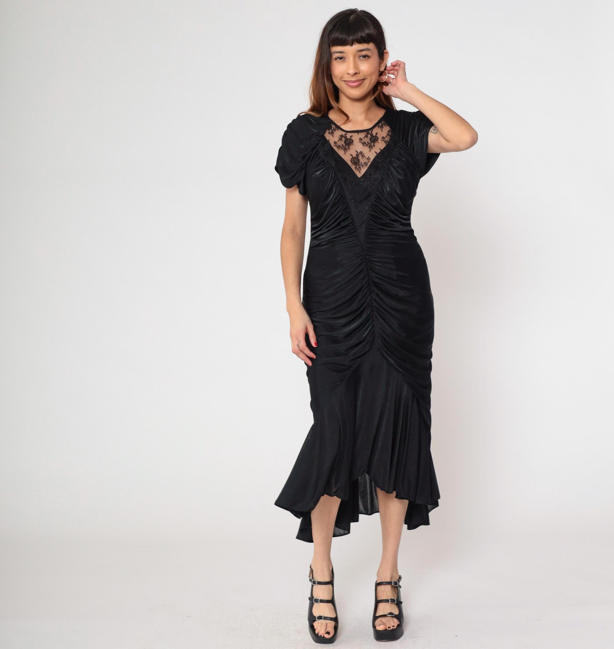 Dramatic black evening dress featuring sheer floral lace insert at neckline, ruched bodycon silhouette, and stunning open back. Distinctive details include puff sleeves, center front ruching, and asymmetrical flounced hem with high-low silhouette.