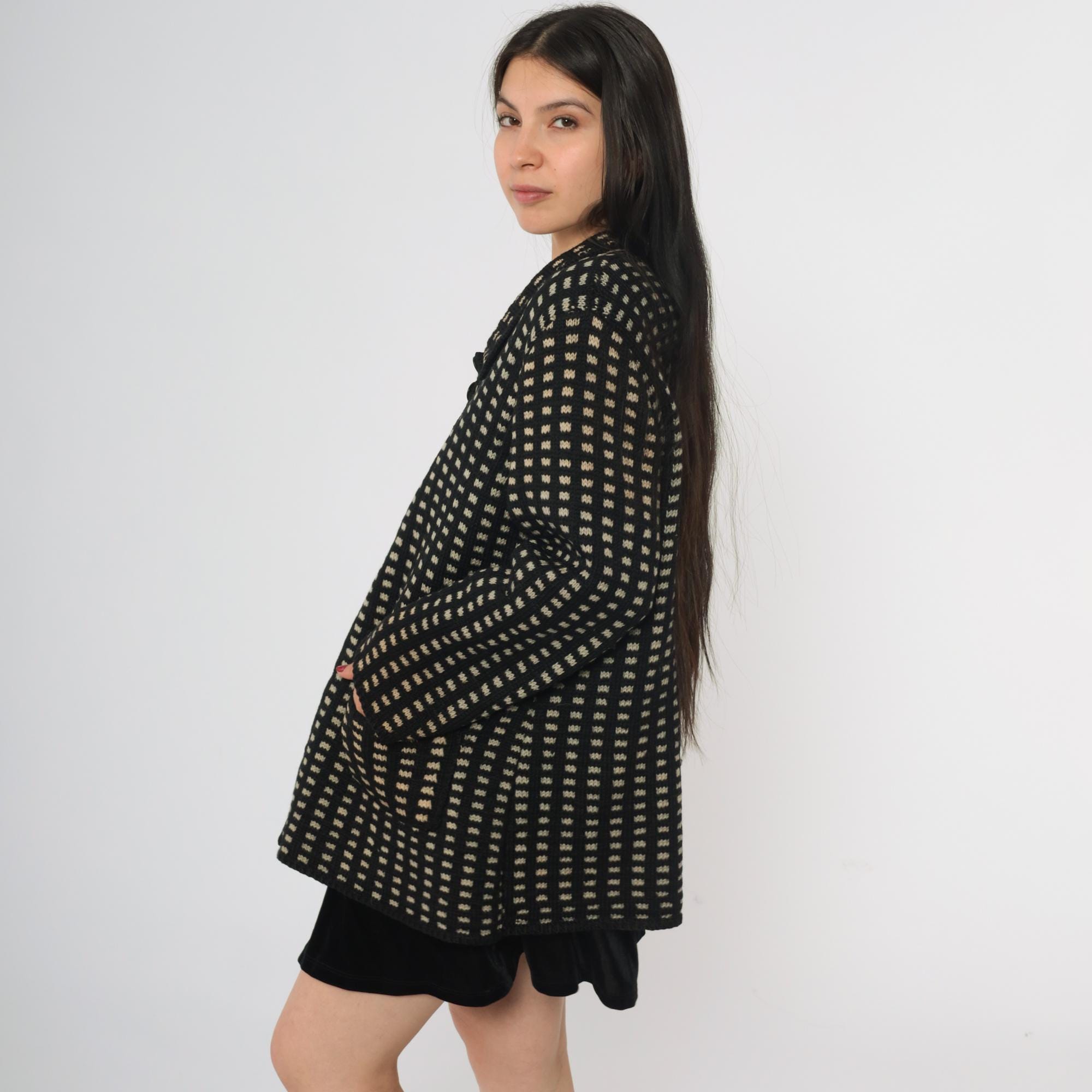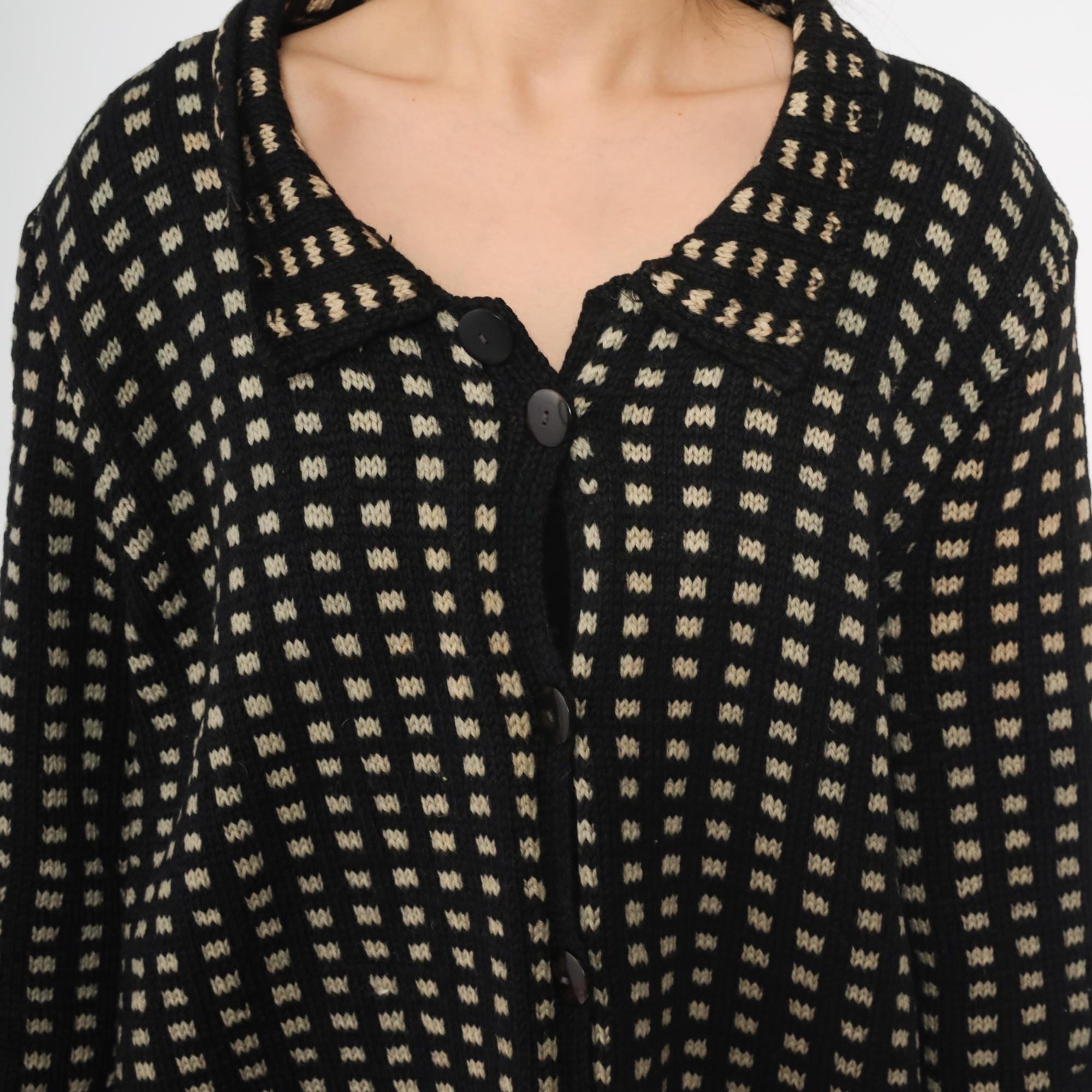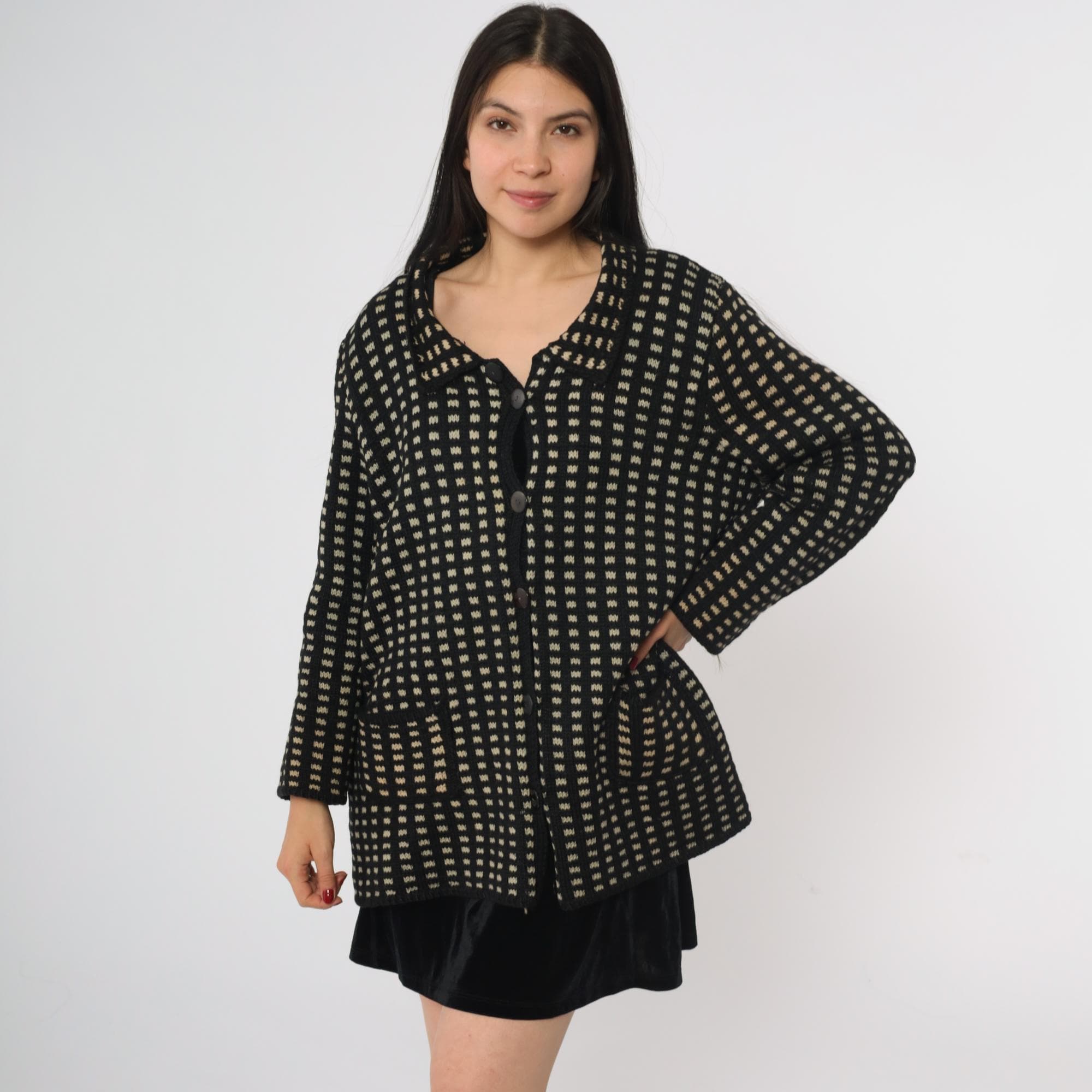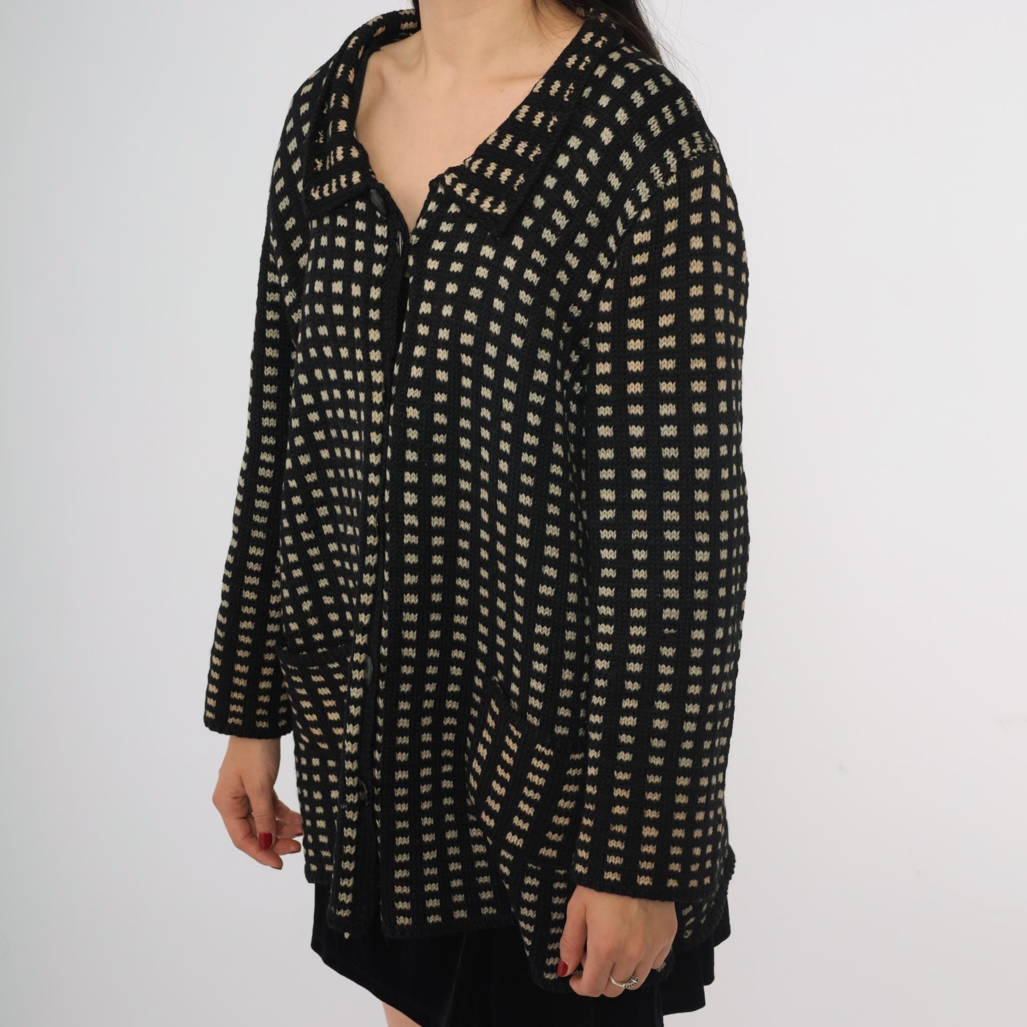 80s black and cream wool knit sweater coat featuring a small check pattern throughout. Designed with a collared neckline, front button closure, and two front patch pockets. The fit is oversized with long sleeves and a mid-thigh length.