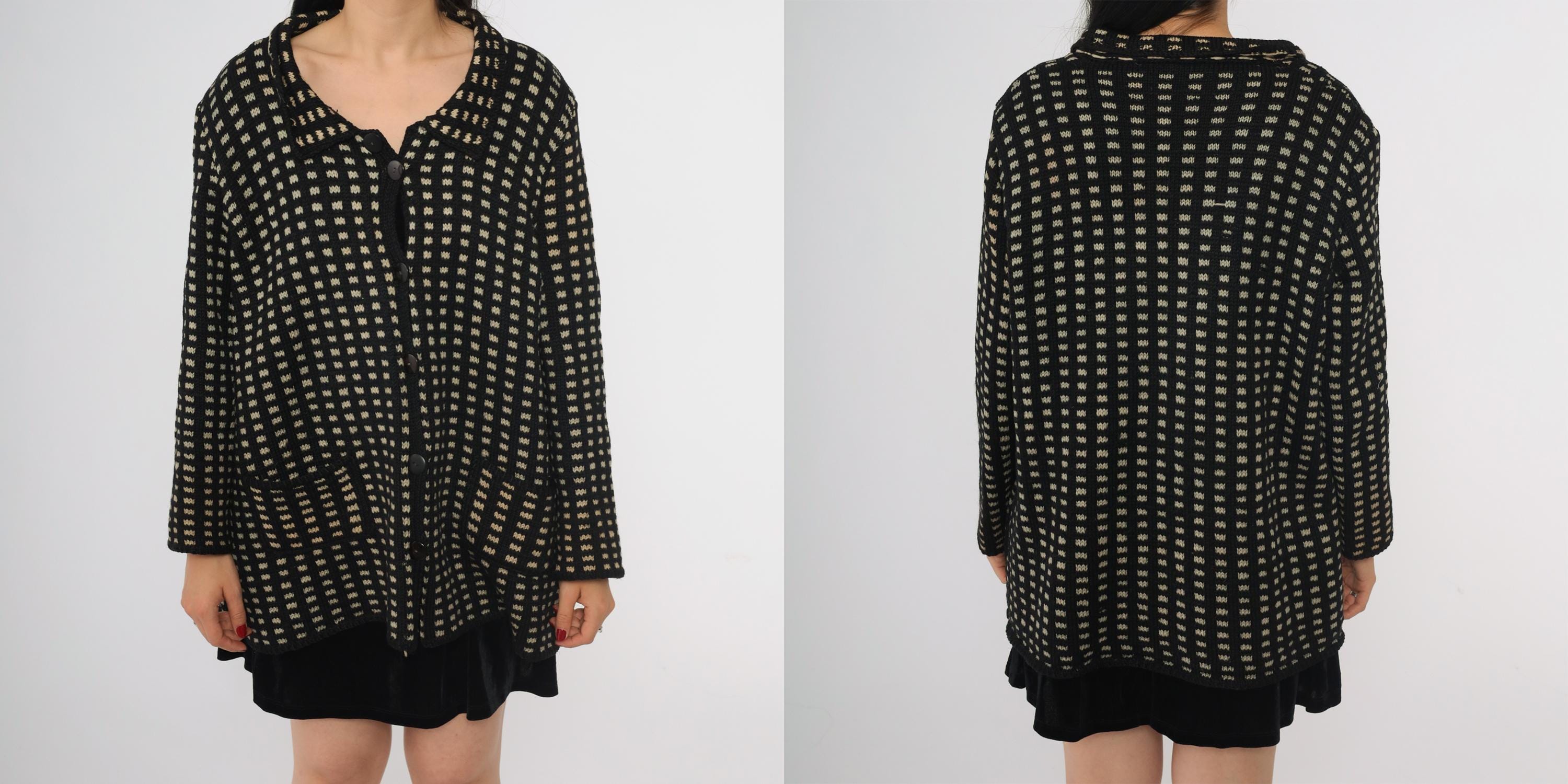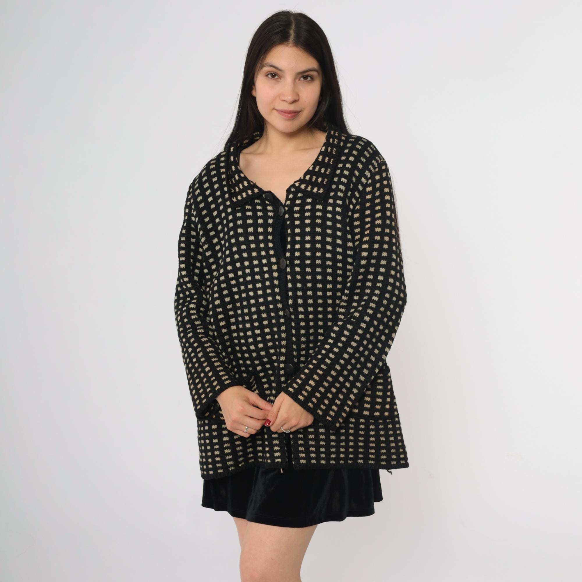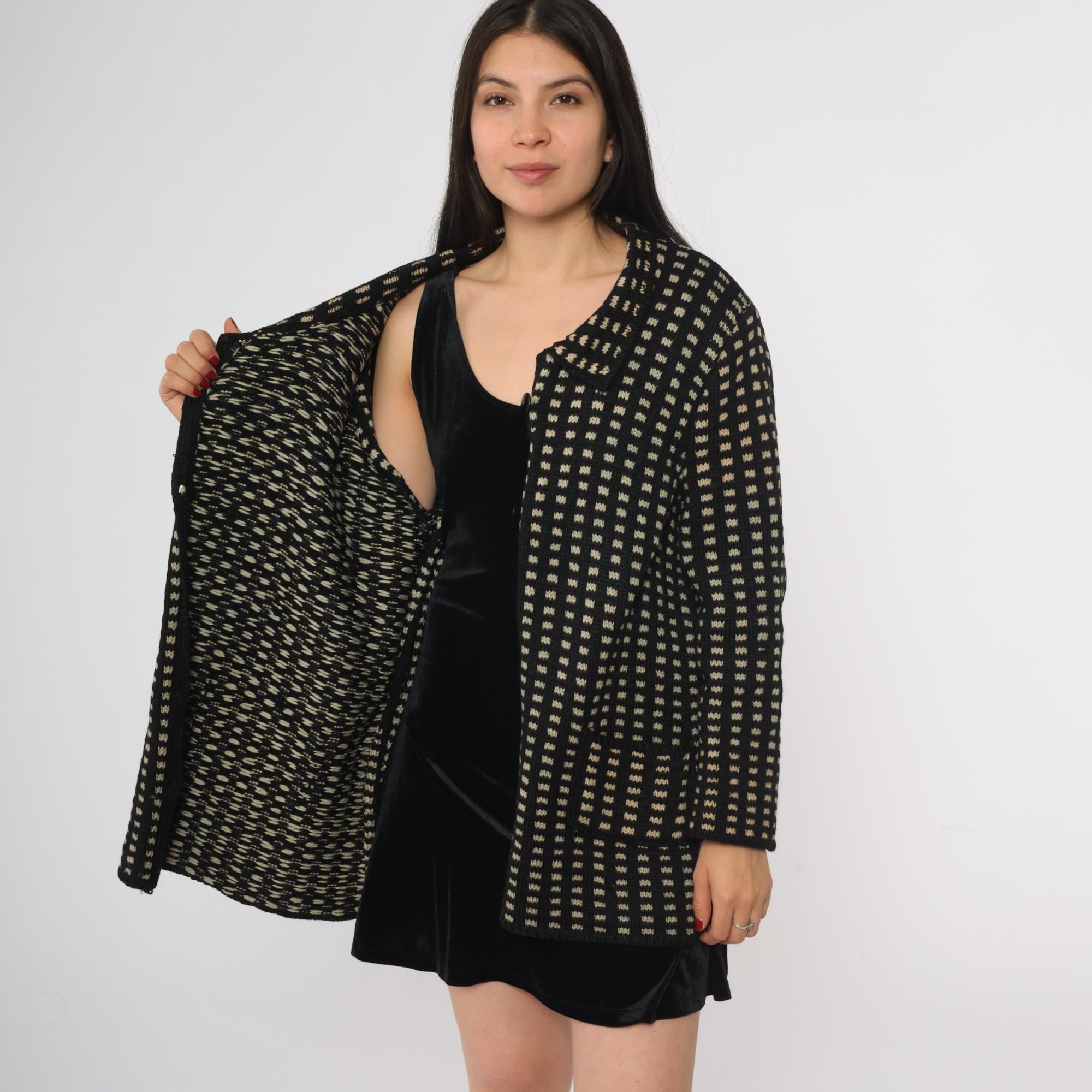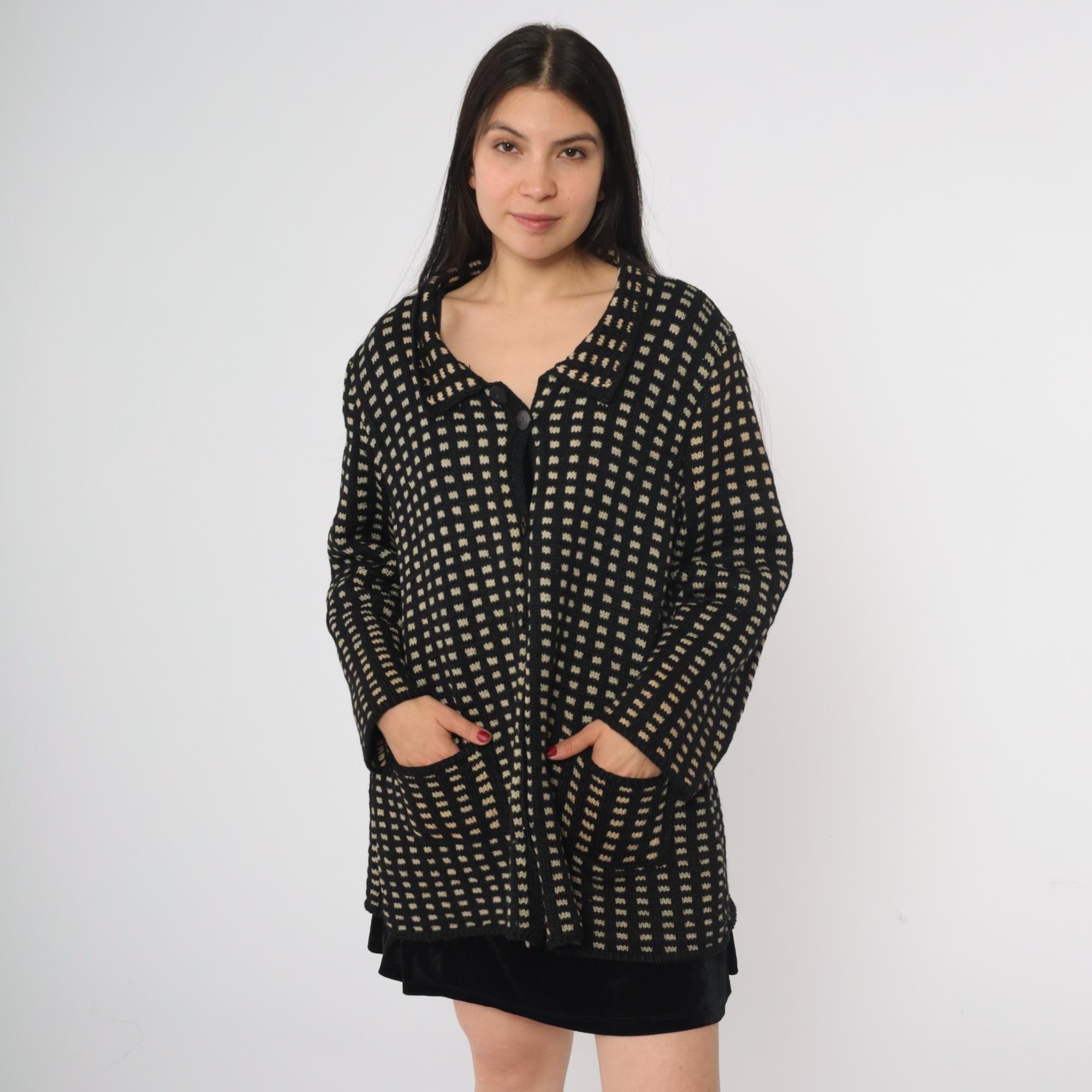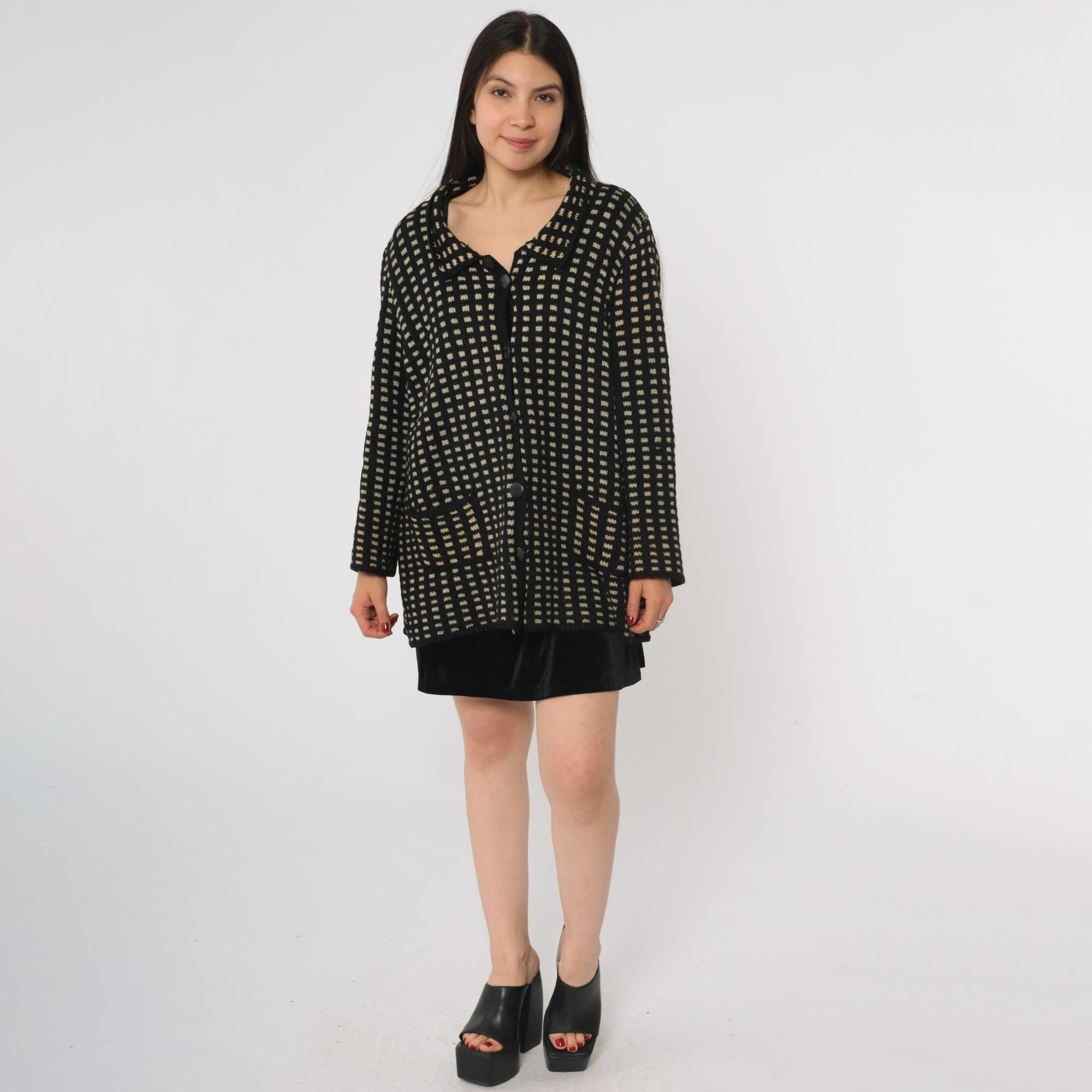 80s black and cream wool knit sweater coat featuring a small check pattern throughout. Designed with a collared neckline, front button closure, and two front patch pockets. The fit is oversized with long sleeves and a mid-thigh length.