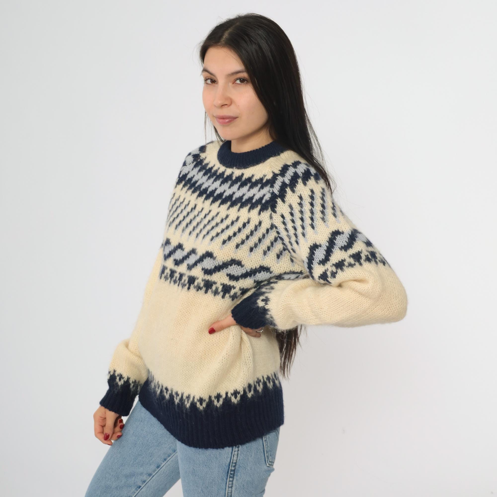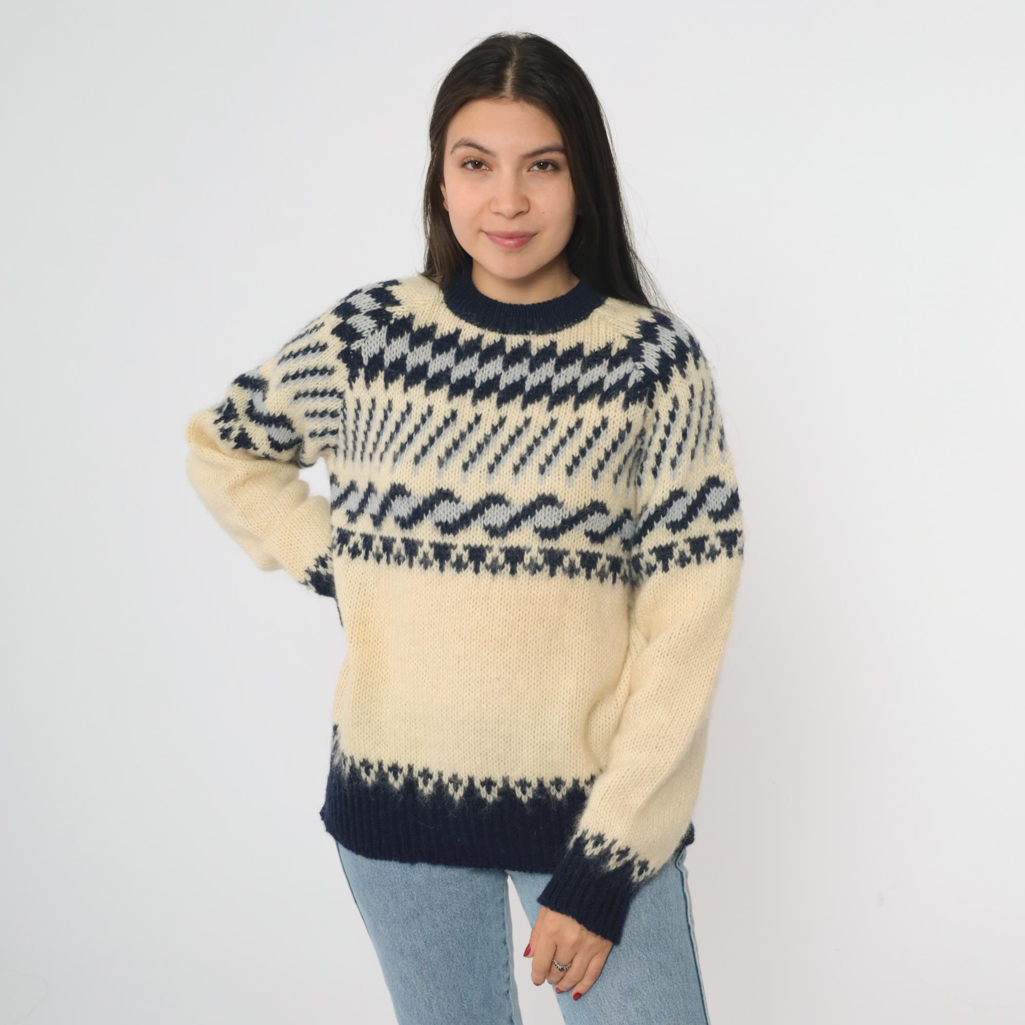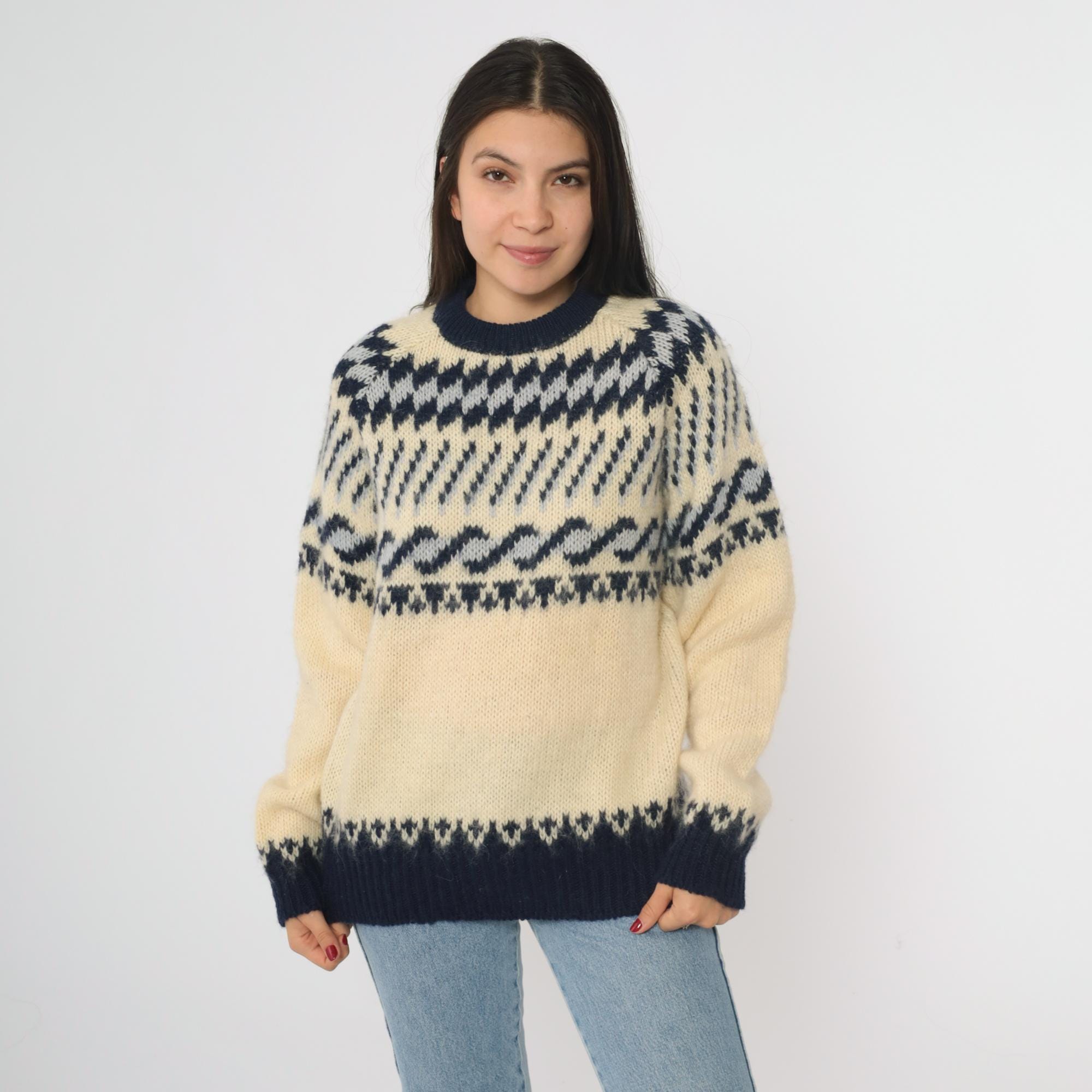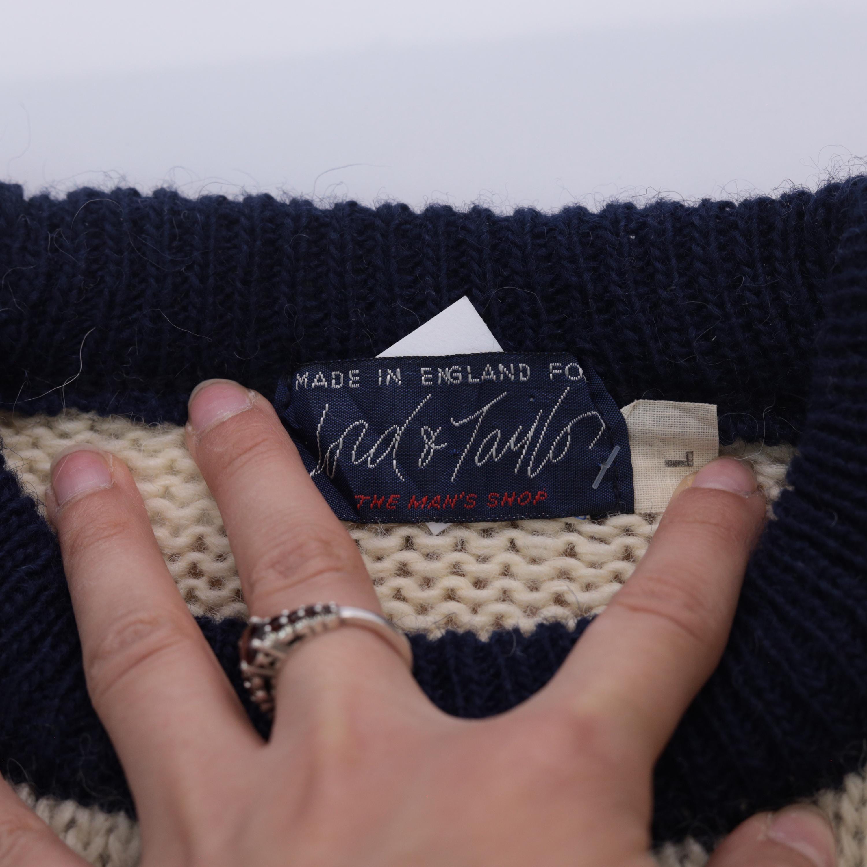 80s Lord & Taylor wool sweater made in England. Features a cream base with navy and gray Fair Isle knit pattern across the chest, shoulders, cuffs, and hem. Designed with a crew neckline and long sleeves in a heavyweight knit ideal for winter wear.