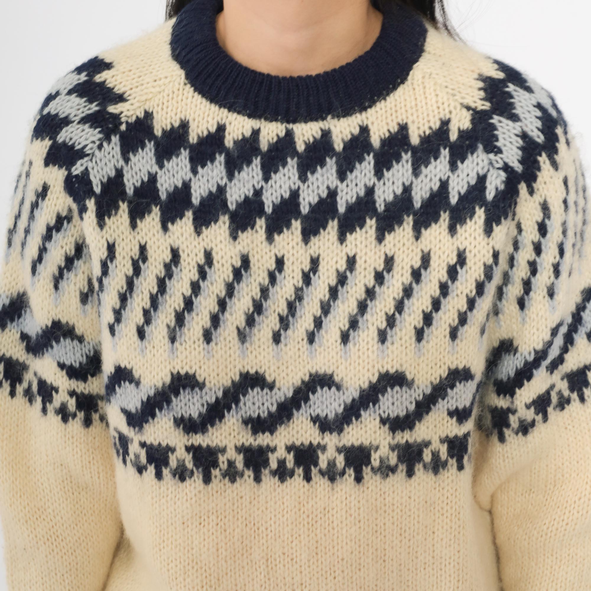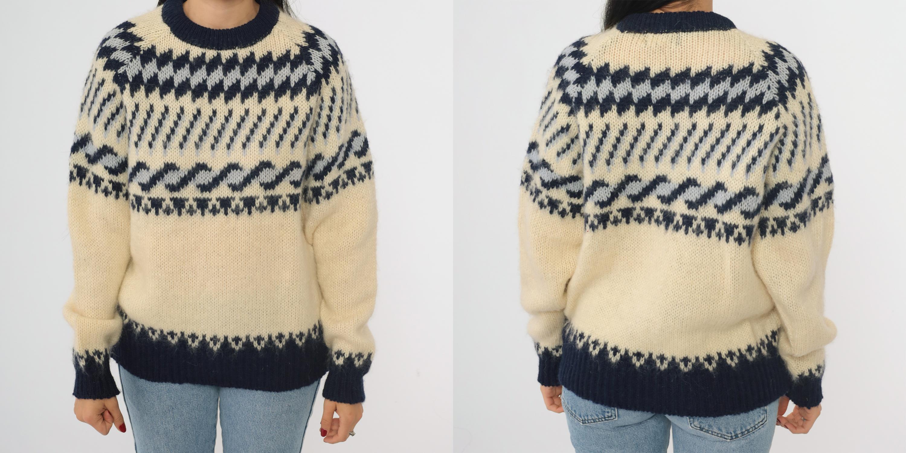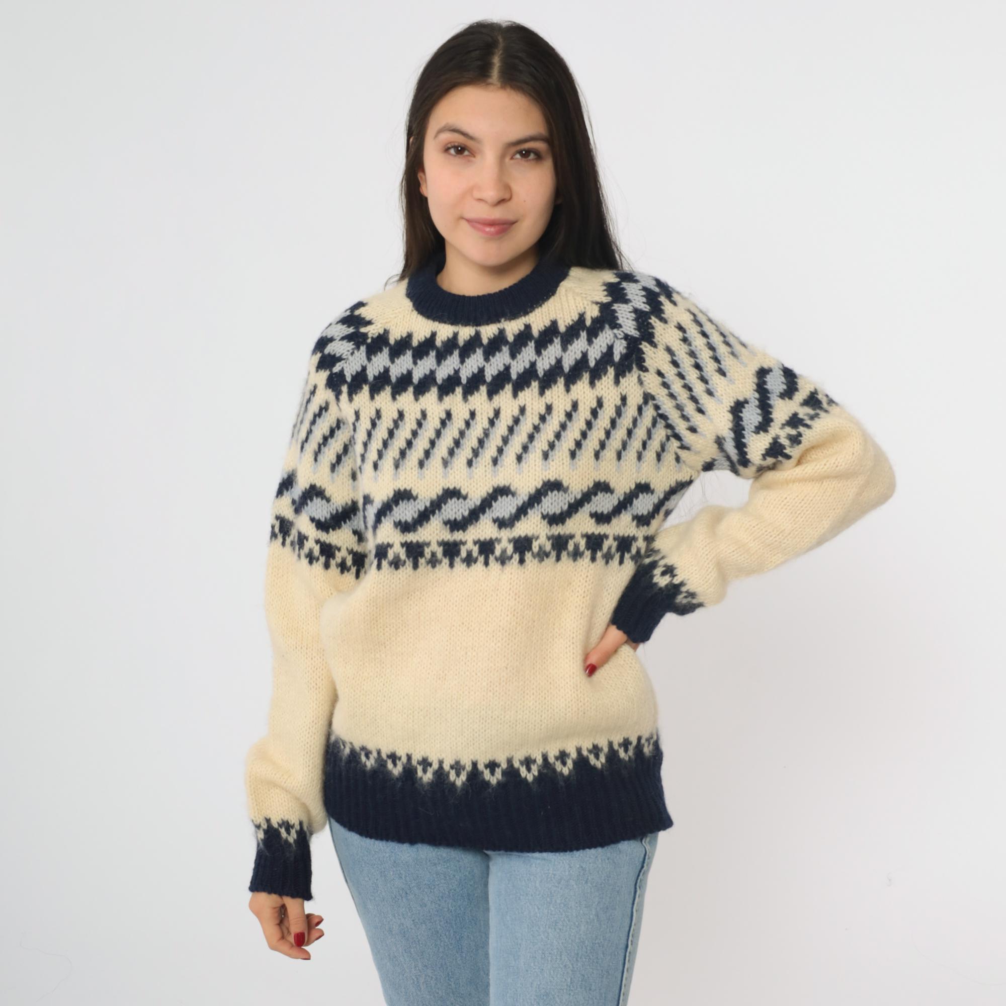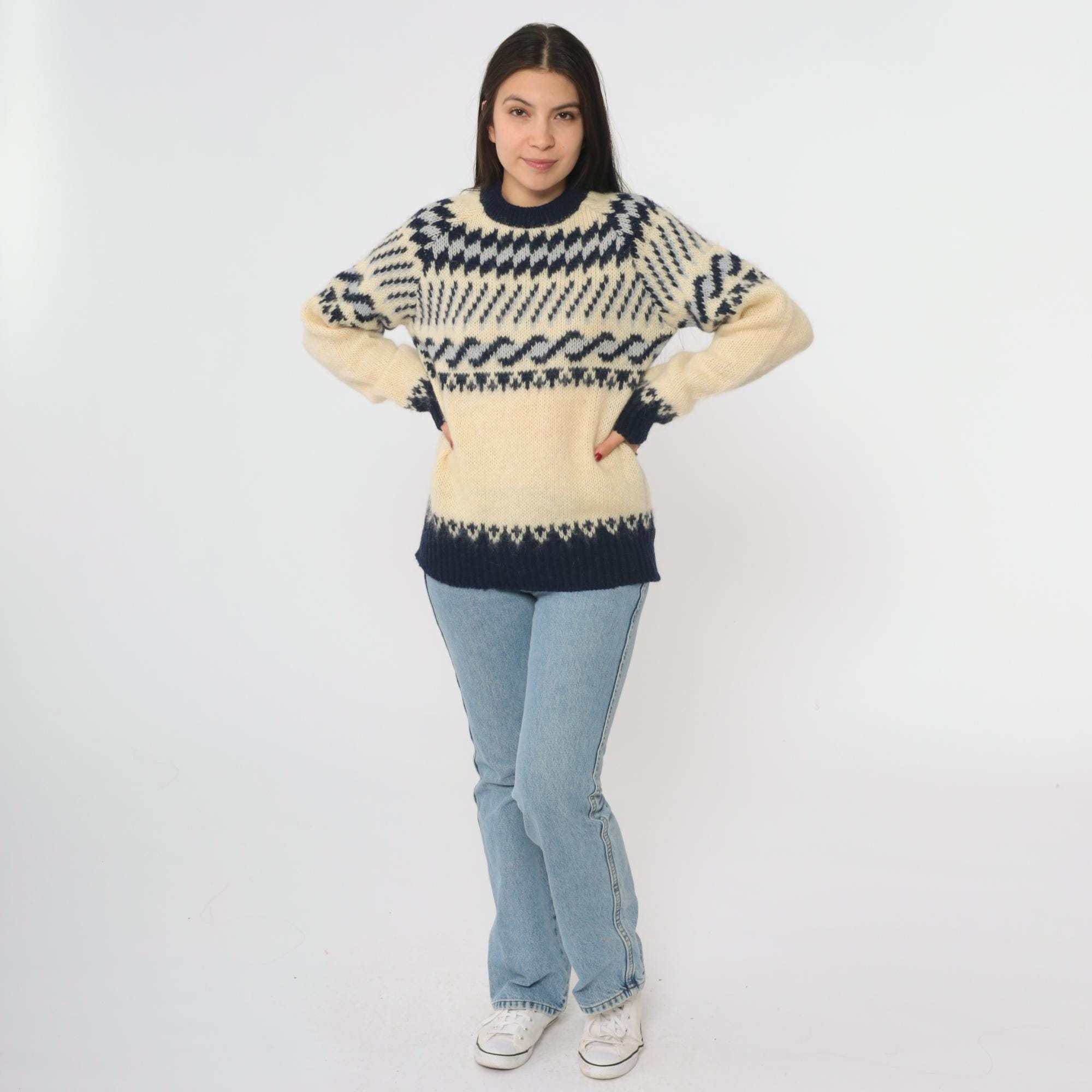 80s Lord & Taylor wool sweater made in England. Features a cream base with navy and gray Fair Isle knit pattern across the chest, shoulders, cuffs, and hem. Designed with a crew neckline and long sleeves in a heavyweight knit ideal for winter wear.