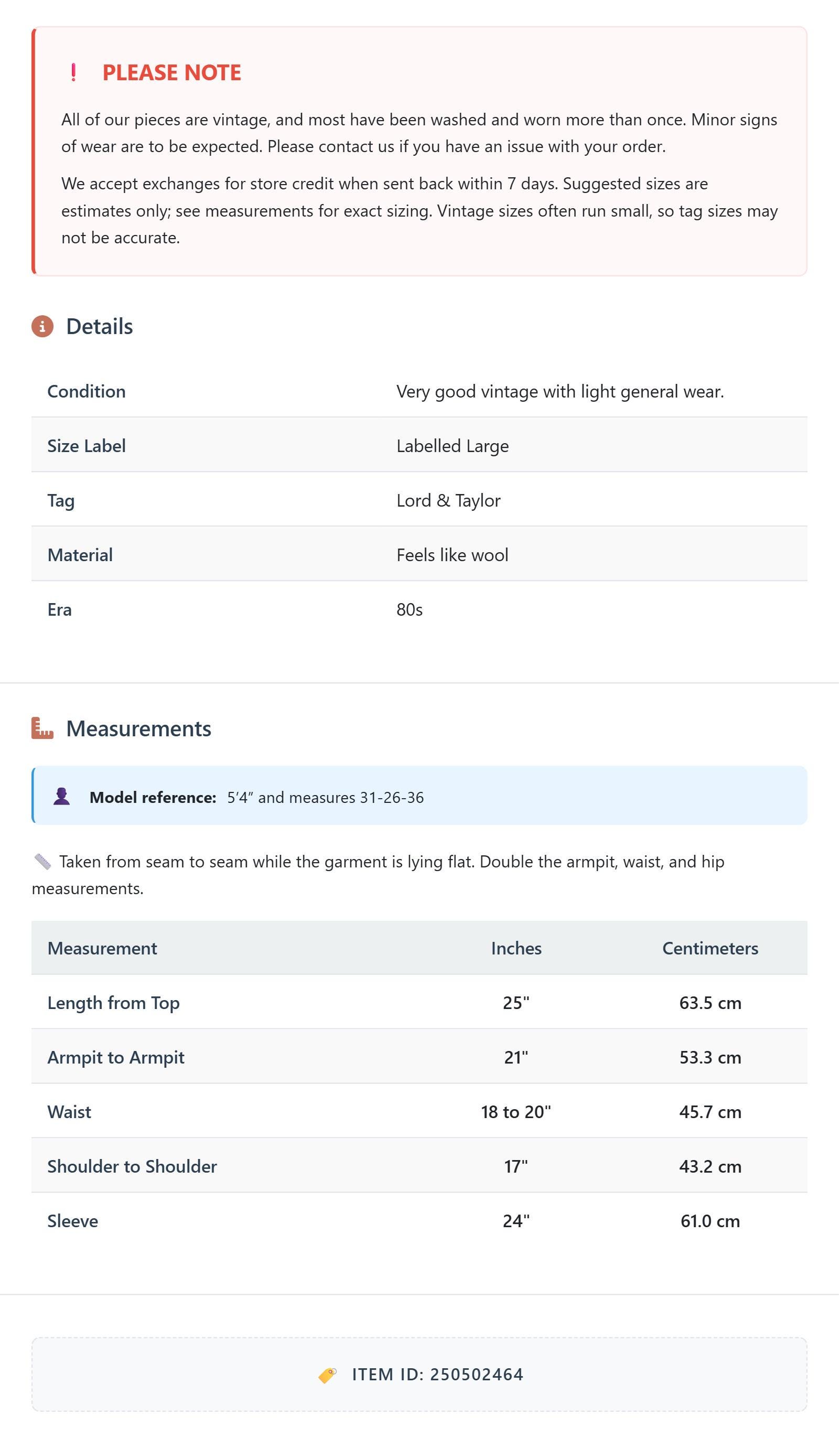 Suggested sizes are estimates only; see measurements for exact sizing. Vintage sizes often run small, so tag sizes may not be accurate.