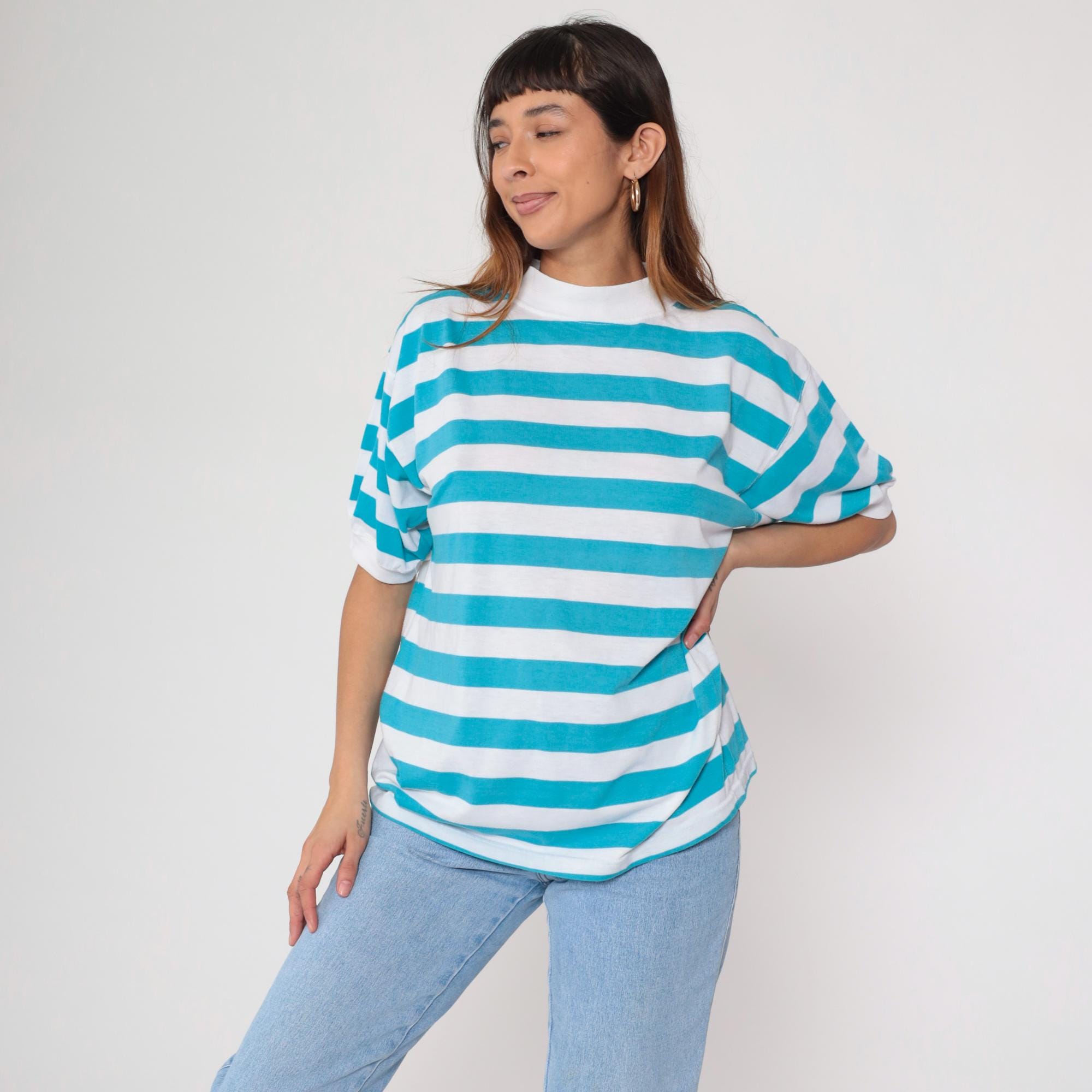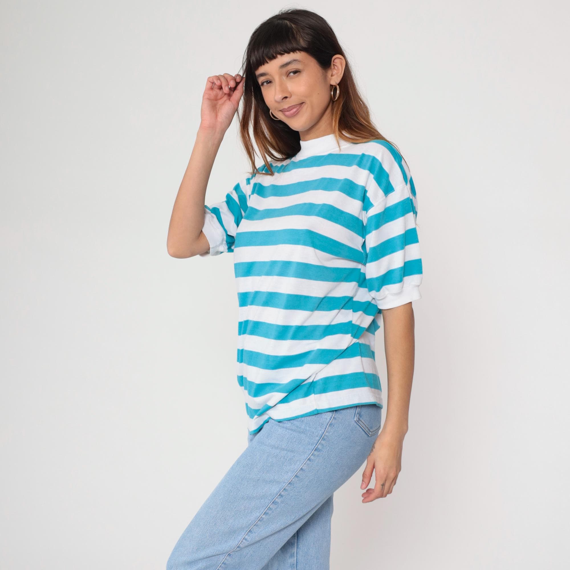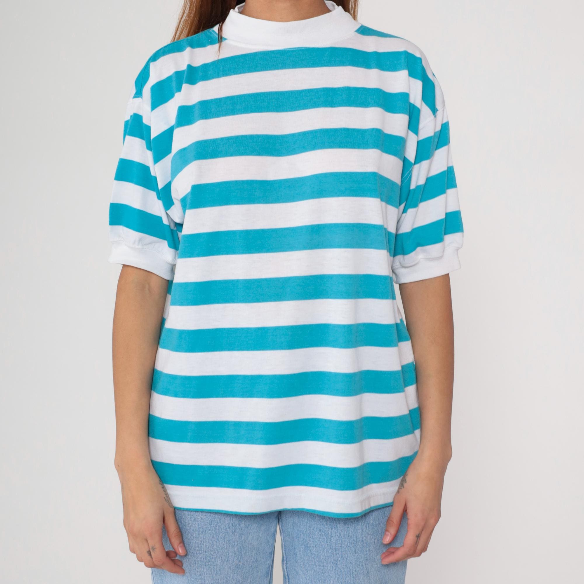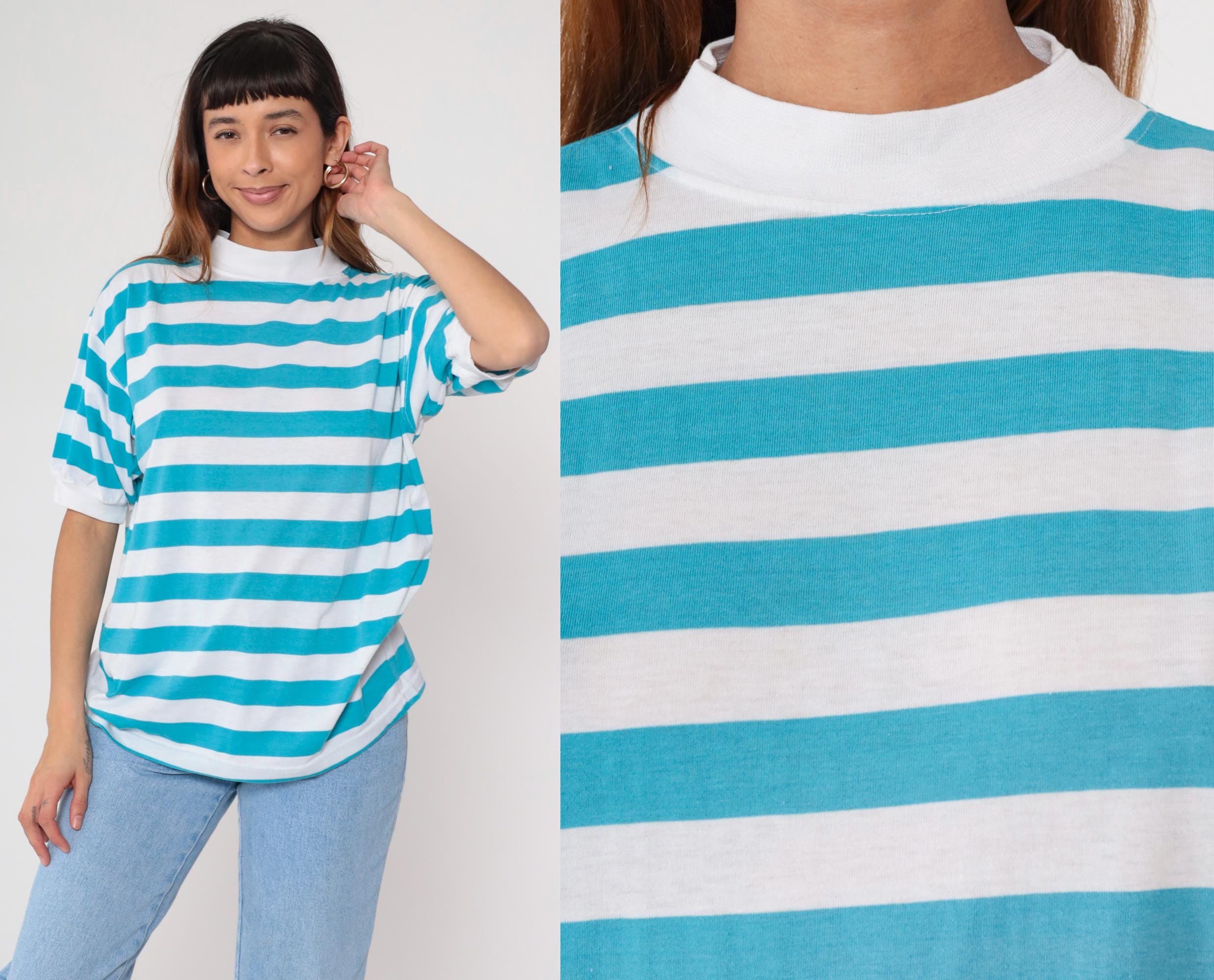 90s mock neck tee with turquoise and white horizontal stripes. Short sleeves with white ribbed cuffs. Oversized boxy fit with dropped shoulders.