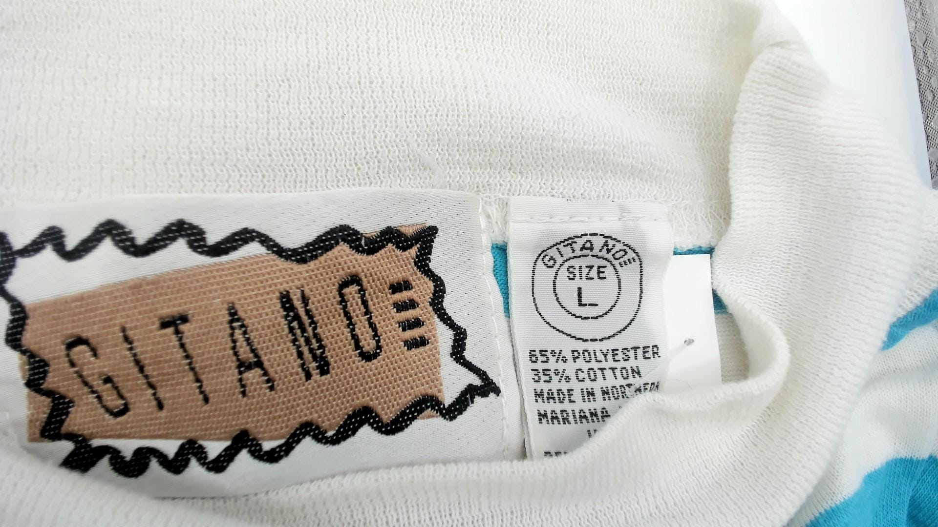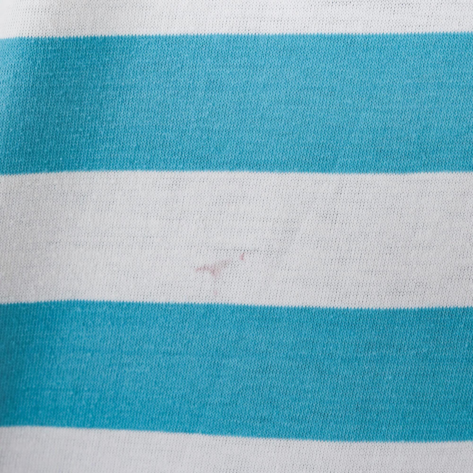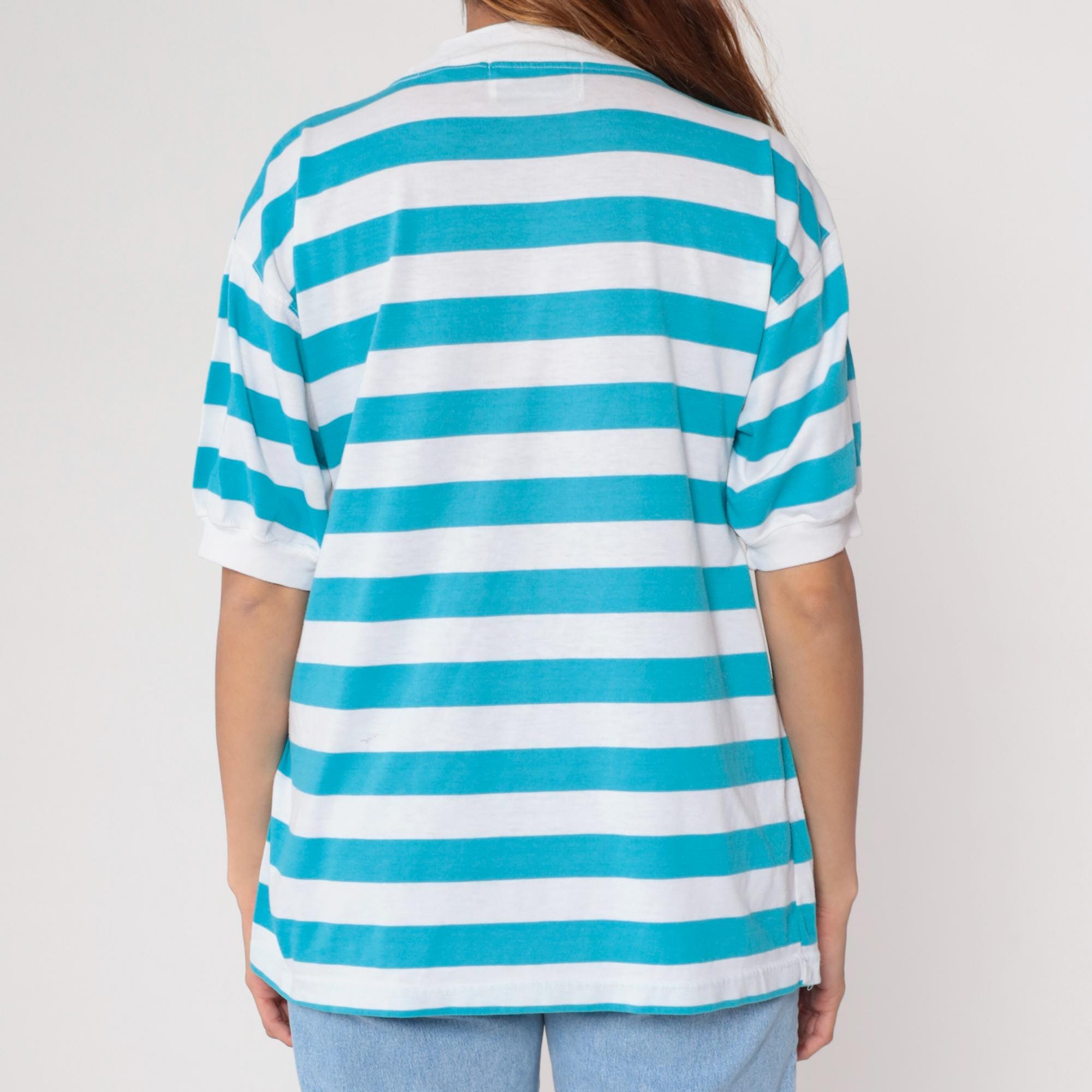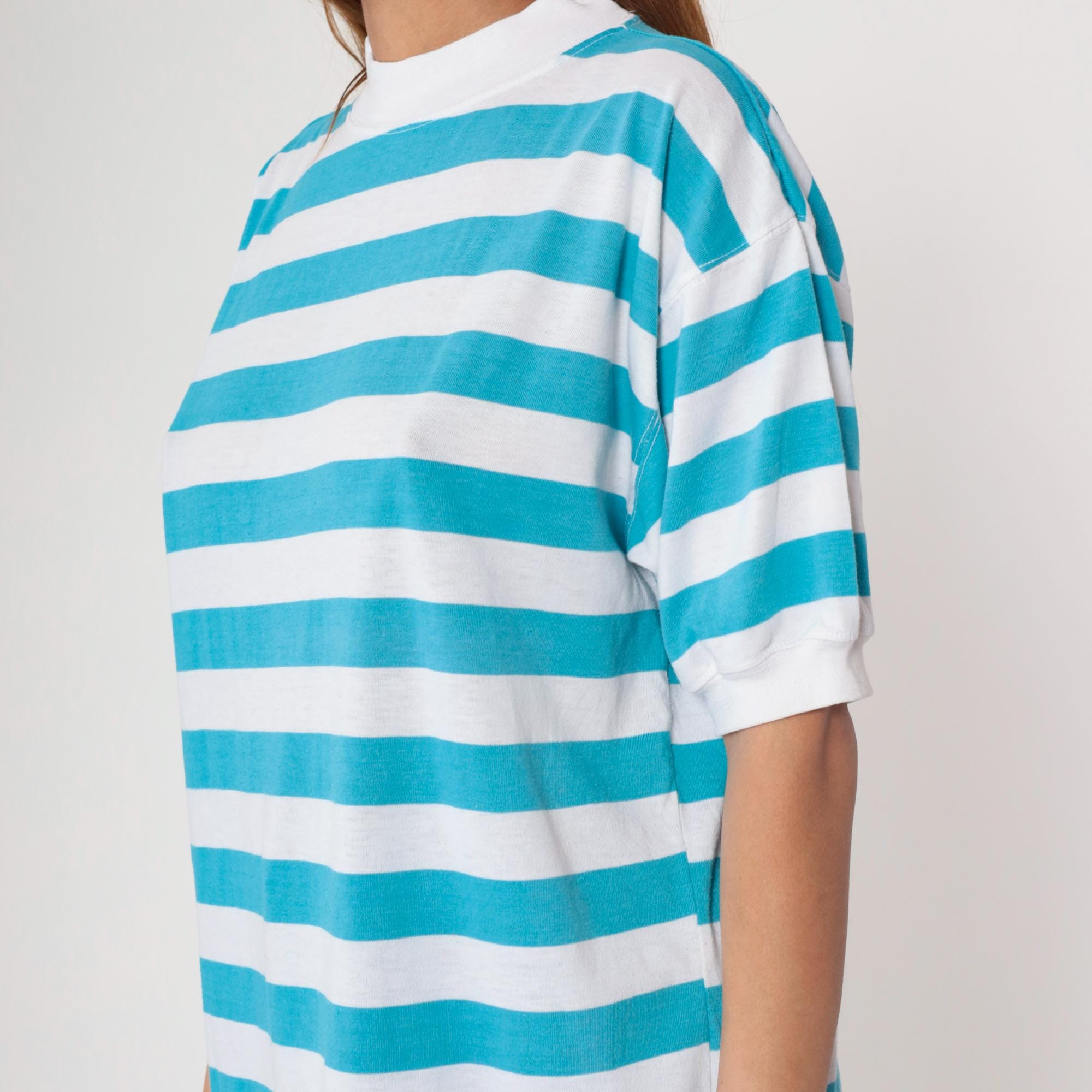 90s mock neck tee with turquoise and white horizontal stripes. Short sleeves with white ribbed cuffs. Oversized boxy fit with dropped shoulders.