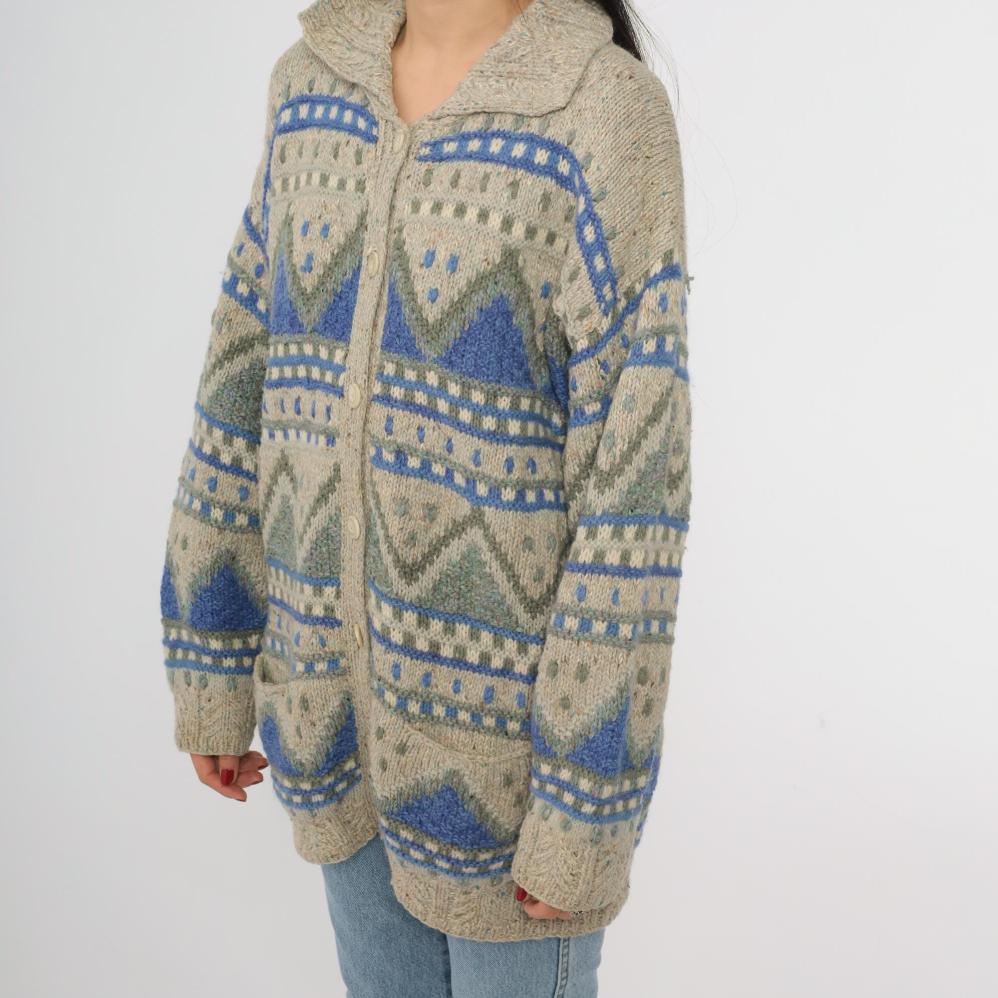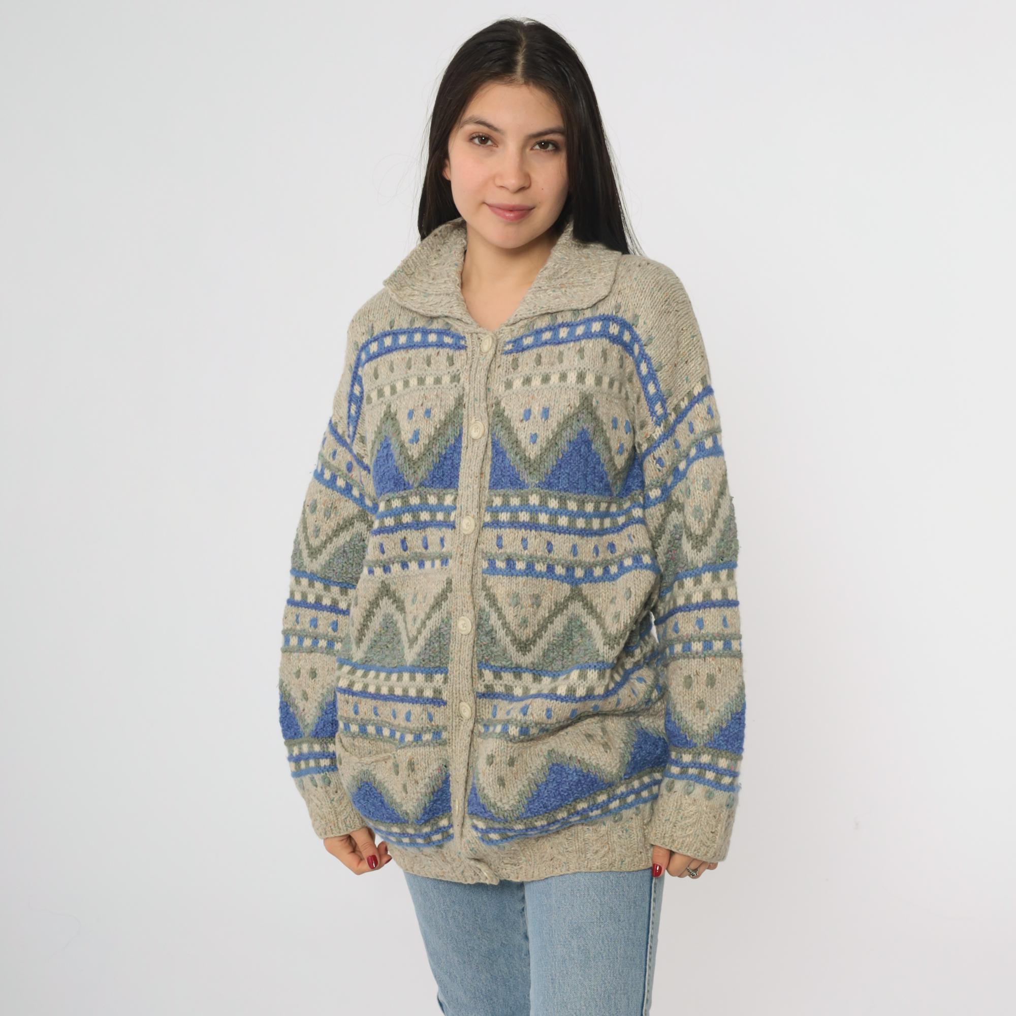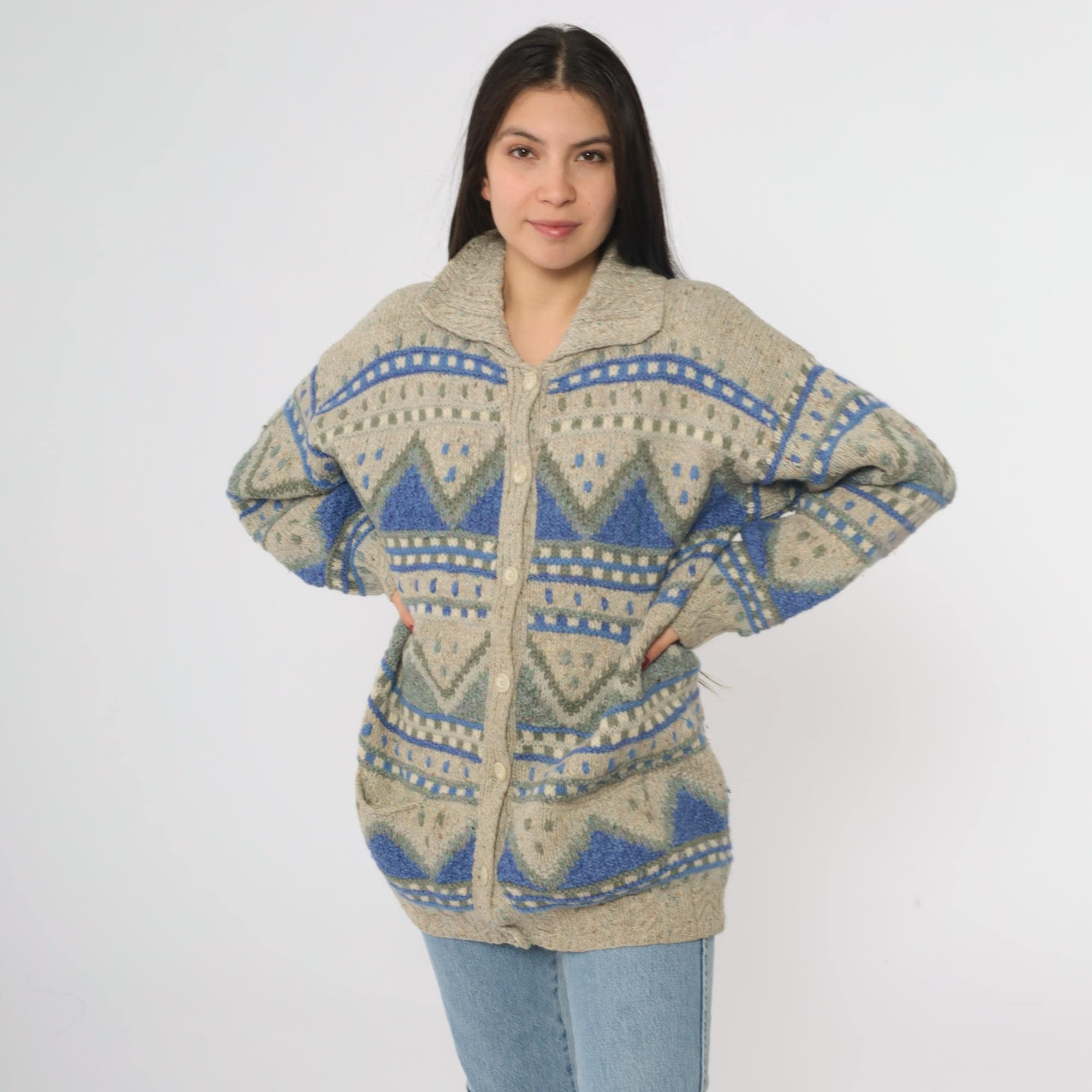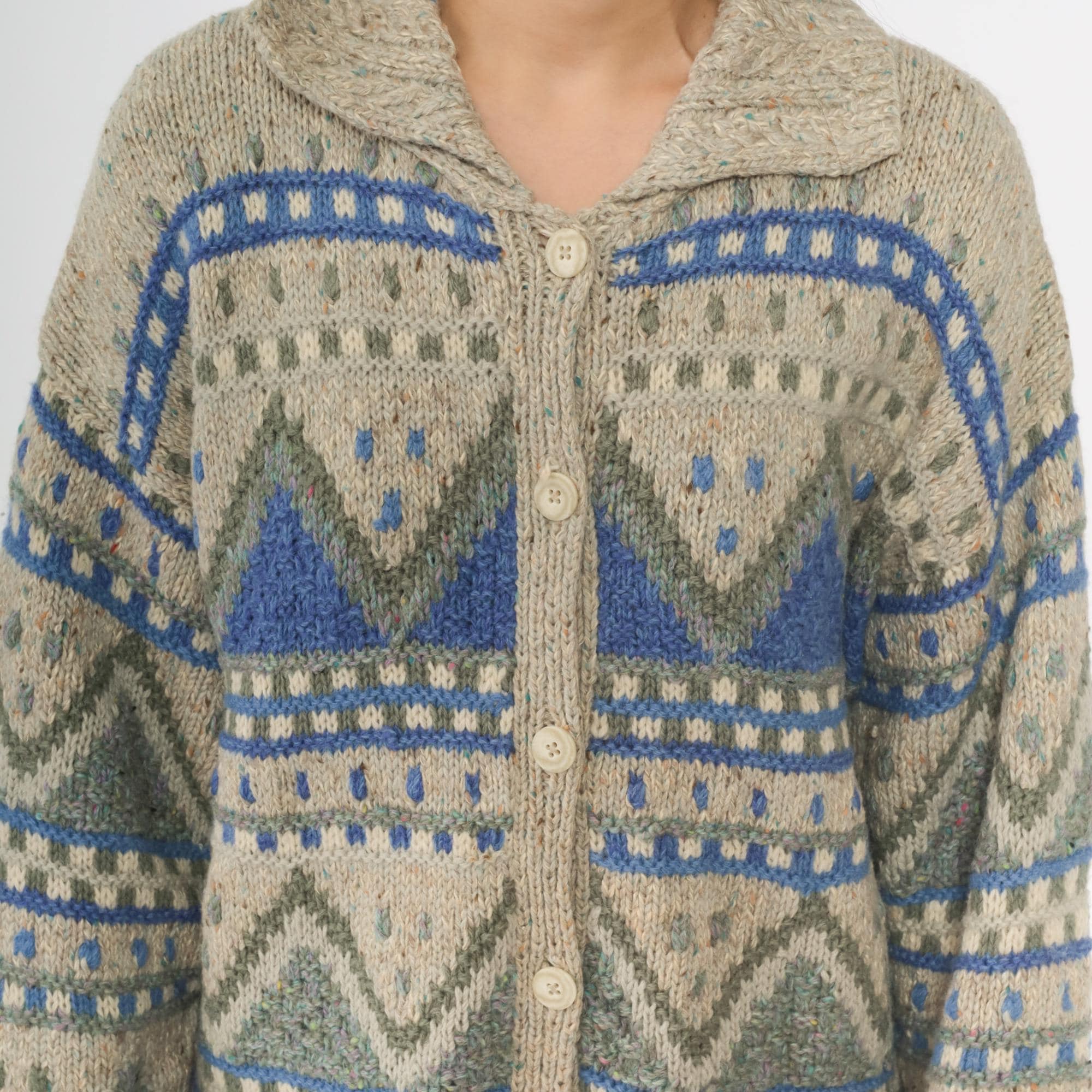 90s Segrets Sun Prints wool cardigan featuring a beige base with blue and green geometric knit pattern. Designed with a collared neckline, button front closure, and front pockets. Handmade with a chunky textured knit for added warmth.