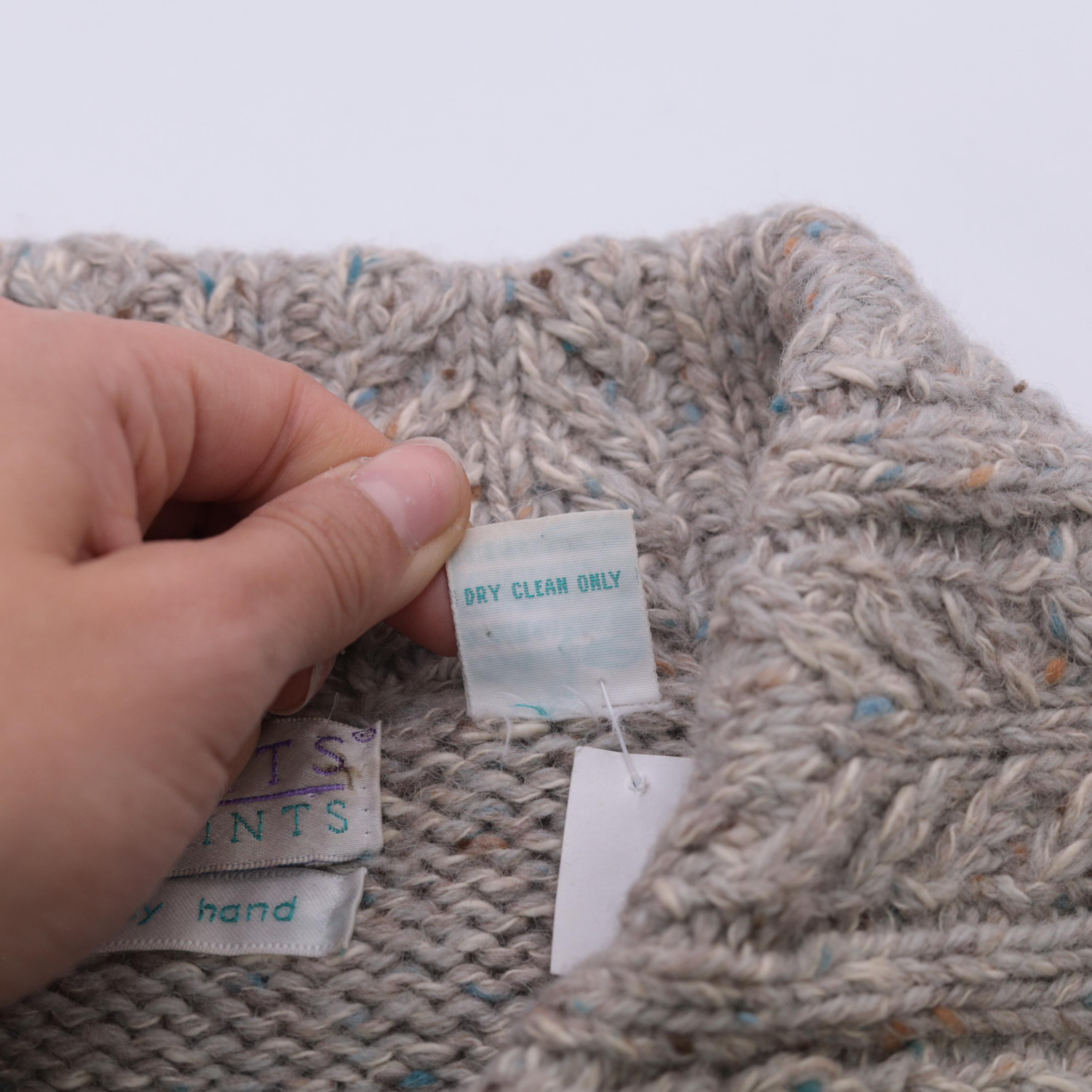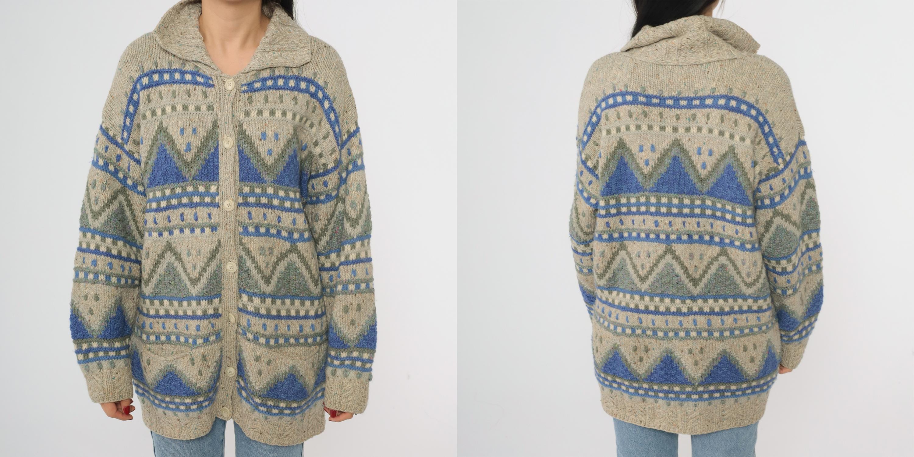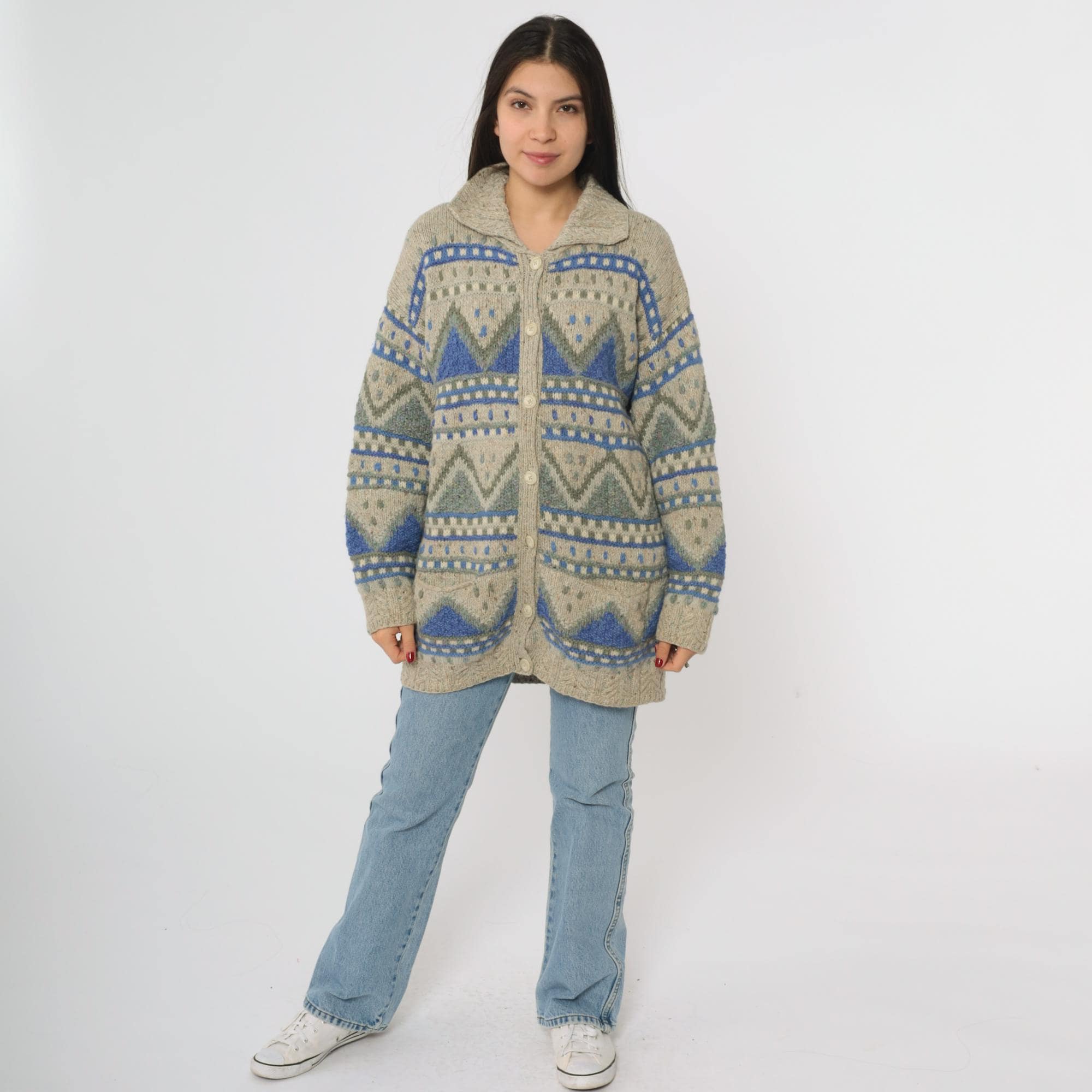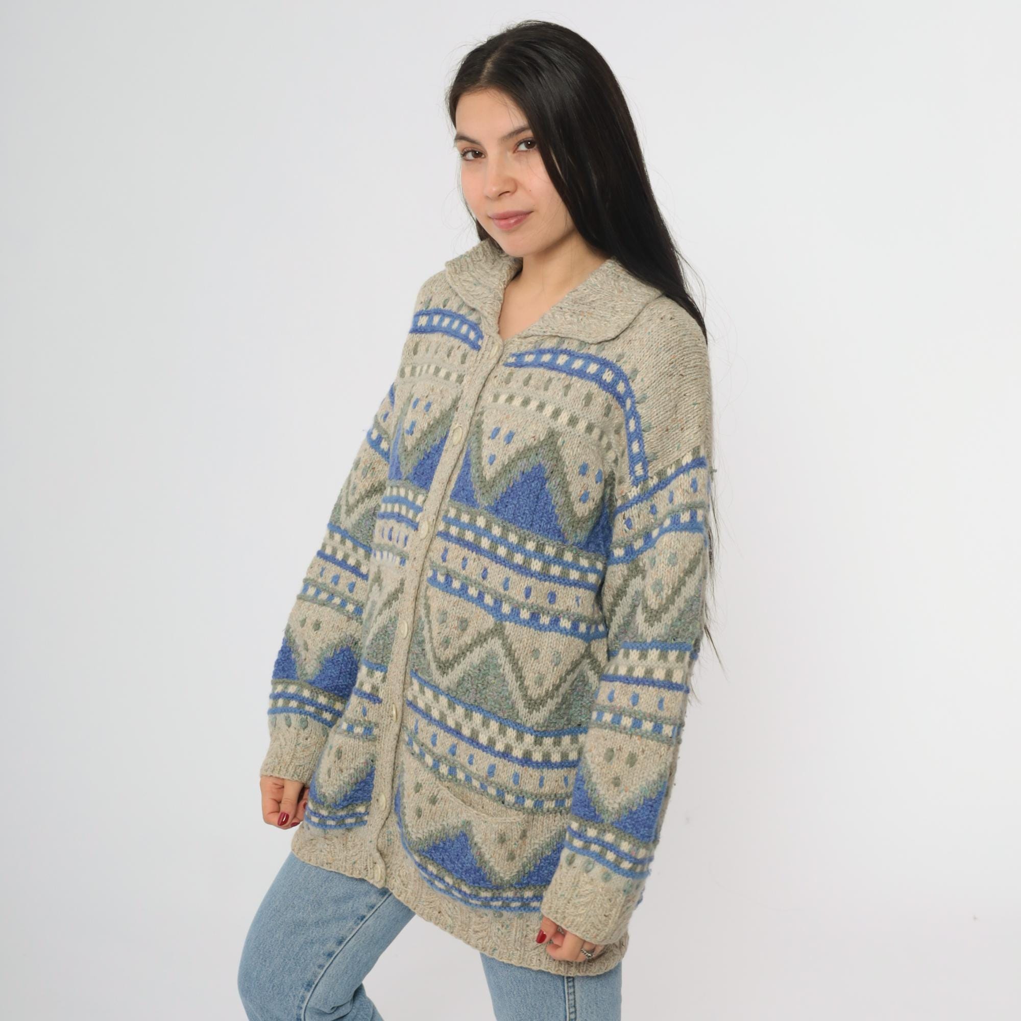 90s Segrets Sun Prints wool cardigan featuring a beige base with blue and green geometric knit pattern. Designed with a collared neckline, button front closure, and front pockets. Handmade with a chunky textured knit for added warmth.