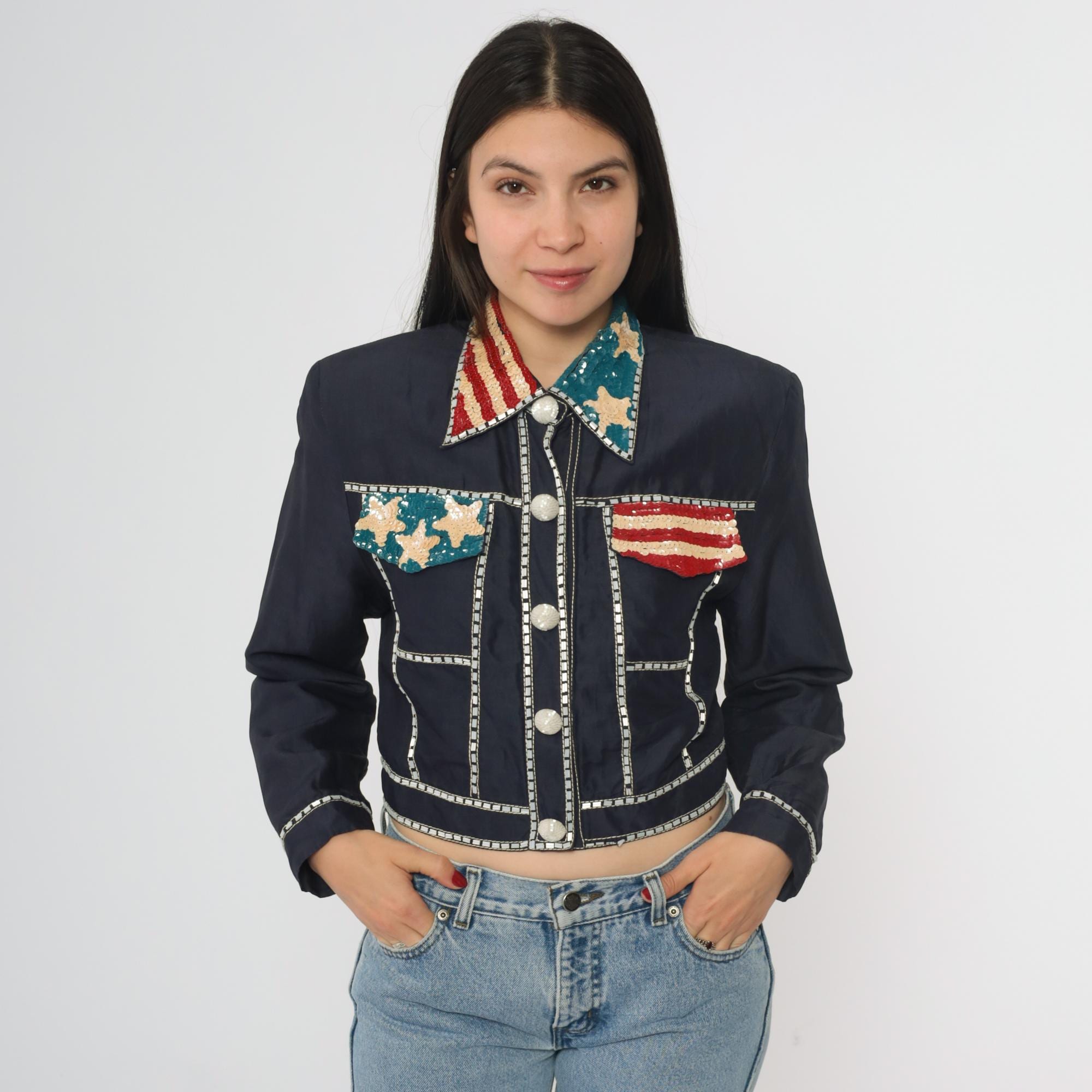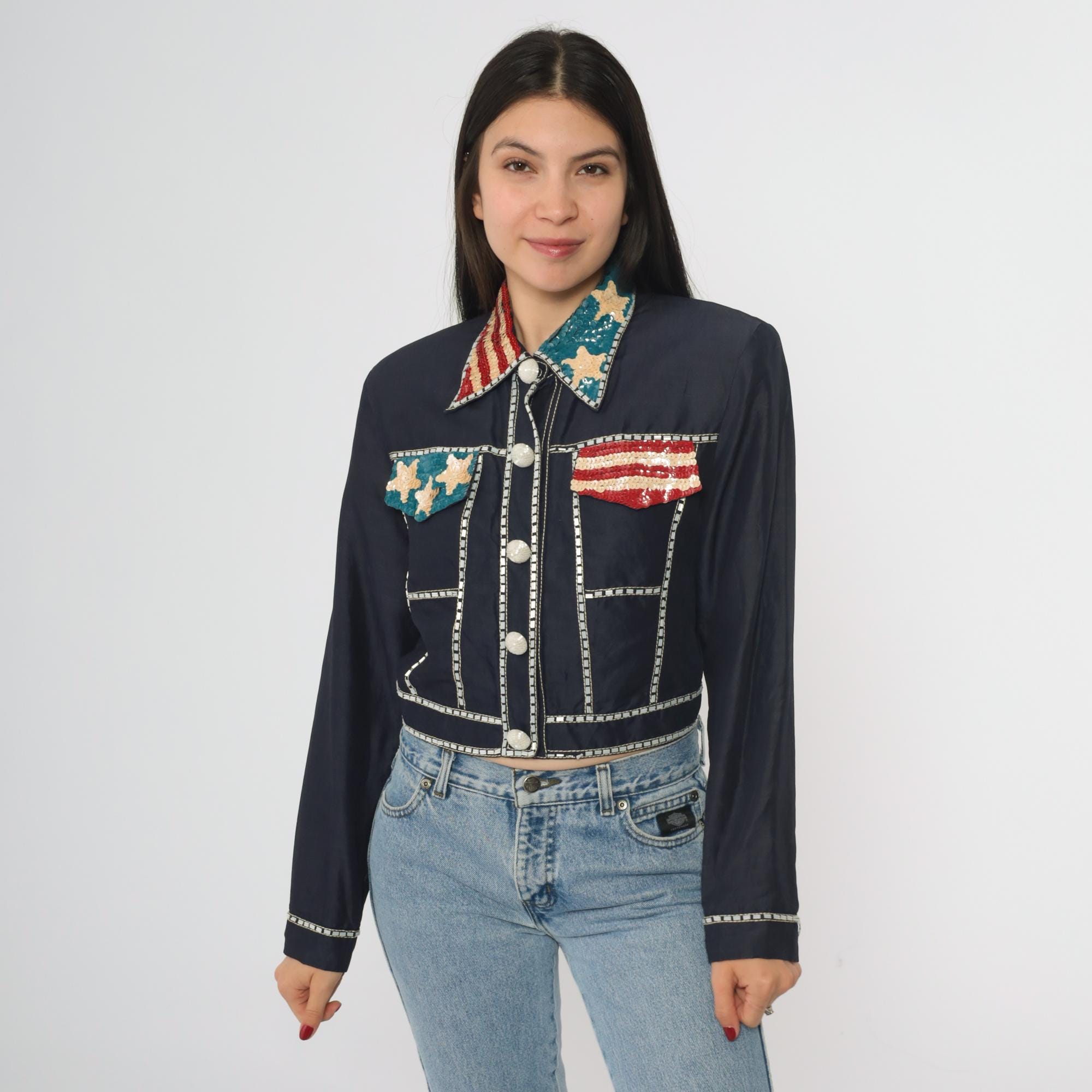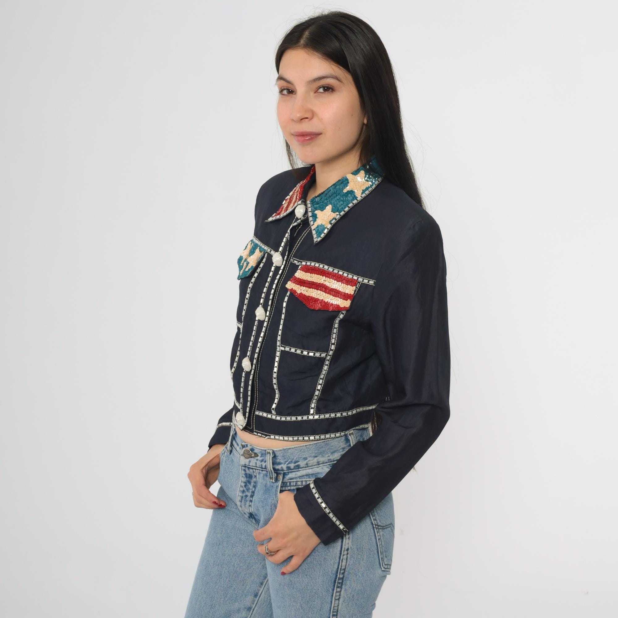 90s Aicafore cropped western-style jacket in navy blue with bold sequin detailing. Features red, white, and blue stars and stripes across the collar and chest, pearlized buttons, and decorative beaded trim.