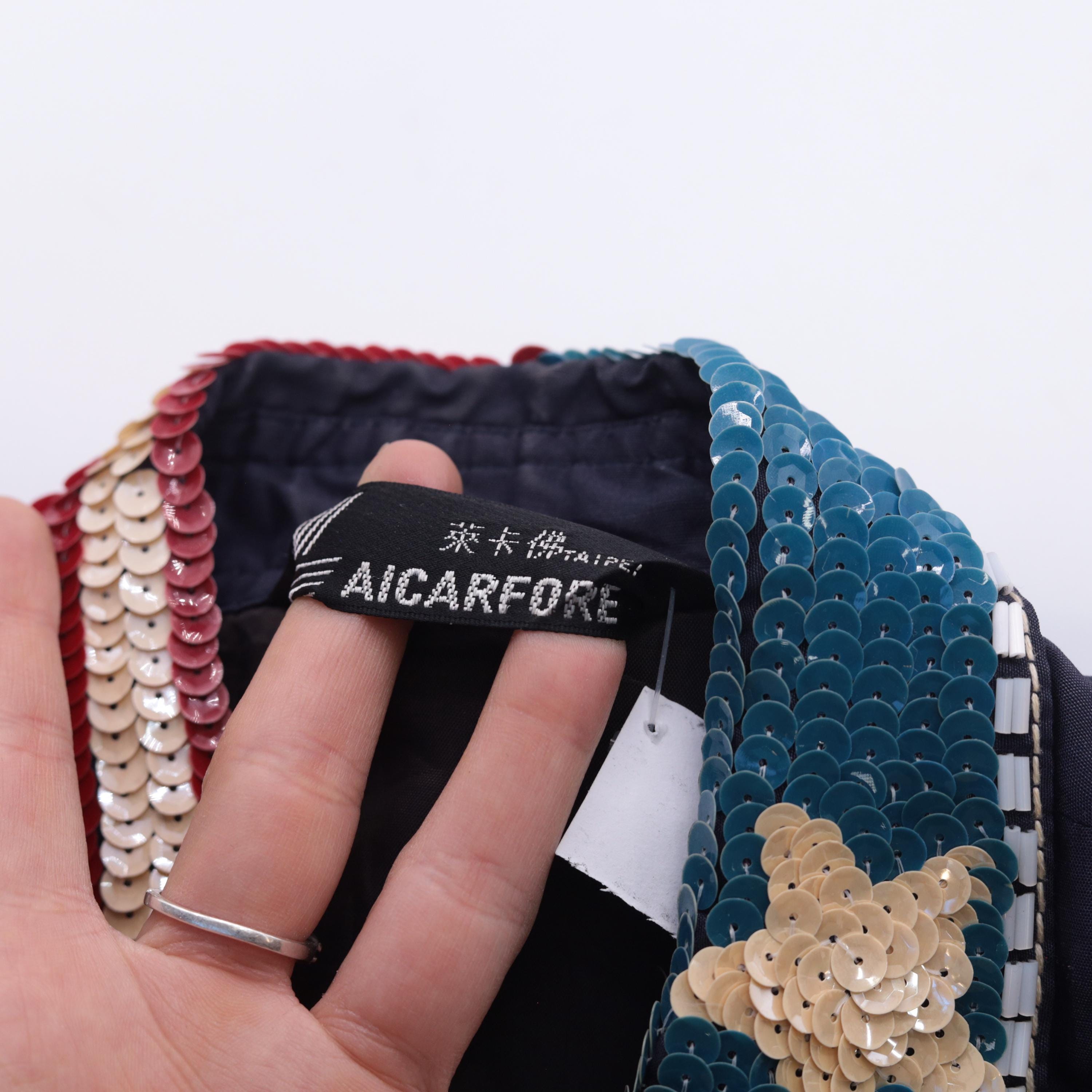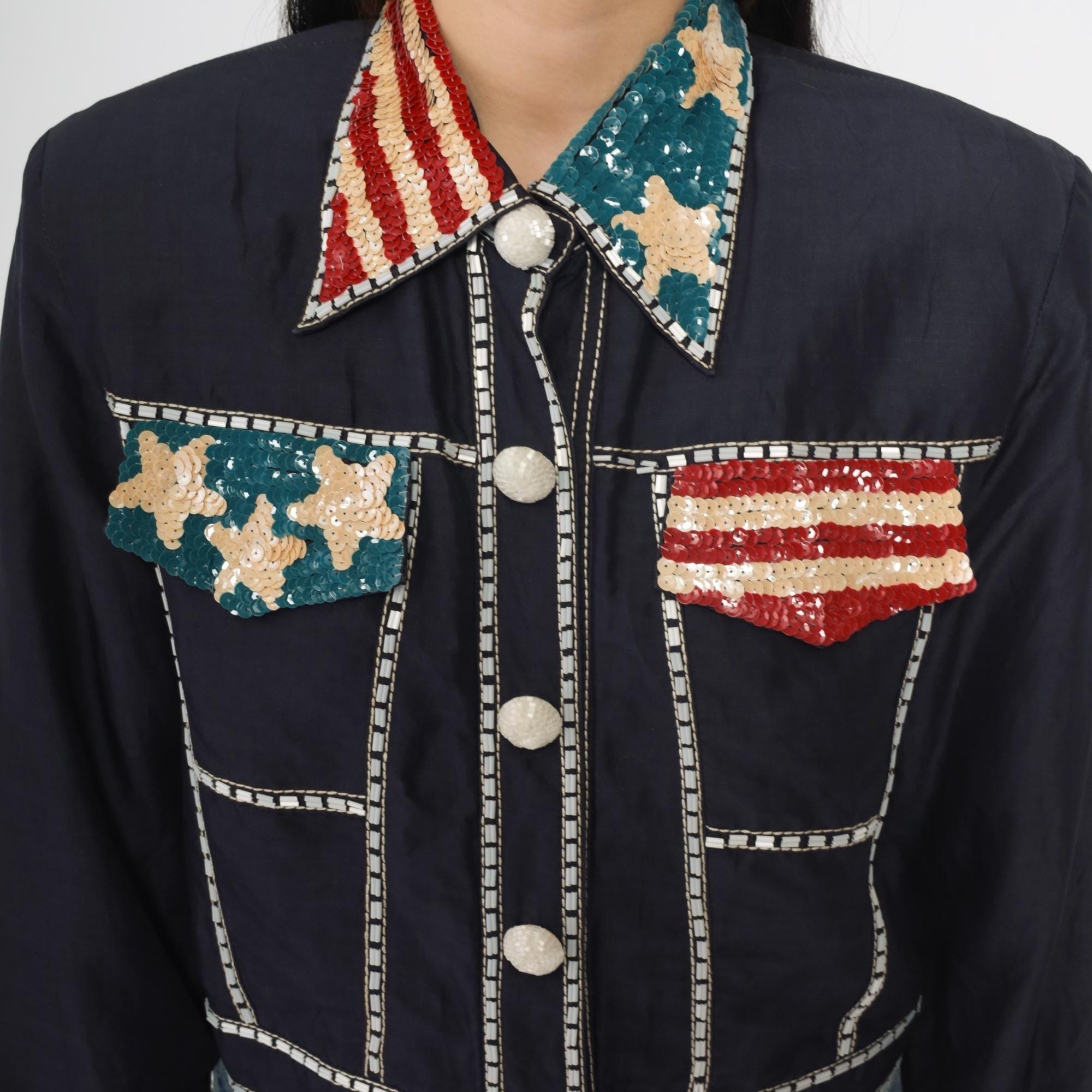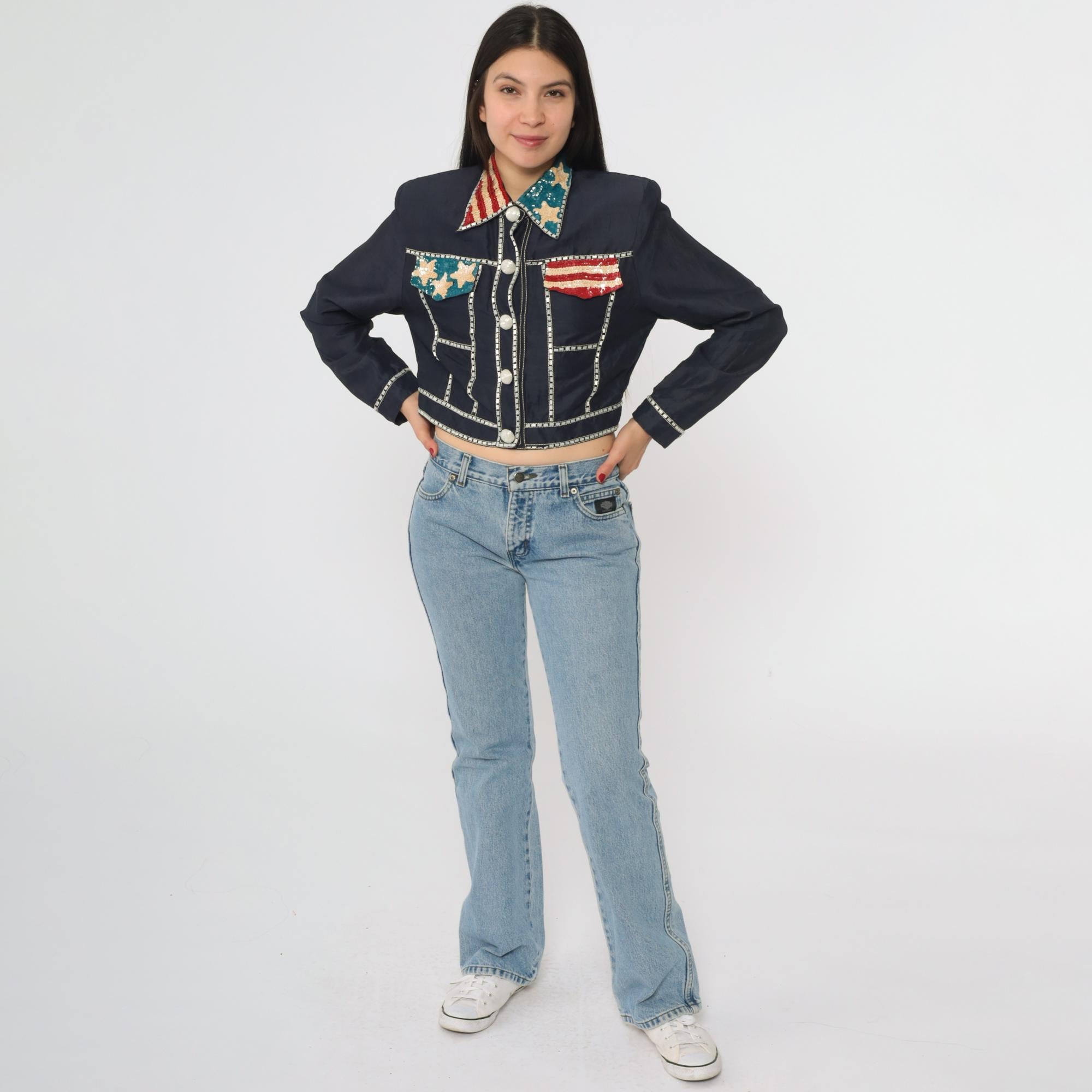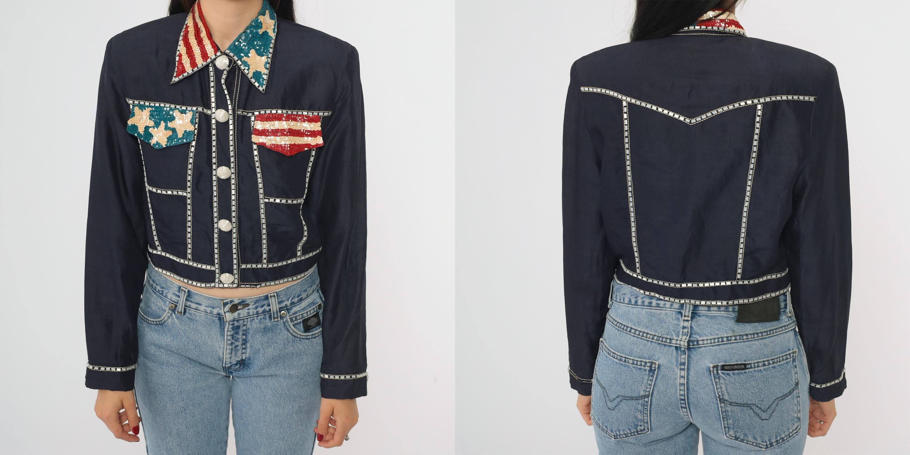 90s Aicafore cropped western-style jacket in navy blue with bold sequin detailing. Features red, white, and blue stars and stripes across the collar and chest, pearlized buttons, and decorative beaded trim.