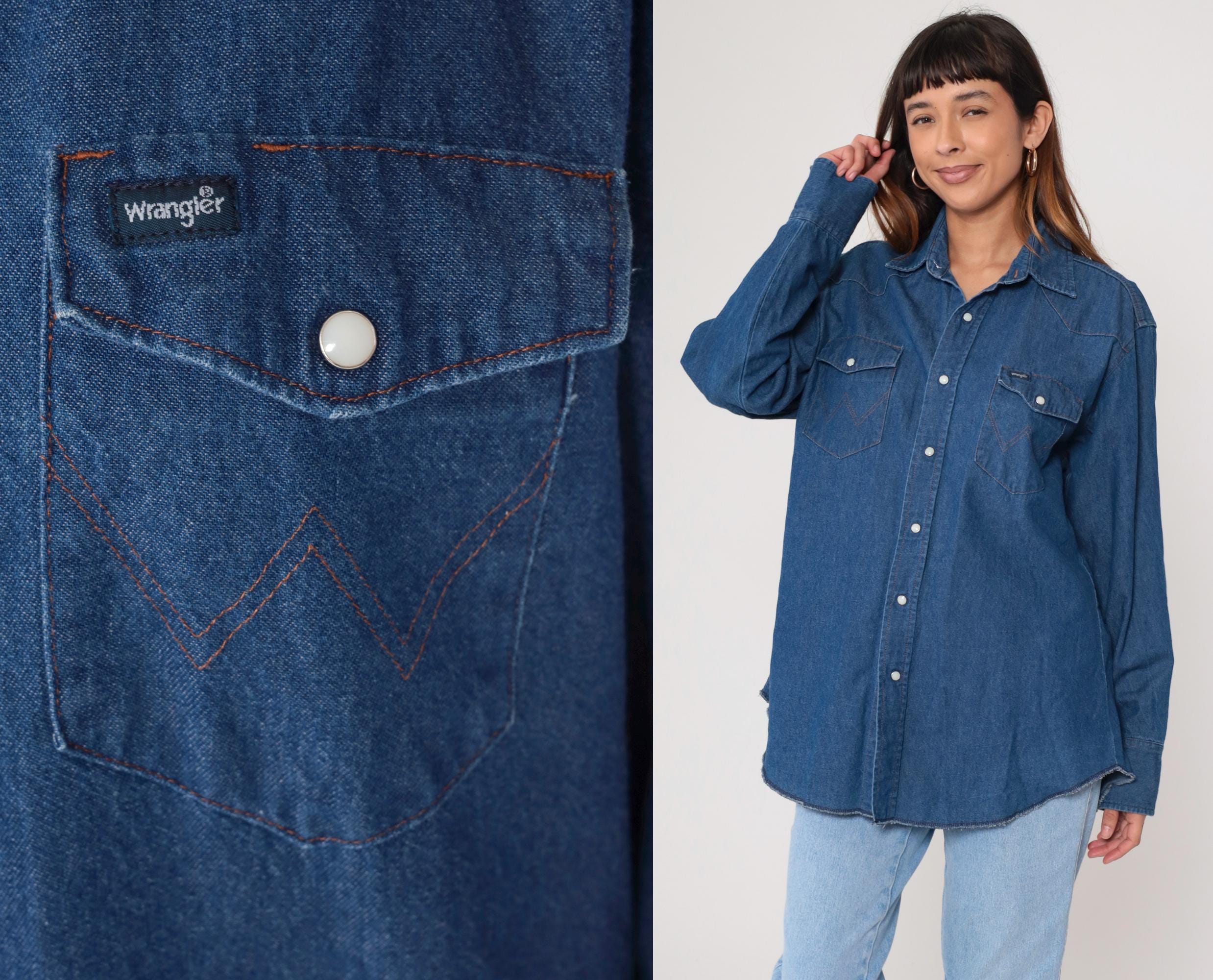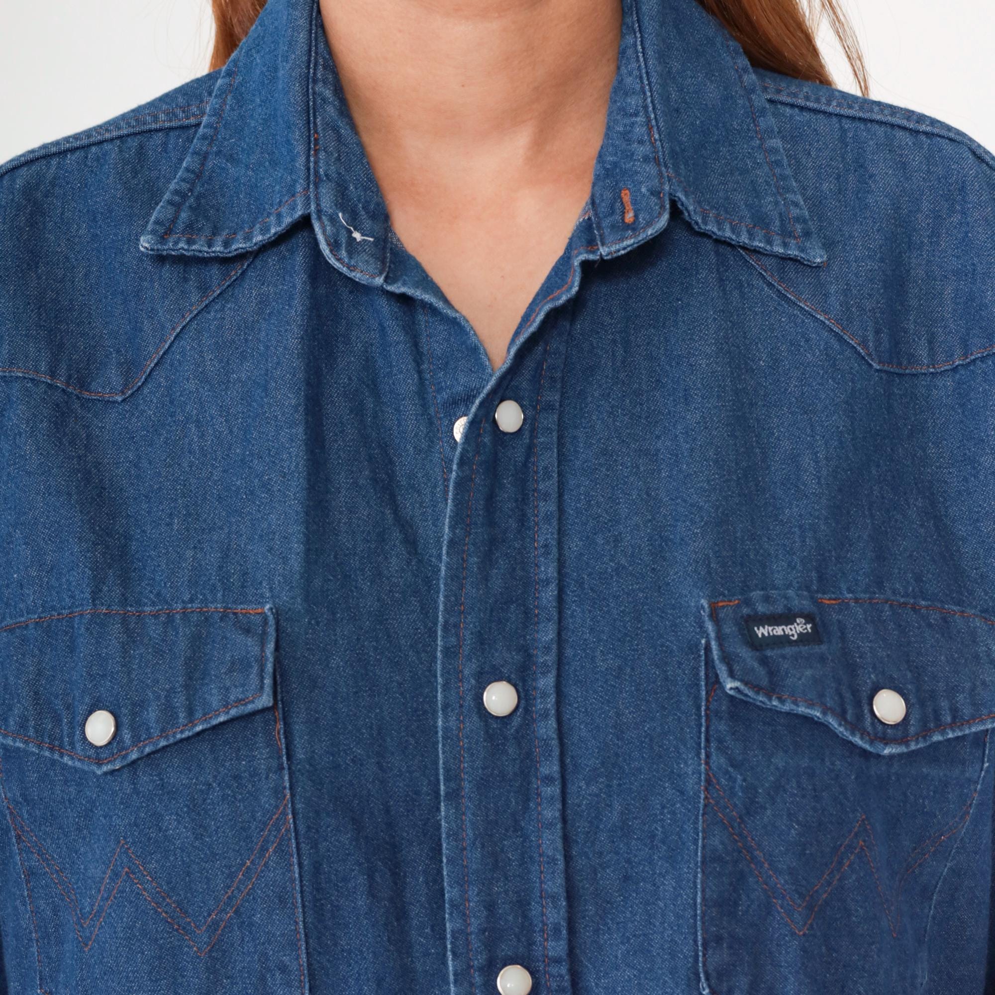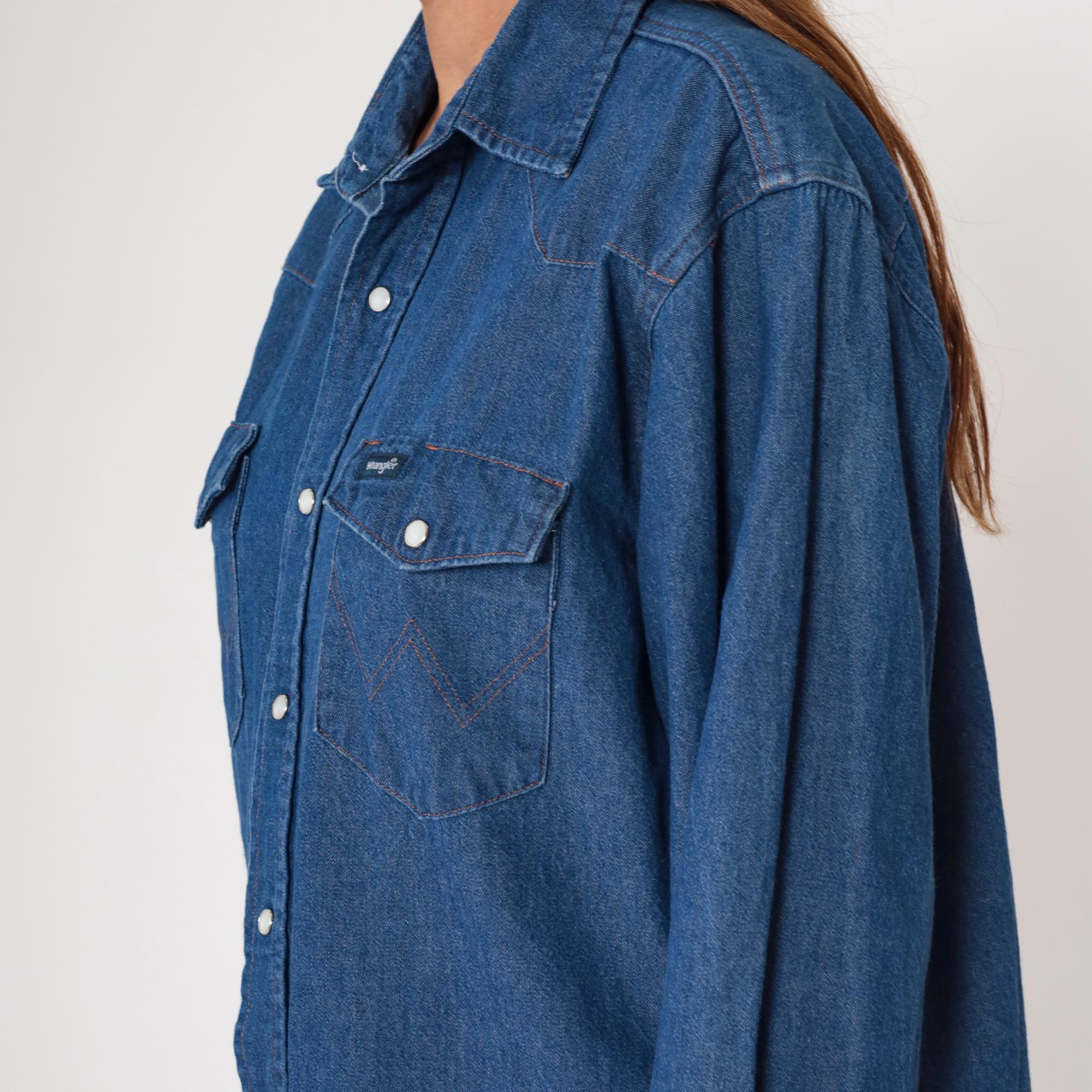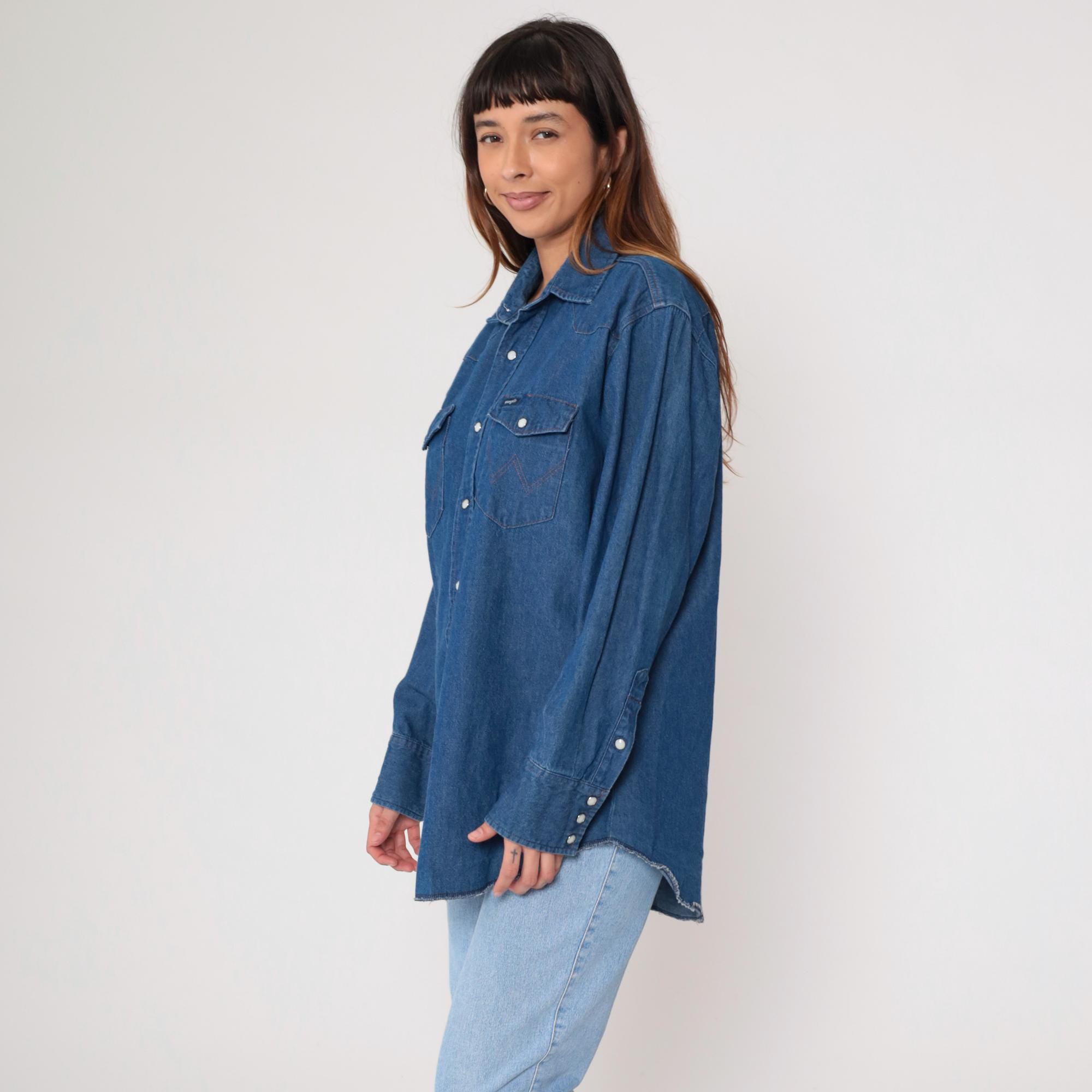 Vintage 90s Wrangler shirt in blue denim with pearl snaps down the front and a Western yoke. It has long sleeves and chest pockets.